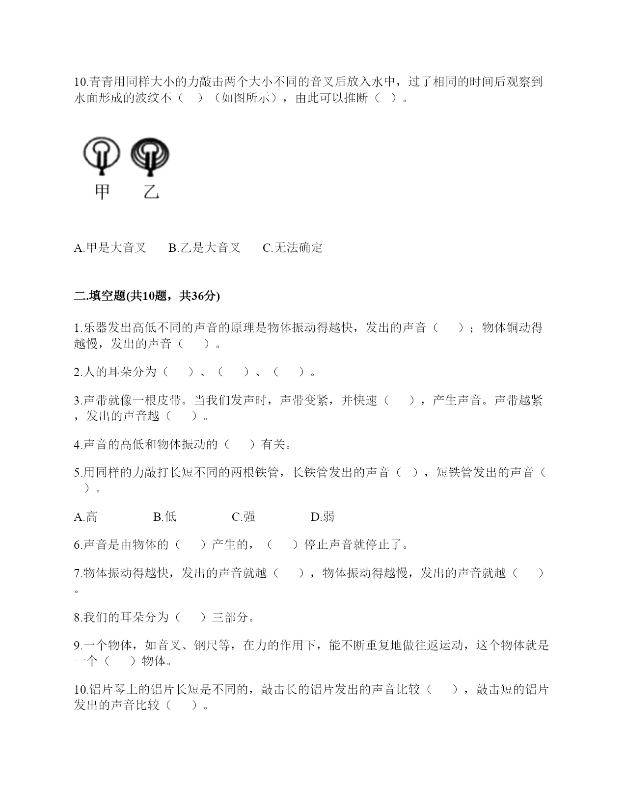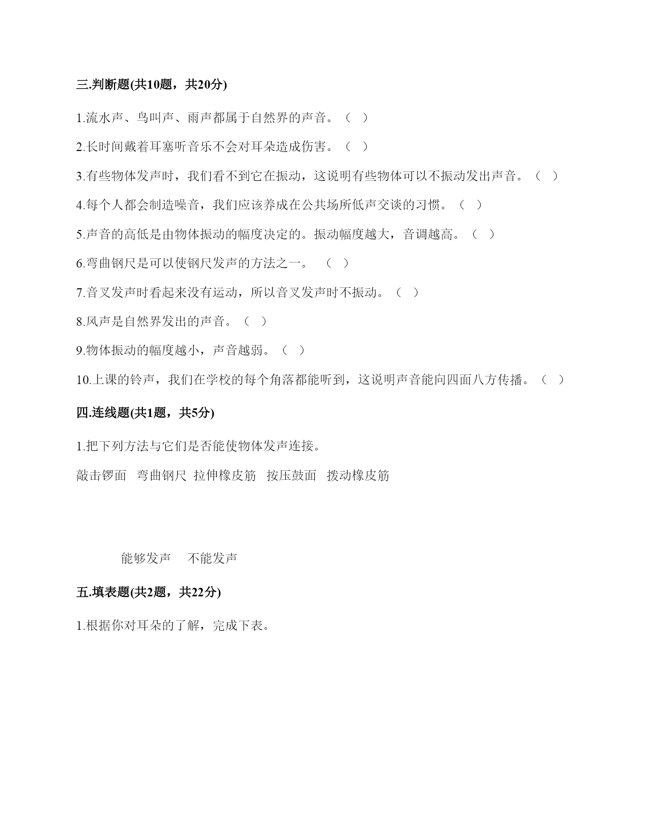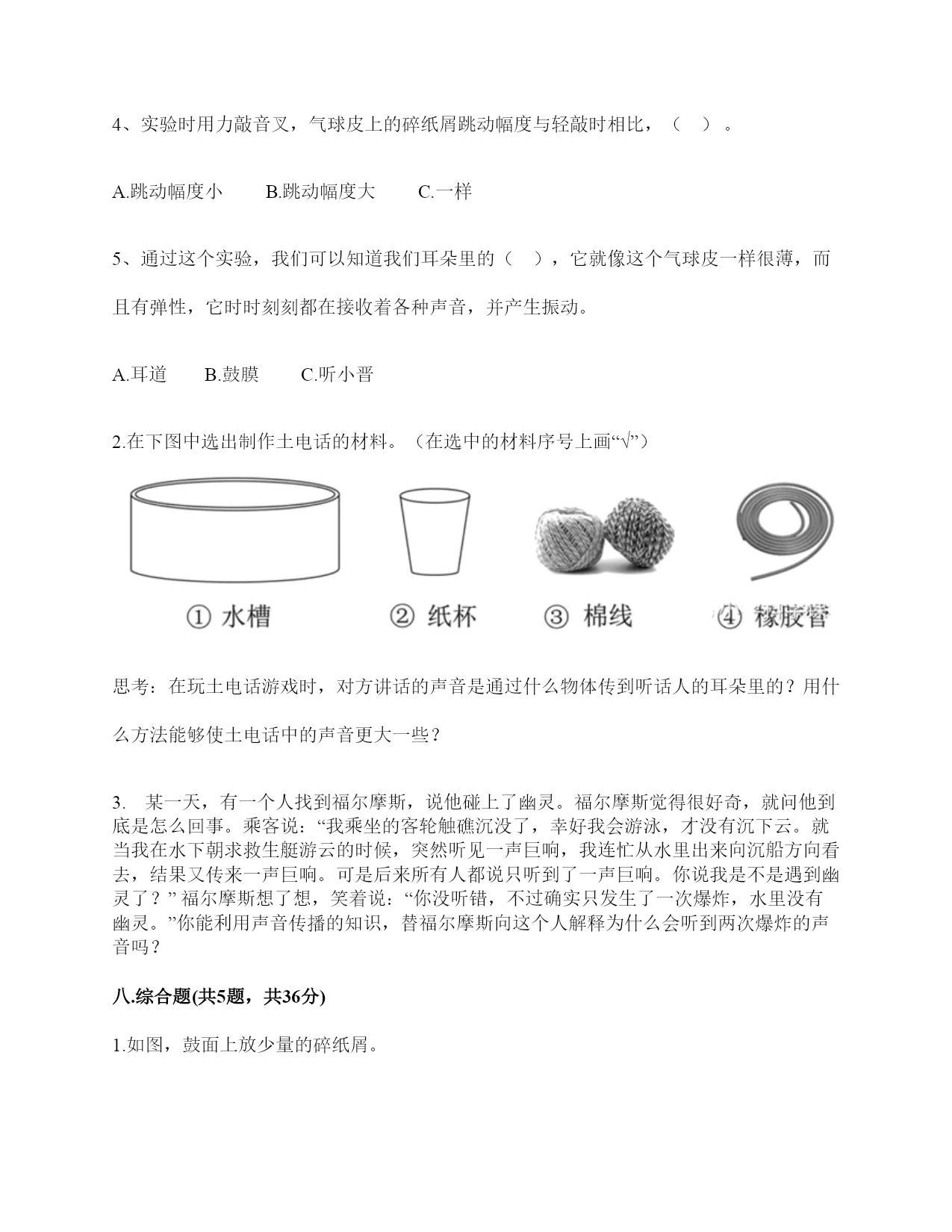 小学科学《声音》练习题一.选择题(共10题,共20分)1.耳朵结构中,感觉声音的部分是()。A.外耳B.中耳C.内耳2.下面不能用于描述声音的是()。A.高、低B.强、弱C.多、少3.下列说法正确的是()。A.用手拍打墙面,可以听到声音,但没看到墙在振动,说明发声时不一定要振动B.老师讲课的声音是通过空气传播到我们耳朵的C.声音能在气体、固体中传播,不能在液体中传播4.耳廓的作用是()。A.将声波转化为振动B.将听觉信号传递到大脑C.收集声音5.下面的乐器中,()不是通过空气振动发出声音的。A.口琴B.小号C.竖笛6.用嘴对着大小相同的4支试管吹气,下列哪支试管发出的声音最高()。A.不盛水的试管B.盛3/4水的试管C.盛1/2水的试管7.描述声音高低的是()。A.音高B.大声C.音量8.用手按住正在发声的锣,声音会马上停止,这是因为()。A.手挡住了声音B.手吸收了声音C.锣被按住后停止了振动9.下列现象中,说明声音能在液体中传播的是()。A.鱼被岸上的脚步声吓走B.游客听到瀑布倾泻而下的声音C.海边的人听到海浪拍击岩石的声音10.青青用同样大小的力敲击两个大小不同的音叉后放入水中,过了相同的时间后观察到水面形成的波纹不()(如图所示),由此可以推断()。A.甲是大音叉B.乙是大音叉C.无法确定二.填空题(共10题,共36分)1.乐器发出高低不同的声音的原理是物体振动得越快,发出的声音();物体铜动得越慢,发出的声音()。2.人的耳朵分为()、()、()。3.声带就像一根皮带。当我们发声时,声带变紧,并快速(),产生声音。声带越紧,发出的声音越()。4.声音的高低和物体振动的()有关。5.用同样的力敲打长短不同的两根铁管,长铁管发出的声音(),短铁管发出的声音()。A.高B.低C.强D.弱6.声音是由物体的()产生的,()停止声音就停止了。7.物体振动得越快,发出的声音就越(),物体振动得越慢,发出的声音就越()。8.我们的耳朵分为()三部分。9.一个物体,如音叉、钢尺等,在力的作用下,能不断重复地做往返运动,这个物体就是一个()物体。10.铝片琴上的铝片长短是不同的,敲击长的铝片发出的声音比较(),敲击短的铝片发出的声音比较()。三.判断题(共10题,共20分)1.流水声、鸟叫声、雨声都属于自然界的声音。()2.长时间戴着耳塞听音乐不会对耳朵造成伤害。()3.有些物体发声时,我们看不到它在振动,这说明有些物体可以不振动发出声音。()4.每个人都会制造噪音,我们应该养成在公共场所低声交谈的习惯。()5.声音的高低是由物体振动的幅度决定的。振动幅度越大,音调越高。()6.弯曲钢尺是可以使钢尺发声的方法之一。()7.音叉发声时看起来没有运动,所以音叉发声时不振动。()8.风声是自然界发出的声音。()9.物体振动的幅度越小,声音越弱。()10.上课的铃声,我们在学校的每个角落都能听到,这说明声音能向四面八方传播。()四.连线题(共1题,共5分)1.把下列方法与它们是否能使物体发声连接。敲击锣面弯曲钢尺拉伸橡皮筋按压鼓面拨动橡皮筋能够发声不能发声五.填表题(共2题,共22分)1.根据你对耳朵的了解,完成下表。2.完成声音强弱与振动物体的关系记录表。六.简答题(共5题,共25分)1.声音在传播的过程中借助了什么物质?2.同根弦发出的声音高低变化的规律是什么?3.为什么说“一个巴掌拍不响”?4.向水壶中倒水,随着水越到越多,听到的声音高低不同,倒的水越多,声音越高,其科学原理是什么?5.声音是怎样进行传播的?七.材料题(共3题,共24分)1.下图是乐用橡皮筋将一块绷紧的气球皮扎在杯口上,并在气球皮上撒一些碎纸屑,然后在杯子的上方敲击音叉观察实验现象,根据实验装置图完成下列问题。1、这是模拟()的装置。A.物体振动产生声音B.耳朵鼓膜振动C.液体溶解2、实验中敲击普叉发出的声音通过()传到气球皮上。A.音叉B.空气C.杯子3、实验时用力敲击音叉,观察到气球皮上的碎纸屑()。A.被音叉吸引B.不动C.在气球皮上跳动4、实验时用力敲音叉,气球皮上的碎纸屑跳动幅度与轻敲时相比,()。A.跳动幅度小B.跳动幅度大C.一样5、通过这个实验,我们可以知道我们耳朵里的(),它就像这个气球皮一样很薄,而且有弹性,它时时刻刻都在接收着各种声音,并产生振动。A.耳道B.鼓膜C.听小晋2.在下图中选出制作土电话的材料。(在选中的材料序号上画“√”)思考:在玩土电话游戏时,对方讲话的声音是通过什么物体传到听话人的耳朵里的?用什么方法能够使土电话中的声音更大一些?3.某一天,有一个人找到福尔摩斯,说他碰上