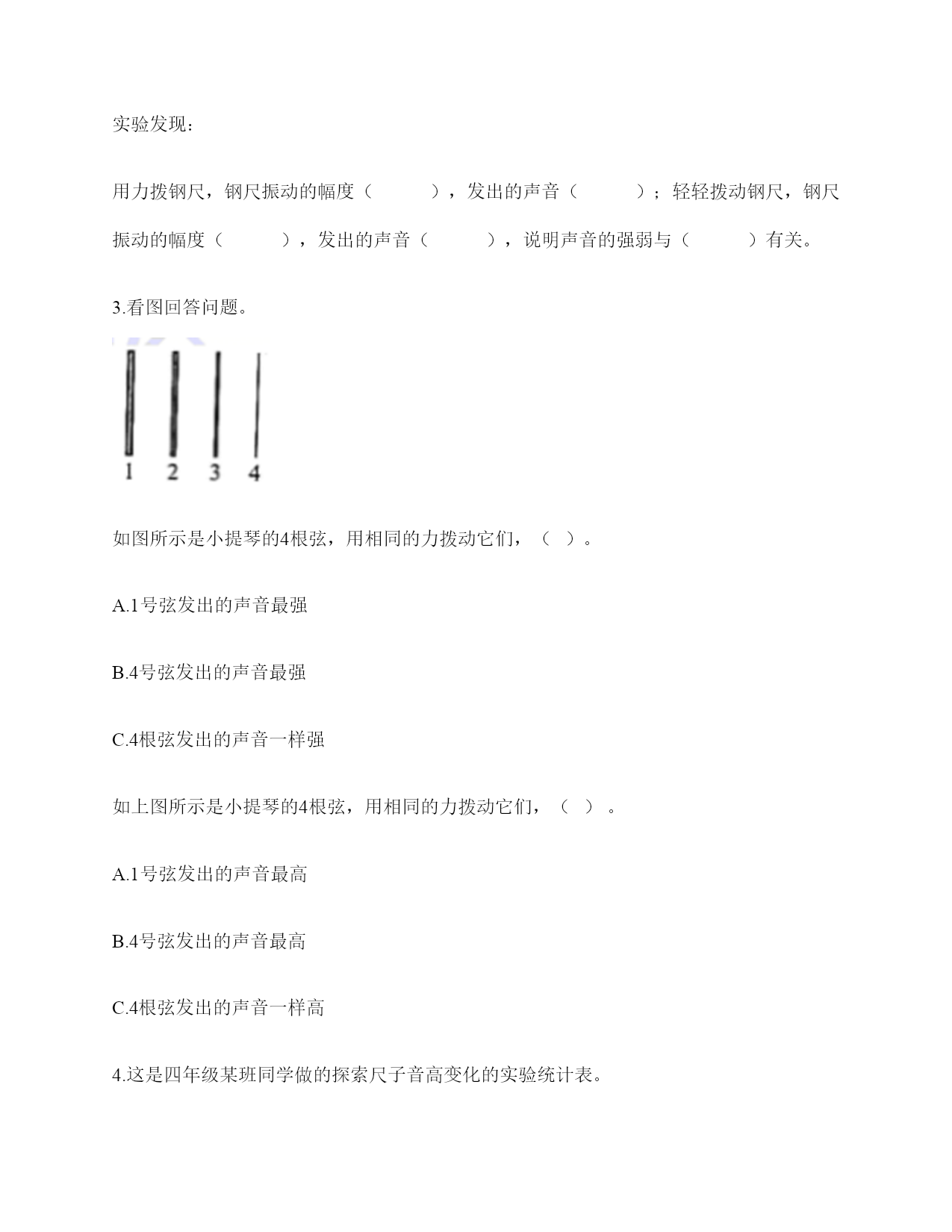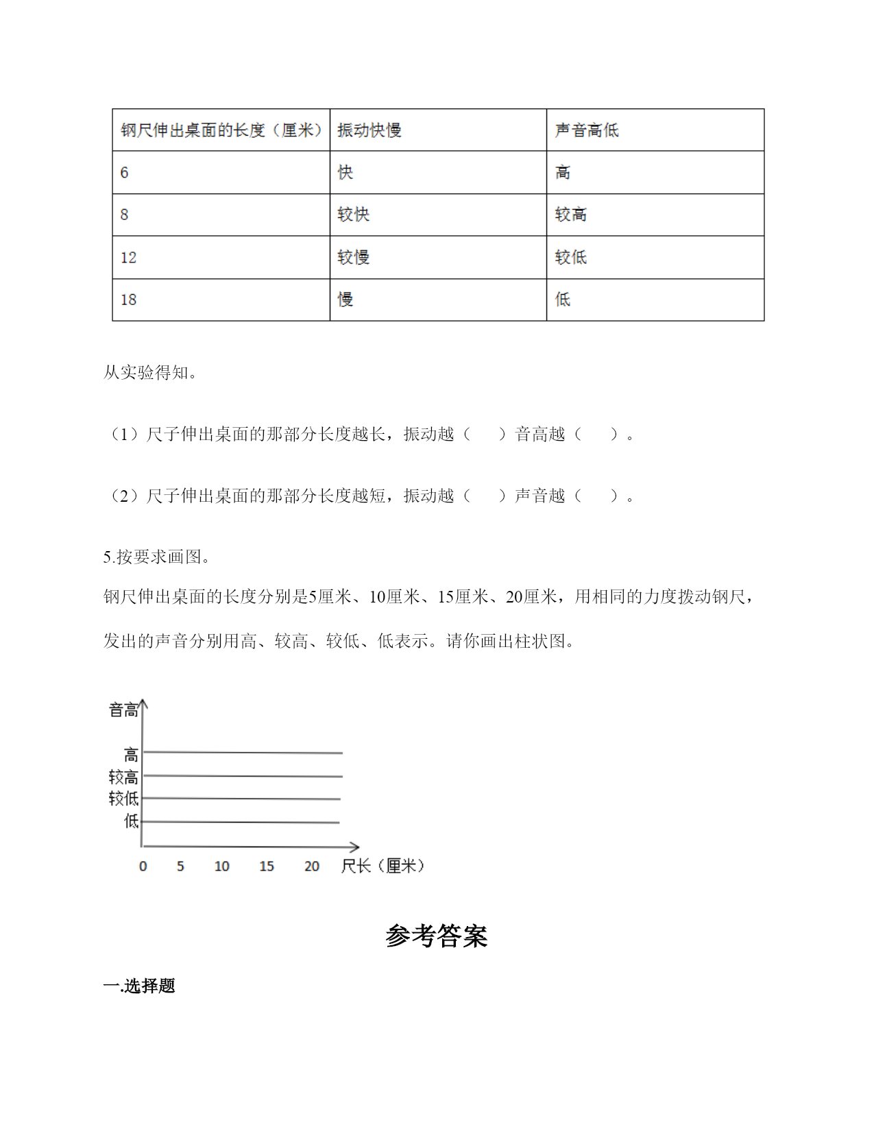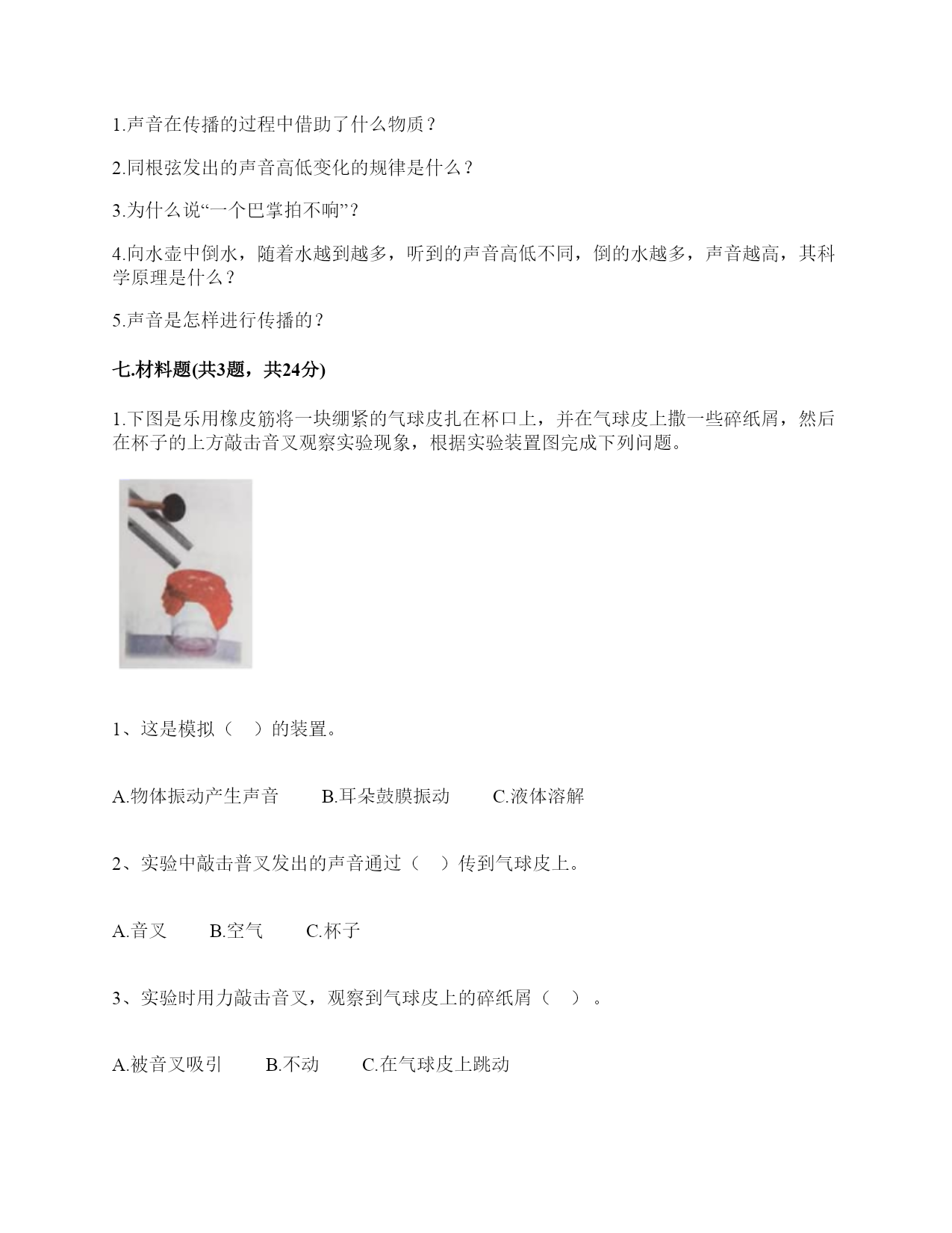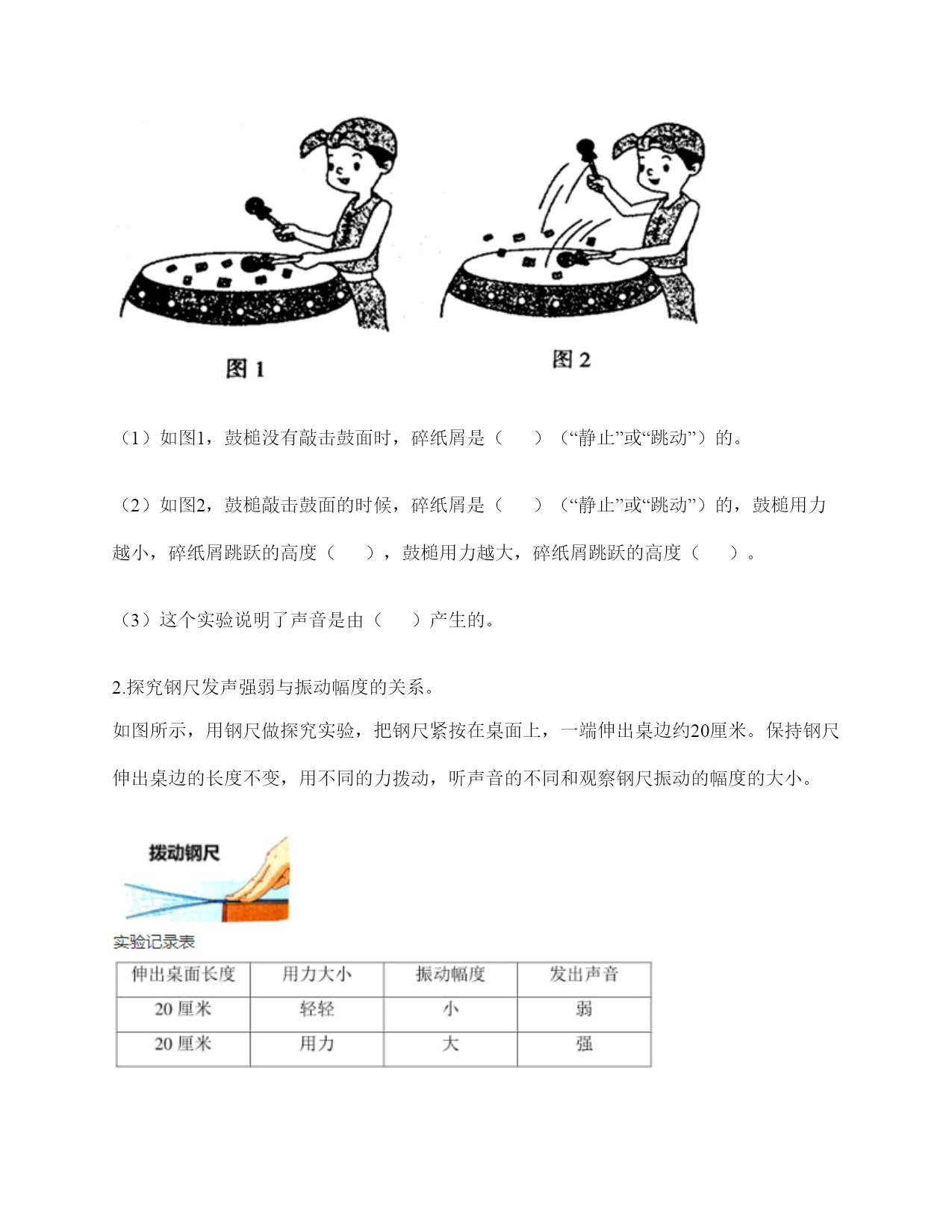 小学科学《声音》练习题一.选择题(共10题,共20分)1.耳朵结构中,感觉声音的部分是()。A.外耳B.中耳C.内耳2.下面不能用于描述声音的是()。A.高、低B.强、弱C.多、少3.下列说法正确的是()。A.用手拍打墙面,可以听到声音,但没看到墙在振动,说明发声时不一定要振动B.老师讲课的声音是通过空气传播到我们耳朵的C.声音能在气体、固体中传播,不能在液体中传播4.耳廓的作用是()。A.将声波转化为振动B.将听觉信号传递到大脑C.收集声音5.下面的乐器中,()不是通过空气振动发出声音的。A.口琴B.小号C.竖笛6.用嘴对着大小相同的4支试管吹气,下列哪支试管发出的声音最高()。A.不盛水的试管B.盛3/4水的试管C.盛1/2水的试管7.描述声音高低的是()。A.音高B.大声C.音量8.用手按住正在发声的锣,声音会马上停止,这是因为()。A.手挡住了声音B.手吸收了声音C.锣被按住后停止了振动9.下列现象中,说明声音能在液体中传播的是()。A.鱼被岸上的脚步声吓走B.游客听到瀑布倾泻而下的声音C.海边的人听到海浪拍击岩石的声音10.青青用同样大小的力敲击两个大小不同的音叉后放入水中,过了相同的时间后观察到水面形成的波纹不()(如图所示),由此可以推断()。A.甲是大音叉B.乙是大音叉C.无法确定二.填空题(共10题,共36分)1.乐器发出高低不同的声音的原理是物体振动得越快,发出的声音();物体铜动得越慢,发出的声音()。2.人的耳朵分为()、()、()。3.声带就像一根皮带。当我们发声时,声带变紧,并快速(),产生声音。声带越紧,发出的声音越()。4.声音的高低和物体振动的()有关。5.用同样的力敲打长短不同的两根铁管,长铁管发出的声音(),短铁管发出的声音()。A.高B.低C.强D.弱6.声音是由物体的()产生的,()停止声音就停止了。7.物体振动得越快,发出的声音就越(),物体振动得越慢,发出的声音就越()。8.我们的耳朵分为()三部分。9.一个物体,如音叉、钢尺等,在力的作用下,能不断重复地做往返运动,这个物体就是一个()物体。10.铝片琴上的铝片长短是不同的,敲击长的铝片发出的声音比较(),敲击短的铝片发出的声音比较()。三.判断题(共10题,共20分)1.流水声、鸟叫声、雨声都属于自然界的声音。()2.长时间戴着耳塞听音乐不会对耳朵造成伤害。()3.有些物体发声时,我们看不到它在振动,这说明有些物体可以不振动发出声音。()4.每个人都会制造噪音,我们应该养成在公共场所低声交谈的习惯。()5.声音的高低是由物体振动的幅度决定的。振动幅度越大,音调越高。()6.弯曲钢尺是可以使钢尺发声的方法之一。()7.音叉发声时看起来没有运动,所以音叉发声时不振动。()8.风声是自然界发出的声音。()9.物体振动的幅度越小,声音越弱。()10.上课的铃声,我们在学校的每个角落都能听到,这说明声音能向四面八方传播。()四.连线题(共1题,共5分)1.把下列方法与它们是否能使物体发声连接。敲击锣面弯曲钢尺拉伸橡皮筋按压鼓面拨动橡皮筋能够发声不能发声五.填表题(共2题,共22分)1.根据你对耳朵的了解,完成下表。2.完成声音强弱与振动物体的关系记录表。六.简答题(共5题,共25分)1.声音在传播的过程中借助了什么物质?2.同根弦发出的声音高低变化的规律是什么?3.为什么说“一个巴掌拍不响”?4.向水壶中倒水,随着水越到越多,听到的声音高低不同,倒的水越多,声音越高,其科学原理是什么?5.声音是怎样进行传播的?七.材料题(共3题,共24分)1.下图是乐用橡皮筋将一块绷紧的气球皮扎在杯口上,并在气球皮上撒一些碎纸屑,然后在杯子的上方敲击音叉观察实验现象,根据实验装置图完成下列问题。1、这是模拟()的装置。A.物体振动产生声音B.耳朵鼓膜振动C.液体溶解2、实验中敲击普叉发出的声音通过()传到气球皮上。A.音叉B.空气C.杯子3、实验时用力敲击音叉,观察到气球皮上的碎纸屑()。A.被音叉吸引B.不动C.在气球皮上跳动4、实验时用力敲音叉,气球皮上的碎纸屑跳动幅度与轻敲时相比,()。A.跳动幅度小B.跳动幅度大C.一样5、通过这个实验,我们可以知道我们耳朵里的(),它就像这个气球皮一样很薄,而且有弹性,它时时刻刻都在接收着各种声音,并产生振动。A.耳道B.鼓膜C.听小晋2.在下图中选出制作土电话的材料。(在选中的材料序号上画“√”)思考:在玩土电话游戏时,对方讲话的声音是通过什么物体传到听话人的耳朵里的?用什么方法能够使土电话中的声音更大一些?3.某一天,有一个人找到福尔摩斯,说他碰上