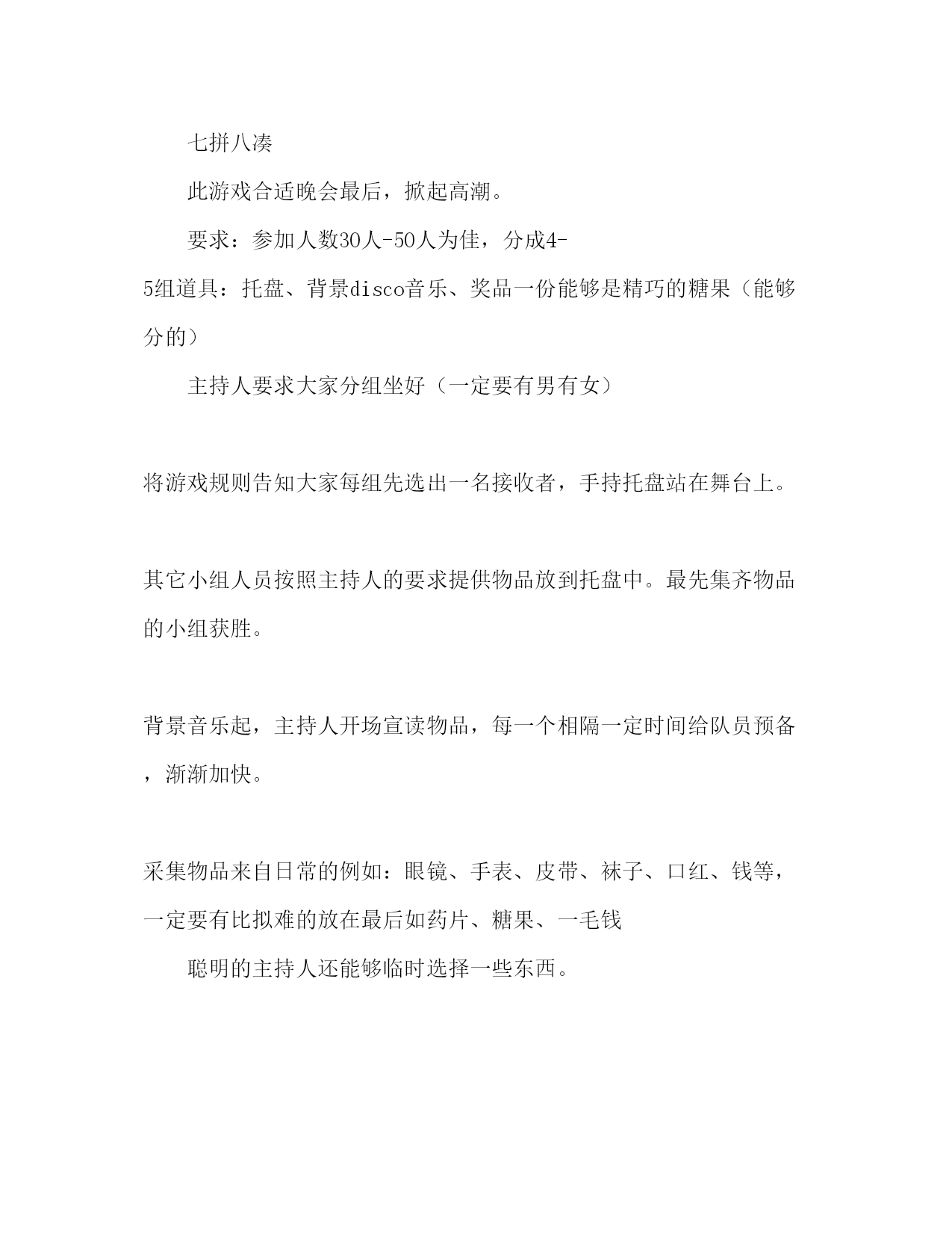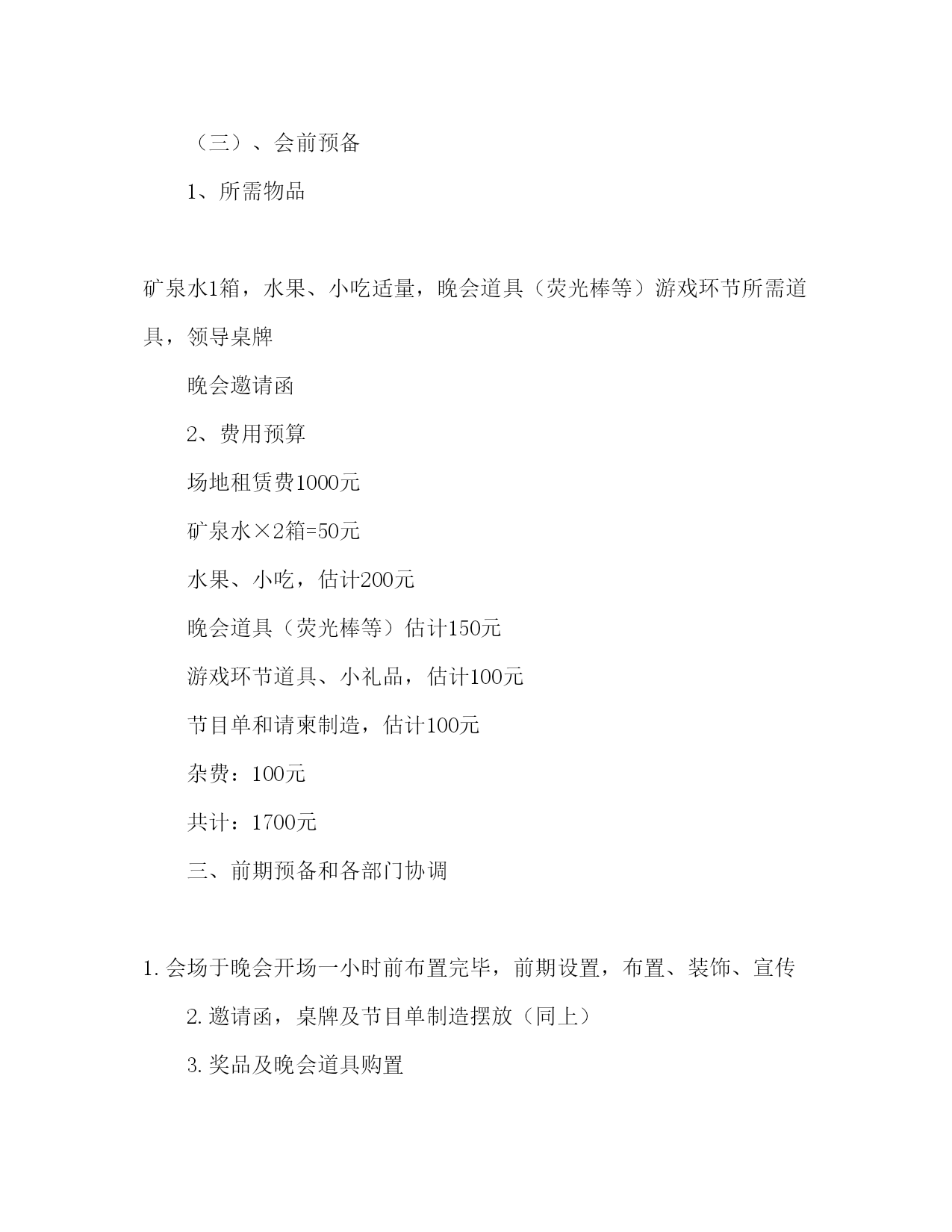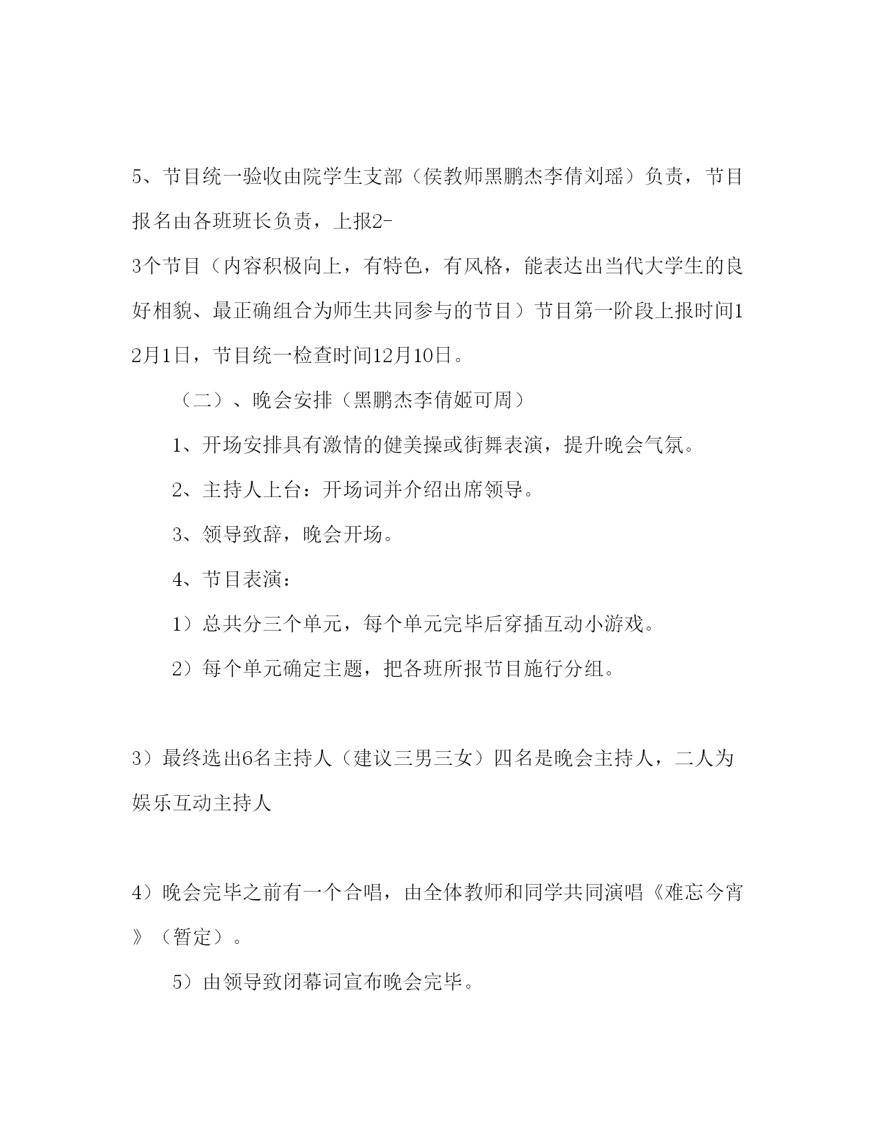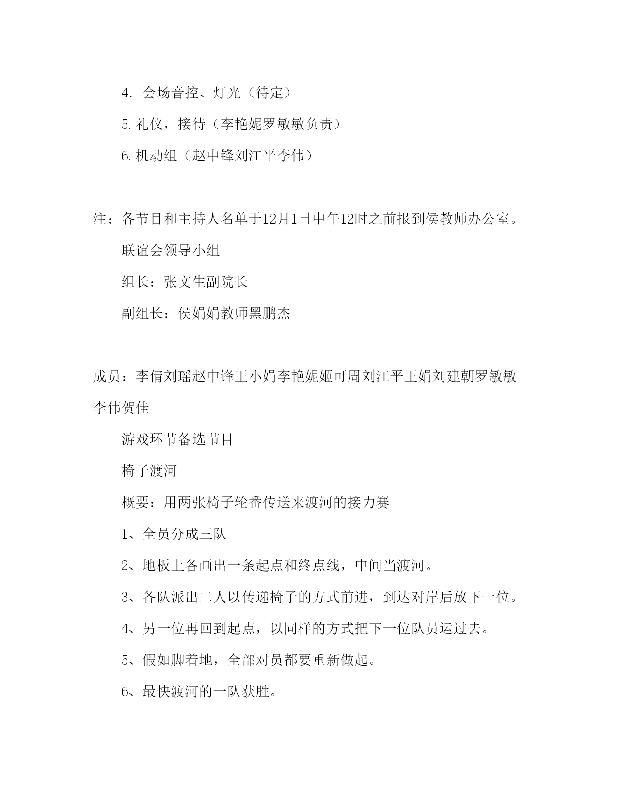 元旦研究生师生联谊活动策划书一、主办单位:政法学院研究生党支部二、晚会目的:旨在加强我院研究生师生之间的交流与合作,增进师生之间的理解、加深学生之间的友谊,共同迎接圣诞和新年到来,为构建和谐校园而努力。三、晚会主题:团结和谐欢乐感恩四、晚会时间:12月24日晚7时五、晚会地点:亿洋酒店二楼宴会厅八、出席人员:院领导、研究生学院领导、教师,院硕士生导师,院全体研究生。前期预备一、宣传1、宣传和扩大妨碍力:由院研究生(姬可周王娟)负责2、制造、派发请帖和邀请函:请贴和邀请函由院研究生支部制造,在晚会前两天,由院研究生支部负责发送请帖,邀请院领导、研究生学院领导、教师,院硕士生导师。3、在晚会的前两天,制造节目单20份并派发给现场嘉宾。二、活动操作方案(一)、物品预备:1、晚会前一日所需舞台设备(灯光、扩音设备、话筒)所有节目所需道具全部到位2、灯光、音响等器械布置,由院研究生支部负责(详细人员待定,熟悉灯光音响操纵)要求在活动开场前将器械布置并调试好,整个活动期间还负责灯光音响的调控以及保护,活动完毕后负责将器械交还。3、舞台设计与布置,由院研究生支部(李倩刘瑶罗敏敏负责)依照负责人的设计方案布置舞台,在活动进展期间还负责所需表演物品的保管(统一找地点存放,如礼品包、各类道具等等,由两名同学看守)搬运和布置4、主持人选拔由各班推荐一名(男女比例适当,最好由08和09级同学担任)5、节目统一验收由院学生支部(侯教师黑鹏杰李倩刘瑶)负责,节目报名由各班班长负责,上报2-3个节目(内容积极向上,有特色,有风格,能表达出当代大学生的良好相貌、最正确组合为师生共同参与的节目)节目第一阶段上报时间12月1日,节目统一检查时间12月10日。(二)、晚会安排(黑鹏杰李倩姬可周)1、开场安排具有激情的健美操或街舞表演,提升晚会气氛。2、主持人上台:开场词并介绍出席领导。3、领导致辞,晚会开场。4、节目表演:1)总共分三个单元,每个单元完毕后穿插互动小游戏。2)每个单元确定主题,把各班所报节目施行分组。3)最终选出6名主持人(建议三男三女)四名是晚会主持人,二人为娱乐互动主持人4)晚会完毕之前有一个合唱,由全体教师和同学共同演唱《难忘今宵》(暂定)。5)由领导致闭幕词宣布晚会完毕。(三)、会前预备1、所需物品矿泉水1箱,水果、小吃适量,晚会道具(荧光棒等)游戏环节所需道具,领导桌牌晚会邀请函2、费用预算场地租赁费1000元矿泉水×2箱=50元水果、小吃,估计200元晚会道具(荧光棒等)估计150元游戏环节道具、小礼品,估计100元节目单和请柬制造,估计100元杂费:100元共计:1700元三、前期预备和各部门协调1.会场于晚会开场一小时前布置完毕,前期设置,布置、装饰、宣传2.邀请函,桌牌及节目单制造摆放(同上)3.奖品及晚会道具购置4.会场音控、灯光(待定)5.礼仪,接待(李艳妮罗敏敏负责)6.机动组(赵中锋刘江平李伟)注:各节目和主持人名单于12月1日中午12时之前报到侯教师办公室。联谊会领导小组组长:张文生副院长副组长:侯娟娟教师黑鹏杰成员:李倩刘瑶赵中锋王小娟李艳妮姬可周刘江平王娟刘建朝罗敏敏李伟贺佳游戏环节备选节目椅子渡河概要:用两张椅子轮番传送来渡河的接力赛1、全员分成三队2、地板上各画出一条起点和终点线,中间当渡河。3、各队派出二人以传递椅子的方式前进,到达对岸后放下一位。4、另一位再回到起点,以同样的方式把下一位队员运过去。5、假如脚着地,全部对员都要重新做起。6、最快渡河的一队获胜。七拼八凑此游戏合适晚会最后,掀起高潮。要求:参加人数30人-50人为佳,分成4-5组道具:托盘、背景disco音乐、奖品一份能够是精巧的糖果(能够分的)主持人要求大家分组坐好(一定要有男有女)将游戏规则告知大家每组先选出一名接收者,手持托盘站在舞台上。其它小组人员按照主持人的要求提供物品放到托盘中。最先集齐物品的小组获胜。背景音乐起,主持人开场宣读物品,每一个相隔一定时间给队员预备,渐渐加快。采集物品来自日常的例如:眼镜、手表、皮带、袜子、口红、钱等,一定要有比拟难的放在最后如药片、糖果、一毛钱聪明的主持人还能够临时选择一些东西。心心相印,我来比你来猜道具:游戏标题(能够是具有可表演性的成语或词语)