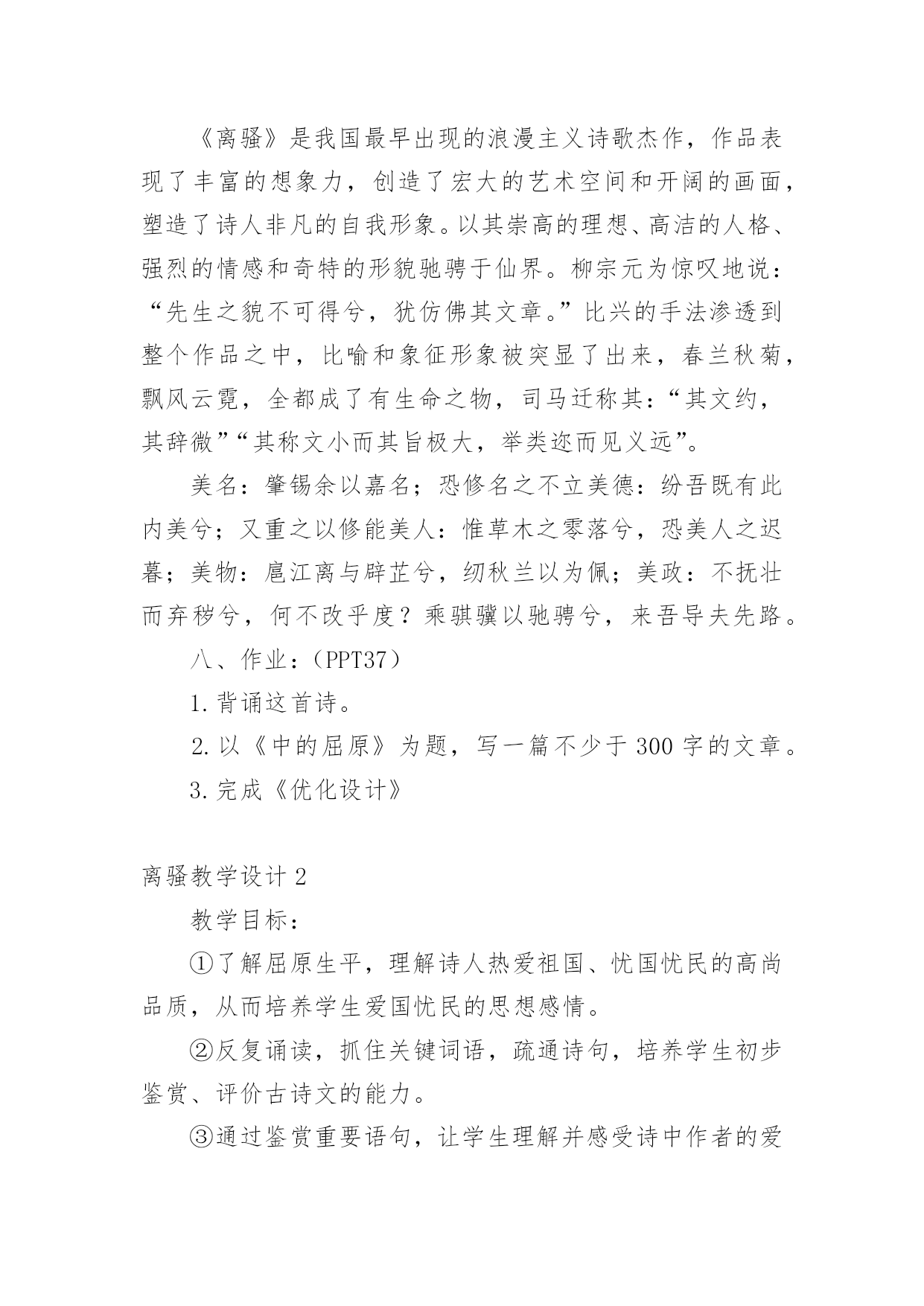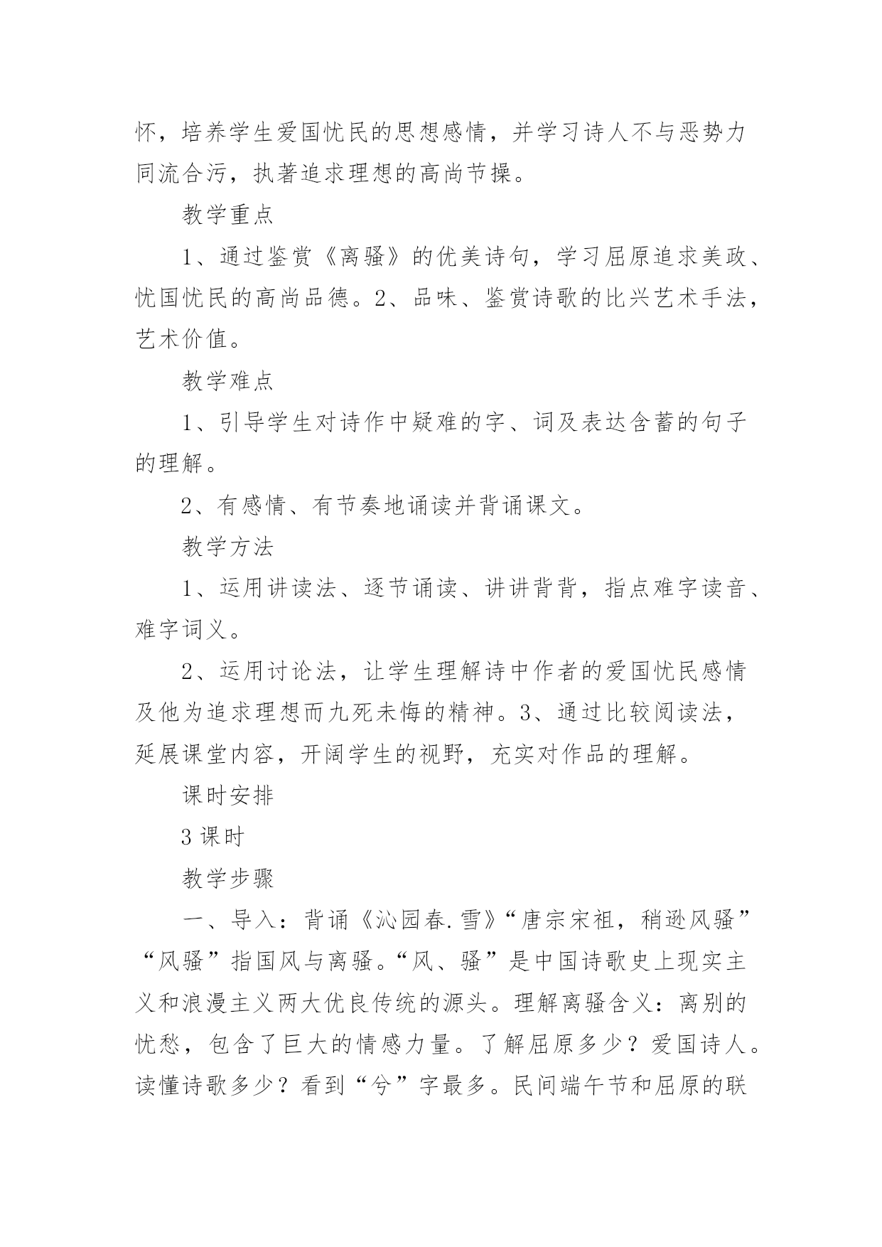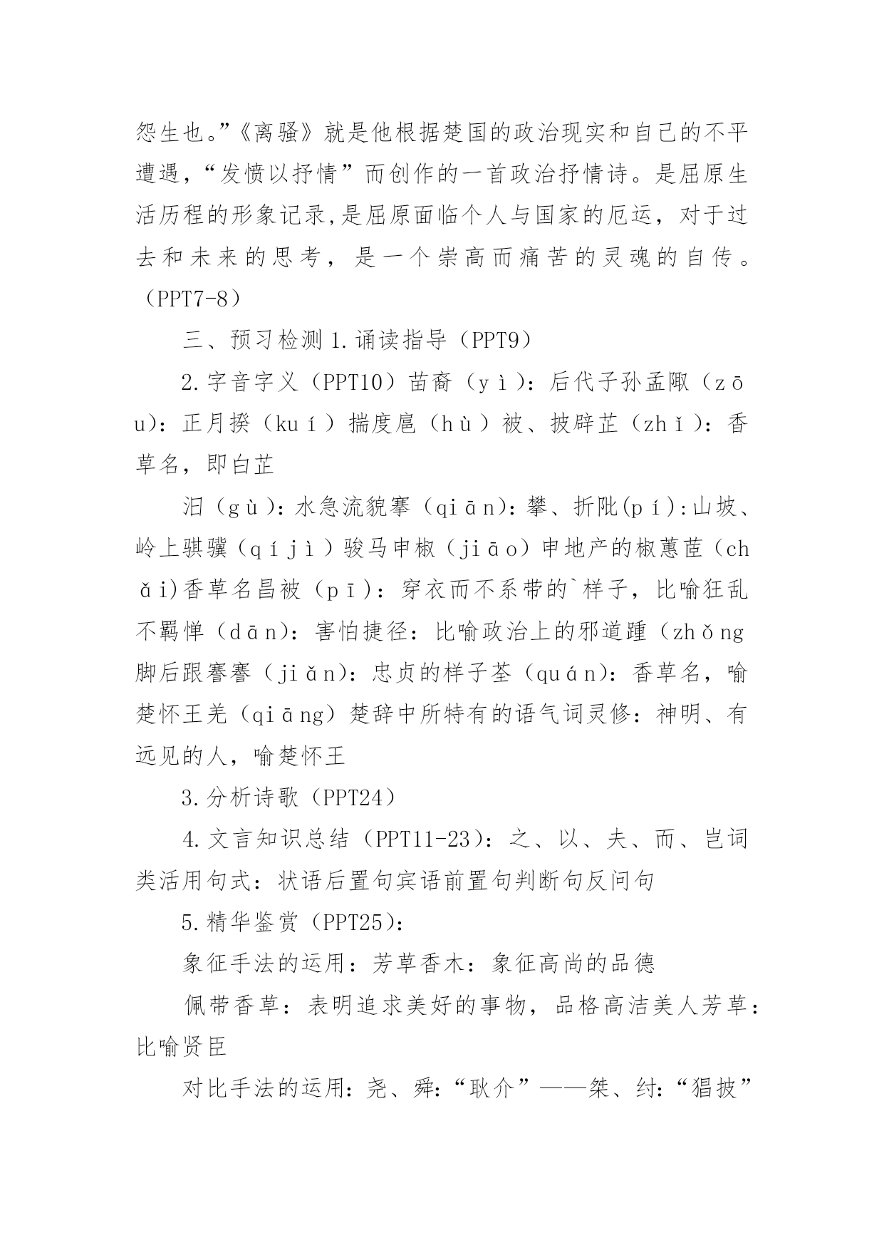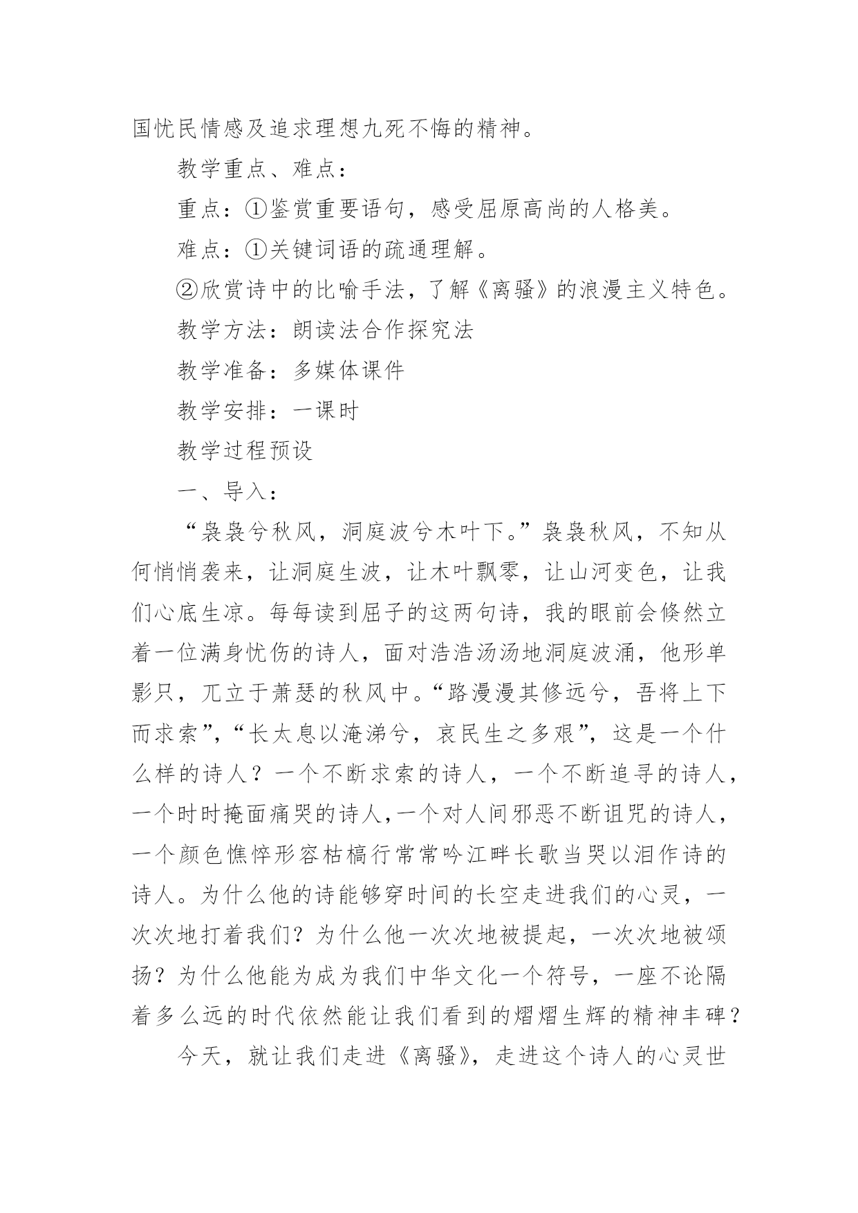 离骚教学设计作为一位优秀的人民教师,通常需要准备好一份教学设计,教学设计是对学业业绩问题的解决措施进行策划的过程。我们应该怎么写教学设计呢?下面是小编为大家整理的离骚教学设计,供大家参考借鉴,希望可以帮助到有需要的朋友。离骚教学设计1知识目标1、了解《离骚》是《诗经》以后的一次诗体大解放,是“楚辞”体的代表作品。2、通过学习《离骚》,了解文学作品中常用的“移情法”。如屈原借诗中的的“香草”“美人”表述自己的政治理想及情怀。3、学会吟诵古诗词,注意节拍、重音。4、了解以屈原作品为代表的积极浪漫主义和创作手法:丰富的想象,形象的描述。能力目标1、培养通过把握诗文形象,深入体会作者的思想感情的能力。2、掌握文言实词、虚词,培养学生阅读古诗文的能力。德育目标通过学习《离骚》,理解诗人热爱祖国、忧国忧民的情怀,培养学生爱国忧民的思想感情,并学习诗人不与恶势力同流合污,执著追求理想的高尚节操。教学重点1、通过鉴赏《离骚》的优美诗句,学习屈原追求美政、忧国忧民的高尚品德。2、品味、鉴赏诗歌的比兴艺术手法,艺术价值。教学难点1、引导学生对诗作中疑难的字、词及表达含蓄的句子的理解。2、有感情、有节奏地诵读并背诵课文。教学方法1、运用讲读法、逐节诵读、讲讲背背,指点难字读音、难字词义。2、运用讨论法,让学生理解诗中作者的爱国忧民感情及他为追求理想而九死未悔的精神。3、通过比较阅读法,延展课堂内容,开阔学生的视野,充实对作品的理解。课时安排3课时教学步骤一、导入:背诵《沁园春.雪》“唐宗宋祖,稍逊风骚”“风骚”指国风与离骚。“风、骚”是中国诗歌史上现实主义和浪漫主义两大优良传统的源头。理解离骚含义:离别的忧愁,包含了巨大的情感力量。了解屈原多少?爱国诗人。读懂诗歌多少?看到“兮”字最多。民间端午节和屈原的联系,引出人们对屈原的认识。(PPT2)二、文学常识1.总说:印象中的屈原(PPT3)2.杰出的政治家(PPT4-5),伟大的诗人屈原(PPT6-7)(约前339~约前278),中国战国末期楚国人,杰出的政治家和爱国诗人。名平,字原。早年深受楚怀王的宠信,位为左徒、三闾大夫。屈原为实现楚国的统一大业,坚决主张联齐抗秦,屈原后来遭到群小的诬陷和楚怀王的疏远及顷襄王的放逐。流放江南,辗转流离于沅、湘二水之间。顷襄王二十一年(前278),秦将白起攻破郢都,屈原悲愤难捱,遂自沉汨罗江,以身殉了自己的政治理想。屈原的作品计有《离骚》、《天问》、《九歌》(11篇)、《九章》(9篇)、《招魂》,凡23篇。其中,《离骚》是屈原的代表作,也是中国古代文学史上最长的一首浪漫主义的政治抒情诗。以一系列比兴手法来表情达意。如他以鲜花、香草来比喻品行高洁的君子;以臭物、萧艾比喻奸佞或变节的小人;以佩带香草来象征诗人的品德修养。这种“香草美人”的比兴手法,使现实中的忠奸、美丑、善恶形成鲜明对照,产生了言简意赅、言有尽而意无穷的艺术效果。屈原的作品形式上参差错落、灵活多变;语言上采用了大量楚地方言,极富于乡土气息;其方言土语大都经过提炼,辞藻华美,传神状貌,极富于表现力。3.解题:创作缘由:司马迁在《史记屈原列传》中说:“屈原正道直行,竭忠尽智以事其君,谗人间之,可谓穷矣。信而见疑,忠而被谤,能无怨乎?屈平之作《离骚》,盖自怨生也。”《离骚》就是他根据楚国的政治现实和自己的不平遭遇,“发愤以抒情”而创作的一首政治抒情诗。是屈原生活历程的形象记录,是屈原面临个人与国家的厄运,对于过去和未来的思考,是一个崇高而痛苦的灵魂的自传。(PPT7-8)三、预习检测1.诵读指导(PPT9)2.字音字义(PPT10)苗裔(yì):后代子孙孟陬(zōu):正月揆(kuí)揣度扈(hù)被、披辟芷(zhǐ):香草名,即白芷汨(gù):水急流貌搴(qiān):攀、折阰(pí):山坡、岭上骐骥(qíjì)骏马申椒(jiāo)申地产的椒蕙茝(chǎi)香草名昌被(pī):穿衣而不系带的`样子,比喻狂乱不羁惮(dān):害怕捷径:比喻政治上的邪道踵(zhǒng脚后跟謇謇(jiǎn):忠贞的样子荃(quán):香草名,喻楚怀王羌(qiāng)楚辞中所特有的语气词灵修:神明、有远见的人,喻楚怀王3.分析诗歌(PPT24)4.文言知识总结(PPT11-23):之、以、夫、而、岂词类活用句式:状语后置句宾语前置句判断句反问句5.精华鉴赏(PPT25):象征手法的运用:芳草香木:象征高尚的品德佩带香草:表明追求美好的事物,品格高洁美人芳草:比喻贤臣对比手法的运用:尧、舜:“耿介”——桀、纣:“猖披”吾:“恐年岁之不与”——党人:“偷乐”灵活的诗歌体式--“骚体诗”:将“兮”放在单句的末尾,两句一韵。6.自译诗歌(PPT26-31)我本是古帝高阳氏的后裔,号叫伯庸的是我已故的父亲。太岁在寅的那一年的正月,庚寅的那