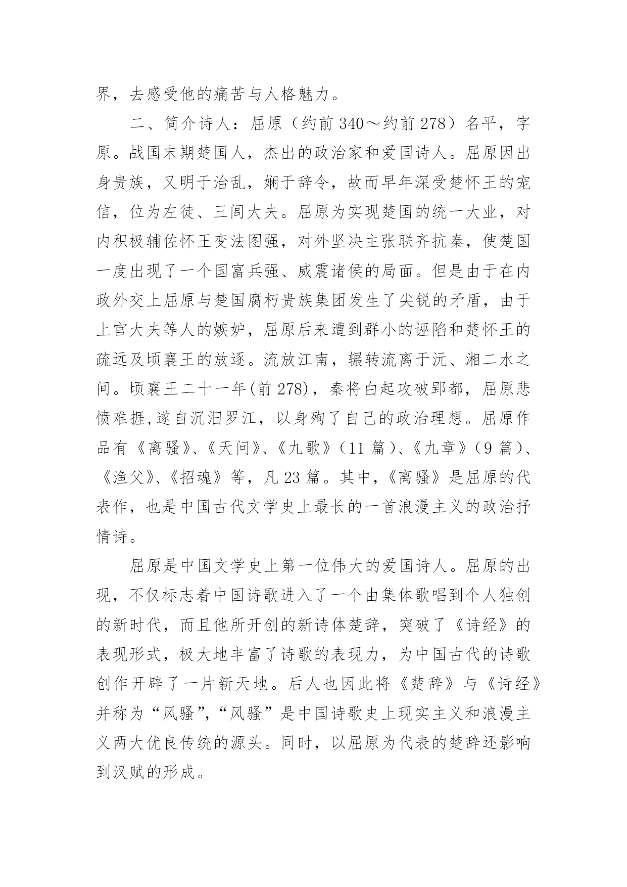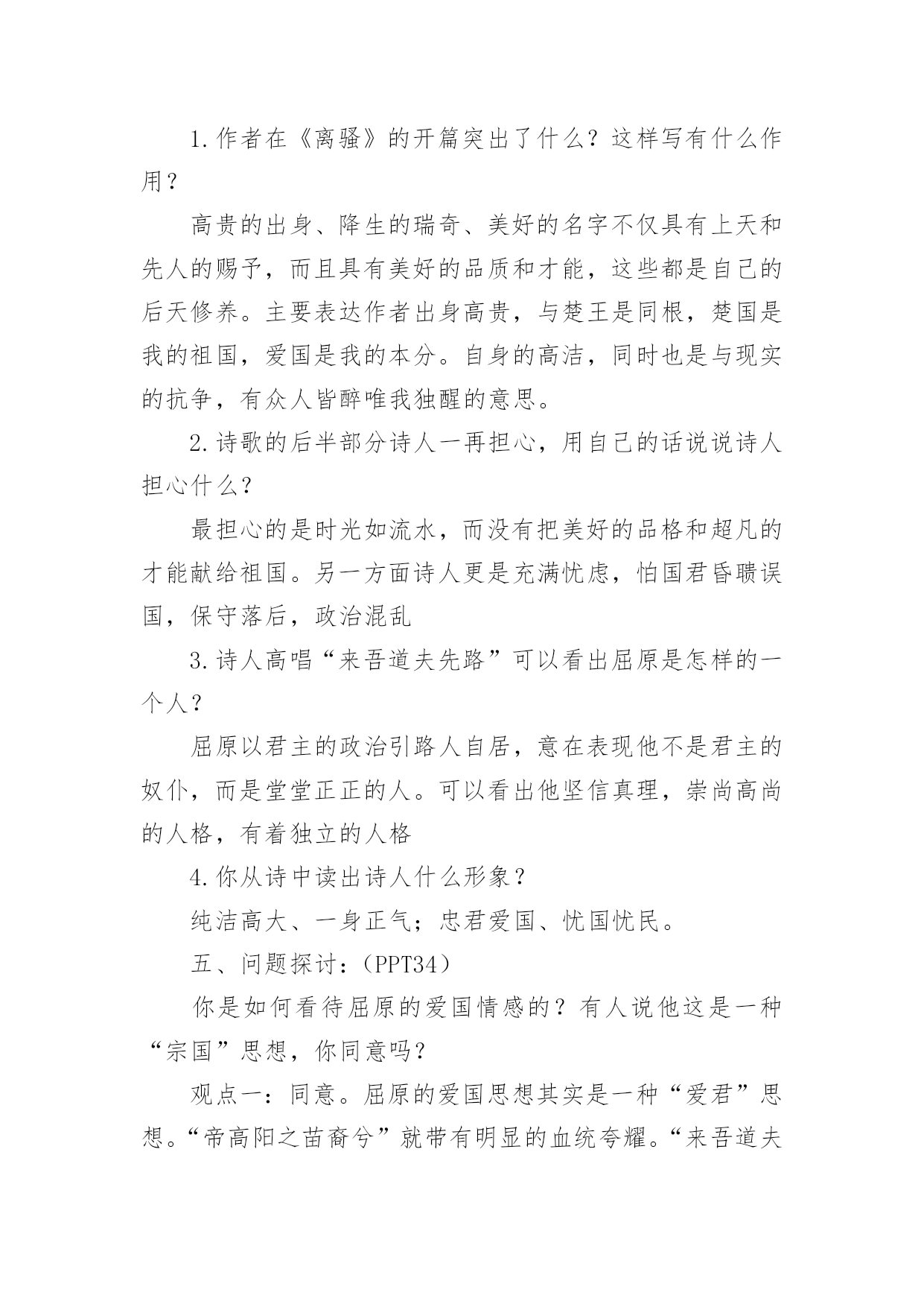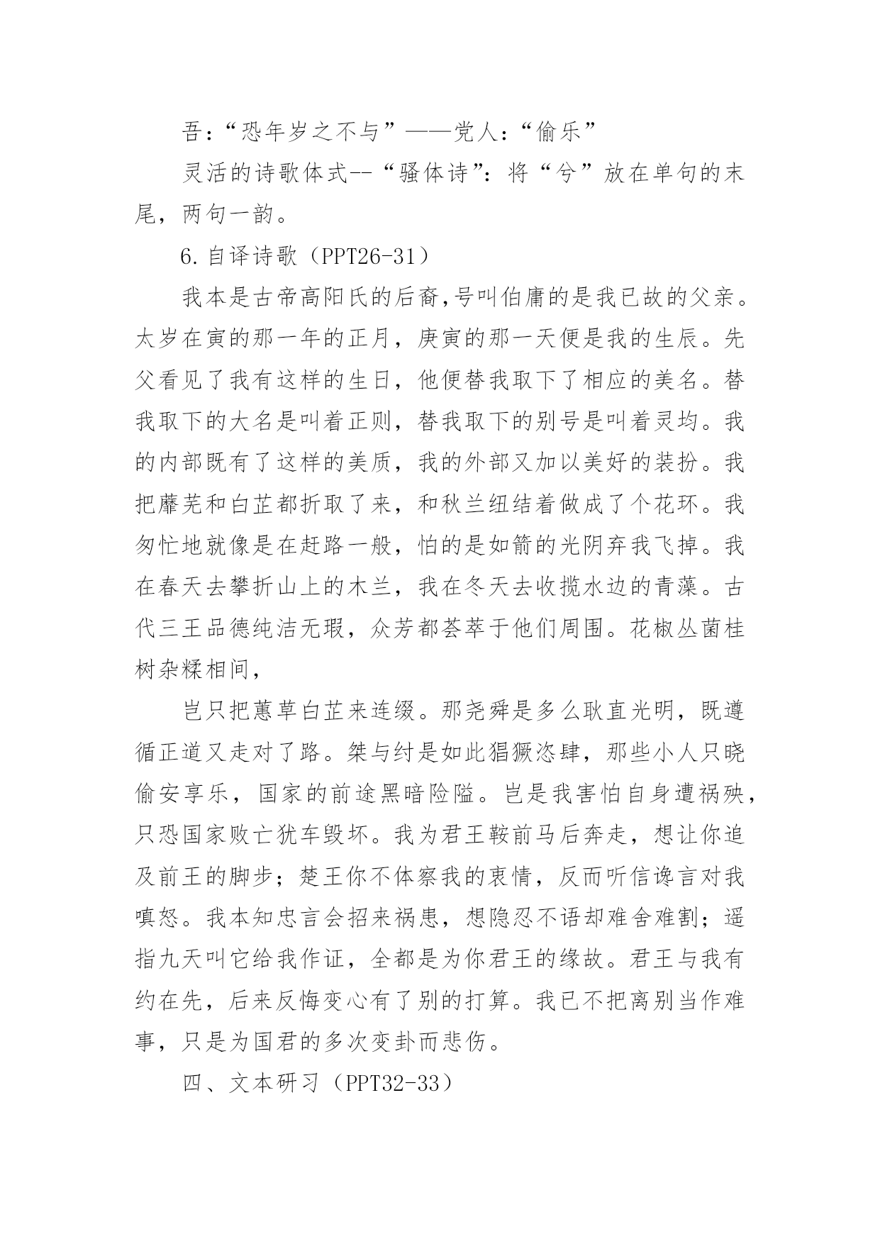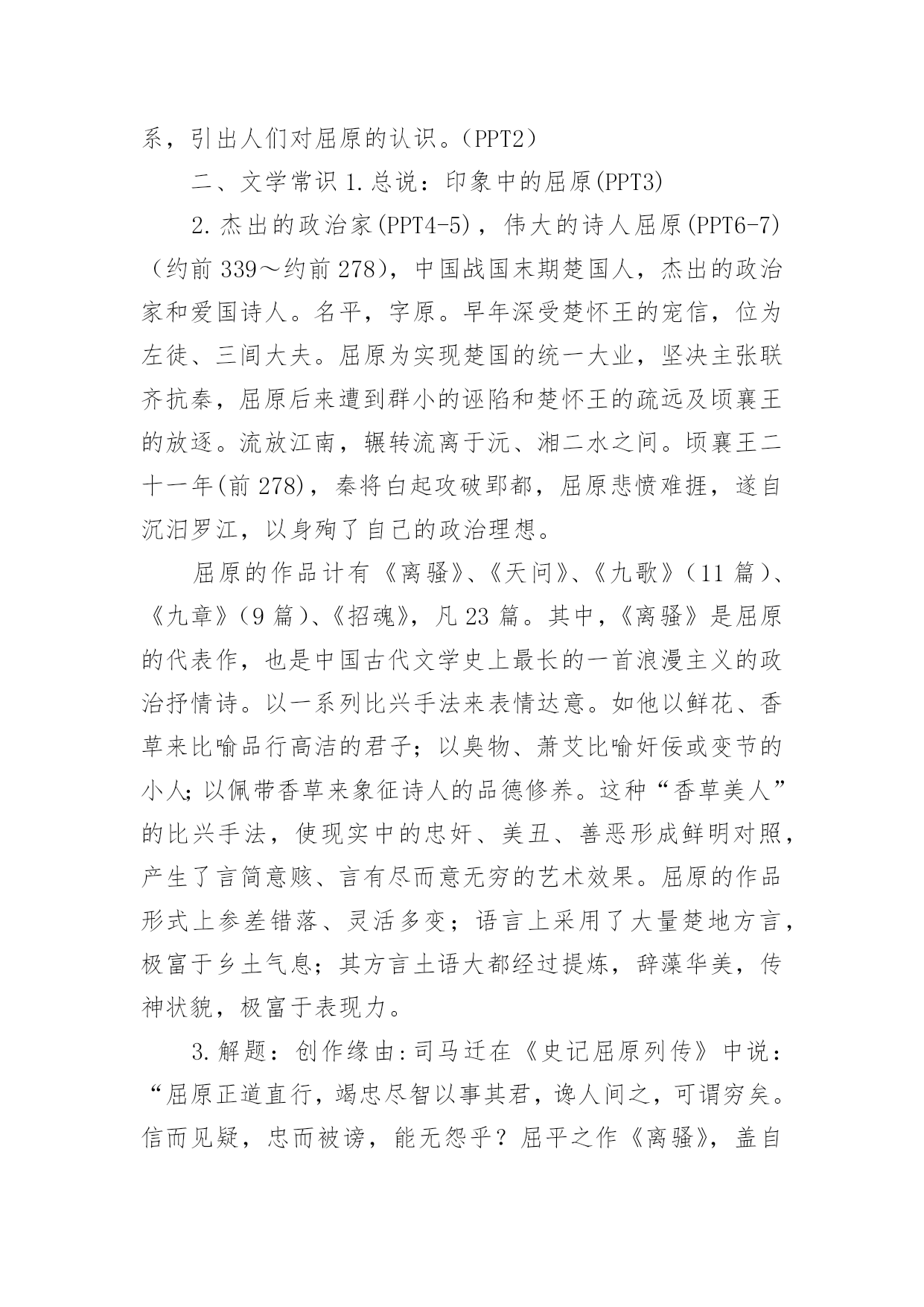 离骚教学设计作为一位优秀的人民教师,通常需要准备好一份教学设计,教学设计是对学业业绩问题的解决措施进行策划的过程。我们应该怎么写教学设计呢?下面是小编为大家整理的离骚教学设计,供大家参考借鉴,希望可以帮助到有需要的朋友。离骚教学设计1知识目标1、了解《离骚》是《诗经》以后的一次诗体大解放,是“楚辞”体的代表作品。2、通过学习《离骚》,了解文学作品中常用的“移情法”。如屈原借诗中的的“香草”“美人”表述自己的政治理想及情怀。3、学会吟诵古诗词,注意节拍、重音。4、了解以屈原作品为代表的积极浪漫主义和创作手法:丰富的想象,形象的描述。能力目标1、培养通过把握诗文形象,深入体会作者的思想感情的能力。2、掌握文言实词、虚词,培养学生阅读古诗文的能力。德育目标通过学习《离骚》,理解诗人热爱祖国、忧国忧民的情怀,培养学生爱国忧民的思想感情,并学习诗人不与恶势力同流合污,执著追求理想的高尚节操。教学重点1、通过鉴赏《离骚》的优美诗句,学习屈原追求美政、忧国忧民的高尚品德。2、品味、鉴赏诗歌的比兴艺术手法,艺术价值。教学难点1、引导学生对诗作中疑难的字、词及表达含蓄的句子的理解。2、有感情、有节奏地诵读并背诵课文。教学方法1、运用讲读法、逐节诵读、讲讲背背,指点难字读音、难字词义。2、运用讨论法,让学生理解诗中作者的爱国忧民感情及他为追求理想而九死未悔的精神。3、通过比较阅读法,延展课堂内容,开阔学生的视野,充实对作品的理解。课时安排3课时教学步骤一、导入:背诵《沁园春.雪》“唐宗宋祖,稍逊风骚”“风骚”指国风与离骚。“风、骚”是中国诗歌史上现实主义和浪漫主义两大优良传统的源头。理解离骚含义:离别的忧愁,包含了巨大的情感力量。了解屈原多少?爱国诗人。读懂诗歌多少?看到“兮”字最多。民间端午节和屈原的联系,引出人们对屈原的认识。(PPT2)二、文学常识1.总说:印象中的屈原(PPT3)2.杰出的政治家(PPT4-5),伟大的诗人屈原(PPT6-7)(约前339~约前278),中国战国末期楚国人,杰出的政治家和爱国诗人。名平,字原。早年深受楚怀王的宠信,位为左徒、三闾大夫。屈原为实现楚国的统一大业,坚决主张联齐抗秦,屈原后来遭到群小的诬陷和楚怀王的疏远及顷襄王的放逐。流放江南,辗转流离于沅、湘二水之间。顷襄王二十一年(前278),秦将白起攻破郢都,屈原悲愤难捱,遂自沉汨罗江,以身殉了自己的政治理想。屈原的作品计有《离骚》、《天问》、《九歌》(11篇)、《九章》(9篇)、《招魂》,凡23篇。其中,《离骚》是屈原的代表作,也是中国古代文学史上最长的一首浪漫主义的政治抒情诗。以一系列比兴手法来表情达意。如他以鲜花、香草来比喻品行高洁的君子;以臭物、萧艾比喻奸佞或变节的小人;以佩带香草来象征诗人的品德修养。这种“香草美人”的比兴手法,使现实中的忠奸、美丑、善恶形成鲜明对照,产生了言简意赅、言有尽而意无穷的艺术效果。屈原的作品形式上参差错落、灵活多变;语言上采用了大量楚地方言,极富于乡土气息;其方言土语大都经过提炼,辞藻华美,传神状貌,极富于表现力。3.解题:创作缘由:司马迁在《史记屈原列传》中说:“屈原正道直行,竭忠尽智以事其君,谗人间之,可谓穷矣。信而见疑,忠而被谤,能无怨乎?屈平之作《离骚》,盖自怨生也。”《离骚》就是他根据楚国的政治现实和自己的不平遭遇,“发愤以抒情”而创作的一首政治抒情诗。是屈原生活历程的形象记录,是屈原面临个人与国家的厄运,对于过去和未来的思考,是一个崇高而痛苦的灵魂的自传。(PPT7-8)三、预习检测1.诵读指导(PPT9)2.字音字义(PPT10)苗裔(yì):后代子孙孟陬(zōu):正月揆(kuí)揣度扈(hù)被、披辟芷(zhǐ):香草名,即白芷汨(gù):水急流貌搴(qiān):攀、折阰(pí):山坡、岭上骐骥(qíjì)骏马申椒(jiāo)申地产的椒蕙茝(chǎi)香草名昌被(pī):穿衣而不系带的`样子,比喻狂乱不羁惮(dān):害怕捷径:比喻政治上的邪道踵(zhǒng脚后跟謇謇(jiǎn):忠贞的样子荃(quán):香草名,喻楚怀王羌(qiāng)楚辞中所特有的语气词灵修:神明、有远见的人,喻楚怀王3.分析诗歌(PPT24)4.文言知识总结(PPT11-23):之、以、夫、而、岂词类活用句式:状语后置句宾语前置句判断句反问句5.精华鉴赏(PPT25):象征手法的运用:芳草香木:象征高尚的品德佩带香草:表明追求美好的事物,品格高洁美人芳草:比喻贤臣对比手法的运用:尧、舜:“耿介”——桀、纣:“猖披”吾:“恐年岁之不与”——党人:“偷乐”灵活的诗歌体式--“骚体诗”:将“兮”放在单句的末尾,两句一韵。6.自译诗歌(PPT26-31)我本是古帝高阳氏的后裔,号叫伯庸的是我已故的父亲。太岁在寅的那一年的正月,庚寅的那