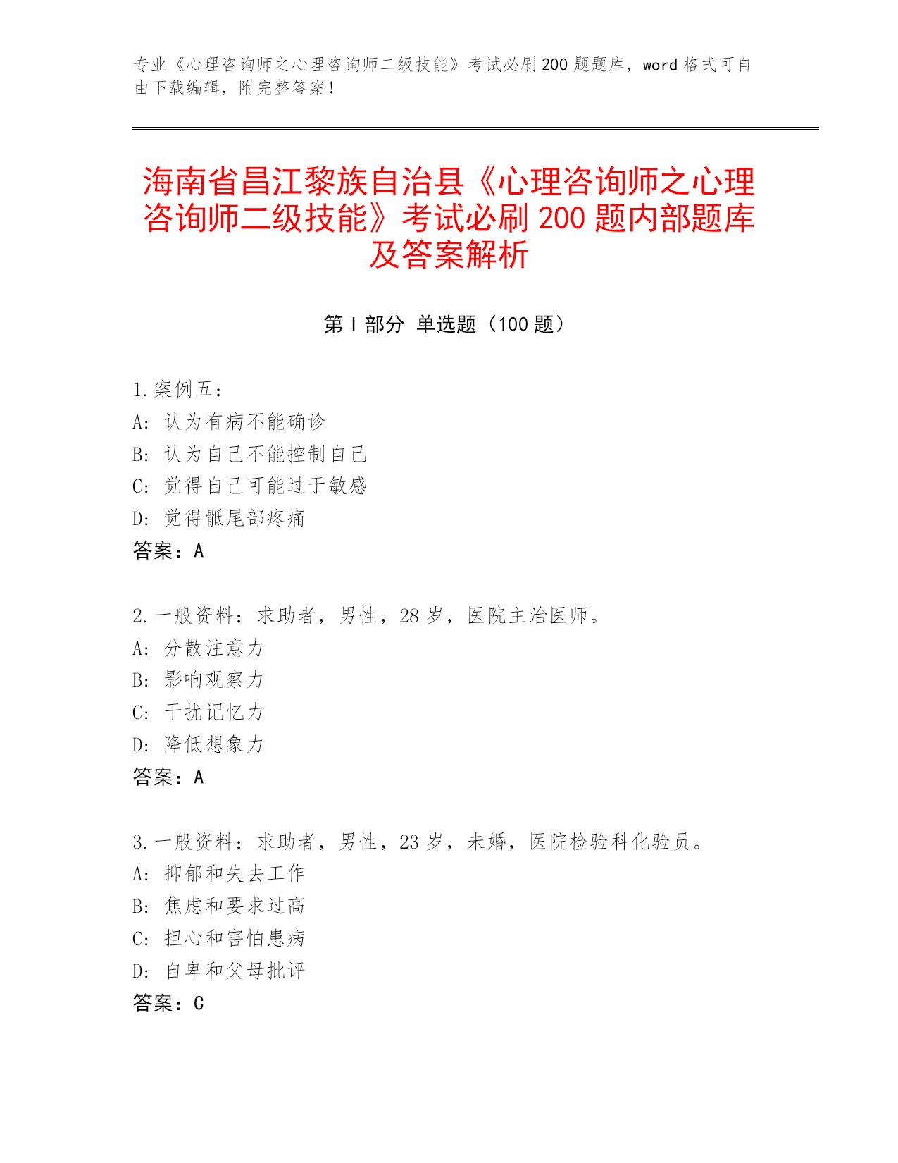 海南省昌江黎族自治县《心理咨询师之心理咨询师二级技能》考试必刷200题内部题库及答案解析