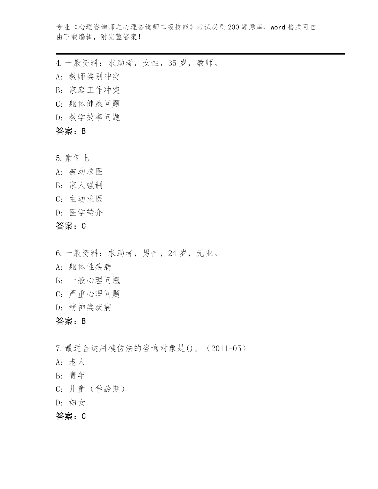 海南省龙华区内部使用《心理咨询师之心理咨询师二级技能》考试必刷200题题库及答案(全优)