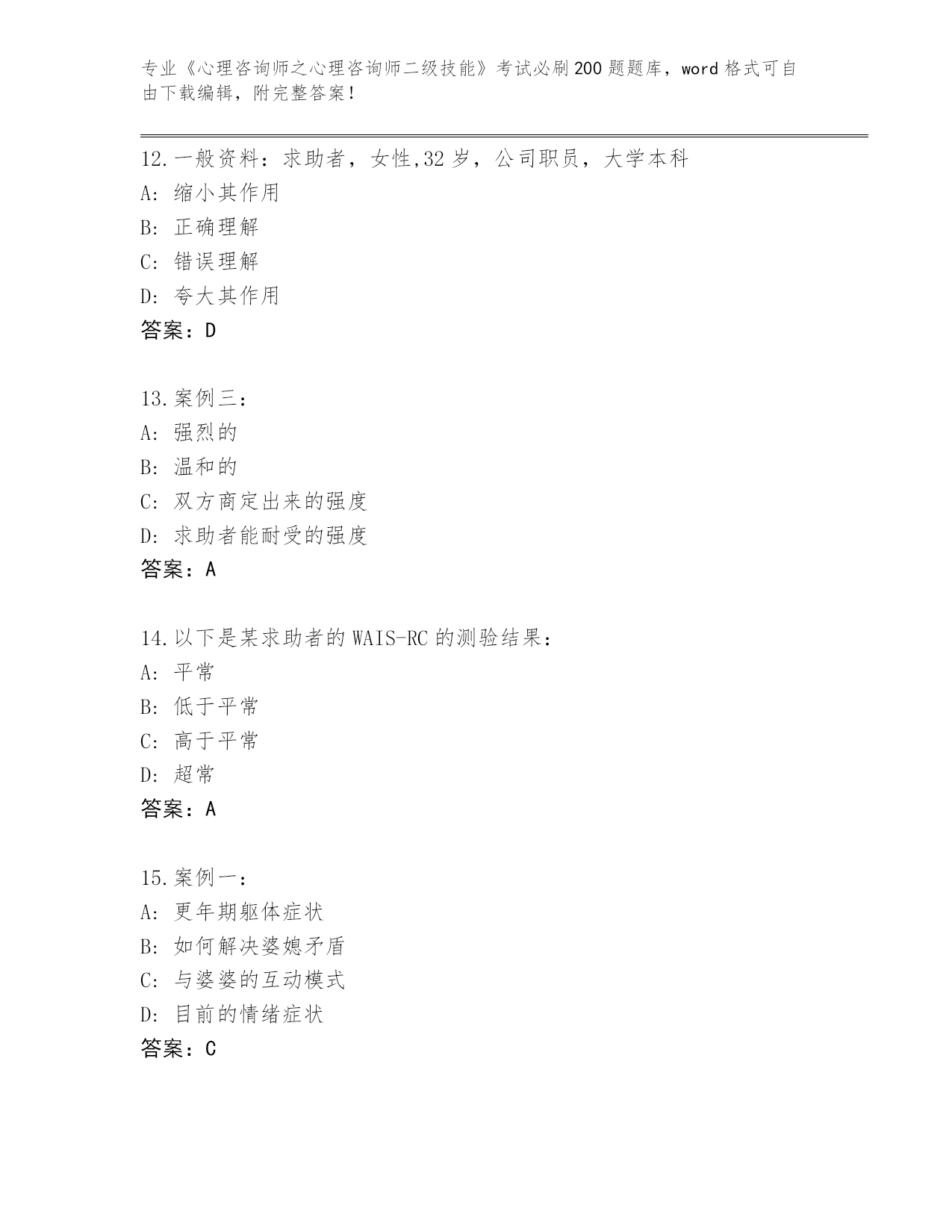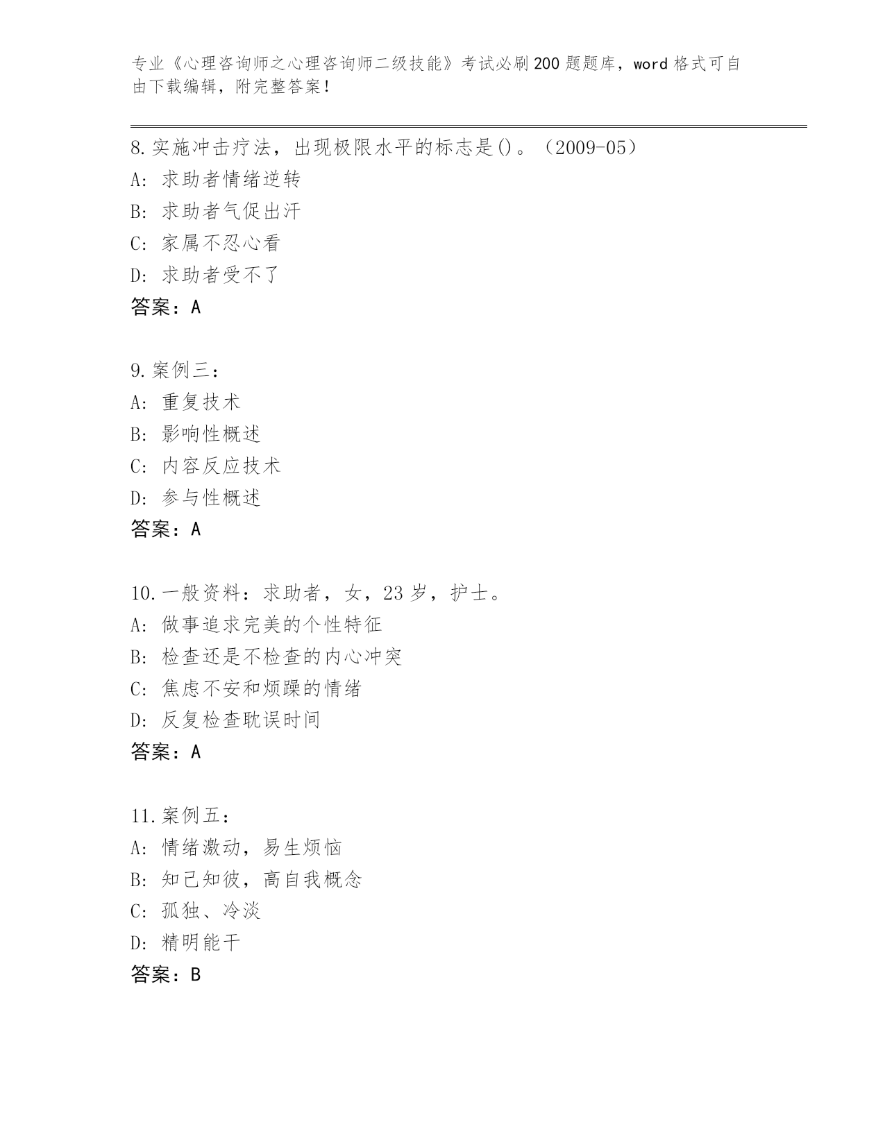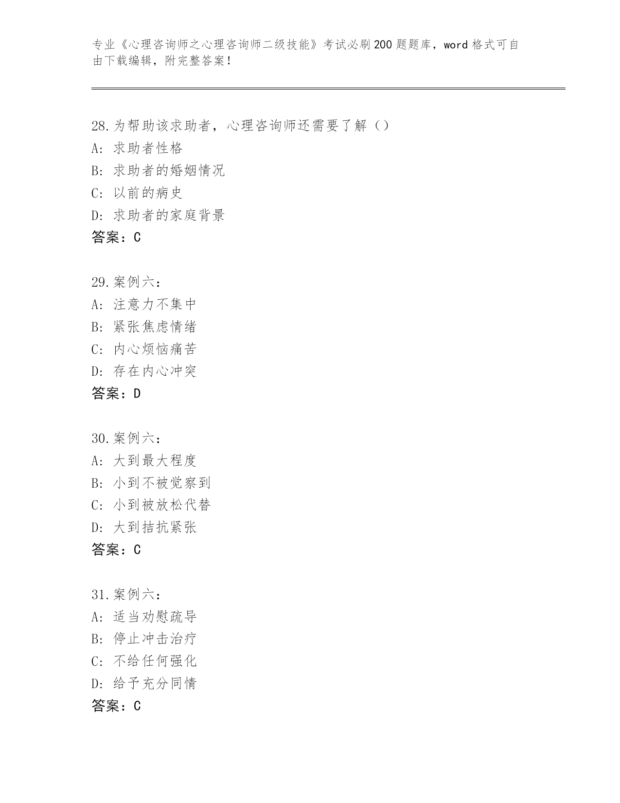 内部使用安徽省黟县《心理咨询师之心理咨询师二级技能》考试必刷200题内部题库加解析答案