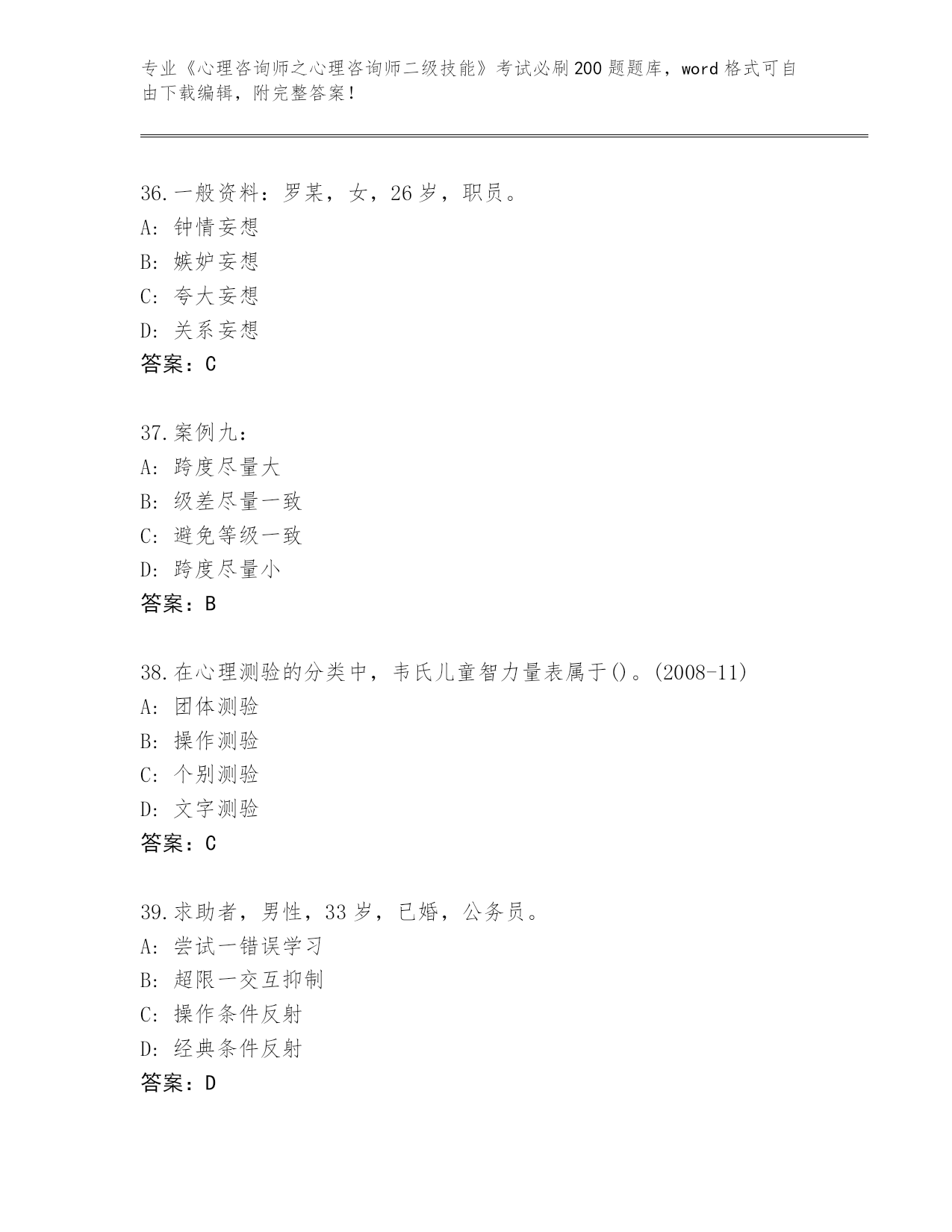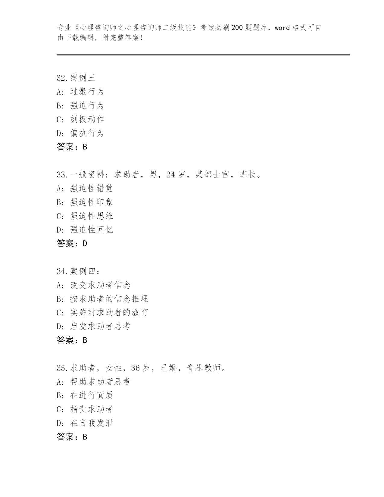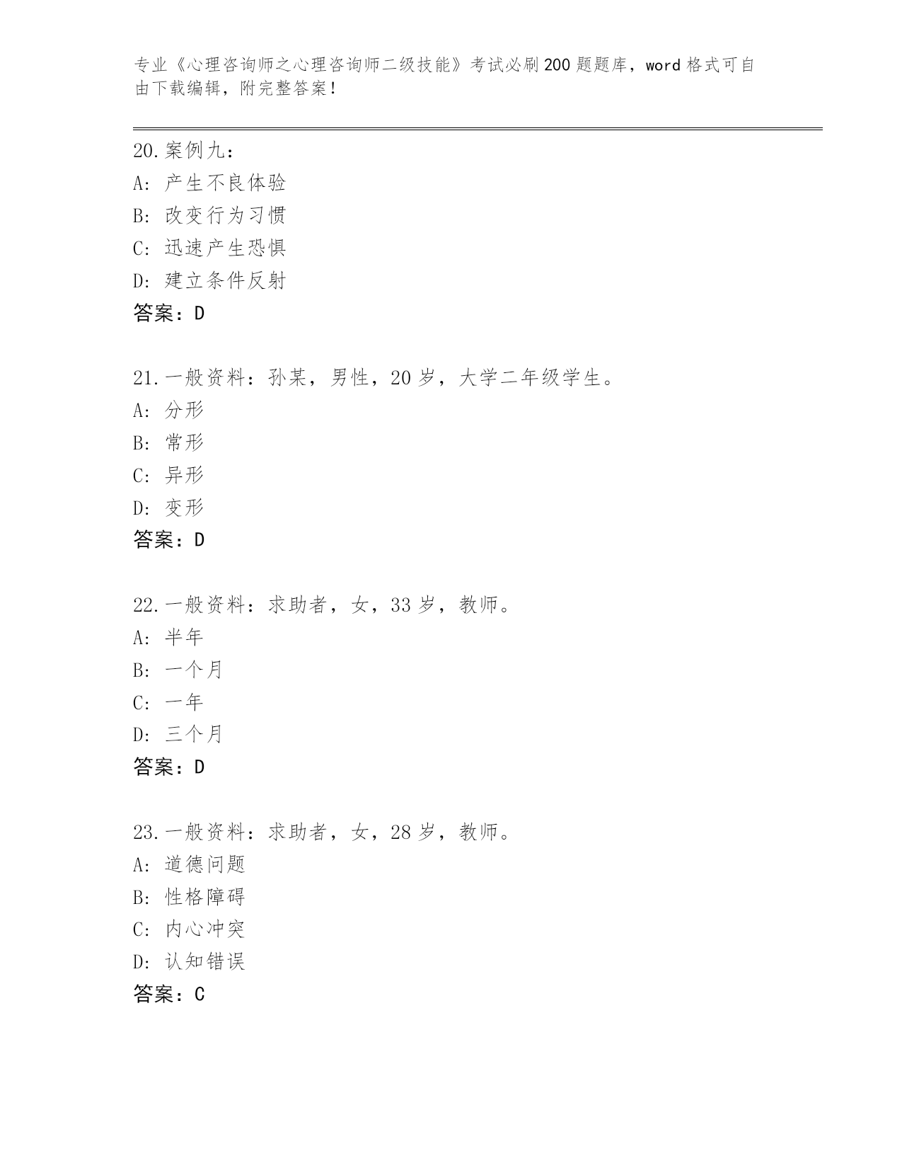 内部使用安徽省黟县《心理咨询师之心理咨询师二级技能》考试必刷200题内部题库加解析答案