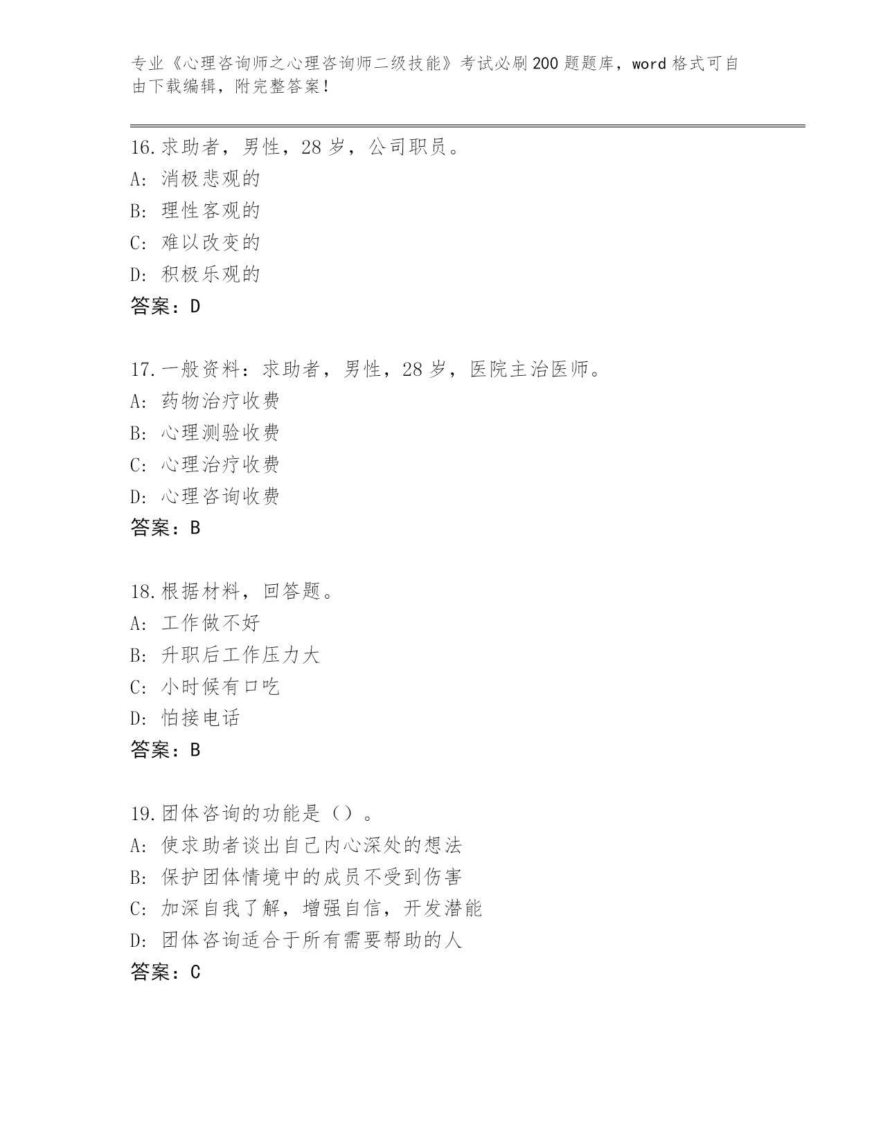 完整版海南省《心理咨询师之心理咨询师二级技能》资格考试必刷200题题库及答案(必刷)