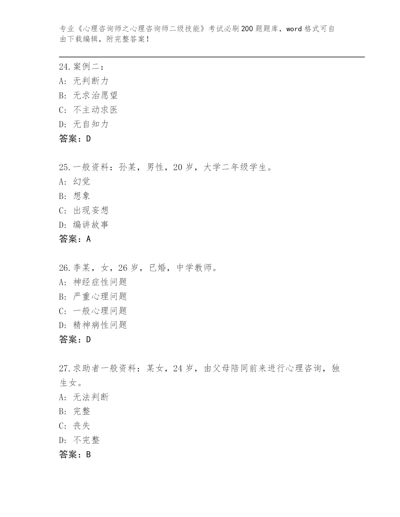2023-24年海南省昌江黎族自治县《心理咨询师之心理咨询师二级技能》资格考试必刷200题内部题库【网校专用】