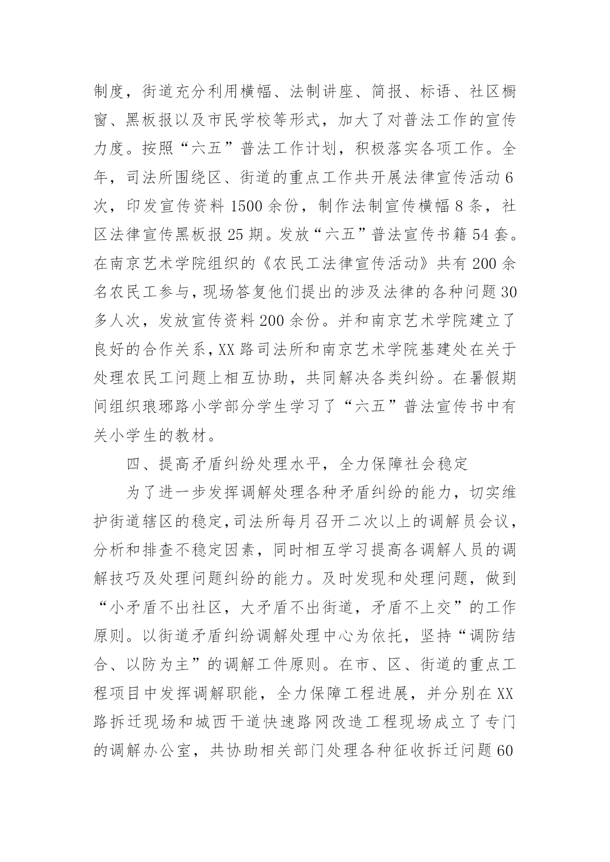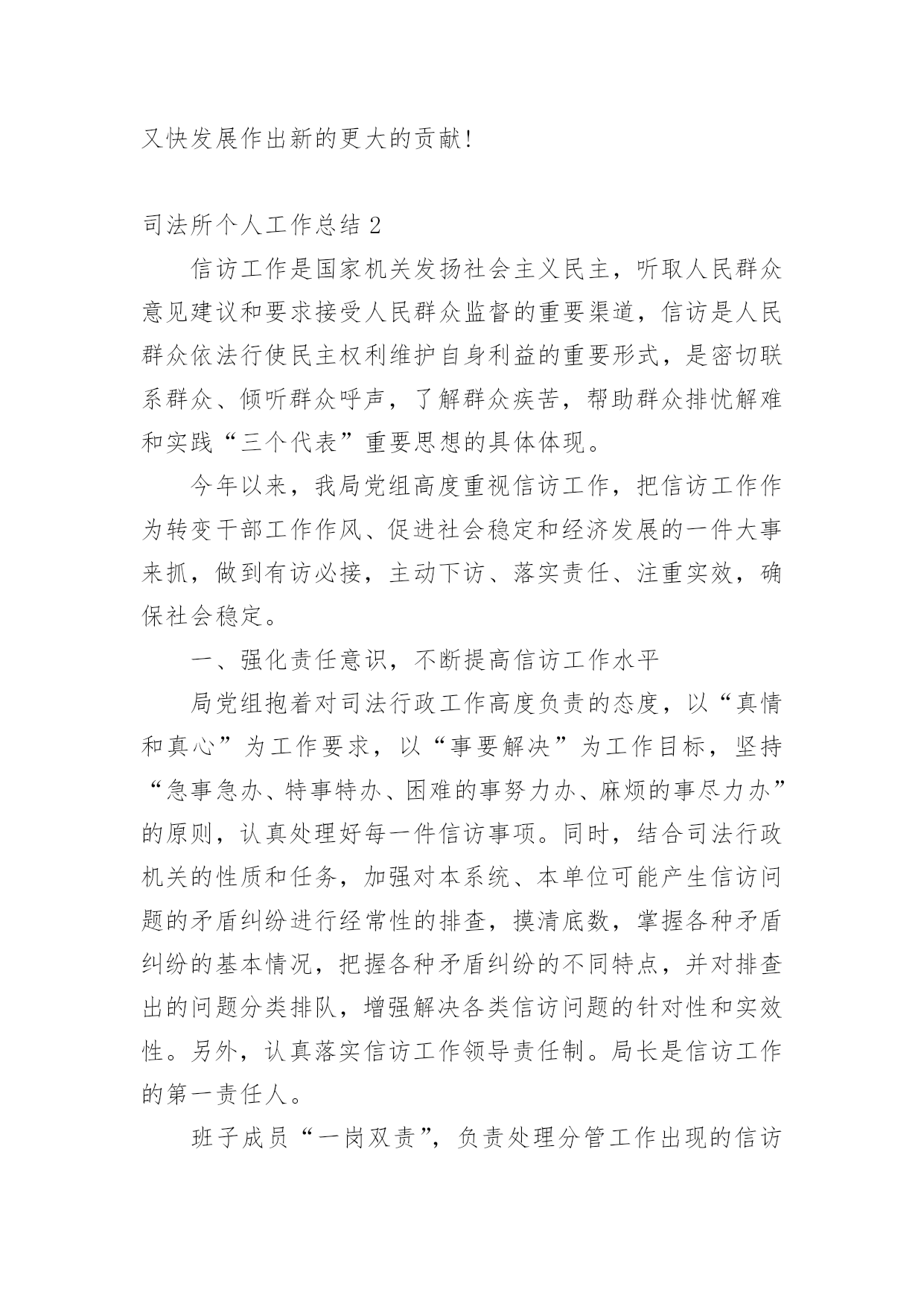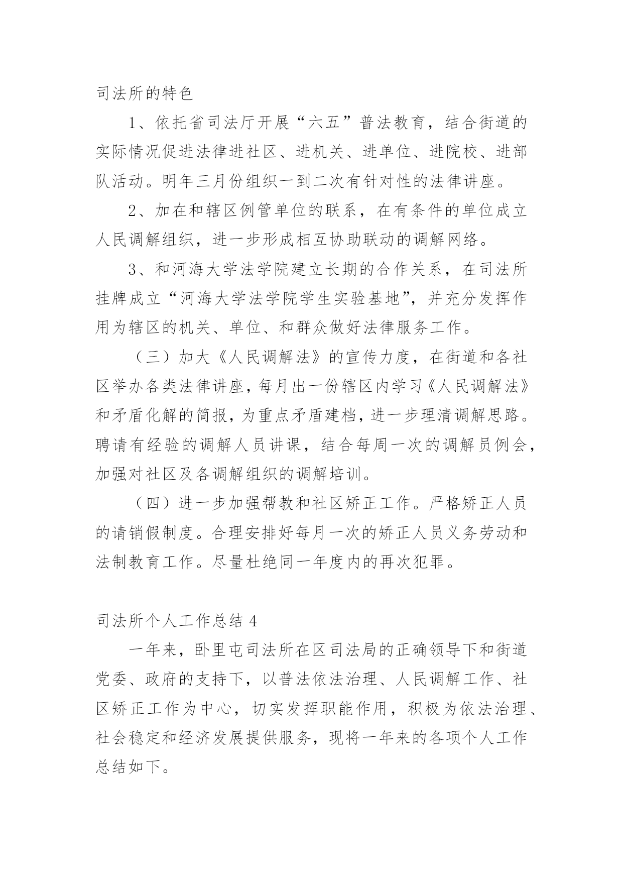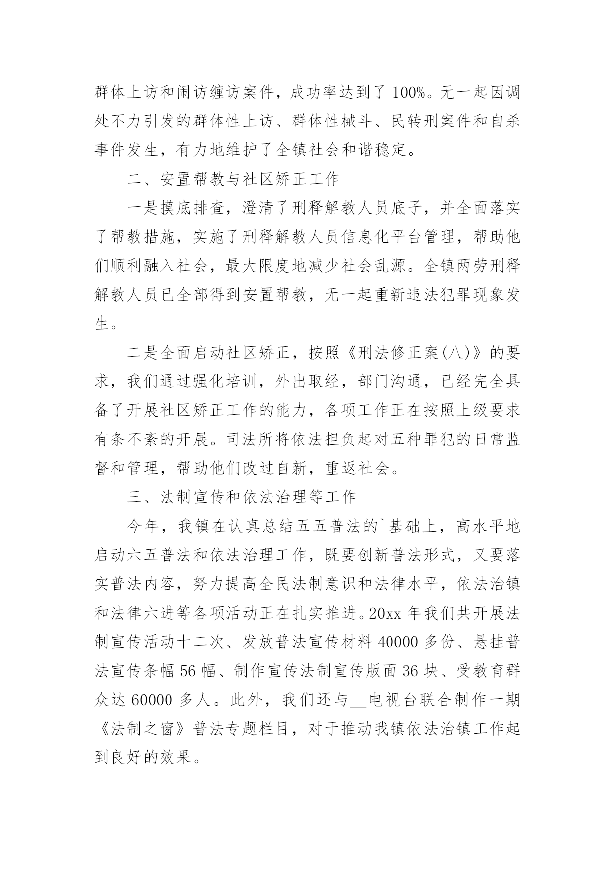 司法所个人工作总结总结在一个时期、一个年度、一个阶段对学习和工作生活等情况加以回顾和分析的一种书面材料,它有助于我们寻找工作和事物发展的规律,从而掌握并运用这些规律,让我们抽出时间写写总结吧。你想知道总结怎么写吗?以下是小编帮大家整理的司法所个人工作总结,仅供参考,大家一起来看看吧。司法所个人工作总结120xx年,xxx司法所在区司法局和xxx镇党委、政府正确领导下,根据区局20xx年度工作总要求和主要目标及镇党委、政府年初三级干部工作会议精神,我所深入开展创先争优活动,扎实开展司法行政工作,为促进经济社会又好又快发展,维护社会和谐稳定,作出了积极贡献。一年来,各项工作均取得了一定的成绩。现将我所一年来的个人工作总结如下:一、人民调解工作我镇的人民调解工作,借力《人民调解法》的实施,整合调解资源,形成了独具特色的人民调解、行政调解、司法调解三调联动的大调解工作格局。在全区率先规范了人民调解工作,真正形成了镇、村(居)、组三级调解网络。20xx年全镇三级调解组织共调处各类矛盾纠纷136余起,调处成功135多起,调成率达99%以上。着力化解了八起越级上访、群体上访和闹访缠访案件,成功率达到了100%。无一起因调处不力引发的群体性上访、群体性械斗、民转刑案件和自杀事件发生,有力地维护了全镇社会和谐稳定。二、安置帮教与社区矫正工作一是摸底排查,澄清了刑释解教人员底子,并全面落实了帮教措施,实施了刑释解教人员信息化平台管理,帮助他们顺利融入社会,最大限度地减少社会乱源。全镇两劳刑释解教人员已全部得到安置帮教,无一起重新违法犯罪现象发生。二是全面启动社区矫正,按照《刑法修正案(八)》的要求,我们通过强化培训,外出取经,部门沟通,已经完全具备了开展社区矫正工作的能力,各项工作正在按照上级要求有条不紊的开展。司法所将依法担负起对五种罪犯的日常监督和管理,帮助他们改过自新,重返社会。三、法制宣传和依法治理等工作今年,我镇在认真总结五五普法的`基础上,高水平地启动六五普法和依法治理工作,既要创新普法形式,又要落实普法内容,努力提高全民法制意识和法律水平,依法治镇和法律六进等各项活动正在扎实推进。20xx年我们共开展法制宣传活动十二次、发放普法宣传材料40000多份、悬挂普法宣传条幅56幅、制作宣传法制宣传版面36块、受教育群众达60000多人。此外,我们还与__电视台联合制作一期《法制之窗》普法专题栏目,对于推动我镇依法治镇工作起到良好的效果。四、法律服务与法律援助我们以法律服务质量年活动为契机,不断拓展服务领域,加快提升服务质量,尽量延伸服务触角,为政府当好参谋,为百姓排忧解难,为企业保驾护航。进一步加强法制教育,下大力规范服务市场,树立司法为民,公正执法的政法队伍形象。今年七月份,我们根据市、区司法局和镇党委政府的统一安排部署,下大力气对辖区内的法律服务市场进行了规范管理。共依法取缔了私自设立的法律服务网店六个,并整合资源,新成立了__法律服务中心所,把所有法律服务工作者(律师)全部纳入中心所管理。这样从源头上控制了非法上访苗头。__法律服务中心所自7月19日成立以来,积极协助党委政府做好群众稳定工作,疏通群众思想,为党委政府分忧,为广大百姓解难。半年来,共化解各类矛盾纠纷35起,积极参与处理镇重大上访、群访和突发性事件6起,使我镇的信访案件较以前有明显减少,为建设平安和谐__做出了自己的贡献。扎实搞好法律援助工作,帮助困难弱势群体,密切联系群众,真正解决困难群众请律师难、打官司难的问题,全面完成上级分配给我所为民办实事的法援任务。20xx年,我所已超额完成领导交给的为民办实事的法援任务。总之,20xx年我所在各项工作当中虽然取得了一定的成绩,但是与上级要求还有一定差距。在明年的工作中,我所将发扬成绩,克服困难,振奋精神,坚定信心,开拓进取,扎实工作,为维护xxx镇社会和谐稳定,促进我镇经济又好又快发展作出新的更大的贡献!司法所个人工作总结2信访工作是国家机关发扬社会主义民主,听取人民群众意见建议和要求接受人民群众监督的重要渠道,信访是人民群众依法行使民主权利维护自身利益的重要形式,是密切联系群众、倾听群众呼声,了解群众疾苦,帮助群众排忧解难和实践“三个代表”重要思想的具体体现。今年以来,我局党组高度重视信访工作,把信访工作作为转变干部工作作风、促进社会稳定和经济发展的一件大事来抓,做到有访必接,主动下访、落实责任、注重实效,确保社会稳定。一、强化责任意识,不断提高信访工作水平局党组抱着对司法行政工作高度负责的态度,以“真情和真心”为工作要求,以“事要解决”为工作目标,坚持“急事急办、特事特办、困难的事努力办、麻烦的事尽力办”的原则,认真处理好每一件信访事项。同时,结合司法行政机关的性质和任务,加强对本系统、本单位可能产生信访问题的矛盾纠