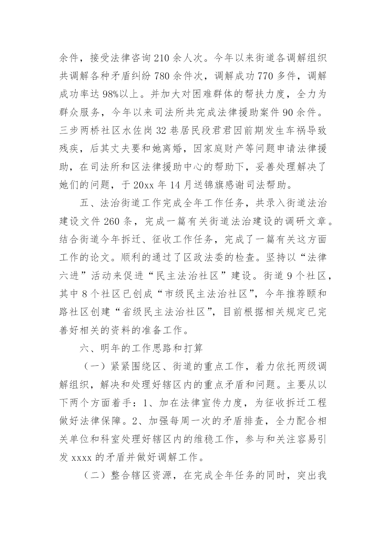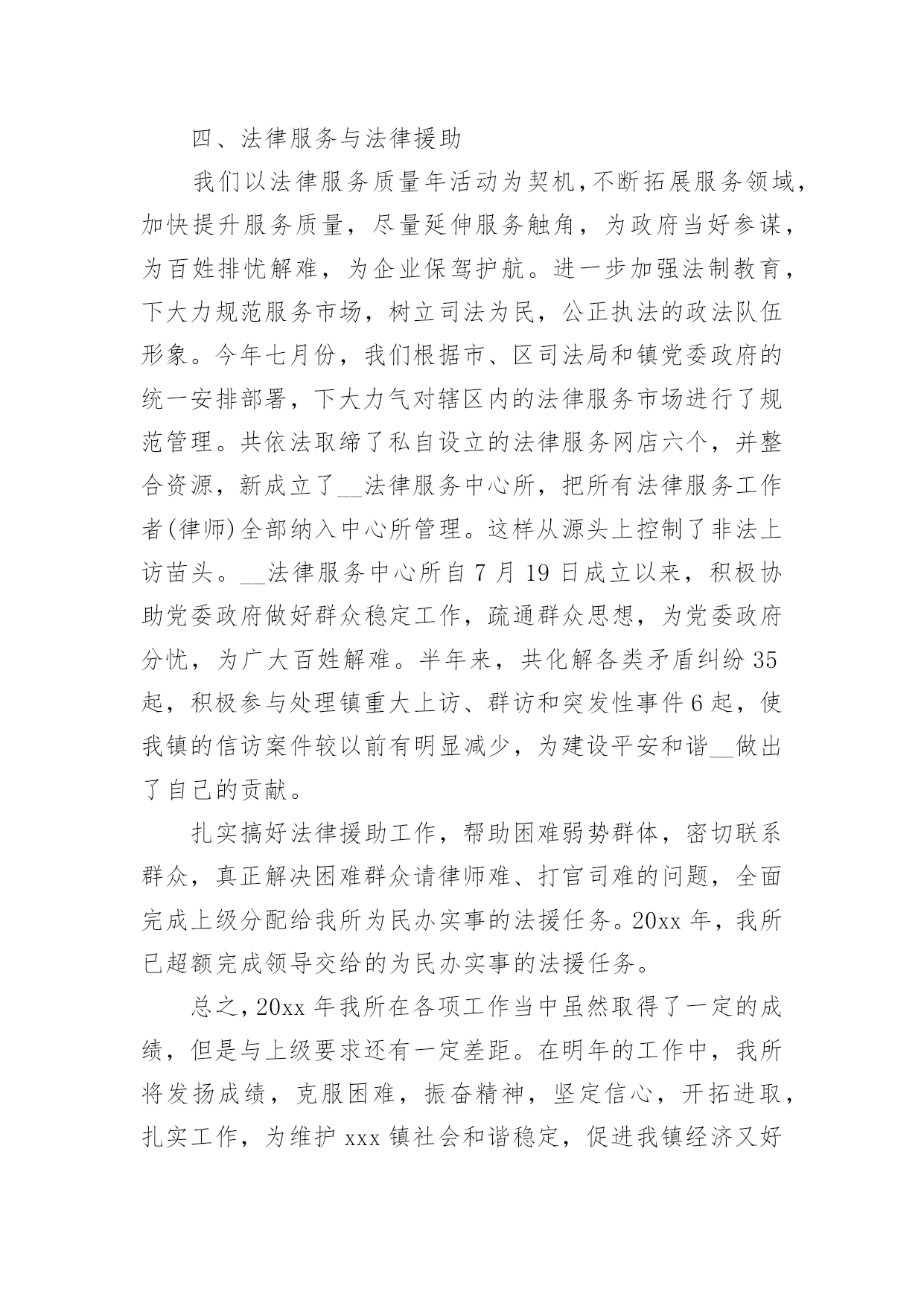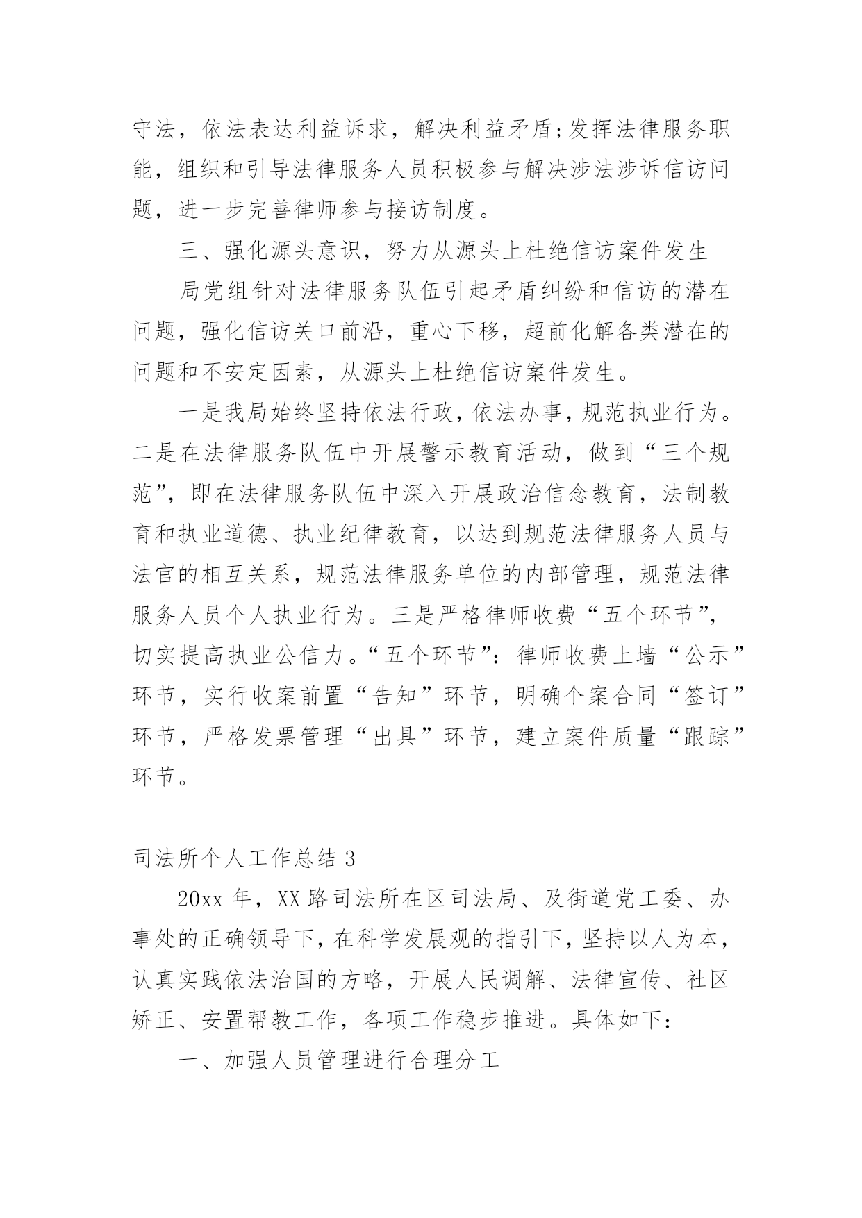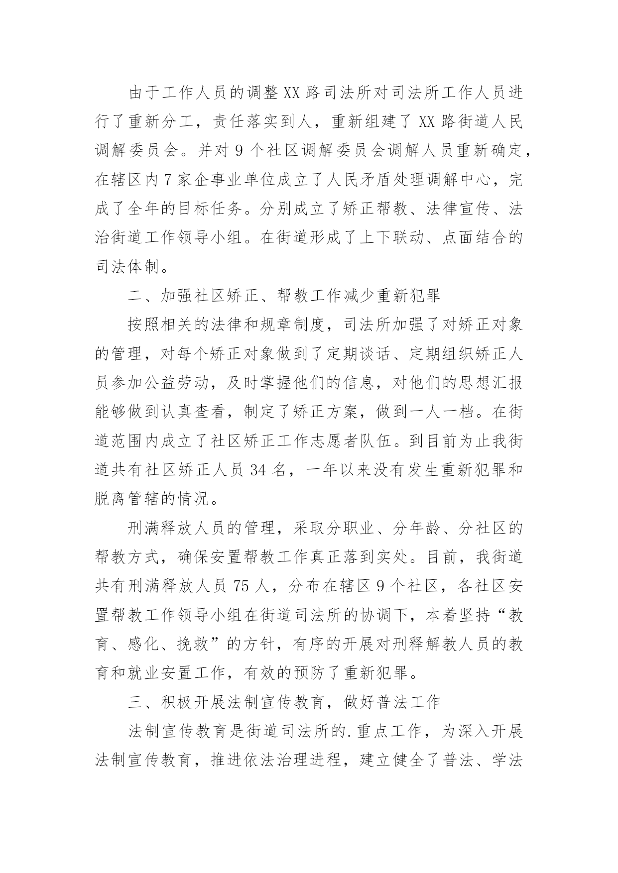 司法所个人工作总结总结在一个时期、一个年度、一个阶段对学习和工作生活等情况加以回顾和分析的一种书面材料,它有助于我们寻找工作和事物发展的规律,从而掌握并运用这些规律,让我们抽出时间写写总结吧。你想知道总结怎么写吗?以下是小编帮大家整理的司法所个人工作总结,仅供参考,大家一起来看看吧。司法所个人工作总结120xx年,xxx司法所在区司法局和xxx镇党委、政府正确领导下,根据区局20xx年度工作总要求和主要目标及镇党委、政府年初三级干部工作会议精神,我所深入开展创先争优活动,扎实开展司法行政工作,为促进经济社会又好又快发展,维护社会和谐稳定,作出了积极贡献。一年来,各项工作均取得了一定的成绩。现将我所一年来的个人工作总结如下:一、人民调解工作我镇的人民调解工作,借力《人民调解法》的实施,整合调解资源,形成了独具特色的人民调解、行政调解、司法调解三调联动的大调解工作格局。在全区率先规范了人民调解工作,真正形成了镇、村(居)、组三级调解网络。20xx年全镇三级调解组织共调处各类矛盾纠纷136余起,调处成功135多起,调成率达99%以上。着力化解了八起越级上访、群体上访和闹访缠访案件,成功率达到了100%。无一起因调处不力引发的群体性上访、群体性械斗、民转刑案件和自杀事件发生,有力地维护了全镇社会和谐稳定。二、安置帮教与社区矫正工作一是摸底排查,澄清了刑释解教人员底子,并全面落实了帮教措施,实施了刑释解教人员信息化平台管理,帮助他们顺利融入社会,最大限度地减少社会乱源。全镇两劳刑释解教人员已全部得到安置帮教,无一起重新违法犯罪现象发生。二是全面启动社区矫正,按照《刑法修正案(八)》的要求,我们通过强化培训,外出取经,部门沟通,已经完全具备了开展社区矫正工作的能力,各项工作正在按照上级要求有条不紊的开展。司法所将依法担负起对五种罪犯的日常监督和管理,帮助他们改过自新,重返社会。三、法制宣传和依法治理等工作今年,我镇在认真总结五五普法的`基础上,高水平地启动六五普法和依法治理工作,既要创新普法形式,又要落实普法内容,努力提高全民法制意识和法律水平,依法治镇和法律六进等各项活动正在扎实推进。20xx年我们共开展法制宣传活动十二次、发放普法宣传材料40000多份、悬挂普法宣传条幅56幅、制作宣传法制宣传版面36块、受教育群众达60000多人。此外,我们还与__电视台联合制作一期《法制之窗》普法专题栏目,对于推动我镇依法治镇工作起到良好的效果。四、法律服务与法律援助我们以法律服务质量年活动为契机,不断拓展服务领域,加快提升服务质量,尽量延伸服务触角,为政府当好参谋,为百姓排忧解难,为企业保驾护航。进一步加强法制教育,下大力规范服务市场,树立司法为民,公正执法的政法队伍形象。今年七月份,我们根据市、区司法局和镇党委政府的统一安排部署,下大力气对辖区内的法律服务市场进行了规范管理。共依法取缔了私自设立的法律服务网店六个,并整合资源,新成立了__法律服务中心所,把所有法律服务工作者(律师)全部纳入中心所管理。这样从源头上控制了非法上访苗头。__法律服务中心所自7月19日成立以来,积极协助党委政府做好群众稳定工作,疏通群众思想,为党委政府分忧,为广大百姓解难。半年来,共化解各类矛盾纠纷35起,积极参与处理镇重大上访、群访和突发性事件6起,使我镇的信访案件较以前有明显减少,为建设平安和谐__做出了自己的贡献。扎实搞好法律援助工作,帮助困难弱势群体,密切联系群众,真正解决困难群众请律师难、打官司难的问题,全面完成上级分配给我所为民办实事的法援任务。20xx年,我所已超额完成领导交给的为民办实事的法援任务。总之,20xx年我所在各项工作当中虽然取得了一定的成绩,但是与上级要求还有一定差距。在明年的工作中,我所将发扬成绩,克服困难,振奋精神,坚定信心,开拓进取,扎实工作,为维护xxx镇社会和谐稳定,促进我镇经济又好又快发展作出新的更大的贡献!司法所个人工作总结2信访工作是国家机关发扬社会主义民主,听取人民群众意见建议和要求接受人民群众监督的重要渠道,信访是人民群众依法行使民主权利维护自身利益的重要形式,是密切联系群众、倾听群众呼声,了解群众疾苦,帮助群众排忧解难和实践“三个代表”重要思想的具体体现。今年以来,我局党组高度重视信访工作,把信访工作作为转变干部工作作风、促进社会稳定和经济发展的一件大事来抓,做到有访必接,主动下访、落实责任、注重实效,确保社会稳定。一、强化责任意识,不断提高信访工作水平局党组抱着对司法行政工作高度负责的态度,以“真情和真心”为工作要求,以“事要解决”为工作目标,坚持“急事急办、特事特办、困难的事努力办、麻烦的事尽力办”的原则,认真处理好每一件信访事项。同时,结合司法行政机关的性质和任务,加强对本系统、本单位可能产生信访问题的矛盾纠