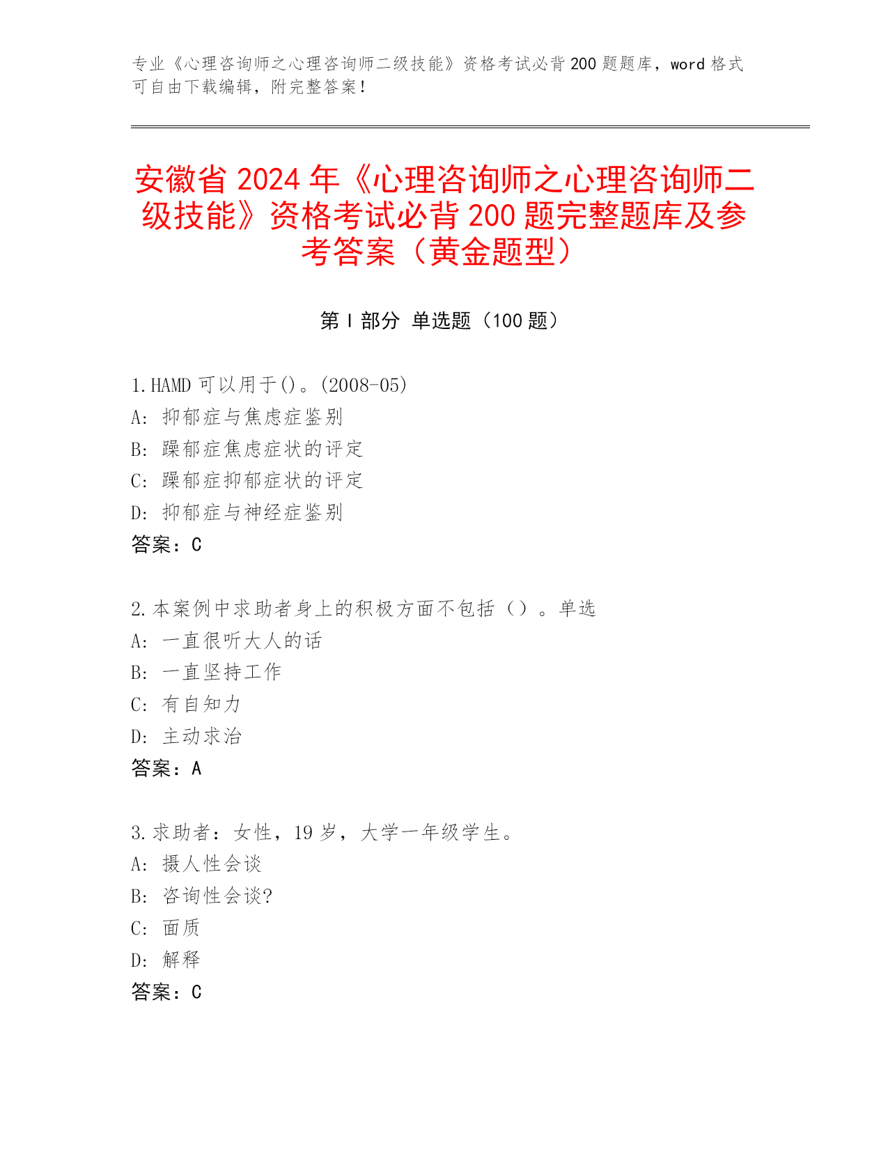 安徽省2024年《心理咨询师之心理咨询师二级技能》资格考试必背200题完整题库及参考答案(黄金题型)