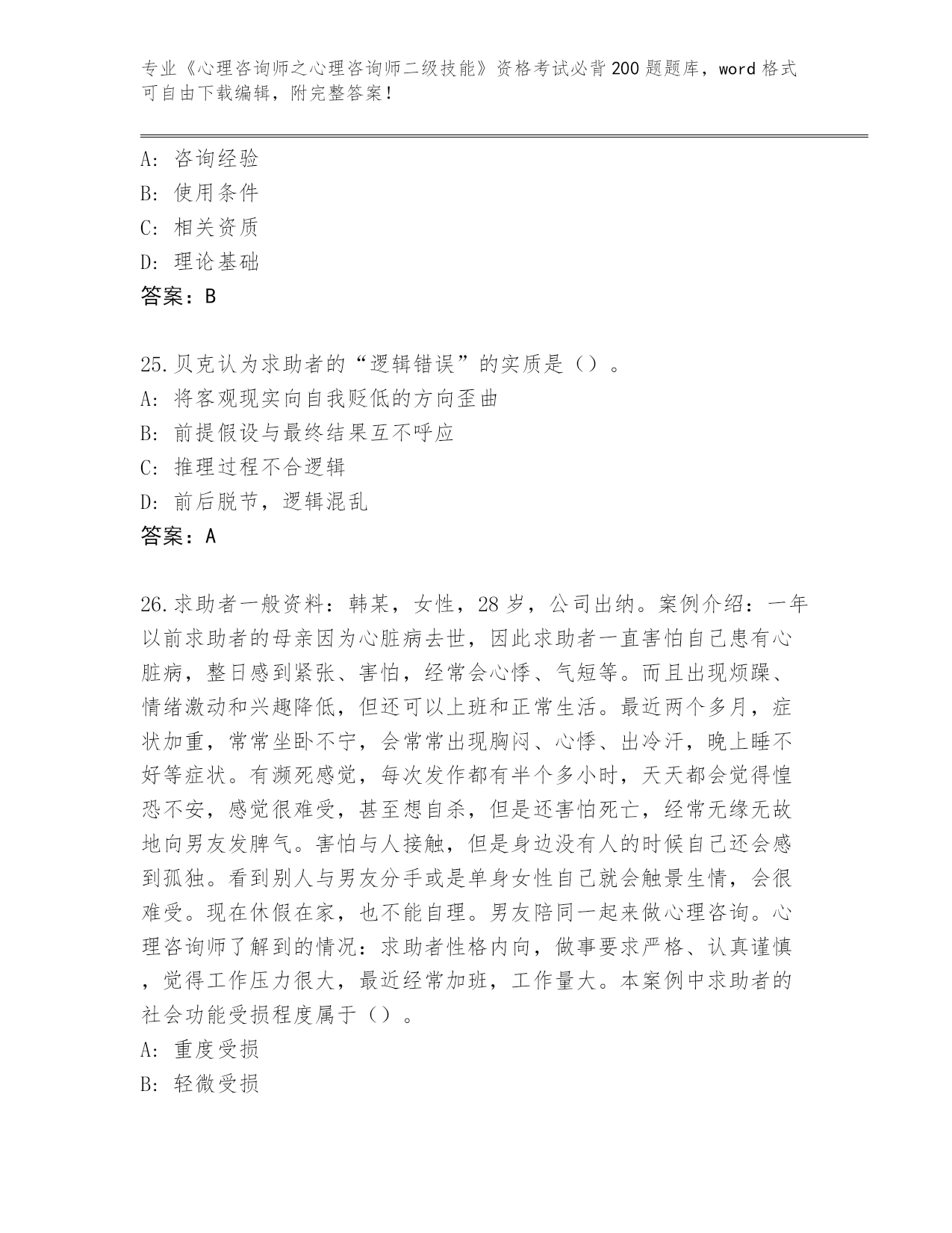 2024湖南省云溪区《心理咨询师之心理咨询师二级技能》资格考试必背200题题库及参考答案(黄金题型)