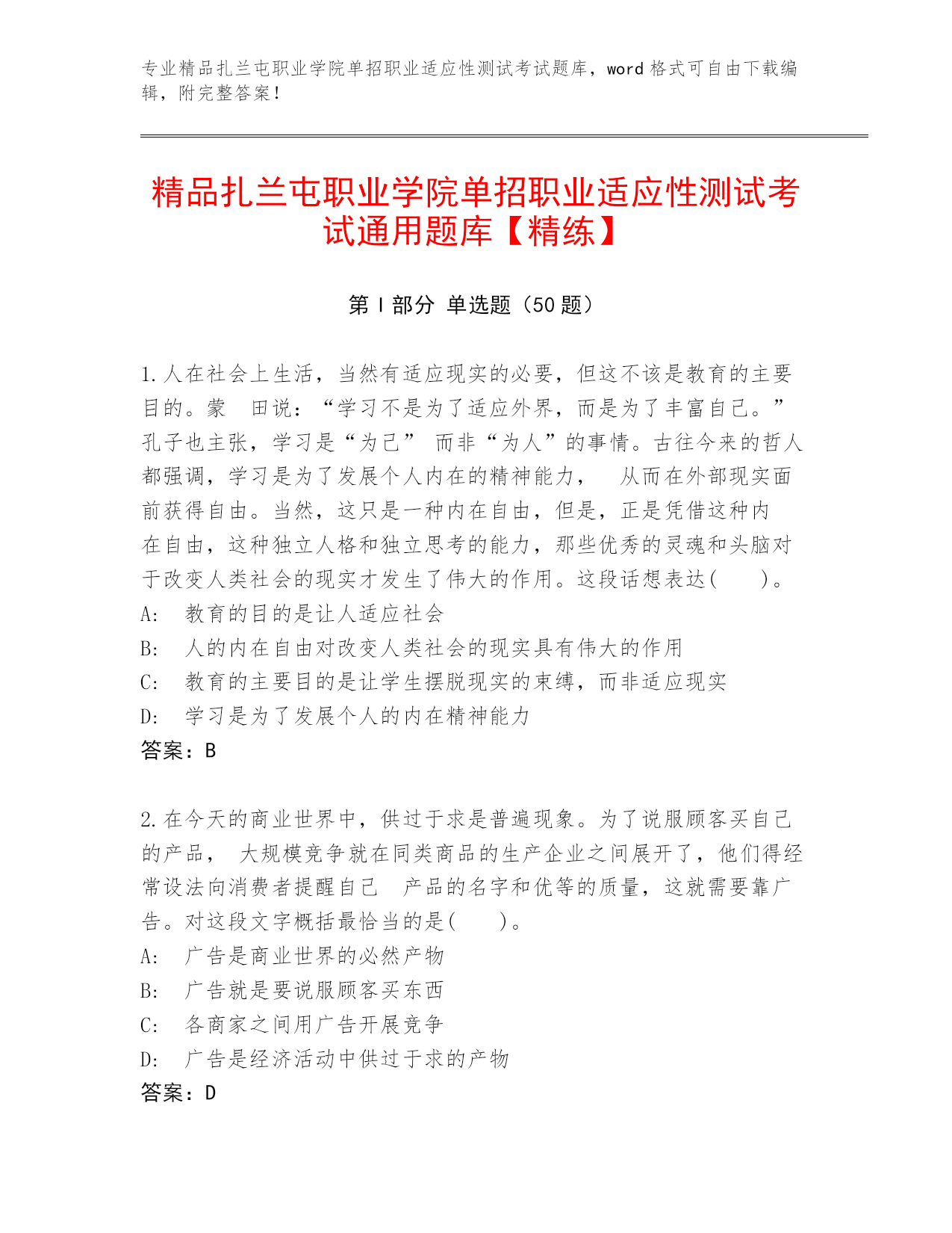 精品扎兰屯职业学院单招职业适应性测试考试通用题库【精练】.docx