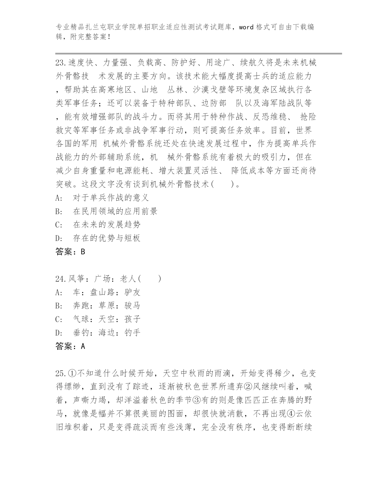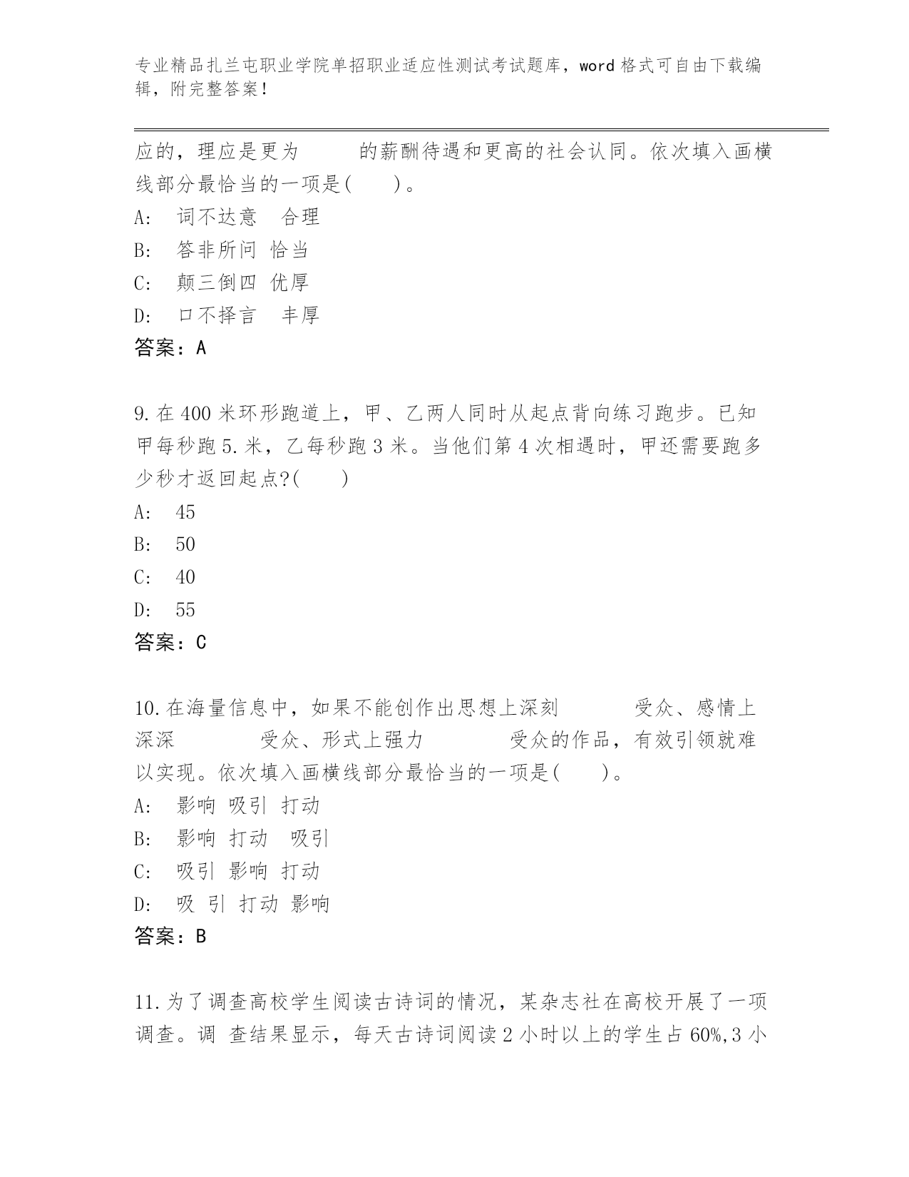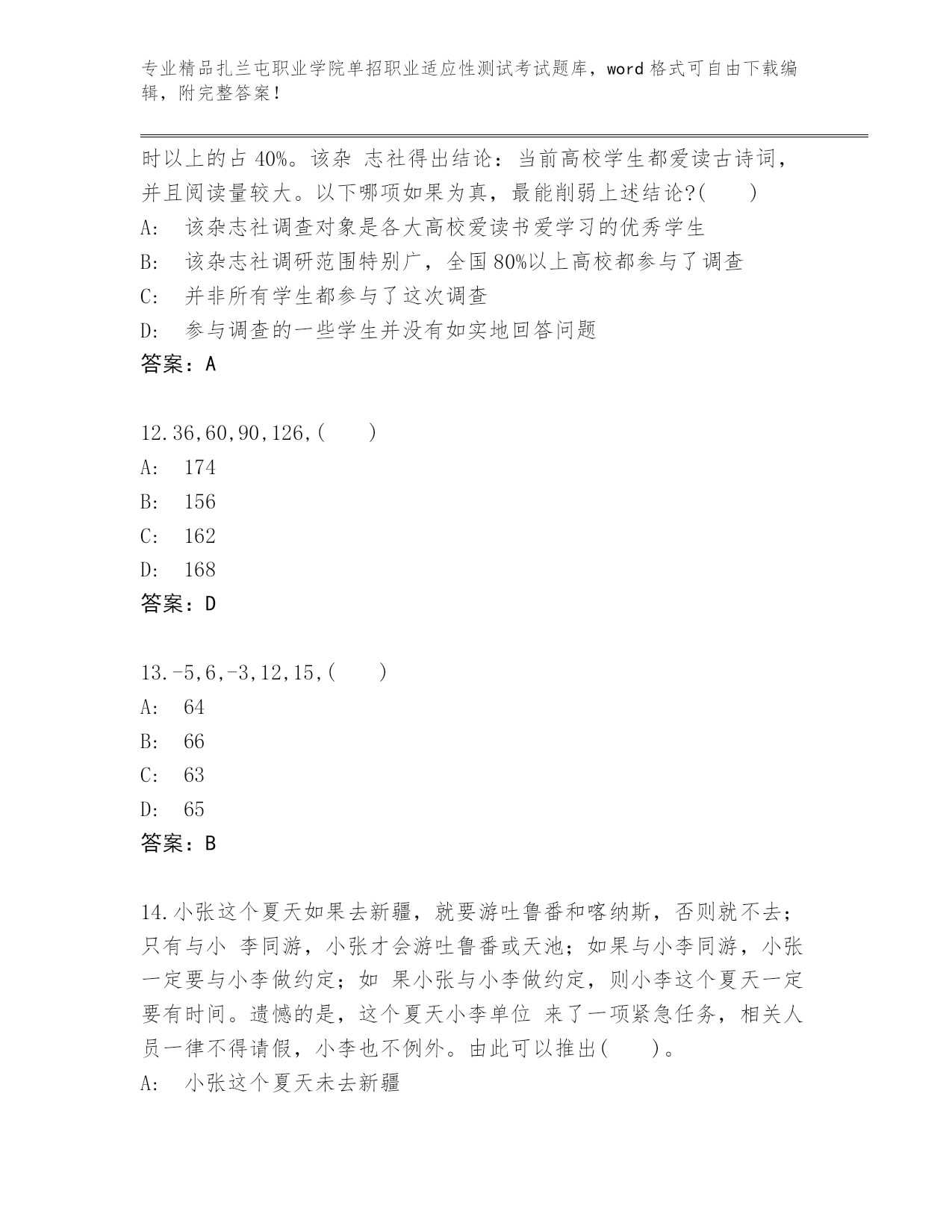 精品扎兰屯职业学院单招职业适应性测试考试通用题库【精练】