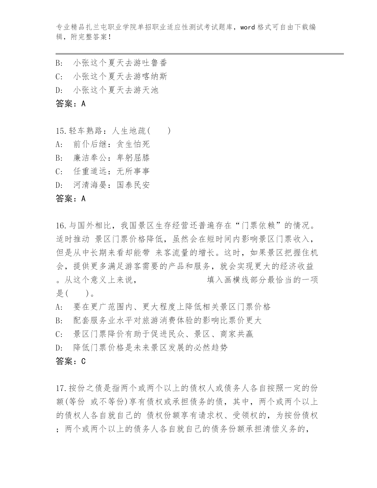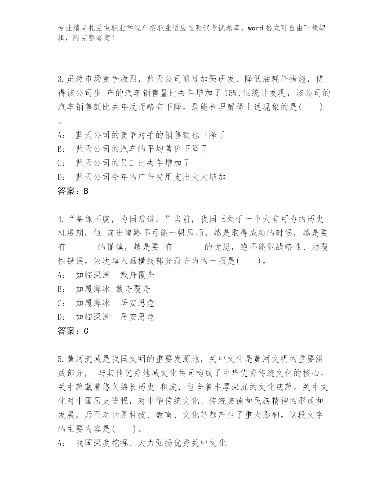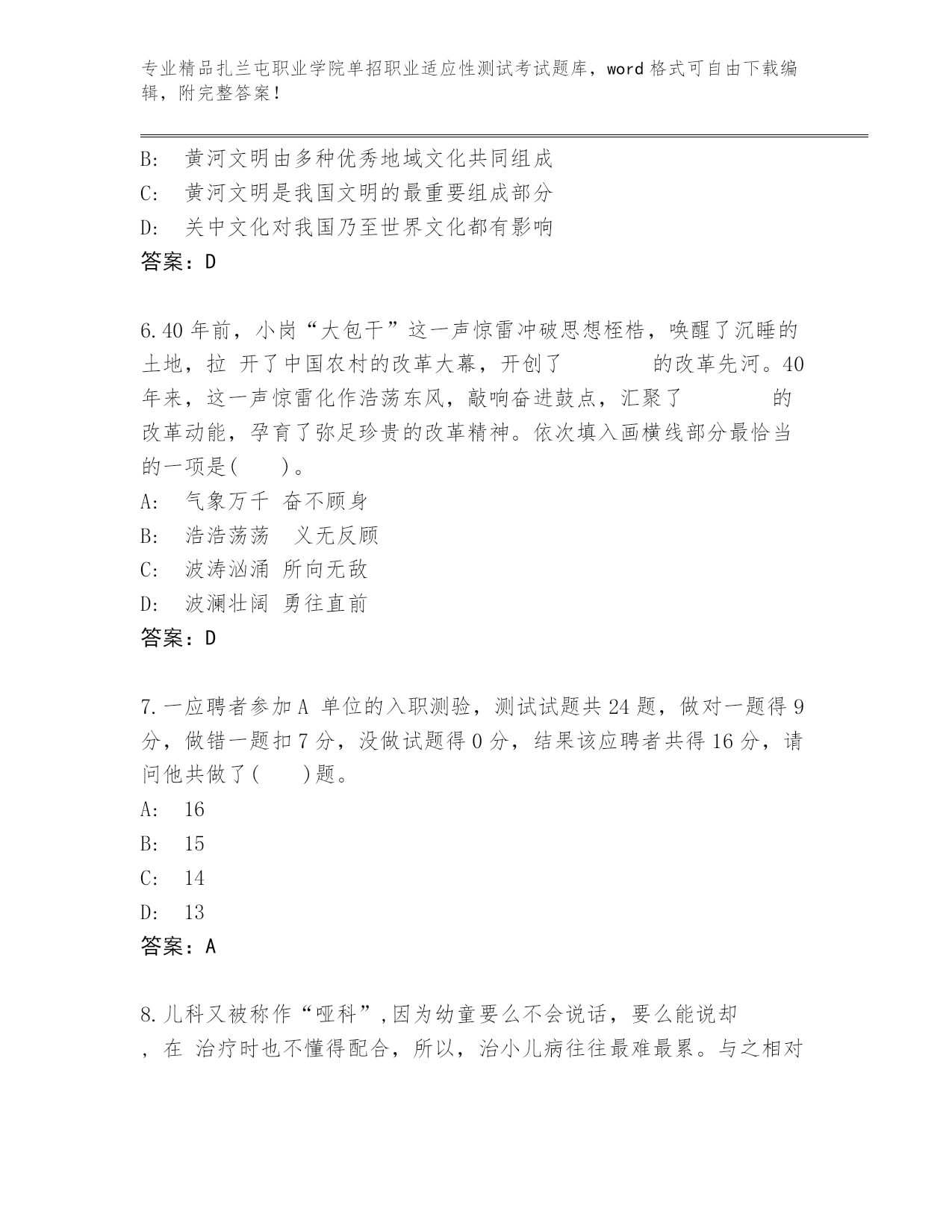 精品扎兰屯职业学院单招职业适应性测试考试通用题库【精练】
