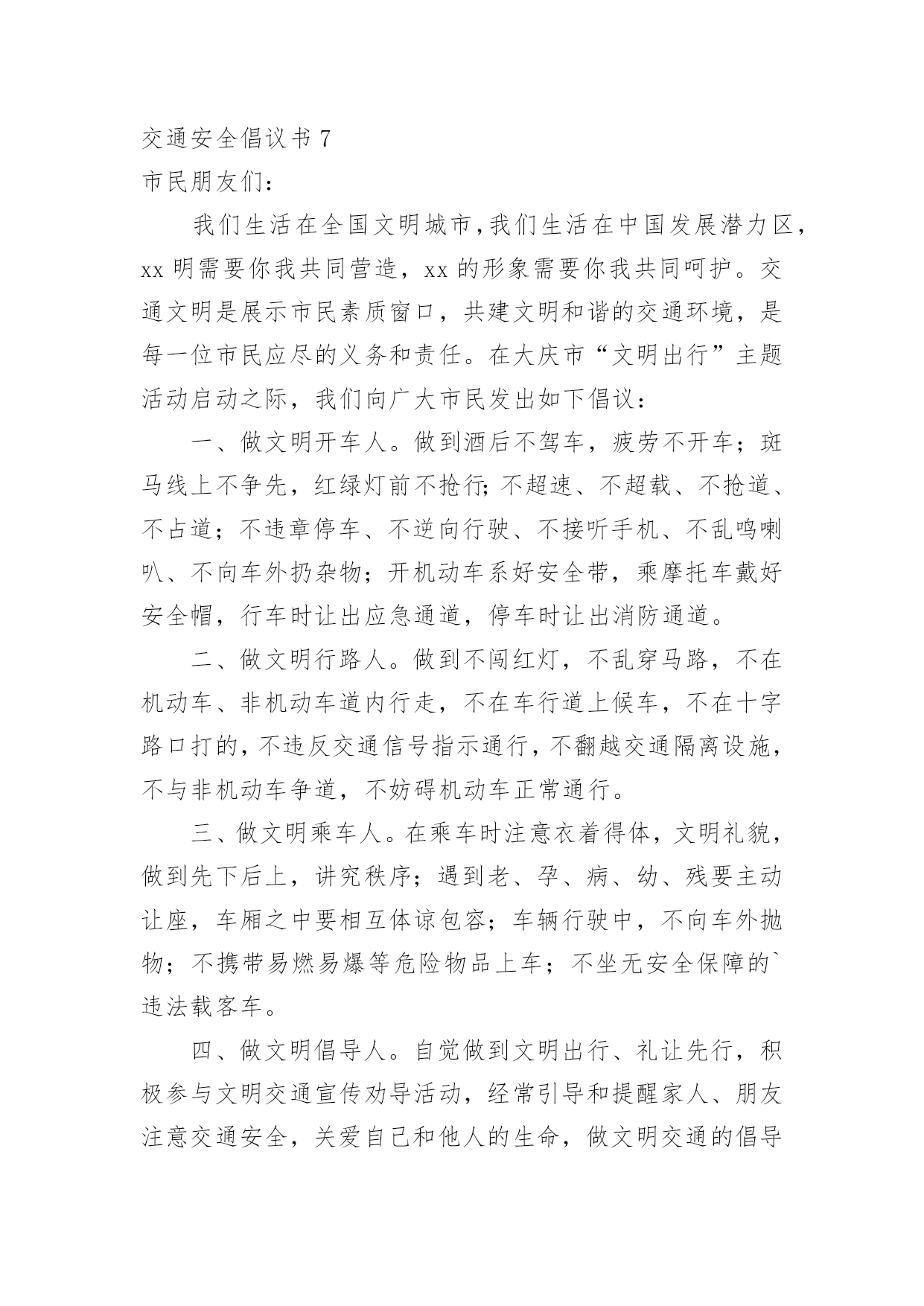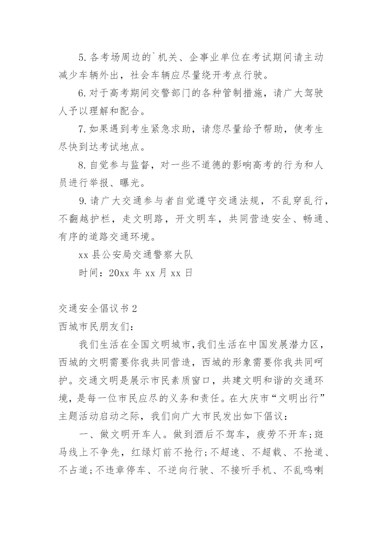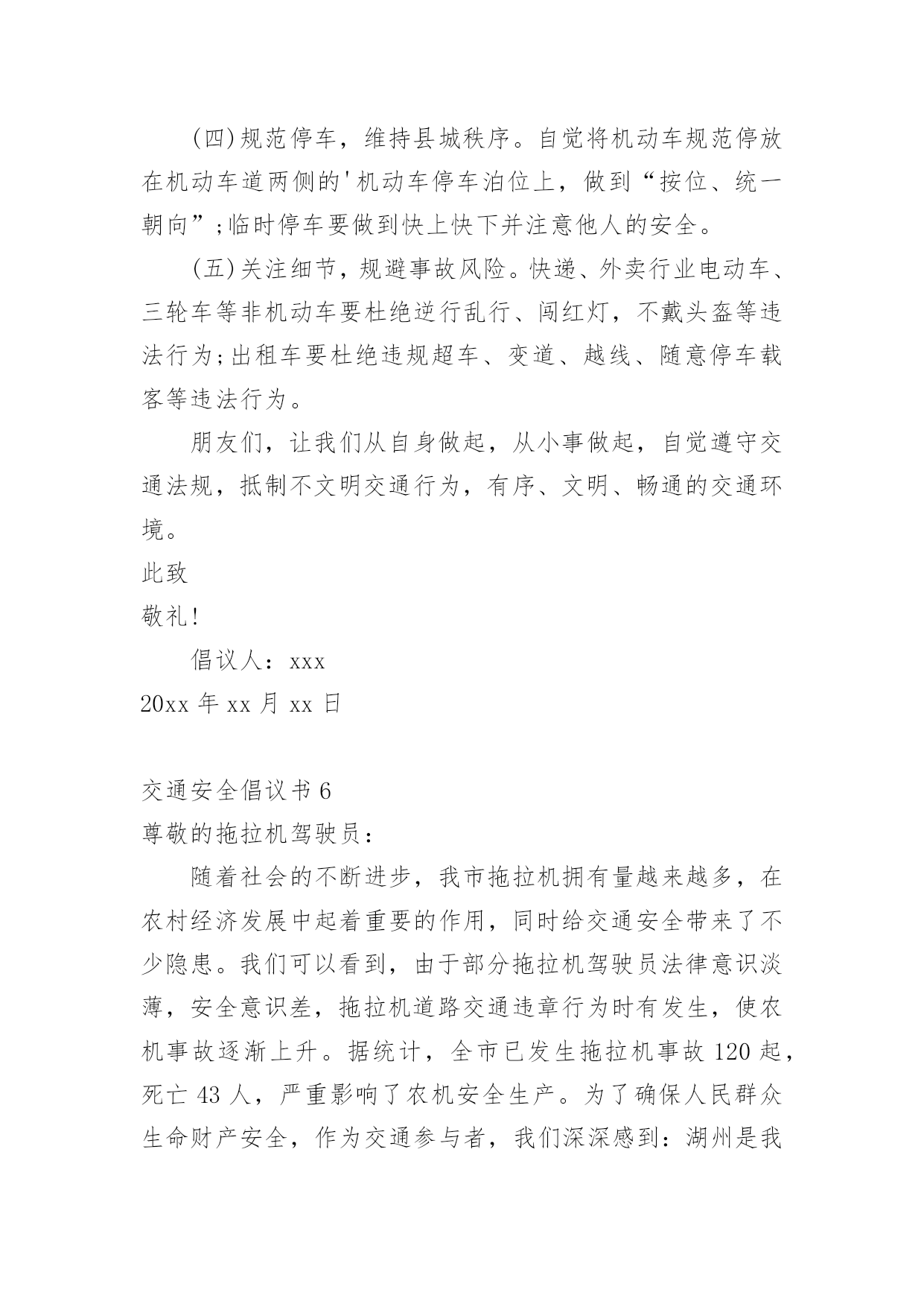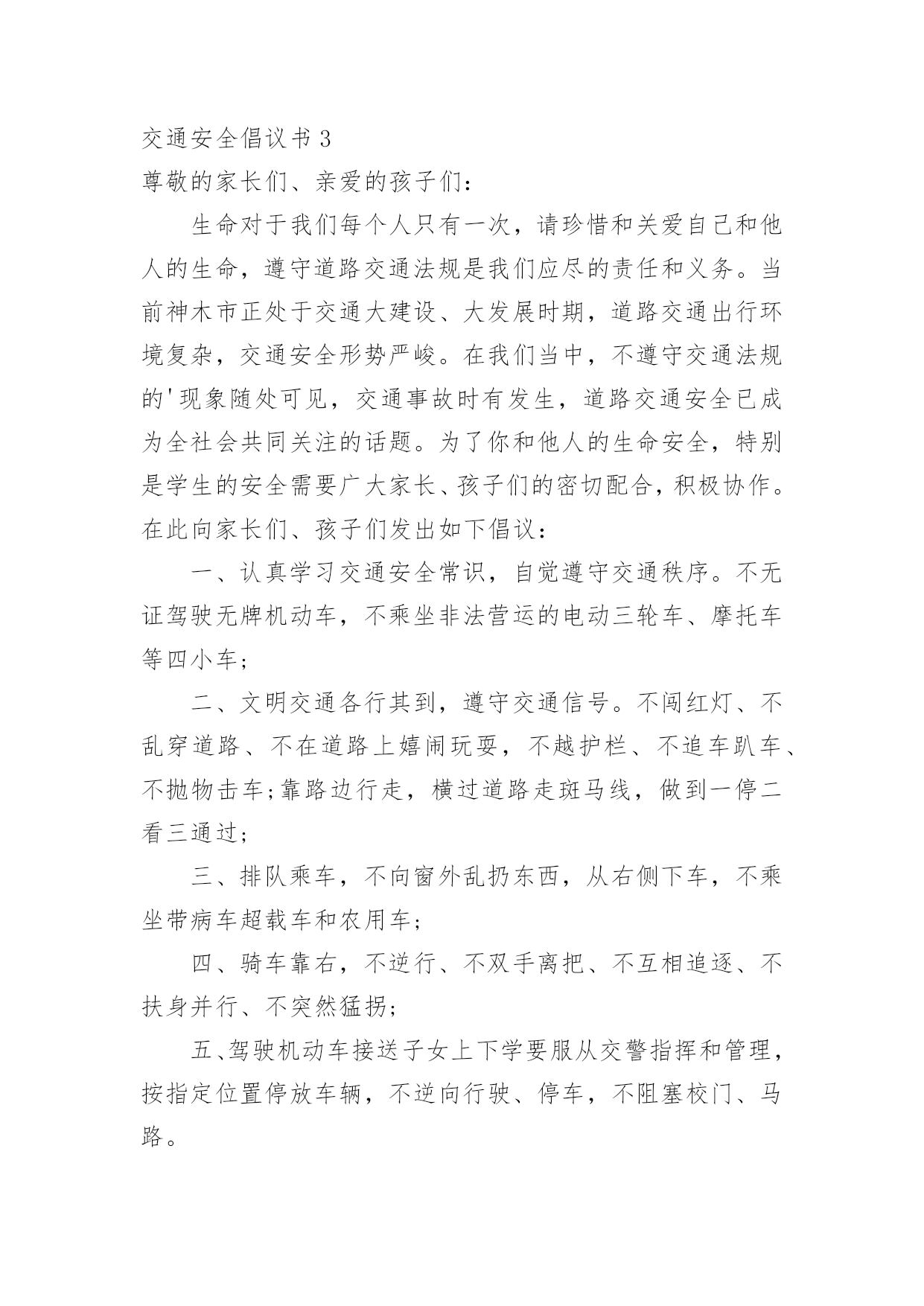 交通安全倡议书(优选)交通安全倡议书在不断进步的时代,越来越多地方需要用到倡议书,倡议书是为倡议、发起某项活动而写的号召性的公开提议性的专用书信。如何写一份恰当的倡议书呢?下面是小编帮大家整理的交通安全倡议书,仅供参考,大家一起来看看吧。交通安全倡议书1广大交通参与者:一年一度的高考即将开始,今年高考恰逢端午节假日,道路交通压力明显增大,为给广大考生创造一个安全、畅通的道路交通环境,确保每一位考生顺利参加高考,实现自己的人生理想,德江县公安局交警大队作出工作部署,要求全警动员、全警参战、全力保障高考期间的道路交通安全、畅通。现根据德江城区道路交通实际,德江交警提出如下倡议:1.高考期间尽量不开车出行,多乘坐公共交通工具,减轻城区交通压力,不给考点及周边“添堵”。2.高考期间,接送考生的驾驶人请您规范停车、文明行车、不乱鸣笛、服从现场交警指挥,确保道路交通安全。3.请您注意考点周边的绕行标志,提前做好绕行准备,避免不必要的拥堵。4.经过考点时请您减速慢行,不乱鸣笛,不猛踩油门或刹车,减少噪音,共同为考生营造安静的考试环境。5.各考场周边的`机关、企事业单位在考试期间请主动减少车辆外出,社会车辆应尽量绕开考点行驶。6.对于高考期间交警部门的各种管制措施,请广大驾驶人予以理解和配合。7.如果遇到考生紧急求助,请您尽量给予帮助,使考生尽快到达考试地点。8.自觉参与监督,对一些不道德的影响高考的行为和人员进行举报、曝光。9.请广大交通参与者自觉遵守交通法规,不乱穿乱行,不翻越护栏,走文明路,开文明车,共同营造安全、畅通、有序的道路交通环境。xx县公安局交通警察大队时间:20xx年xx月xx日交通安全倡议书2西城市民朋友们:我们生活在全国文明城市,我们生活在中国发展潜力区,西城的文明需要你我共同营造,西城的形象需要你我共同呵护。交通文明是展示市民素质窗口,共建文明和谐的交通环境,是每一位市民应尽的义务和责任。在大庆市“文明出行”主题活动启动之际,我们向广大市民发出如下倡议:一、做文明开车人。做到酒后不驾车,疲劳不开车;斑马线上不争先,红绿灯前不抢行;不超速、不超载、不抢道、不占道;不违章停车、不逆向行驶、不接听手机、不乱鸣喇叭、不向车外扔杂物;开机动车系好安全带,乘摩托车戴好安全帽,行车时让出应急通道,停车时让出消防通道。二、做文明行路人。做到不闯红灯,不乱穿马路,不在机动车、非机动车道内行走,不在车行道上候车,不在十字路口打的.,不违反交通信号指示通行,不翻越交通隔离设施,不与非机动车争道,不妨碍机动车正常通行。三、做文明乘车人。在乘车时注意衣着得体,文明礼貌,做到先下后上,讲究秩序;遇到老、孕、病、幼、残要主动让座,车厢之中要相互体谅包容;车辆行驶中,不向车外抛物;不携带易燃易爆等危险物品上车;不坐无安全保障的违法载客车。四、做文明倡导人。自觉做到文明出行、礼让先行,积极参与文明交通宣传劝导活动,经常引导和提醒家人、朋友注意交通安全,关爱自己和他人的生命,做文明交通的倡导者、实践者和守护者。市民朋友们,车让人,让出一份文明;人让车,让出一份安全;车让车,让出一份秩序;人让人,让出一份友爱,让我们从我做起,从现在做起,积极参与和实践文明出行活动,让文明之花在大庆西城绚烂开放!此致敬礼!倡议人:xxx20xx年xx月xx日交通安全倡议书3尊敬的家长们、亲爱的孩子们:生命对于我们每个人只有一次,请珍惜和关爱自己和他人的生命,遵守道路交通法规是我们应尽的责任和义务。当前神木市正处于交通大建设、大发展时期,道路交通出行环境复杂,交通安全形势严峻。在我们当中,不遵守交通法规的'现象随处可见,交通事故时有发生,道路交通安全已成为全社会共同关注的话题。为了你和他人的生命安全,特别是学生的安全需要广大家长、孩子们的密切配合,积极协作。在此向家长们、孩子们发出如下倡议:一、认真学习交通安全常识,自觉遵守交通秩序。不无证驾驶无牌机动车,不乘坐非法营运的电动三轮车、摩托车等四小车;二、文明交通各行其到,遵守交通信号。不闯红灯、不乱穿道路、不在道路上嬉闹玩耍,不越护栏、不追车趴车、不抛物击车;靠路边行走,横过道路走斑马线,做到一停二看三通过;三、排队乘车,不向窗外乱扔东西,从右侧下车,不乘坐带病车超载车和农用车;四、骑车靠右,不逆行、不双手离把、不互相追逐、不扶身并行、不突然猛拐;五、驾驶机动车接送子女上下学要服从交警指挥和管理,按指定位置停放车辆,不逆向行驶、停车,不阻塞校门、马路。六、家长要自觉遵守交通法规,为子女树立榜样,教育和引导学生子女遵守交通法规。平平安安出门,快快乐乐回家。让我们从现在做起,从自己做起,为了家庭的幸福、社会的安定,积极行动起来,珍惜彼此宝贵的生命,自觉遵守交通法规,共同营造一个更加安全、和谐、有序的交通环境。此致敬礼!倡议人: