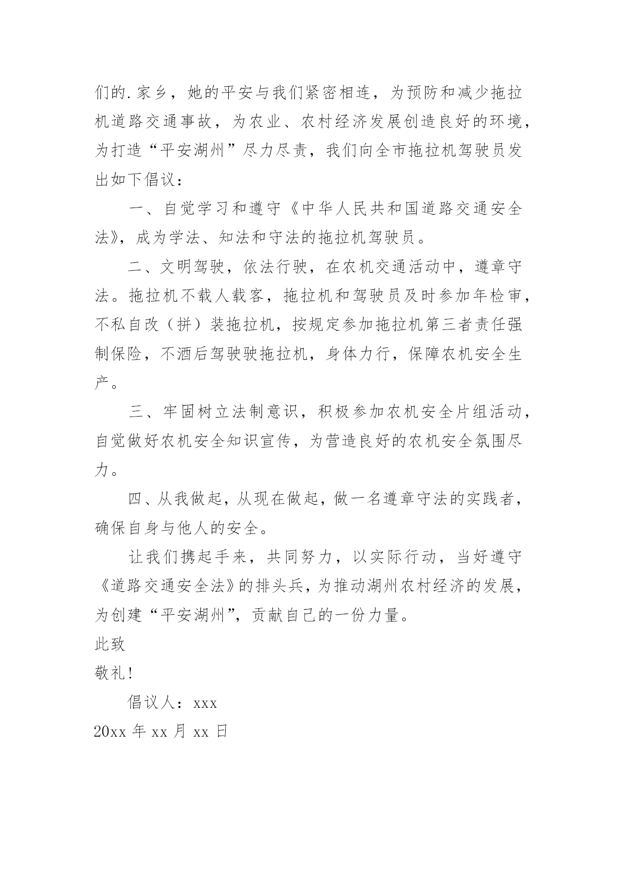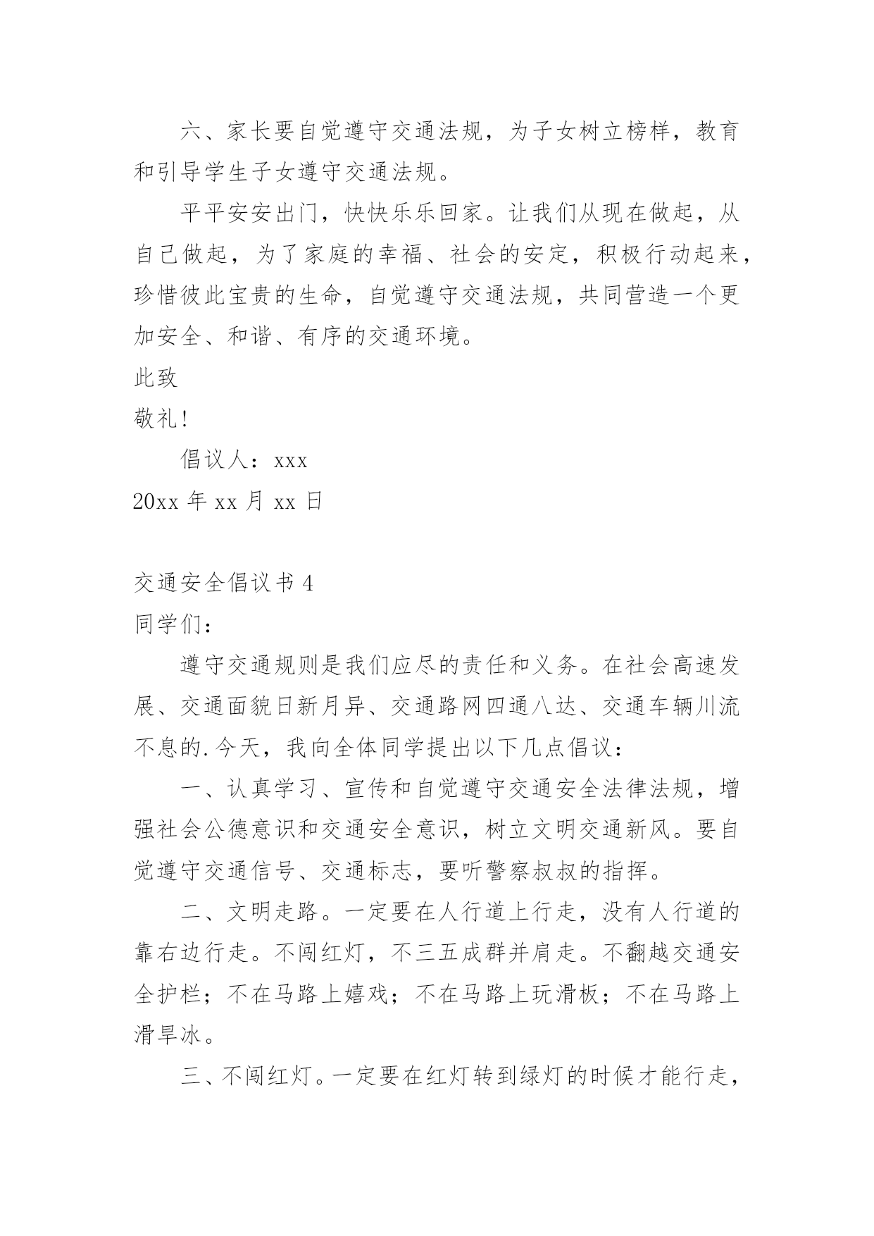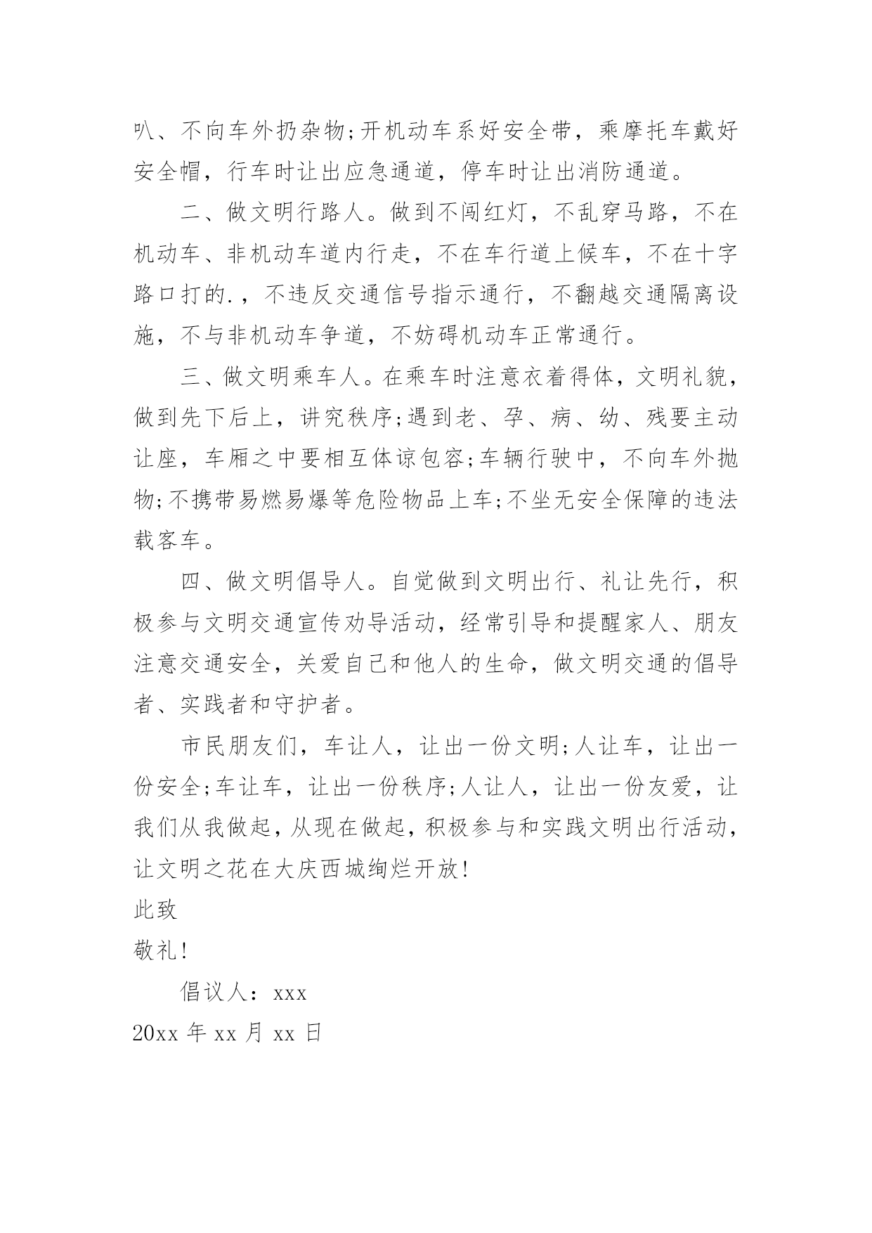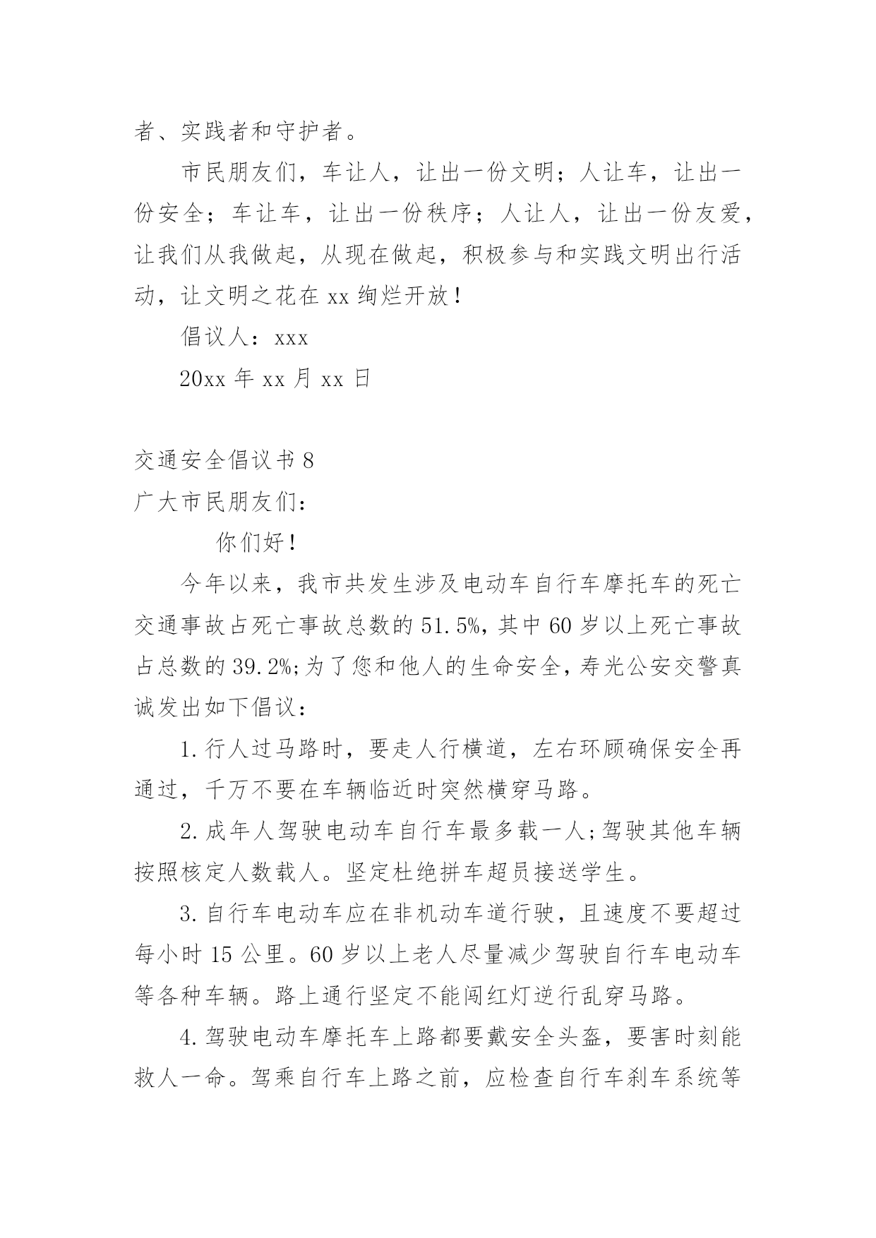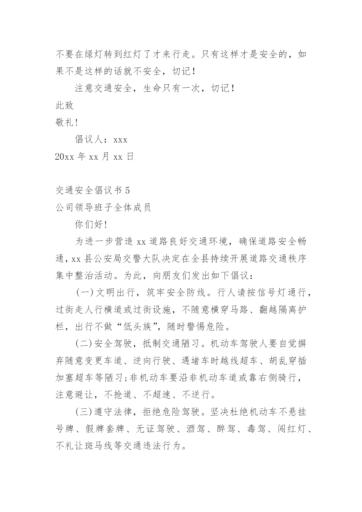 交通安全倡议书(优选)交通安全倡议书在不断进步的时代,越来越多地方需要用到倡议书,倡议书是为倡议、发起某项活动而写的号召性的公开提议性的专用书信。如何写一份恰当的倡议书呢?下面是小编帮大家整理的交通安全倡议书,仅供参考,大家一起来看看吧。交通安全倡议书1广大交通参与者:一年一度的高考即将开始,今年高考恰逢端午节假日,道路交通压力明显增大,为给广大考生创造一个安全、畅通的道路交通环境,确保每一位考生顺利参加高考,实现自己的人生理想,德江县公安局交警大队作出工作部署,要求全警动员、全警参战、全力保障高考期间的道路交通安全、畅通。现根据德江城区道路交通实际,德江交警提出如下倡议:1.高考期间尽量不开车出行,多乘坐公共交通工具,减轻城区交通压力,不给考点及周边“添堵”。2.高考期间,接送考生的驾驶人请您规范停车、文明行车、不乱鸣笛、服从现场交警指挥,确保道路交通安全。3.请您注意考点周边的绕行标志,提前做好绕行准备,避免不必要的拥堵。4.经过考点时请您减速慢行,不乱鸣笛,不猛踩油门或刹车,减少噪音,共同为考生营造安静的考试环境。5.各考场周边的`机关、企事业单位在考试期间请主动减少车辆外出,社会车辆应尽量绕开考点行驶。6.对于高考期间交警部门的各种管制措施,请广大驾驶人予以理解和配合。7.如果遇到考生紧急求助,请您尽量给予帮助,使考生尽快到达考试地点。8.自觉参与监督,对一些不道德的影响高考的行为和人员进行举报、曝光。9.请广大交通参与者自觉遵守交通法规,不乱穿乱行,不翻越护栏,走文明路,开文明车,共同营造安全、畅通、有序的道路交通环境。xx县公安局交通警察大队时间:20xx年xx月xx日交通安全倡议书2西城市民朋友们:我们生活在全国文明城市,我们生活在中国发展潜力区,西城的文明需要你我共同营造,西城的形象需要你我共同呵护。交通文明是展示市民素质窗口,共建文明和谐的交通环境,是每一位市民应尽的义务和责任。在大庆市“文明出行”主题活动启动之际,我们向广大市民发出如下倡议:一、做文明开车人。做到酒后不驾车,疲劳不开车;斑马线上不争先,红绿灯前不抢行;不超速、不超载、不抢道、不占道;不违章停车、不逆向行驶、不接听手机、不乱鸣喇叭、不向车外扔杂物;开机动车系好安全带,乘摩托车戴好安全帽,行车时让出应急通道,停车时让出消防通道。二、做文明行路人。做到不闯红灯,不乱穿马路,不在机动车、非机动车道内行走,不在车行道上候车,不在十字路口打的.,不违反交通信号指示通行,不翻越交通隔离设施,不与非机动车争道,不妨碍机动车正常通行。三、做文明乘车人。在乘车时注意衣着得体,文明礼貌,做到先下后上,讲究秩序;遇到老、孕、病、幼、残要主动让座,车厢之中要相互体谅包容;车辆行驶中,不向车外抛物;不携带易燃易爆等危险物品上车;不坐无安全保障的违法载客车。四、做文明倡导人。自觉做到文明出行、礼让先行,积极参与文明交通宣传劝导活动,经常引导和提醒家人、朋友注意交通安全,关爱自己和他人的生命,做文明交通的倡导者、实践者和守护者。市民朋友们,车让人,让出一份文明;人让车,让出一份安全;车让车,让出一份秩序;人让人,让出一份友爱,让我们从我做起,从现在做起,积极参与和实践文明出行活动,让文明之花在大庆西城绚烂开放!此致敬礼!倡议人:xxx20xx年xx月xx日交通安全倡议书3尊敬的家长们、亲爱的孩子们:生命对于我们每个人只有一次,请珍惜和关爱自己和他人的生命,遵守道路交通法规是我们应尽的责任和义务。当前神木市正处于交通大建设、大发展时期,道路交通出行环境复杂,交通安全形势严峻。在我们当中,不遵守交通法规的'现象随处可见,交通事故时有发生,道路交通安全已成为全社会共同关注的话题。为了你和他人的生命安全,特别是学生的安全需要广大家长、孩子们的密切配合,积极协作。在此向家长们、孩子们发出如下倡议:一、认真学习交通安全常识,自觉遵守交通秩序。不无证驾驶无牌机动车,不乘坐非法营运的电动三轮车、摩托车等四小车;二、文明交通各行其到,遵守交通信号。不闯红灯、不乱穿道路、不在道路上嬉闹玩耍,不越护栏、不追车趴车、不抛物击车;靠路边行走,横过道路走斑马线,做到一停二看三通过;三、排队乘车,不向窗外乱扔东西,从右侧下车,不乘坐带病车超载车和农用车;四、骑车靠右,不逆行、不双手离把、不互相追逐、不扶身并行、不突然猛拐;五、驾驶机动车接送子女上下学要服从交警指挥和管理,按指定位置停放车辆,不逆向行驶、停车,不阻塞校门、马路。六、家长要自觉遵守交通法规,为子女树立榜样,教育和引导学生子女遵守交通法规。平平安安出门,快快乐乐回家。让我们从现在做起,从自己做起,为了家庭的幸福、社会的安定,积极行动起来,珍惜彼此宝贵的生命,自觉遵守交通法规,共同营造一个更加安全、和谐、有序的交通环境。此致敬礼!倡议人: