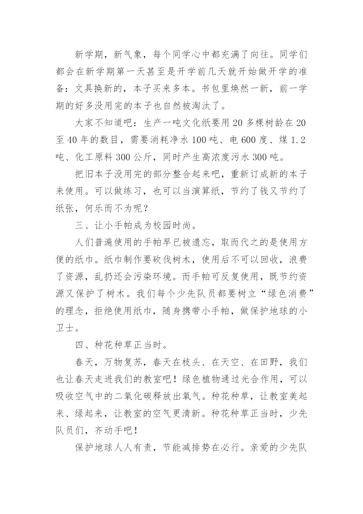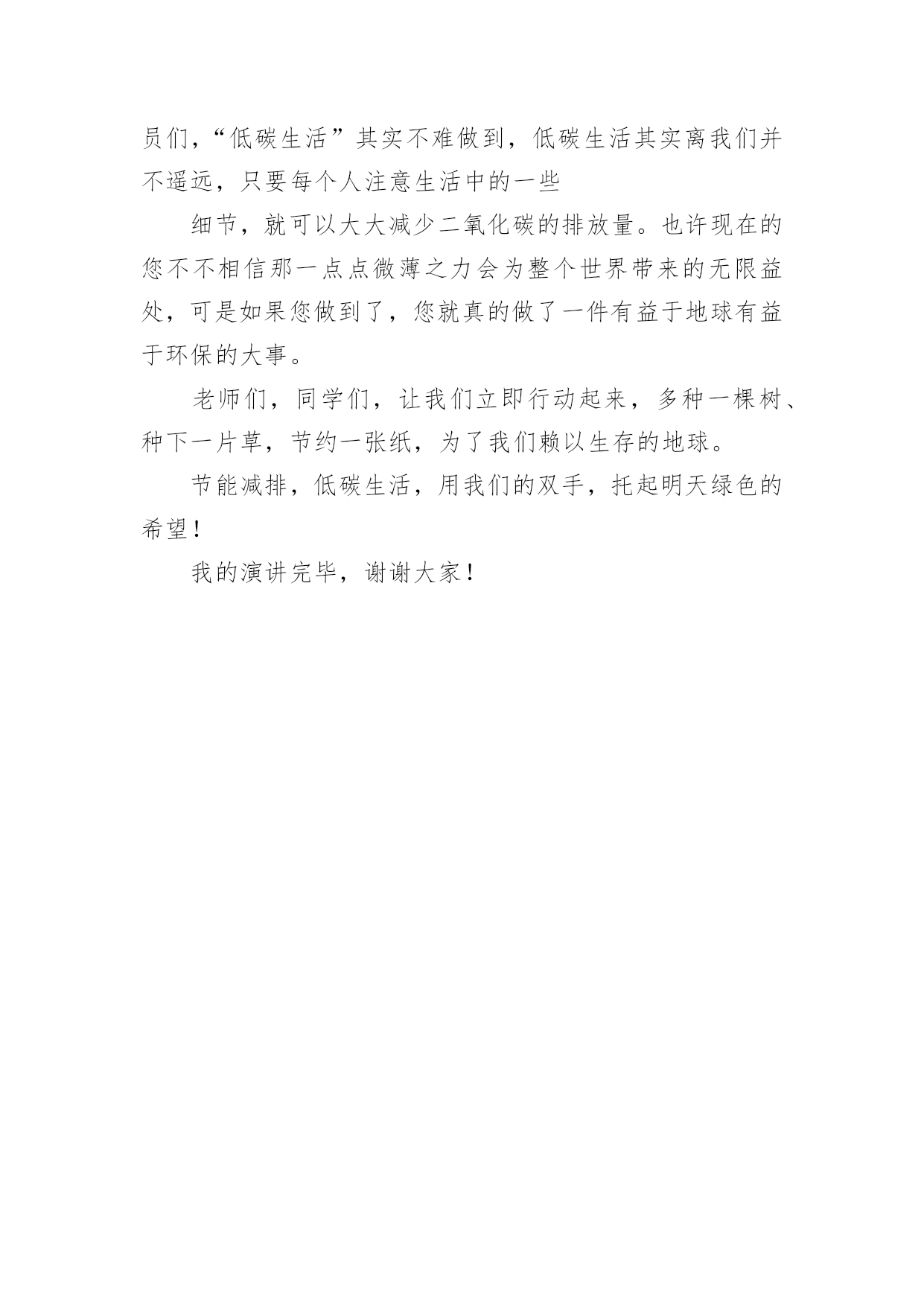 低碳环保的发言稿在不断进步的社会中,我们都可能会用到发言稿,发言稿具有逻辑严密,态度明确,观点鲜明的特点。怎么写发言稿才能避免踩雷呢?下面是小编精心整理的低碳环保的发言稿,供大家参考借鉴,希望可以帮助到有需要的朋友。尊敬的各位老师,亲爱的同学们:大家好!我叫王XX。您知道吗?您手中的塑料购物袋,您吃快餐时使用的一次性餐盒,您洗衣用的含磷洗衣粉,还有您每天都离不来的电脑、电视等等,它们其实都是二氧化碳的来源。老师们、同学们,请记住我们的责任吧:保护环境,刻不容缓。低碳生活,从我做起。亲爱的少先队员们,低碳生活,你们准备好了吗?一、为新书穿上环保的新衣。每到新学期同学们领了新书。兴高采烈之余,我们要为新书包上书皮,以往大家都是一到开学就买塑料书皮,或者买漂亮的包装纸包书皮。每个人平均有六七本新书,要花费多少钱啊!更重要的是,这些塑料书皮和漂亮包装纸制作要浪费能源,不利环保,塑料书皮使用后还会产生白色垃圾。不如用旧挂历、海报、牛皮纸等材料包书皮,既利于环保,还可以跟着爸爸妈妈学习,学会自己包,锻炼动手能力。二、把没有用完的本子利用起来。新学期,新气象,每个同学心中都充满了向往。同学们都会在新学期第一天甚至是开学前几天就开始做开学的准备:文具换新的,本子买来多本。书包里焕然一新,前一学期的好多没用完的本子也自然被淘汰了。大家不知道吧:生产一吨文化纸要用20多棵树龄在20至40年的数目,需要消耗净水100吨、电600度、煤1.2吨、化工原料300公斤,同时产生高浓度污水300吨。把旧本子没用完的部分整合起来吧,重新订成新的本子来使用。可以做练习,也可以当演算纸,节约了钱又节约了纸张,何乐而不为呢?三、让小手帕成为校园时尚。人们普遍使用的手帕早已被遗忘,取而代之的是使用方便的纸巾。纸巾制作要砍伐树木,使用后不可以回收,浪费了资源,乱扔还会污染环境。而手帕可反复使用,既节约资源又保护了树木。我们每个少先队员都要树立“绿色消费”的理念,拒绝使用纸巾,随身携带小手帕,做保护地球的小卫士。四、种花种草正当时。春天,万物复苏,春天在枝头、在天空、在田野,我们也让春天走进我们的教室吧!绿色植物通过光合作用,可以吸收空气中的二氧化碳释放出氧气。种花种草,让教室美起来、绿起来,让教室的空气更清新。种花种草正当时,少先队员们,齐动手吧!保护地球人人有责,节能减排势在必行。亲爱的少先队员们,“低碳生活”其实不难做到,低碳生活其实离我们并不遥远,只要每个人注意生活中的一些细节,就可以大大减少二氧化碳的排放量。也许现在的您不不相信那一点点微薄之力会为整个世界带来的无限益处,可是如果您做到了,您就真的做了一件有益于地球有益于环保的大事。老师们,同学们,让我们立即行动起来,多种一棵树、种下一片草,节约一张纸,为了我们赖以生存的地球。节能减排,低碳生活,用我们的双手,托起明天绿色的希望!我的演讲完毕,谢谢大家!