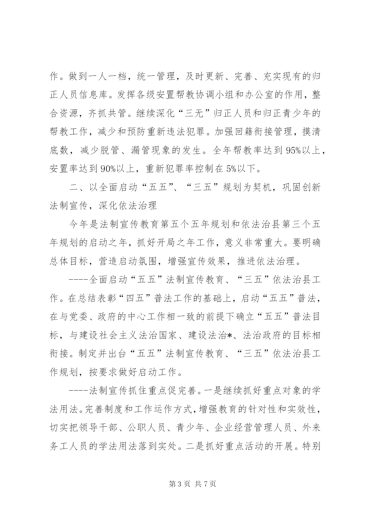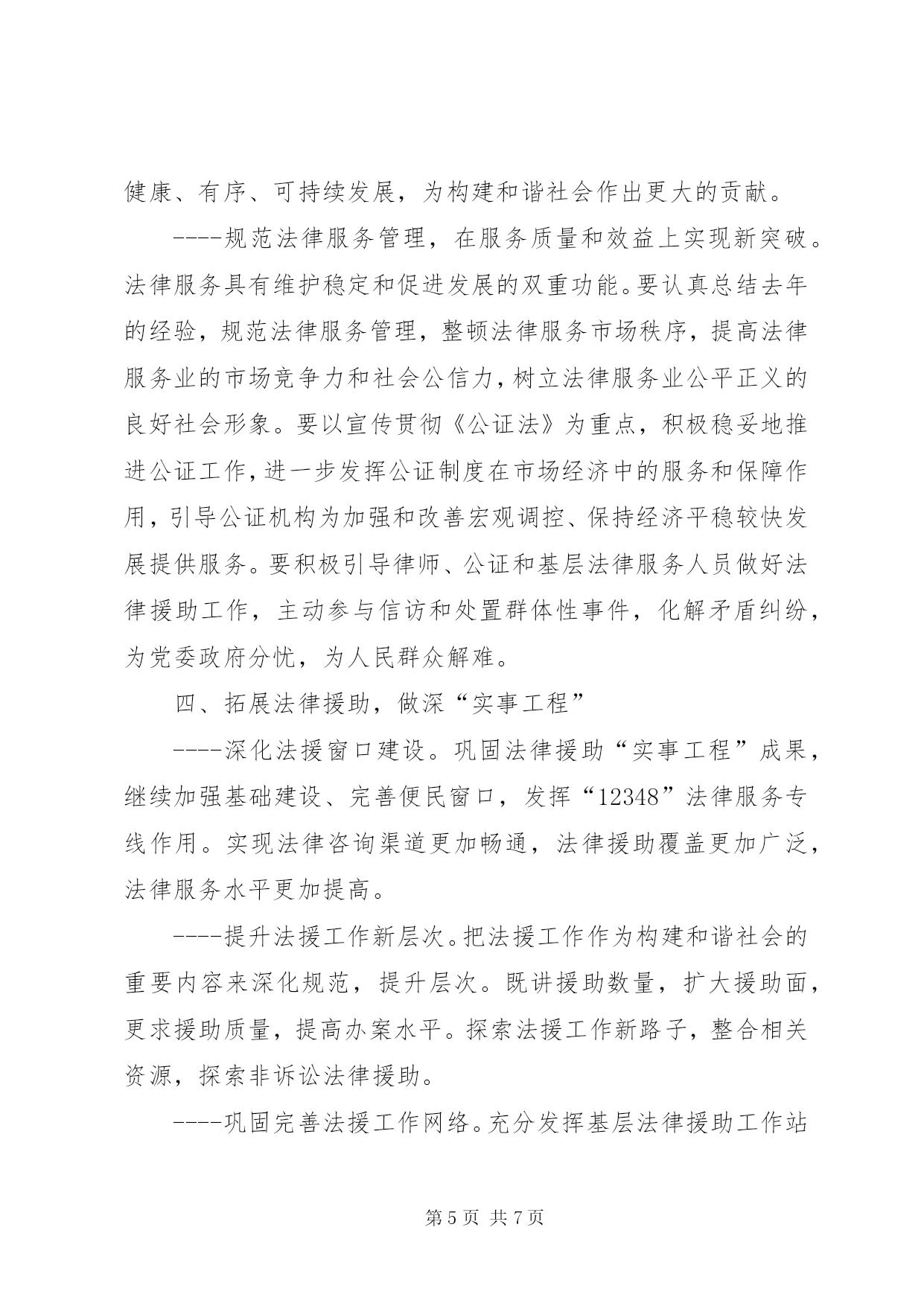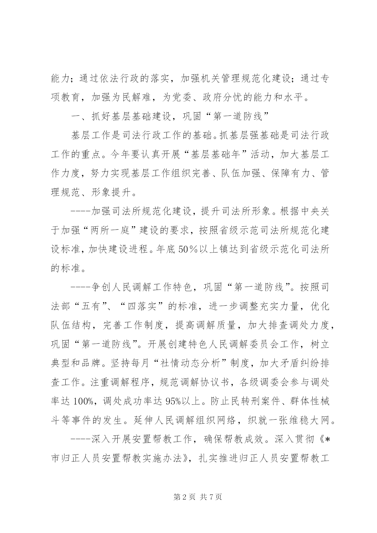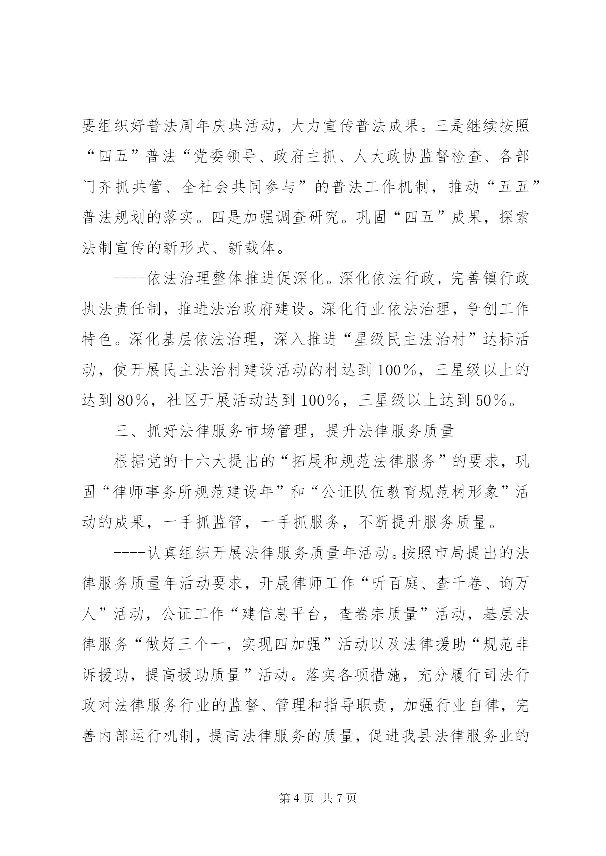 第PAGE\*Arabic\*MERGEFORMAT7页共NUMPAGES\*MERGEFORMAT7页司法局强化行政教育规划计划20*年全县司法行政工作总的指导思想是。高举邓小平理论和“三个代表”重要思想的伟大旗帜,以党的十六大和十六届三中、四中、五中全会精神为指导,以科学发展观为统领,在县委、县政府的领导和*市司法局的指导下,围绕中心、服务大局、突出重点、增创特色,加强基层,树立形象,充分发挥司法行政机关的职能作用和整体作用,为建设“法治*”,构筑和谐社会作出新的更大的贡献。围绕这个指导思想,今年全县司法行政工作总体要求和主要任务是围绕“一个目标”、发挥“两个作用”、树立“三个理念”、实现“四个加强”。----围绕“一个目标”。围绕建设“法治*”,构筑和谐社会的目标,开展司法行政各项工作,强基础、创特色、严管理、树形象,整体推进司法行政工作。----发挥“两个作用”。围绕中心,服务大局,突出重点,争创特色,充分发挥司法行政机关的职能作用;进一步整合资源,上下联动,充分发挥全县司法行政系统的整体作用。----树立“三个理念”。树立贴近人民群众的事情做实;涉及中心大局的事情做深;关系司法行政机关形象的事情做细的工作理念。----实现“四个加强”。通过党员教育活动,加强班子建设,队伍建设;通过增强基层基础建设,加强预防、化解各类矛盾的能力;通过依法行政的落实,加强机关管理规范化建设;通过专项教育,加强为民解难,为党委、政府分忧的能力和水平。一、抓好基层基础建设,巩固“第一道防线”基层工作是司法行政工作的基础。抓基层强基础是司法行政工作的重点。今年要认真开展“基层基础年”活动,加大基层工作力度,努力实现基层工作组织完善、队伍加强、保障有力、管理规范、形象提升。----加强司法所规范化建设,提升司法所形象。根据中央关于加强“两所一庭”建设的要求,按照省级示范司法所规范化建设标准,加快建设进程。年底50%以上镇达到省级示范化司法所的标准。----争创人民调解工作特色,巩固“第一道防线”。按照司法部“五有”、“四落实”的标准,进一步调整充实力量,优化队伍结构,完善工作制度,提高调解质量,加大排查调处力度,巩固“第一道防线”。开展创建特色人民调解委员会工作,树立典型和品牌。坚持每月“社情动态分析”制度,加大矛盾纠纷排查工作。注重调解程序,规范调解协议书,各级调委会参与调处率达100%,调处成功率达95%以上。防止民转刑案件、群体性械斗等事件的发生。延伸人民调解组织网络,织就一张维稳大网。----深入开展安置帮教工作,确保帮教成效。深入贯彻《*市归正人员安置帮教实施办法》,扎实推进归正人员安置帮教工作。做到一人一档,统一管理,及时更新、完善、充实现有的归正人员信息库。发挥各级安置帮教协调小组和办公室的作用,整合资源,齐抓共管。继续深化“三无”归正人员和归正青少年的帮教工作,减少和预防重新违法犯罪。加强回籍衔接管理,摸清底数,减少脱管、漏管现象的发生。全年帮教率达到95%以上,安置率达到90%以上,重新犯罪率控制在5%以下。二、以全面启动“五五”、“三五”规划为契机,巩固创新法制宣传,深化依法治理今年是法制宣传教育第五个五年规划和依法治县第三个五年规划的启动之年,抓好开局之年工作,意义非常重大。要明确总体目标,营造启动氛围,增强宣传效果,推进依法治理。----全面启动“五五”法制宣传教育、“三五”依法治县工作。在总结表彰“四五”普法工作的基础上,启动“五五”普法,在与党委、政府的中心工作相一致的前提下确立“五五”普法目标,与建设社会主义法治国家、建设法治*、法治政府的目标相衔接。制定并出台“五五”法制宣传教育、“三五”依法治县工作规划,按要求做好启动工作。----法制宣传抓住重点促完善。一是继续抓好重点对象的学法用法。完善制度和工作运作方式,增强教育的针对性和实效性,切实把领导干部、公职人员、青少年、企业经营管理人员、外来务工人员的学法用法落到实处。二是抓好重点活动的开展。特别要组织好普法周年庆典活动,大力宣传普法成果。三是继续按照“四五”普法“党委领导、政府主抓、人大政协监督检查、各部门齐抓共管、全社会共同参与”的普法工作机制,推动“五五”普法规划的落实。四是加强调查研究。巩固“四五”成果,探索法制宣传的新形式、新载体。----依法治理整体推进促深化。深化依法行政,完善镇行政执法责任制,推进法治政府建设。深化行业依法治理,争创工作特色。深化基层依法治理,深入推进“星级民主法治村”达标活动,使开展民主法治村建设活动的村达到100%,三星级以上的达到80%,社区开展活动达到100%,三星级以上达到50%。三、抓好法律服务市场管理,提升法律服务质量根据党的十六大提出的“拓展和规范法律服务”的要求,巩固“律师事务所规范建设