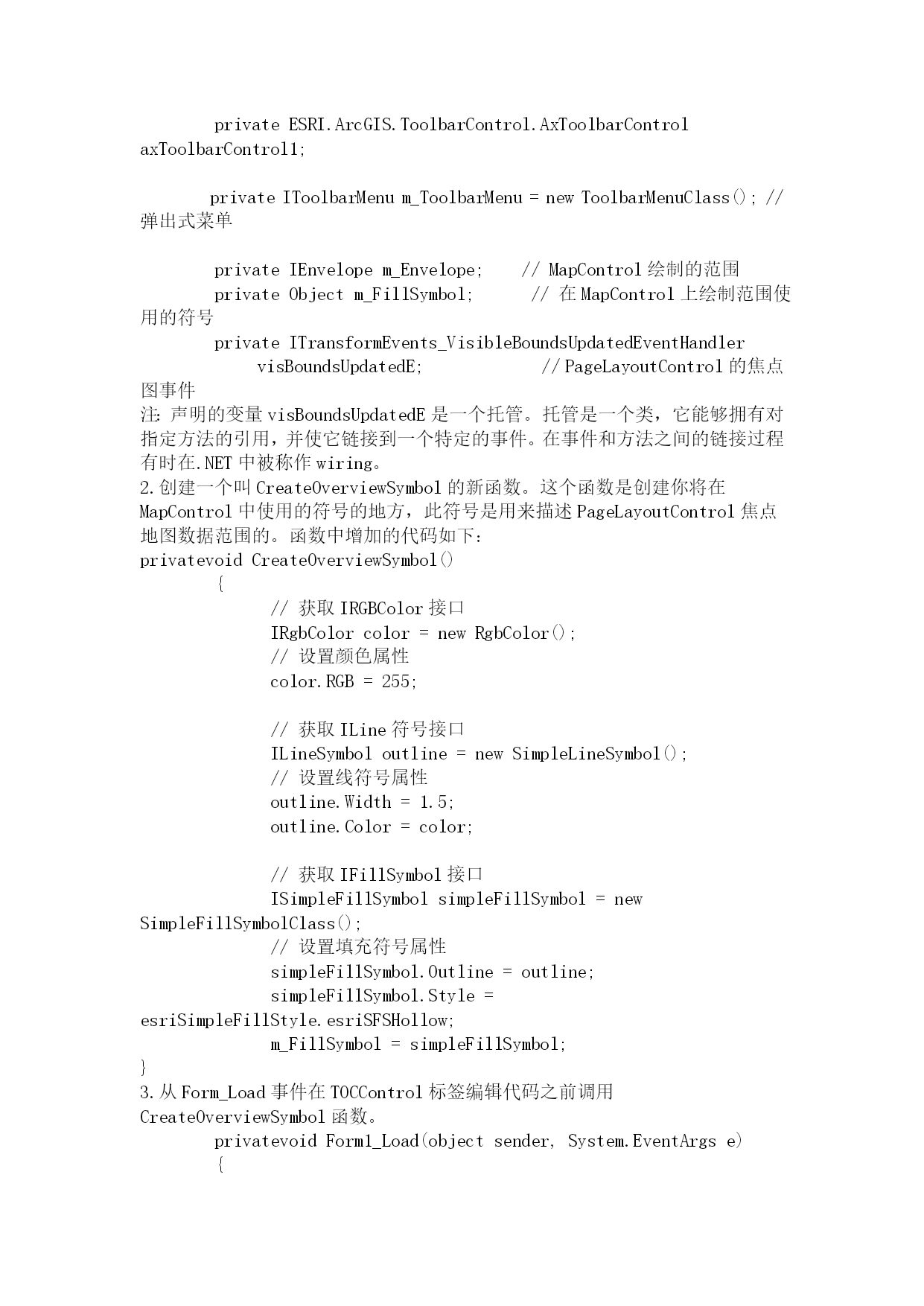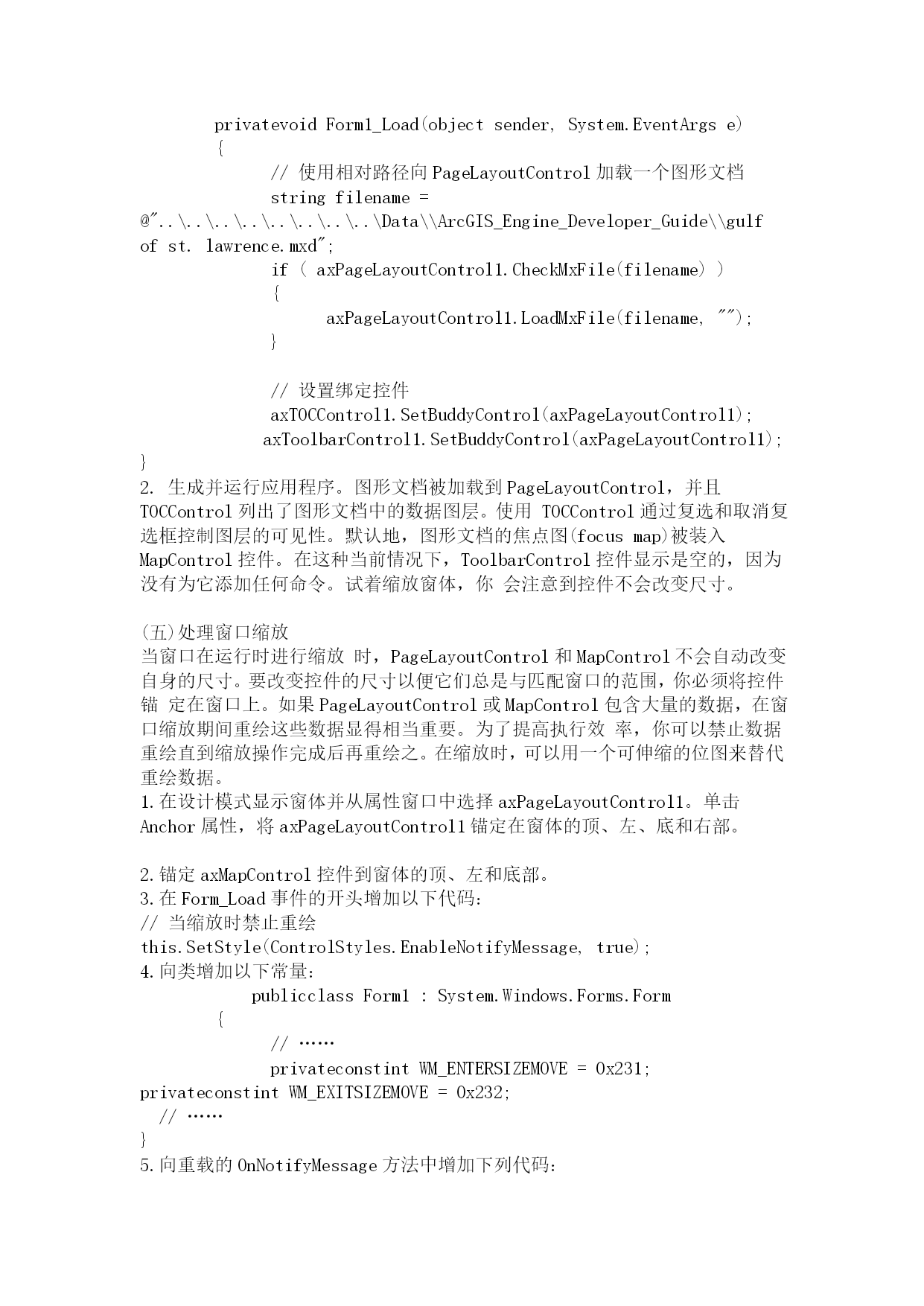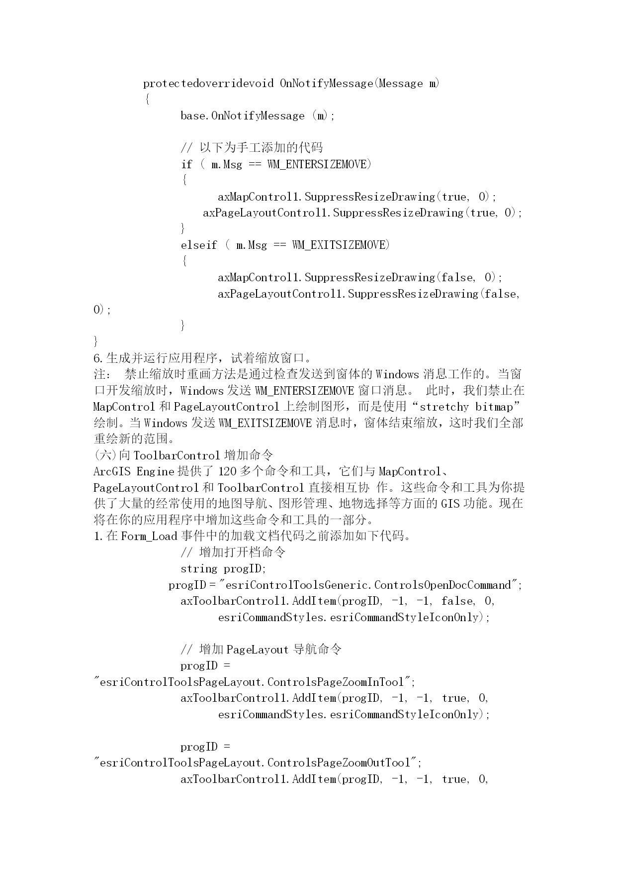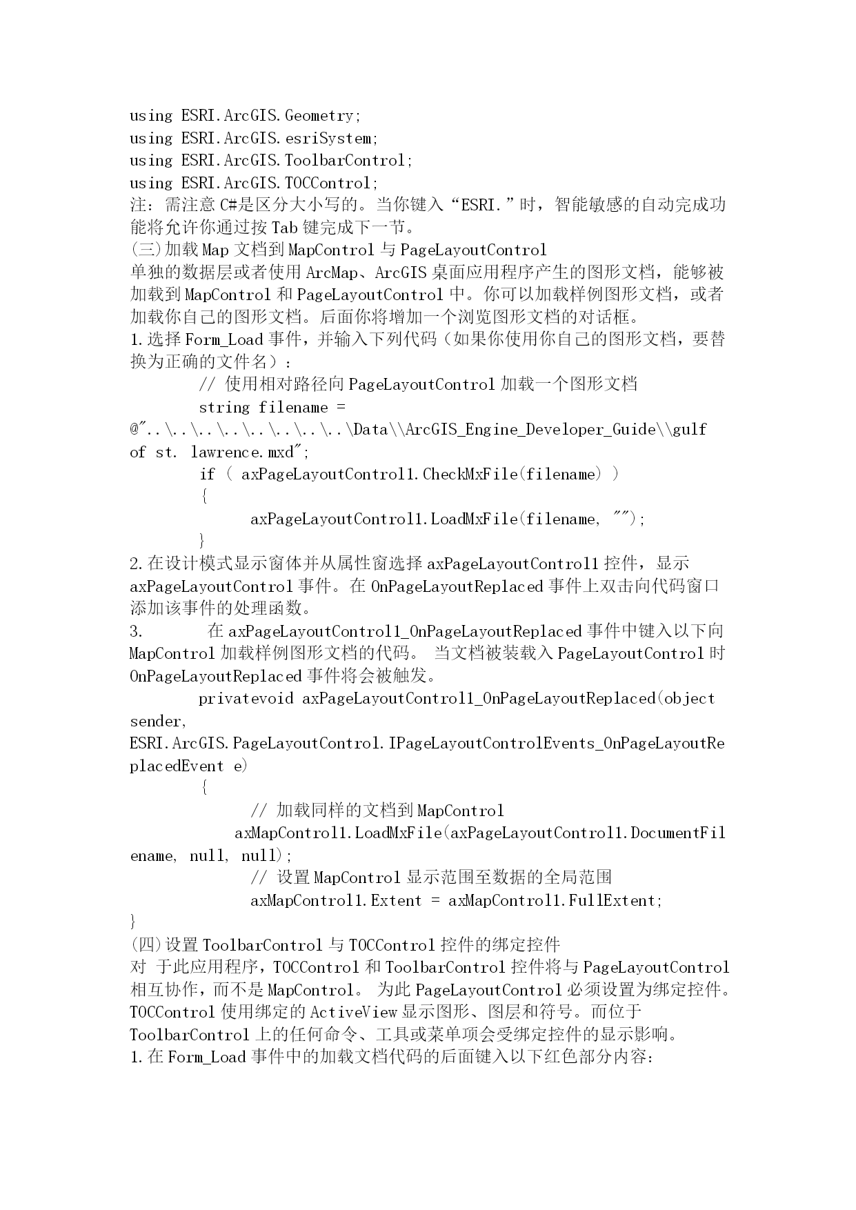 HYPERLINK"http://blog.163.com/geliang0021@126/blog/static/323223292011815104732798/"《ArcGISEngine简介》(1.3.2-1.3.4部分)AE+c#入门教程2011-09-1510:48:44|分类:HYPERLINK"http://blog.163.com/geliang0021@126/blog/"\l"m=0&t=1&c=fks_084064082095085071085086086095087084082065086085084074"\o"ArcGIS"ArcGIS|字号订阅【转载】AE+C#入门教程转载(一)加载ArcGIS控件在你为应用程序编写代码之前,应该先将应用程序将用到的ArcGIS控件和其他ArcGISEngine库引用装载到开发环境之中。1.启动VisualStudio.NET,并从新建项目对话框中创建一个新的VisualC#“Windows应用程序”项目。2.将项目命名为“Controls”,并选择位置存取该项目。3.在“工具箱”的“Windows窗体”标签栏中单击右键,然后从上下文菜单中选择“添加/移除项(I)…”。4.在“自定义工具箱”中选择“.NETFramework组件”,并复选“AxMapControl”,“AxPageLayoutControl”,“AxTOCControl”和“AxToolbarControl”,单击确定按钮。这样所选择的控件将显示在工具箱的Windows窗体标签栏中。5.单击项目菜单,并选择“添加引用(R)…”。6.在添加引用对话框中,双击“ESRI.ArcGIS.Carto”,“ESRI.ArcGIS.Display”,“ESRI.ArcGIS.Geometry”,“ESRI.ArcGIS.System”,“ESRI.ArcGIS.SystemUI”,“ESRI.ArcGIS.Utility”。单击确定。注:对于ESRI.NET程序集,将通过具体实例来说明,并使用.NET框架提供的COM传送服务从你的C#项目中调用ESRI对象库中的实体对象。(二)在容器中嵌入ArcGIS控件在你能够访问每个控件的事件、属性和方法之前,需要将控件嵌入到.NET容器中。一旦将控件嵌入窗体内,它们将图形化应用程序的用户界面。1.在设计模式下打开.NET窗体。2.双击工具箱Windows标签栏中的AxMapControl控件,将MapControl加入到窗体上。3.再将AxPageLayoutControl、AxTOCControl和AxToolbarControl如上添加到窗体中。4.重新调整窗体上各个控件的大小和位置,调整结果如下所示。5.在窗体上双击显示窗体代码窗口,在代码窗口的顶部增加“using”命令:usingSystem;usingSystem.Windows.Forms;//ArcGISEngine引用usingESRI.ArcGIS.SystemUI;usingESRI.ArcGIS.Carto;usingESRI.ArcGIS.Display;usingESRI.ArcGIS.Geometry;usingESRI.ArcGIS.esriSystem;usingESRI.ArcGIS.ToolbarControl;usingESRI.ArcGIS.TOCControl;注:需注意C#是区分大小写的。当你键入“ESRI.”时,智能敏感的自动完成功能将允许你通过按Tab键完成下一节。(三)加载Map文档到MapControl与PageLayoutControl单独的数据层或者使用ArcMap、ArcGIS桌面应用程序产生的图形文档,能够被加载到MapControl和PageLayoutControl中。你可以加载样例图形文档,或者加载你自己的图形文档。后面你将增加一个浏览图形文档的对话框。1.选择Form_Load事件,并输入下列代码(如果你使用你自己的图形文档,要替换为正确的文件名)://使用相对路径向PageLayoutControl加载一个图形文档stringfilename=@"..\..\..\..\..\..\..\..\Data\\ArcGIS_Engine_Developer_Guide\\gulfofst.lawrence.mxd";if(axPageLayoutControl1.CheckMxFile(filename)){axPageLayoutControl1.LoadMxFile(filename,"");}2.在设计模式显示窗体并从属性窗选择axPageLayoutC