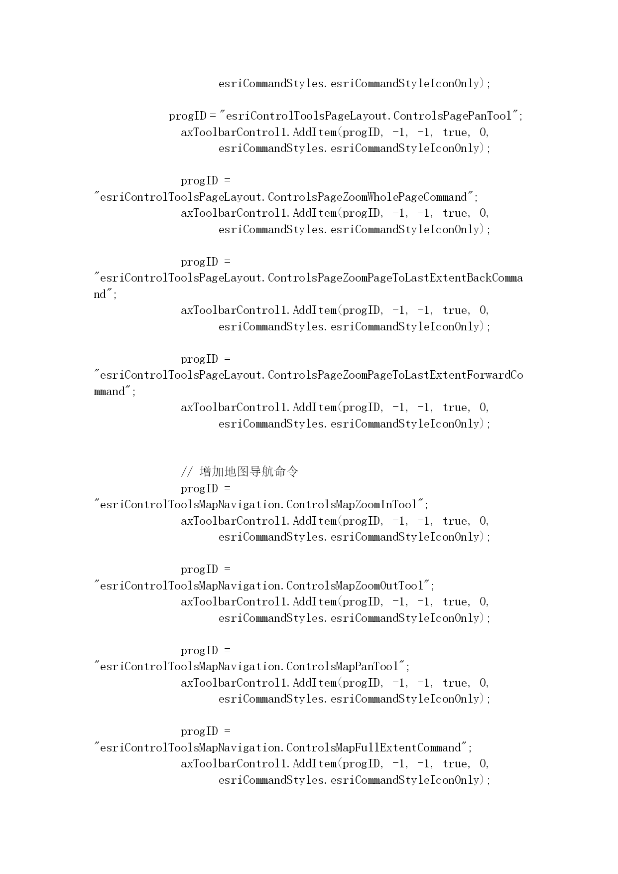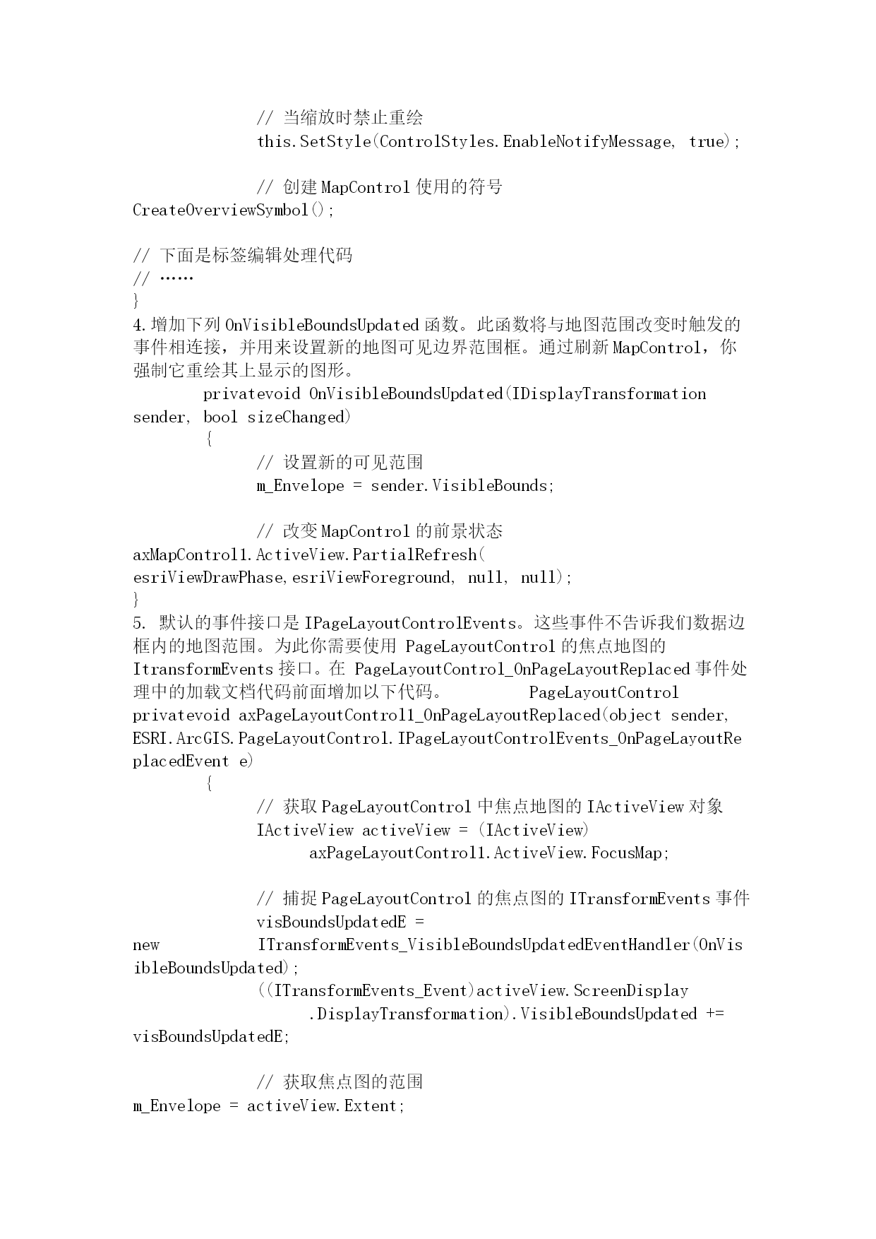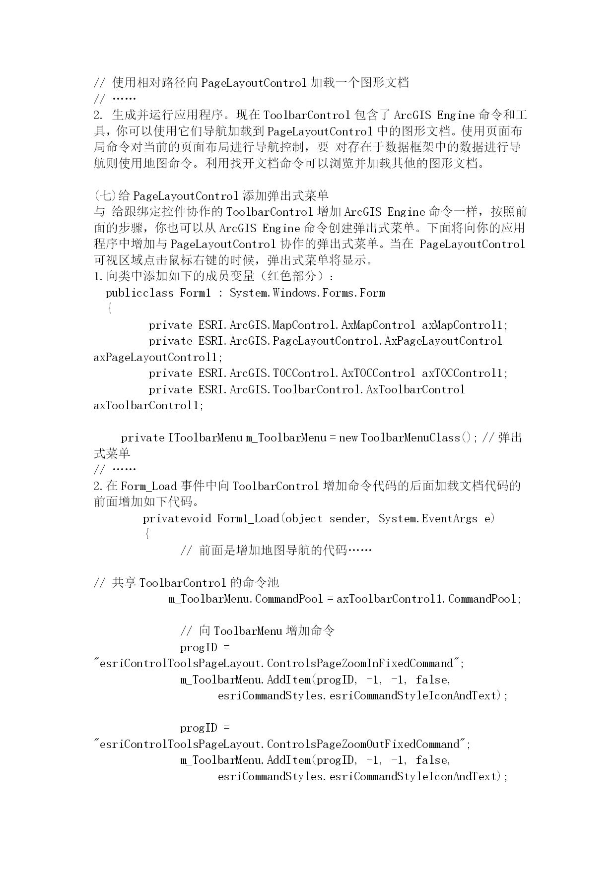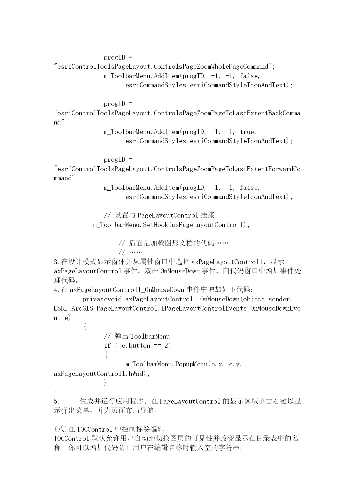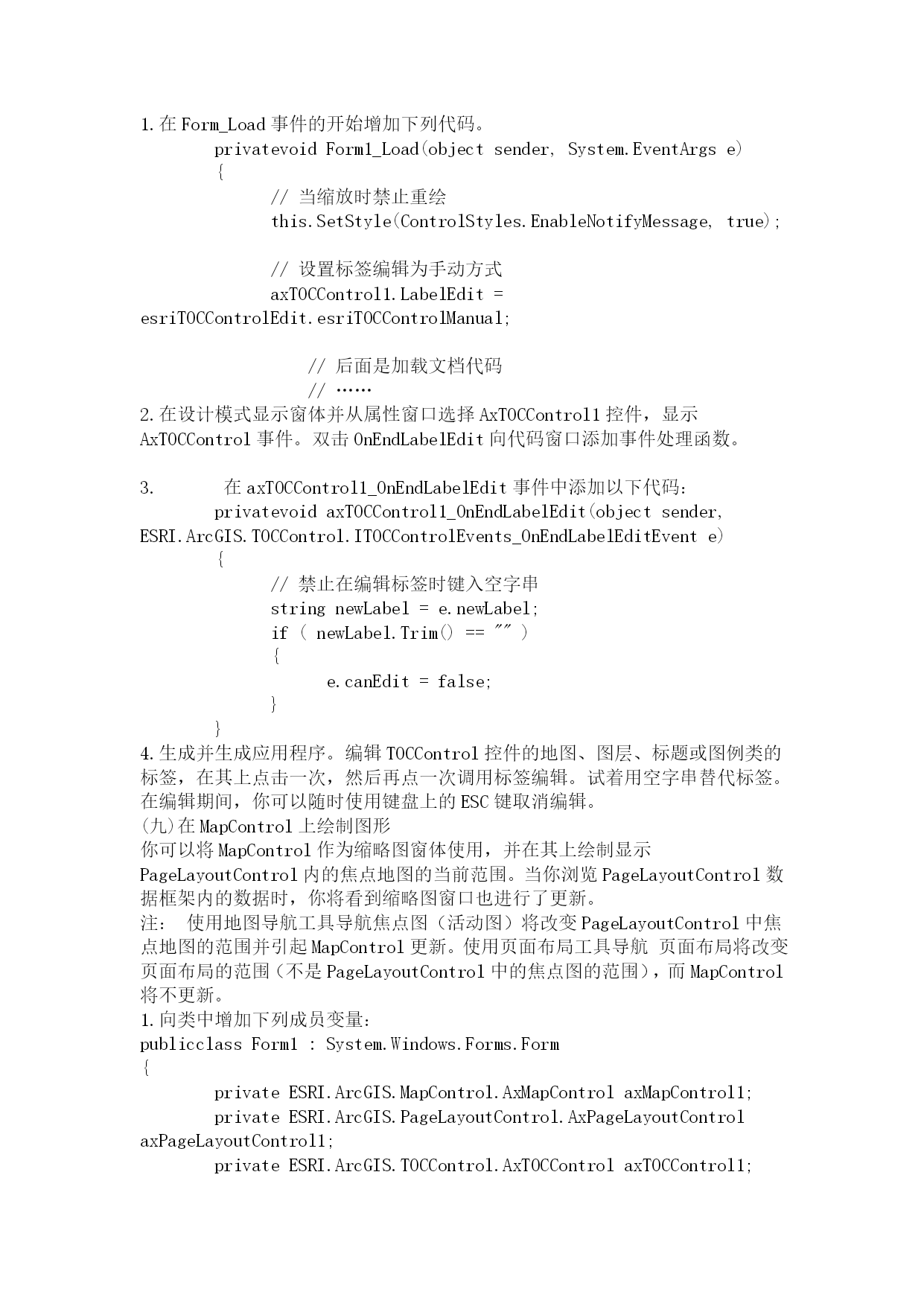 HYPERLINK"http://blog.163.com/geliang0021@126/blog/static/323223292011815104732798/"《ArcGISEngine简介》(1.3.2-1.3.4部分)AE+c#入门教程2011-09-1510:48:44|分类:HYPERLINK"http://blog.163.com/geliang0021@126/blog/"\l"m=0&t=1&c=fks_084064082095085071085086086095087084082065086085084074"\o"ArcGIS"ArcGIS|字号订阅【转载】AE+C#入门教程转载(一)加载ArcGIS控件在你为应用程序编写代码之前,应该先将应用程序将用到的ArcGIS控件和其他ArcGISEngine库引用装载到开发环境之中。1.启动VisualStudio.NET,并从新建项目对话框中创建一个新的VisualC#“Windows应用程序”项目。2.将项目命名为“Controls”,并选择位置存取该项目。3.在“工具箱”的“Windows窗体”标签栏中单击右键,然后从上下文菜单中选择“添加/移除项(I)…”。4.在“自定义工具箱”中选择“.NETFramework组件”,并复选“AxMapControl”,“AxPageLayoutControl”,“AxTOCControl”和“AxToolbarControl”,单击确定按钮。这样所选择的控件将显示在工具箱的Windows窗体标签栏中。5.单击项目菜单,并选择“添加引用(R)…”。6.在添加引用对话框中,双击“ESRI.ArcGIS.Carto”,“ESRI.ArcGIS.Display”,“ESRI.ArcGIS.Geometry”,“ESRI.ArcGIS.System”,“ESRI.ArcGIS.SystemUI”,“ESRI.ArcGIS.Utility”。单击确定。注:对于ESRI.NET程序集,将通过具体实例来说明,并使用.NET框架提供的COM传送服务从你的C#项目中调用ESRI对象库中的实体对象。(二)在容器中嵌入ArcGIS控件在你能够访问每个控件的事件、属性和方法之前,需要将控件嵌入到.NET容器中。一旦将控件嵌入窗体内,它们将图形化应用程序的用户界面。1.在设计模式下打开.NET窗体。2.双击工具箱Windows标签栏中的AxMapControl控件,将MapControl加入到窗体上。3.再将AxPageLayoutControl、AxTOCControl和AxToolbarControl如上添加到窗体中。4.重新调整窗体上各个控件的大小和位置,调整结果如下所示。5.在窗体上双击显示窗体代码窗口,在代码窗口的顶部增加“using”命令:usingSystem;usingSystem.Windows.Forms;//ArcGISEngine引用usingESRI.ArcGIS.SystemUI;usingESRI.ArcGIS.Carto;usingESRI.ArcGIS.Display;usingESRI.ArcGIS.Geometry;usingESRI.ArcGIS.esriSystem;usingESRI.ArcGIS.ToolbarControl;usingESRI.ArcGIS.TOCControl;注:需注意C#是区分大小写的。当你键入“ESRI.”时,智能敏感的自动完成功能将允许你通过按Tab键完成下一节。(三)加载Map文档到MapControl与PageLayoutControl单独的数据层或者使用ArcMap、ArcGIS桌面应用程序产生的图形文档,能够被加载到MapControl和PageLayoutControl中。你可以加载样例图形文档,或者加载你自己的图形文档。后面你将增加一个浏览图形文档的对话框。1.选择Form_Load事件,并输入下列代码(如果你使用你自己的图形文档,要替换为正确的文件名)://使用相对路径向PageLayoutControl加载一个图形文档stringfilename=@"..\..\..\..\..\..\..\..\Data\\ArcGIS_Engine_Developer_Guide\\gulfofst.lawrence.mxd";if(axPageLayoutControl1.CheckMxFile(filename)){axPageLayoutControl1.LoadMxFile(filename,"");}2.在设计模式显示窗体并从属性窗选择axPageLayoutC