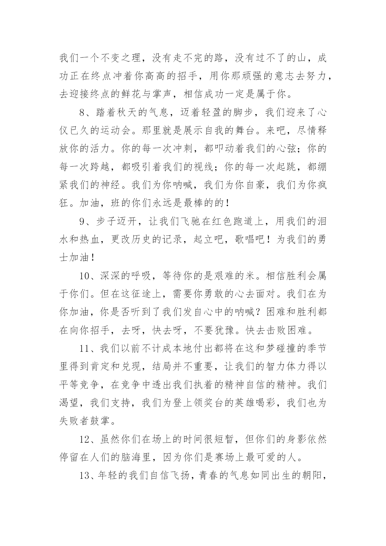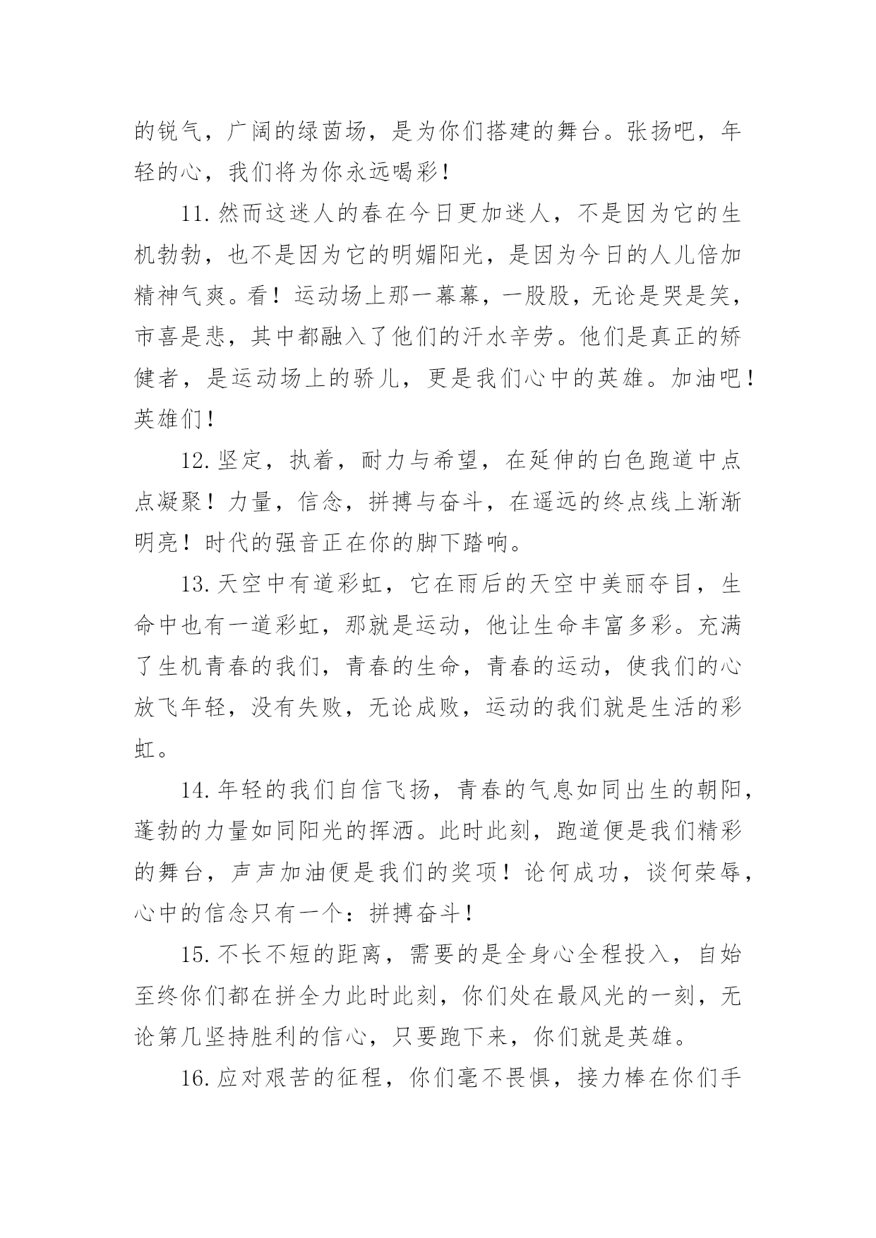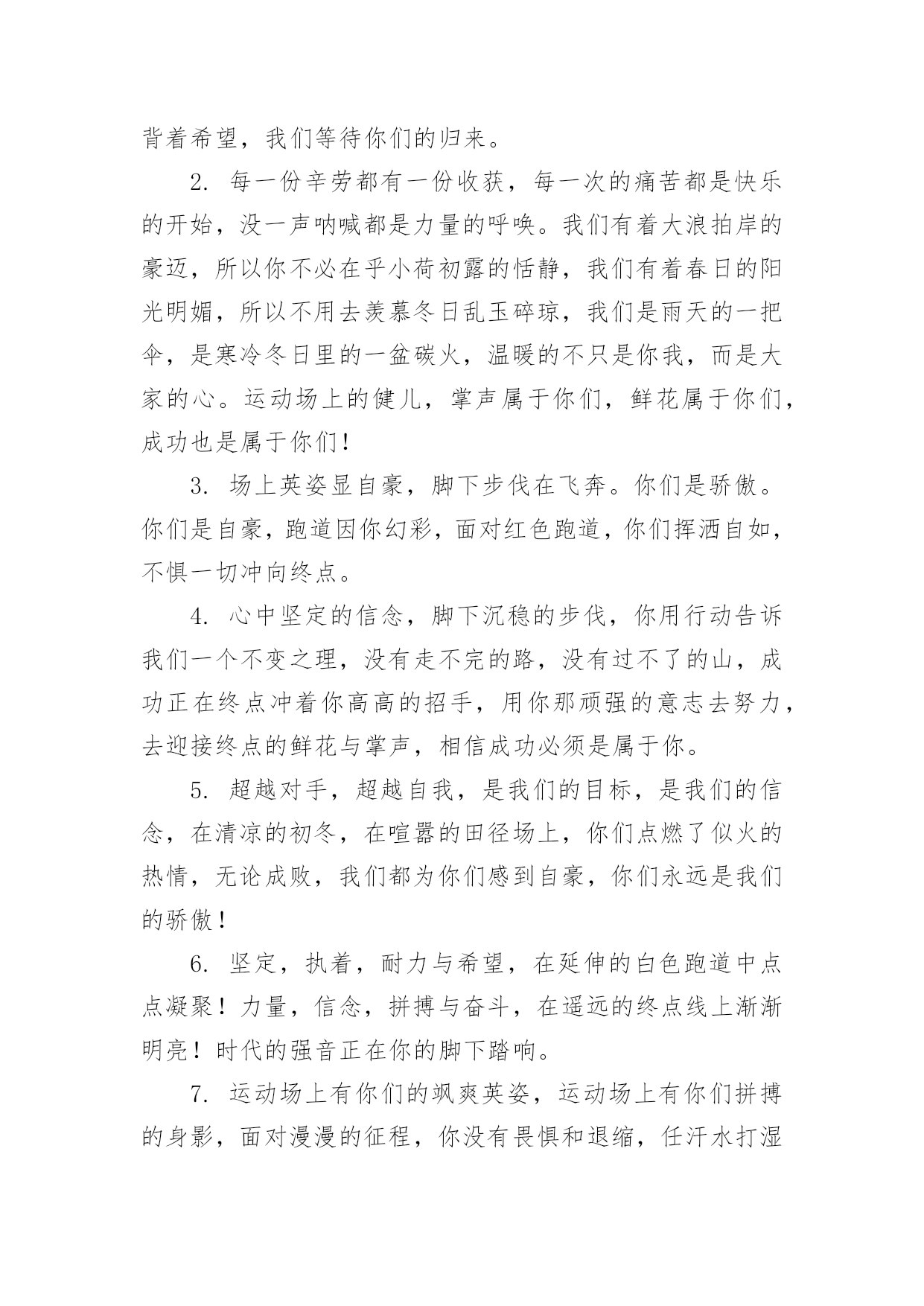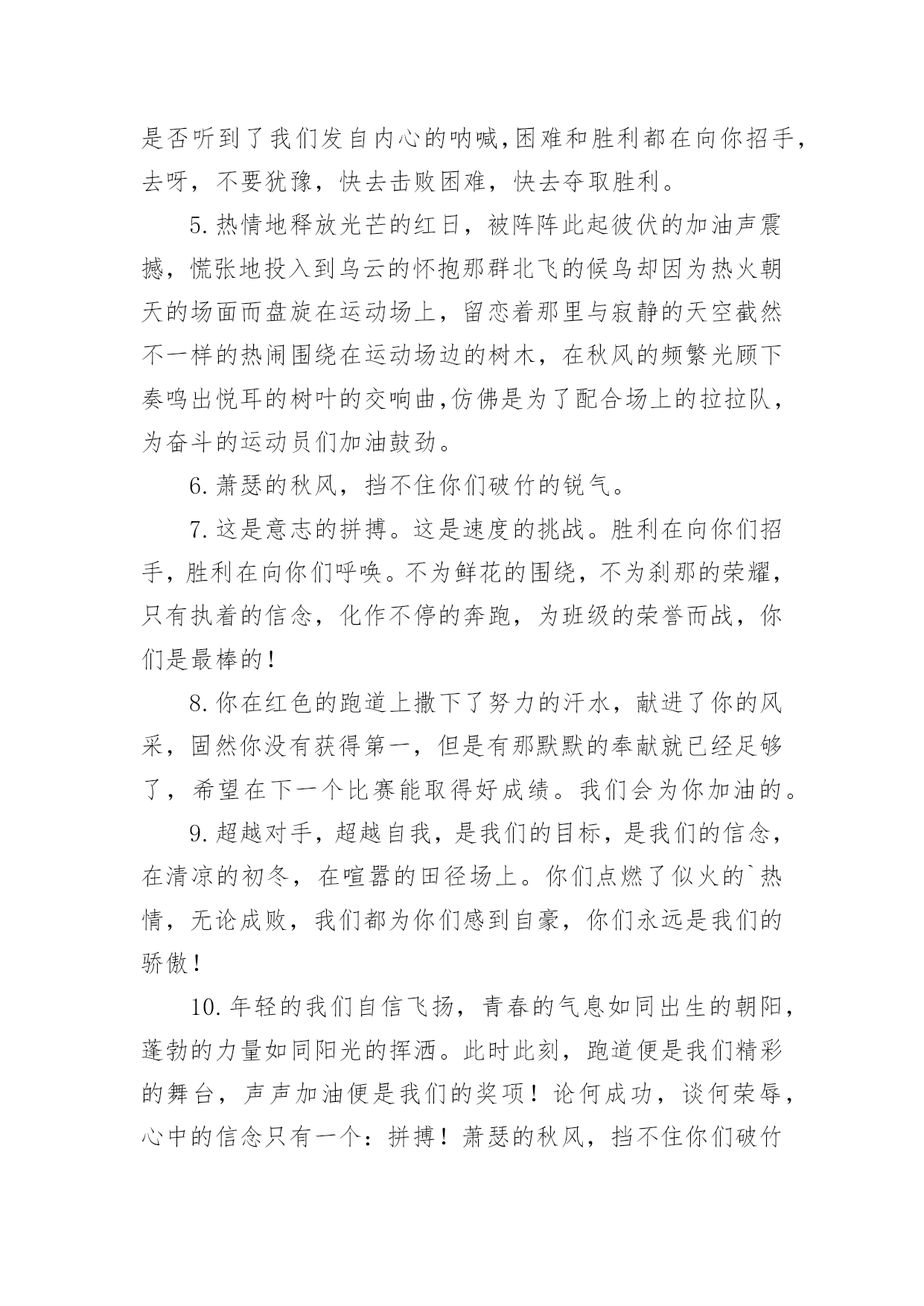 运动会加油稿运动会加油稿在社会发展不断提速的今天,各种加油稿频频出现,加油稿是用于给别人加油鼓气,提升别人气势的文稿。你所见过的加油稿是什么样的呢?以下是小编整理的运动会加油稿,希望能够帮助到大家。运动会加油稿11.踏上跑道,是一种选择。离开起点,是一种勇气。驰骋赛场,是一种胜利。运动健将们,用你的实力,用你的精神,去开拓出,一片属于你的长跑天地!2.漫漫长路,你愿一人独撑,忍受着孤独与寂寞,承受着体力与精神的压迫,只任汗水溶于泪水,可脚步却从不停歇。好样的,纵然得不了桂冠,可坚持的你,定会赢得最后的掌声。3.场上英姿显自豪,脚下步伐在飞奔。你们是骄傲。你们是自豪,跑道因你幻彩,应对红色跑道,你们挥洒自如,不惧一切冲向重点。4.面对艰苦的征程,你们毫不畏惧,接力棒在你们手中传递着集体的力量,听,我们在为你呐喊,你们诠释着奥运的精神,你们是我们心中的骄傲。相信胜利会属于你们,但在这征途上,需要你勇敢的心去面对。我们在为你加油,你是否听到了我们发自内心的呐喊,困难和胜利都在向你招手,去呀,不要犹豫,快去击败困难,快去夺取胜利。5.热情地释放光芒的红日,被阵阵此起彼伏的加油声震撼,慌张地投入到乌云的怀抱那群北飞的候鸟却因为热火朝天的场面而盘旋在运动场上,留恋着那里与寂静的天空截然不一样的热闹围绕在运动场边的树木,在秋风的频繁光顾下奏鸣出悦耳的树叶的交响曲,仿佛是为了配合场上的拉拉队,为奋斗的运动员们加油鼓劲。6.萧瑟的秋风,挡不住你们破竹的锐气。7.这是意志的拼搏。这是速度的挑战。胜利在向你们招手,胜利在向你们呼唤。不为鲜花的围绕,不为刹那的荣耀,只有执着的信念,化作不停的奔跑,为班级的荣誉而战,你们是最棒的!8.你在红色的跑道上撒下了努力的汗水,献进了你的风采,固然你没有获得第一,但是有那默默的奉献就已经足够了,希望在下一个比赛能取得好成绩。我们会为你加油的。9.超越对手,超越自我,是我们的目标,是我们的信念,在清凉的初冬,在喧嚣的田径场上。你们点燃了似火的`热情,无论成败,我们都为你们感到自豪,你们永远是我们的骄傲!10.年轻的我们自信飞扬,青春的气息如同出生的朝阳,蓬勃的力量如同阳光的挥洒。此时此刻,跑道便是我们精彩的舞台,声声加油便是我们的奖项!论何成功,谈何荣辱,心中的信念只有一个:拼搏!萧瑟的秋风,挡不住你们破竹的锐气,广阔的绿茵场,是为你们搭建的舞台。张扬吧,年轻的心,我们将为你永远喝彩!11.然而这迷人的春在今日更加迷人,不是因为它的生机勃勃,也不是因为它的明媚阳光,是因为今日的人儿倍加精神气爽。看!运动场上那一幕幕,一股股,无论是哭是笑,市喜是悲,其中都融入了他们的汗水辛劳。他们是真正的矫健者,是运动场上的骄儿,更是我们心中的英雄。加油吧!英雄们!12.坚定,执着,耐力与希望,在延伸的白色跑道中点点凝聚!力量,信念,拼搏与奋斗,在遥远的终点线上渐渐明亮!时代的强音正在你的脚下踏响。13.天空中有道彩虹,它在雨后的天空中美丽夺目,生命中也有一道彩虹,那就是运动,他让生命丰富多彩。充满了生机青春的我们,青春的生命,青春的运动,使我们的心放飞年轻,没有失败,无论成败,运动的我们就是生活的彩虹。14.年轻的我们自信飞扬,青春的气息如同出生的朝阳,蓬勃的力量如同阳光的挥洒。此时此刻,跑道便是我们精彩的舞台,声声加油便是我们的奖项!论何成功,谈何荣辱,心中的信念只有一个:拼搏奋斗!15.不长不短的距离,需要的是全身心全程投入,自始至终你们都在拼全力此时此刻,你们处在最风光的一刻,无论第几坚持胜利的信心,只要跑下来,你们就是英雄。16.应对艰苦的征程,你们毫不畏惧,接力棒在你们手中传递着群众的力量,听,我们在为你呐喊,你们诠释着奥运的精神,你们是我们心中的骄傲,深深的呼吸,等待你的是艰难的米。相信胜利会属于你们,但在这征途上,需要你勇敢的心去应对。我们在为你加油,你是否听到了我们发自内心的呐喊,困难和胜利都在向你招手,去呀,不要犹豫,快去击败困难,快去夺取胜利,相信你会送给我们一个汗水浸湿的微笑。17.磨炼的是非凡的毅力,较量的是超常的体力,拼搏的是出类拔萃的耐力把长长的跑道跑成一段漫漫的征途,听!呼啸的风在为你喝彩,看!猎猎的彩旗在为你加油,加油吧!为了到达终点时那一刻的辉煌!米的跑道上,你正在飞驰,应对如此遥远的路途,你也许腿脚发麻,你也许有些茫然。但你可知道,在你身后,有同学们一双双期待的眼睛;在你身后,是你日日苦练的汗水。鼓起勇气,奋勇向前吧!为了群众的荣誉,为了同学们的殷切希望!18.加油啊!虽机会一次次来到,你一次次摔倒,但是你站起来了,一次次地挑战那全新的高度,也许在这场中不是的,但是我们相信你的这场挑战已经成功了,收回眼泪,露出笑脸,好好预备决赛吧!运动会加油稿21.就像花儿准备了春秋冬,就是为了红透整个盛夏