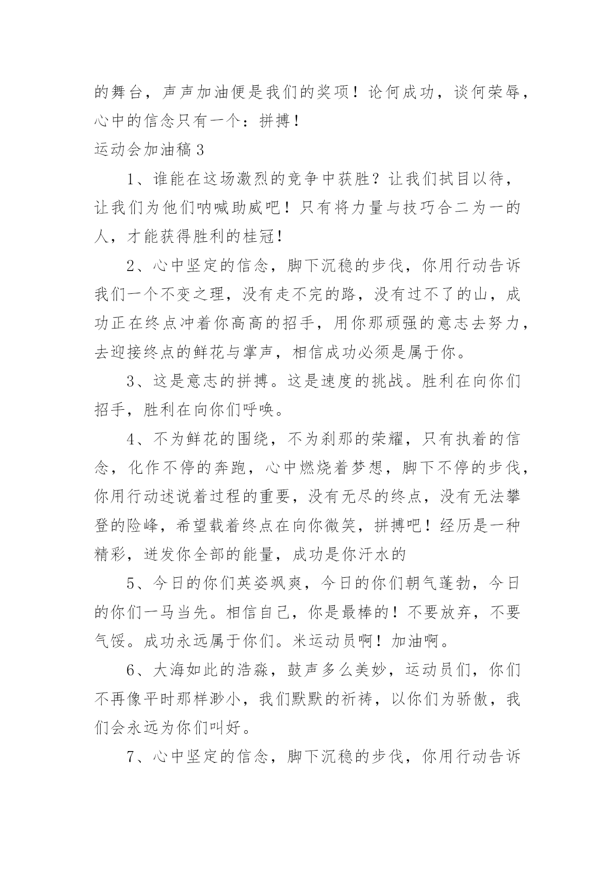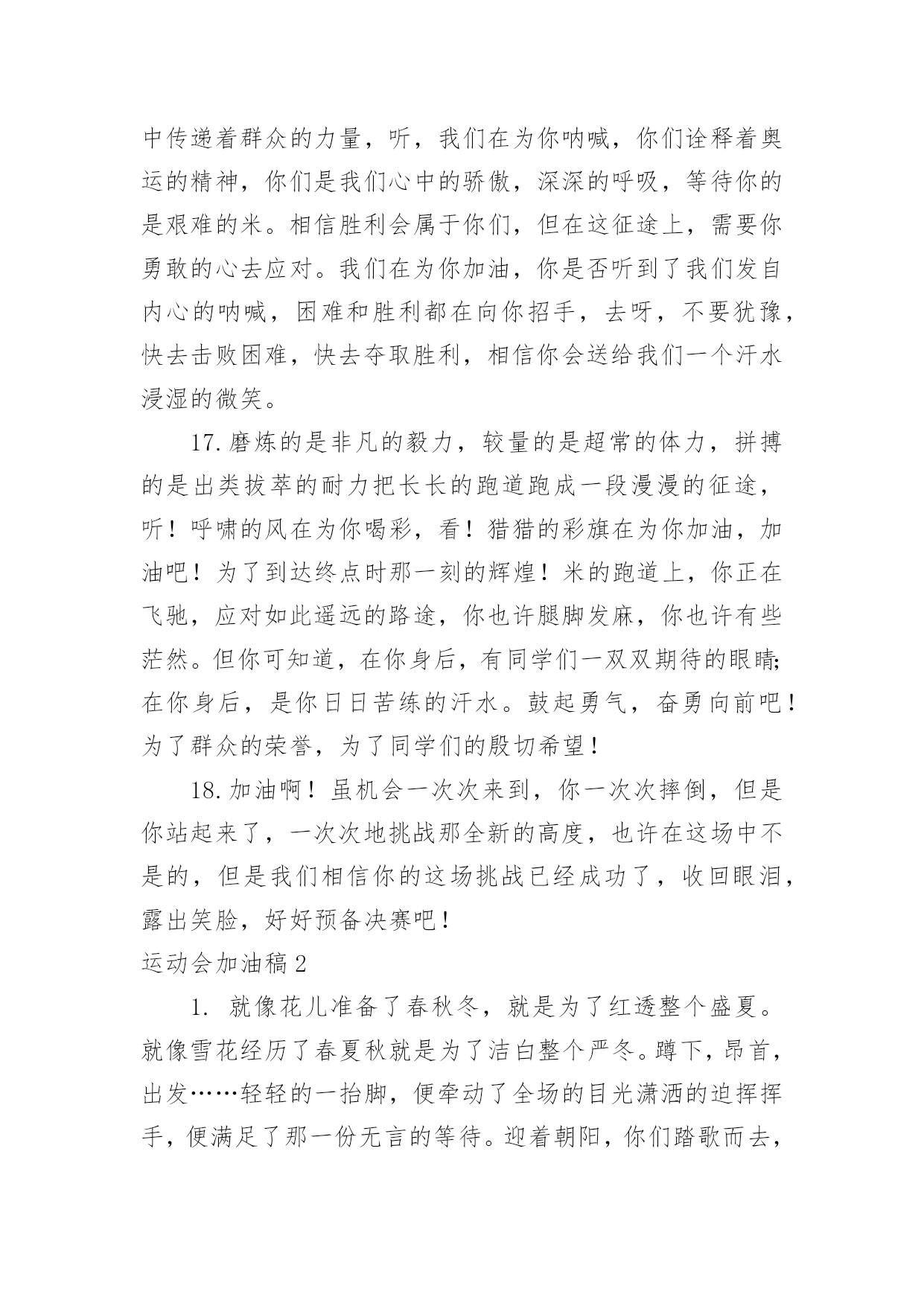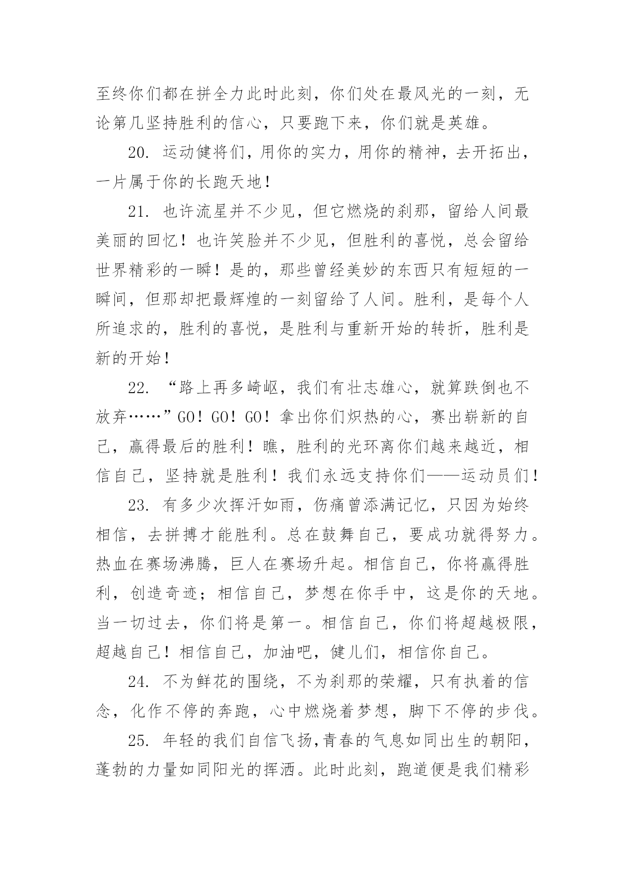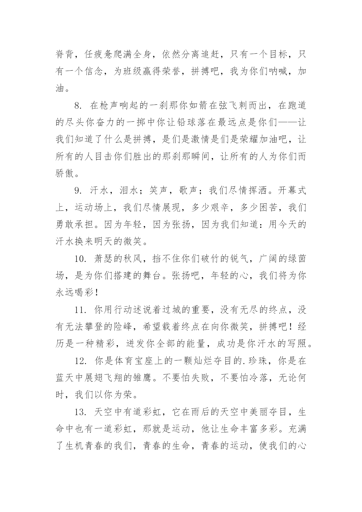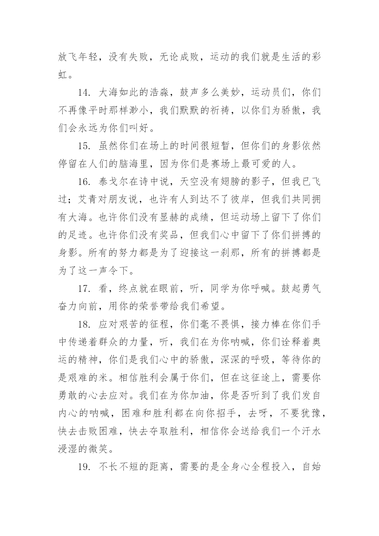 运动会加油稿运动会加油稿在社会发展不断提速的今天,各种加油稿频频出现,加油稿是用于给别人加油鼓气,提升别人气势的文稿。你所见过的加油稿是什么样的呢?以下是小编整理的运动会加油稿,希望能够帮助到大家。运动会加油稿11.踏上跑道,是一种选择。离开起点,是一种勇气。驰骋赛场,是一种胜利。运动健将们,用你的实力,用你的精神,去开拓出,一片属于你的长跑天地!2.漫漫长路,你愿一人独撑,忍受着孤独与寂寞,承受着体力与精神的压迫,只任汗水溶于泪水,可脚步却从不停歇。好样的,纵然得不了桂冠,可坚持的你,定会赢得最后的掌声。3.场上英姿显自豪,脚下步伐在飞奔。你们是骄傲。你们是自豪,跑道因你幻彩,应对红色跑道,你们挥洒自如,不惧一切冲向重点。4.面对艰苦的征程,你们毫不畏惧,接力棒在你们手中传递着集体的力量,听,我们在为你呐喊,你们诠释着奥运的精神,你们是我们心中的骄傲。相信胜利会属于你们,但在这征途上,需要你勇敢的心去面对。我们在为你加油,你是否听到了我们发自内心的呐喊,困难和胜利都在向你招手,去呀,不要犹豫,快去击败困难,快去夺取胜利。5.热情地释放光芒的红日,被阵阵此起彼伏的加油声震撼,慌张地投入到乌云的怀抱那群北飞的候鸟却因为热火朝天的场面而盘旋在运动场上,留恋着那里与寂静的天空截然不一样的热闹围绕在运动场边的树木,在秋风的频繁光顾下奏鸣出悦耳的树叶的交响曲,仿佛是为了配合场上的拉拉队,为奋斗的运动员们加油鼓劲。6.萧瑟的秋风,挡不住你们破竹的锐气。7.这是意志的拼搏。这是速度的挑战。胜利在向你们招手,胜利在向你们呼唤。不为鲜花的围绕,不为刹那的荣耀,只有执着的信念,化作不停的奔跑,为班级的荣誉而战,你们是最棒的!8.你在红色的跑道上撒下了努力的汗水,献进了你的风采,固然你没有获得第一,但是有那默默的奉献就已经足够了,希望在下一个比赛能取得好成绩。我们会为你加油的。9.超越对手,超越自我,是我们的目标,是我们的信念,在清凉的初冬,在喧嚣的田径场上。你们点燃了似火的`热情,无论成败,我们都为你们感到自豪,你们永远是我们的骄傲!10.年轻的我们自信飞扬,青春的气息如同出生的朝阳,蓬勃的力量如同阳光的挥洒。此时此刻,跑道便是我们精彩的舞台,声声加油便是我们的奖项!论何成功,谈何荣辱,心中的信念只有一个:拼搏!萧瑟的秋风,挡不住你们破竹的锐气,广阔的绿茵场,是为你们搭建的舞台。张扬吧,年轻的心,我们将为你永远喝彩!11.然而这迷人的春在今日更加迷人,不是因为它的生机勃勃,也不是因为它的明媚阳光,是因为今日的人儿倍加精神气爽。看!运动场上那一幕幕,一股股,无论是哭是笑,市喜是悲,其中都融入了他们的汗水辛劳。他们是真正的矫健者,是运动场上的骄儿,更是我们心中的英雄。加油吧!英雄们!12.坚定,执着,耐力与希望,在延伸的白色跑道中点点凝聚!力量,信念,拼搏与奋斗,在遥远的终点线上渐渐明亮!时代的强音正在你的脚下踏响。13.天空中有道彩虹,它在雨后的天空中美丽夺目,生命中也有一道彩虹,那就是运动,他让生命丰富多彩。充满了生机青春的我们,青春的生命,青春的运动,使我们的心放飞年轻,没有失败,无论成败,运动的我们就是生活的彩虹。14.年轻的我们自信飞扬,青春的气息如同出生的朝阳,蓬勃的力量如同阳光的挥洒。此时此刻,跑道便是我们精彩的舞台,声声加油便是我们的奖项!论何成功,谈何荣辱,心中的信念只有一个:拼搏奋斗!15.不长不短的距离,需要的是全身心全程投入,自始至终你们都在拼全力此时此刻,你们处在最风光的一刻,无论第几坚持胜利的信心,只要跑下来,你们就是英雄。16.应对艰苦的征程,你们毫不畏惧,接力棒在你们手中传递着群众的力量,听,我们在为你呐喊,你们诠释着奥运的精神,你们是我们心中的骄傲,深深的呼吸,等待你的是艰难的米。相信胜利会属于你们,但在这征途上,需要你勇敢的心去应对。我们在为你加油,你是否听到了我们发自内心的呐喊,困难和胜利都在向你招手,去呀,不要犹豫,快去击败困难,快去夺取胜利,相信你会送给我们一个汗水浸湿的微笑。17.磨炼的是非凡的毅力,较量的是超常的体力,拼搏的是出类拔萃的耐力把长长的跑道跑成一段漫漫的征途,听!呼啸的风在为你喝彩,看!猎猎的彩旗在为你加油,加油吧!为了到达终点时那一刻的辉煌!米的跑道上,你正在飞驰,应对如此遥远的路途,你也许腿脚发麻,你也许有些茫然。但你可知道,在你身后,有同学们一双双期待的眼睛;在你身后,是你日日苦练的汗水。鼓起勇气,奋勇向前吧!为了群众的荣誉,为了同学们的殷切希望!18.加油啊!虽机会一次次来到,你一次次摔倒,但是你站起来了,一次次地挑战那全新的高度,也许在这场中不是的,但是我们相信你的这场挑战已经成功了,收回眼泪,露出笑脸,好好预备决赛吧!运动会加油稿21.就像花儿准备了春秋冬,就是为了红透整个盛夏