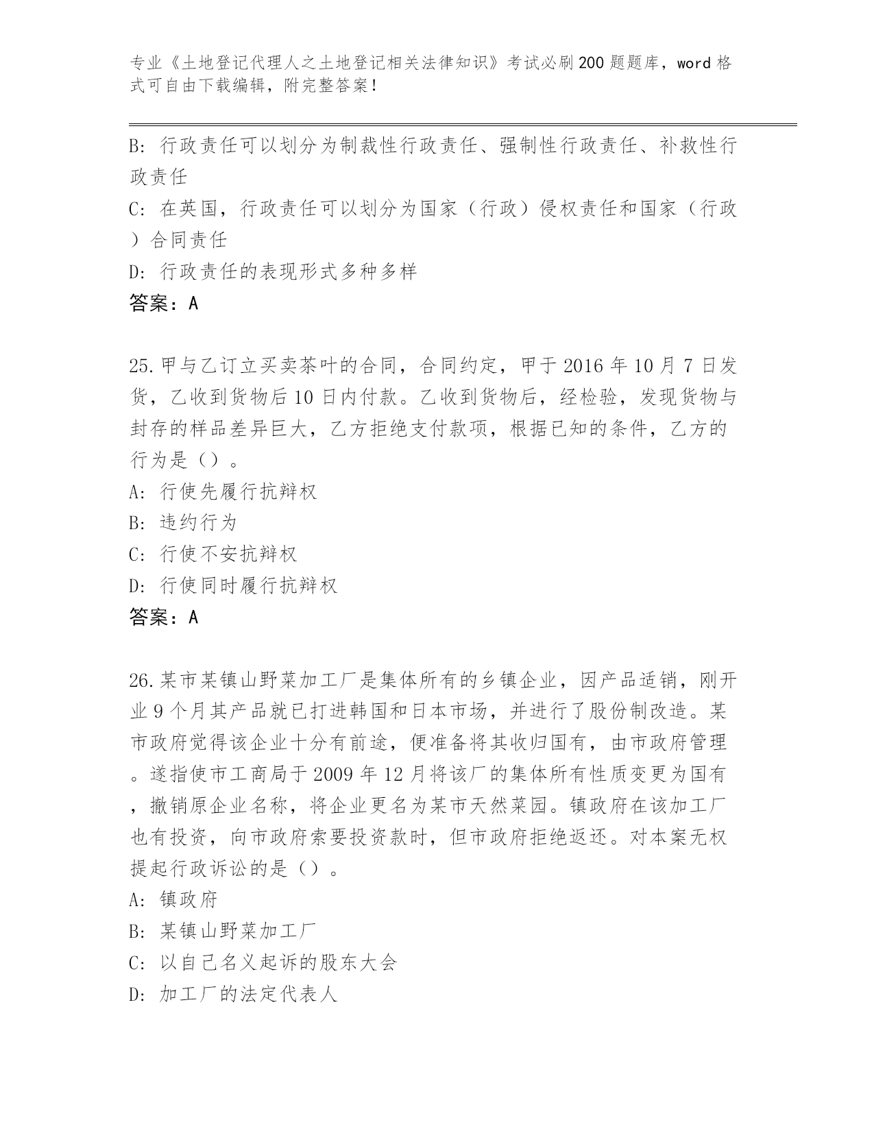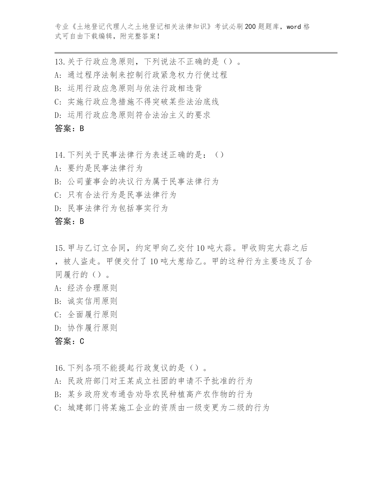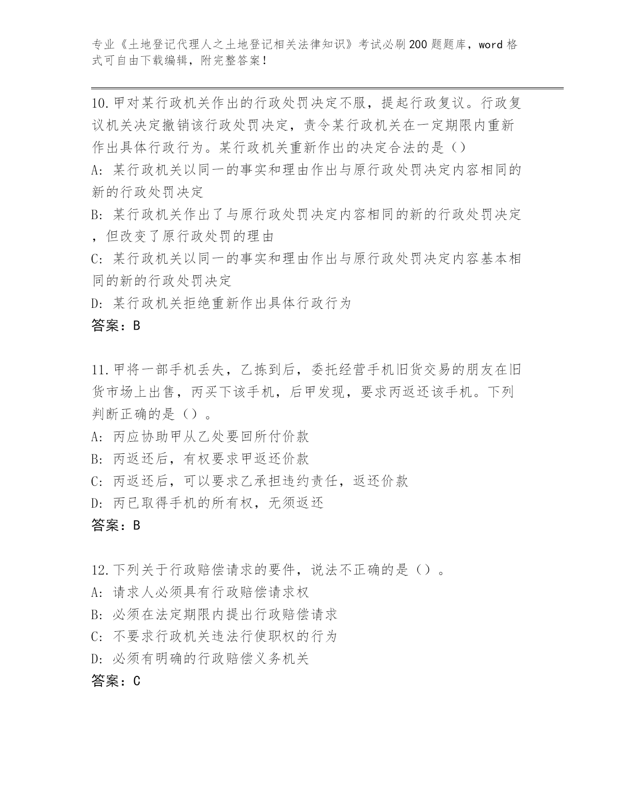 2024黑龙江省泰来县《土地登记代理人之土地登记相关法律知识》资格考试必刷200题真题(网校专用)