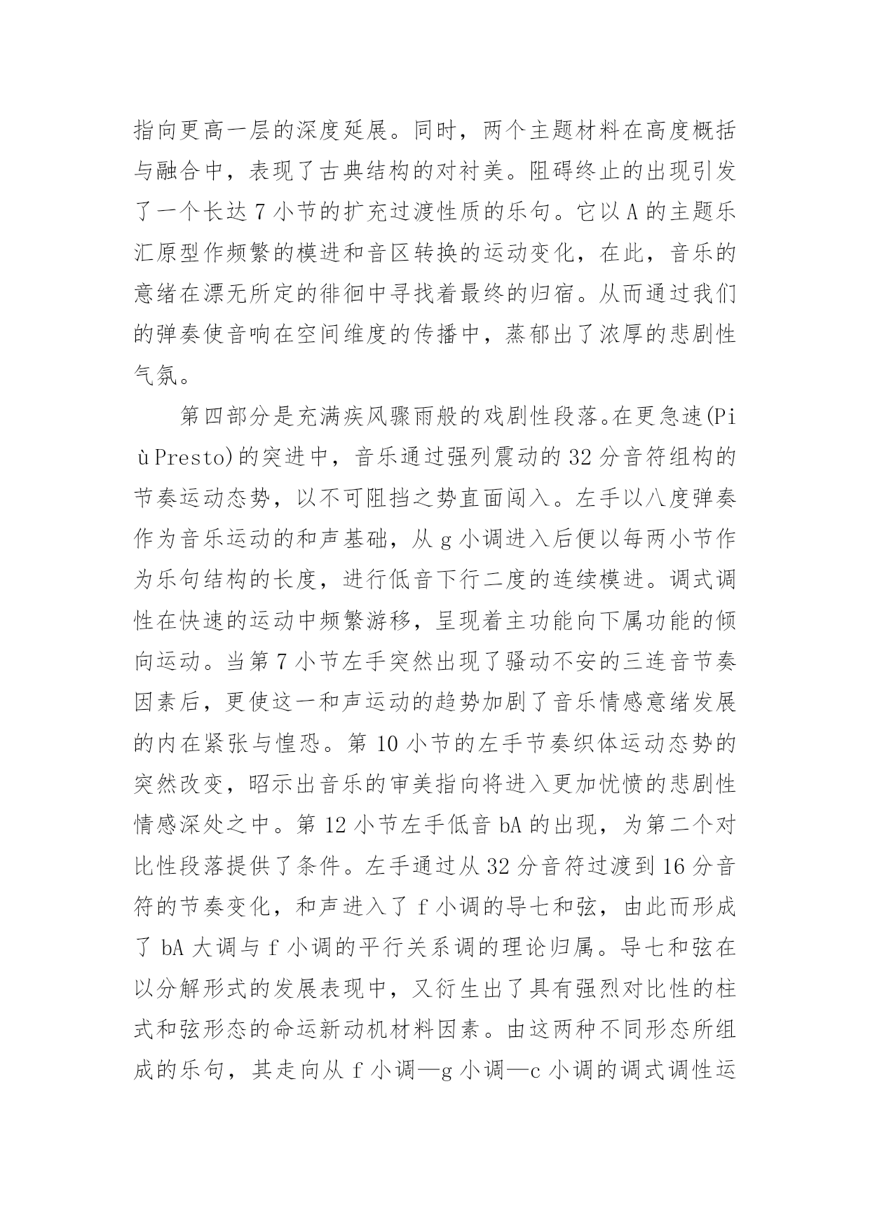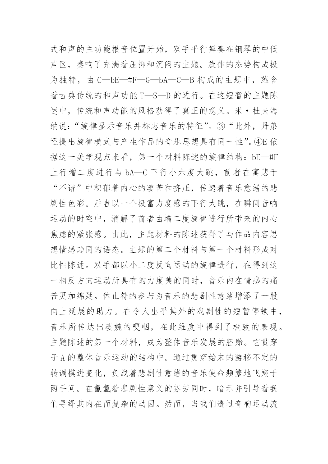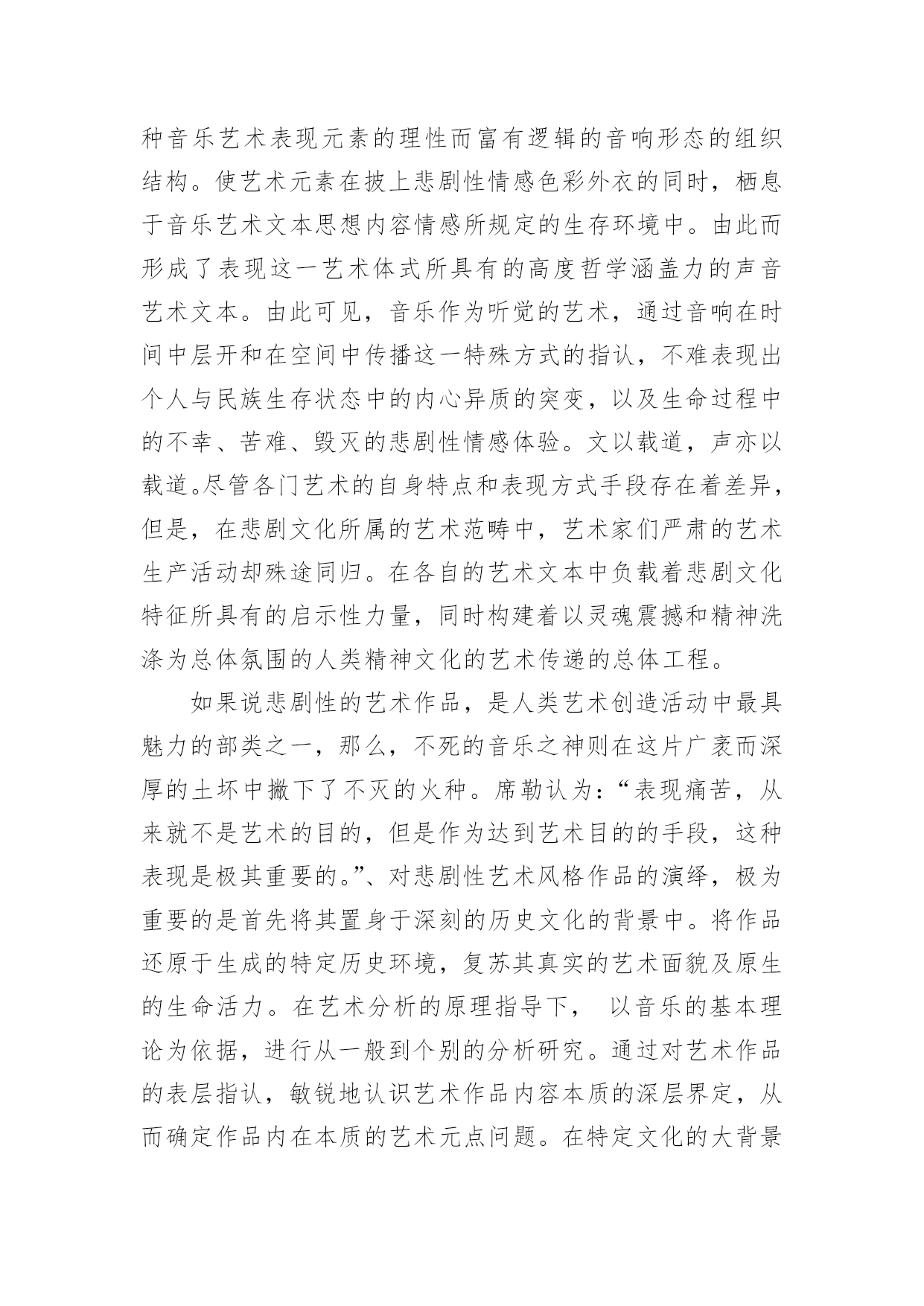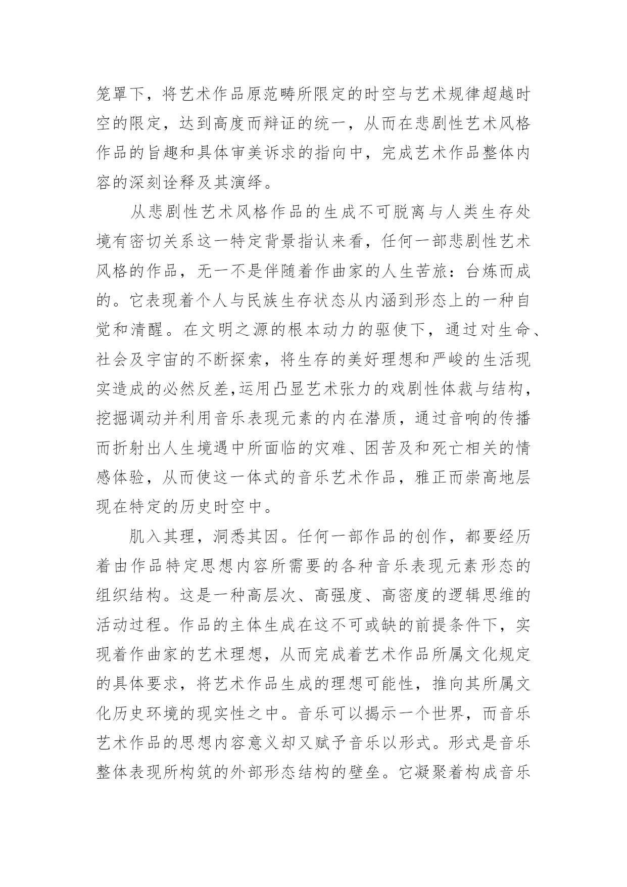 对悲剧性艺术风格作品的演绎探寻艺术论文对悲剧性艺术风格作品的演绎探寻艺术论文悲剧性艺术风格的作品,是音乐艺术文化整体形态中的一种特殊的艺术现象,是人类精神文化事象及人类心灵情感生活,在音乐艺术文化领域中的具体反映。从文化历史的深层背景看,它应归属悲剧文化这一庞大的艺术范畴,是人类精神文化在历史的沿袭与传承的深厚积淀中,所衍生出的一种必然形式。如果以一元探求悲剧文化现象的客观存在,那么,我们所获得的却是这一文化现象存在的多元形态的表现。它表现为:宗教领域中的献祭牺牲;艺术领域里的歌诵乐舞;文学领域中的诗文和剧本等。在这种多元形态并存的文化艺术范畴中,显而易见,唯有文学与戏剧可以得天独厚地凭借语言文字这一媒质材料,完成悲剧文化艺术作品的创作活动。通过对人物艺术形象及其事件整体细节的描述,表现人类与自然搏斗、与生命周旋、与邪恶较量中情感震撼的生动具象,从而形成精神外化形态的艺术文本。然而,由于音乐艺术自身规律与特性使然,它不可与文学、戏剧的表现形态趋同。因此,其艺术创作活动深处于这一共同文化归属的范畴中,凭借声音作为媒质的物质材料,通过作曲家在主观性融入可听的材料客观性之中,完成着多种音乐艺术表现元素的理性而富有逻辑的音响形态的组织结构。使艺术元素在披上悲剧性情感色彩外衣的同时,栖息于音乐艺术文本思想内容情感所规定的生存环境中。由此而形成了表现这一艺术体式所具有的高度哲学涵盖力的声音艺术文本。由此可见,音乐作为听觉的艺术,通过音响在时间中层开和在空间中传播这一特殊方式的指认,不难表现出个人与民族生存状态中的内心异质的突变,以及生命过程中的不幸、苦难、毁灭的悲剧性情感体验。文以载道,声亦以载道。尽管各门艺术的自身特点和表现方式手段存在着差异,但是,在悲剧文化所属的艺术范畴中,艺术家们严肃的艺术生产活动却殊途同归。在各自的艺术文本中负载着悲剧文化特征所具有的启示性力量,同时构建着以灵魂震撼和精神洗涤为总体氛围的人类精神文化的艺术传递的总体工程。如果说悲剧性的艺术作品,是人类艺术创造活动中最具魅力的部类之一,那么,不死的音乐之神则在这片广袤而深厚的土坏中撇下了不灭的火种。席勒认为:“表现痛苦,从来就不是艺术的目的,但是作为达到艺术目的的手段,这种表现是极其重要的。”、对悲剧性艺术风格作品的演绎,极为重要的是首先将其置身于深刻的历史文化的背景中。将作品还原于生成的特定历史环境,复苏其真实的艺术面貌及原生的生命活力。在艺术分析的原理指导下,以音乐的基本理论为依据,进行从一般到个别的分析研究。通过对艺术作品的表层指认,敏锐地认识艺术作品内容本质的深层界定,从而确定作品内在本质的艺术元点问题。在特定文化的大背景笼罩下,将艺术作品原范畴所限定的时空与艺术规律超越时空的限定,达到高度而辩证的统一,从而在悲剧性艺术风格作品的旨趣和具体审美诉求的指向中,完成艺术作品整体内容的深刻诠释及其演绎。从悲剧性艺术风格作品的生成不可脱离与人类生存处境有密切关系这一特定背景指认来看,任何一部悲剧性艺术风格的作品,无一不是伴随着作曲家的人生苦旅:台炼而成的。它表现着个人与民族生存状态从内涵到形态上的一种自觉和清醒。在文明之源的根本动力的驱使下,通过对生命、社会及宇宙的不断探索,将生存的美好理想和严峻的生活现实造成的必然反差,运用凸显艺术张力的戏剧性体裁与结构,挖掘调动并利用音乐表现元素的内在潜质,通过音响的传播而折射出人生境遇中所面临的灾难、困苦及和死亡相关的情感体验,从而使这一体式的音乐艺术作品,雅正而崇高地层现在特定的历史时空中。肌入其理,洞悉其因。任何一部作品的创作,都要经历着由作品特定思想内容所需要的各种音乐表现元素形态的组织结构。这是一种高层次、高强度、高密度的逻辑思维的活动过程。作品的主体生成在这不可或缺的前提条件下,实现着作曲家的艺术理想,从而完成着艺术作品所属文化规定的具体要求,将艺术作品生成的理想可能性,推向其所属文化历史环境的现实性之中。音乐可以揭示一个世界,而音乐艺术作品的思想内容意义却又赋予音乐以形式。形式是音乐整体表现所构筑的外部形态结构的壁垒。它凝聚着构成音乐的各种元素从外部的组织到内部结构细节关系的总和。当作曲家的技能技巧作用于这些元素的建构时,作品的音响组织结构所表现出的艺术风格特征,则由表及里地得到了实现。这种艺术风格特征的形成保证了作品音响运动体系的整体功能,在围绕着作品思想情感内容的核心发展变化中的意义的实现。悲剧性艺术风格的音乐特征,显著表现为音响运动形式,在作品的体裁结构布局的陈设中,负载着节奏、旋律、力度、音色艺术元素表现的自身生命力。同时又赋予复调、和声、调式调性艺术表现元素以情感色彩。在特定的悲剧性音乐意绪构成的文化语境中,集诸多艺术表现元素于一体,使之成为与艺术文本不离不弃的音响运动的核心系统。在秉承着音乐艺术的美