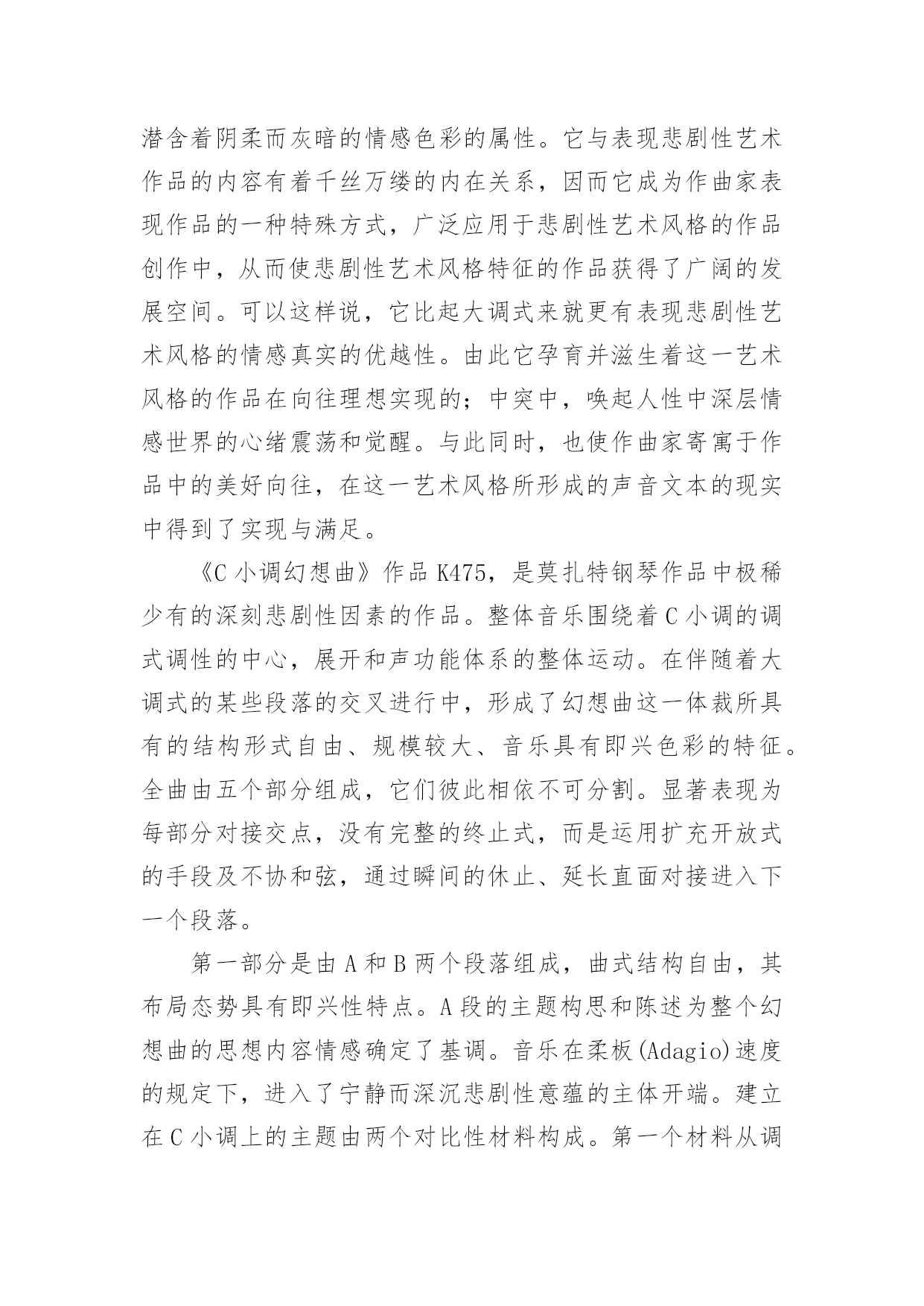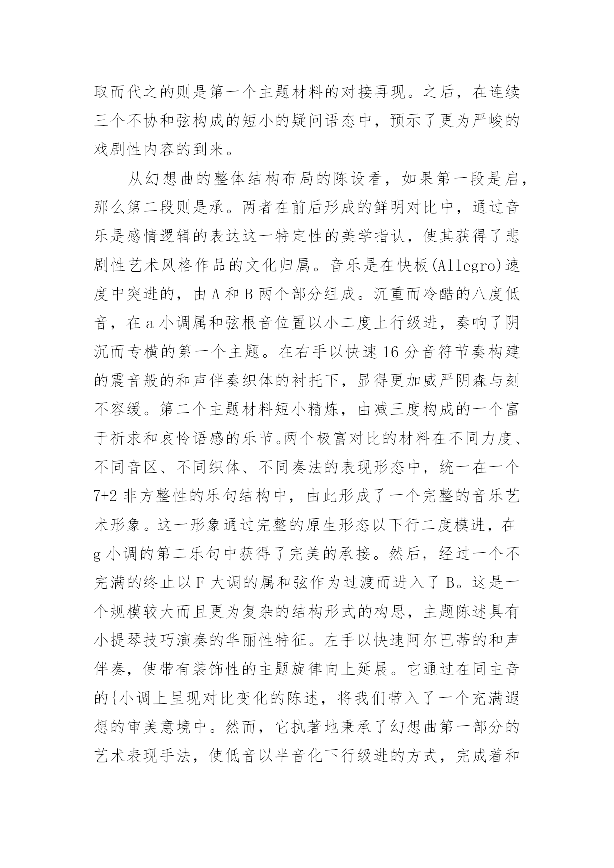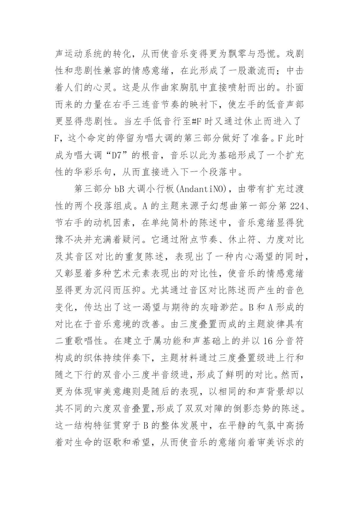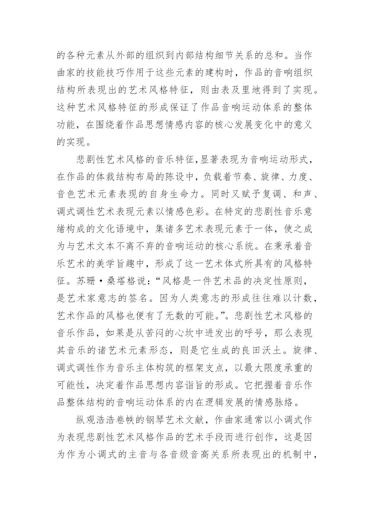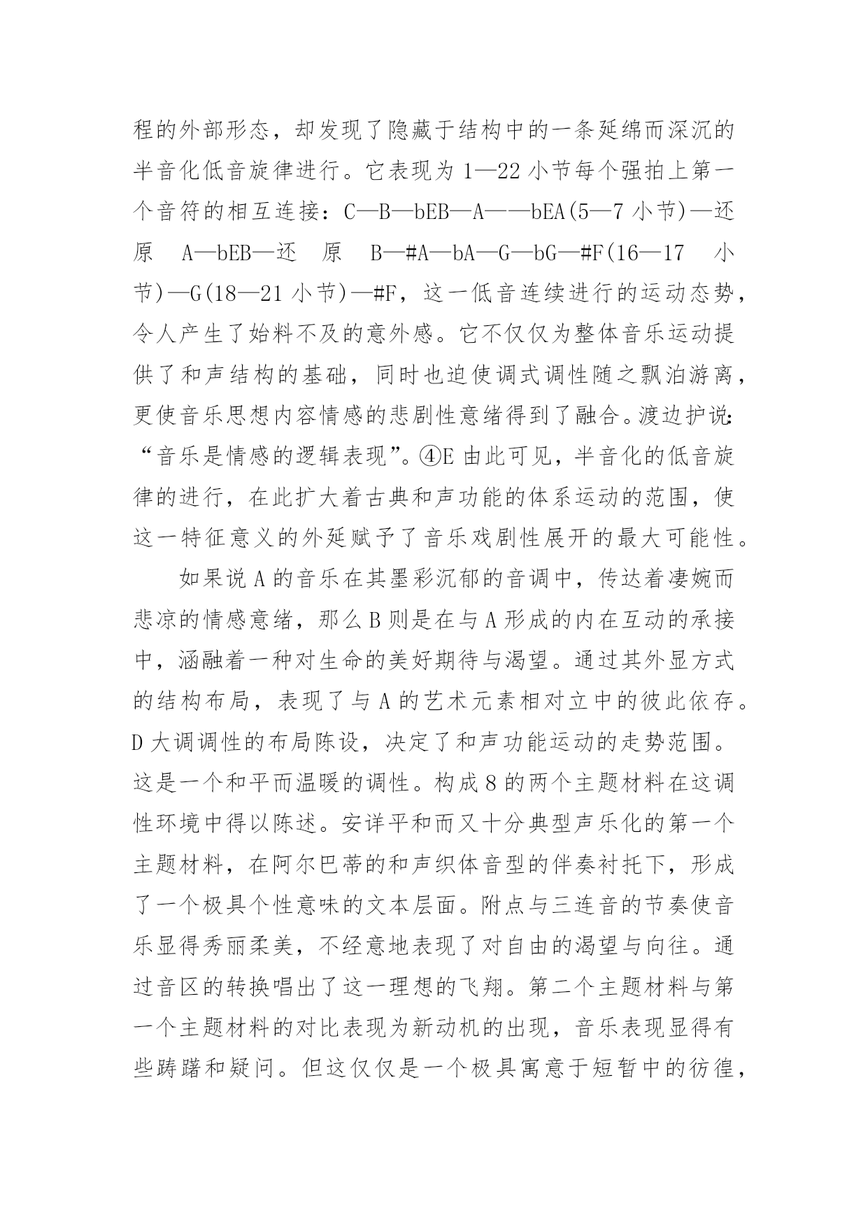 对悲剧性艺术风格作品的演绎探寻艺术论文对悲剧性艺术风格作品的演绎探寻艺术论文悲剧性艺术风格的作品,是音乐艺术文化整体形态中的一种特殊的艺术现象,是人类精神文化事象及人类心灵情感生活,在音乐艺术文化领域中的具体反映。从文化历史的深层背景看,它应归属悲剧文化这一庞大的艺术范畴,是人类精神文化在历史的沿袭与传承的深厚积淀中,所衍生出的一种必然形式。如果以一元探求悲剧文化现象的客观存在,那么,我们所获得的却是这一文化现象存在的多元形态的表现。它表现为:宗教领域中的献祭牺牲;艺术领域里的歌诵乐舞;文学领域中的诗文和剧本等。在这种多元形态并存的文化艺术范畴中,显而易见,唯有文学与戏剧可以得天独厚地凭借语言文字这一媒质材料,完成悲剧文化艺术作品的创作活动。通过对人物艺术形象及其事件整体细节的描述,表现人类与自然搏斗、与生命周旋、与邪恶较量中情感震撼的生动具象,从而形成精神外化形态的艺术文本。然而,由于音乐艺术自身规律与特性使然,它不可与文学、戏剧的表现形态趋同。因此,其艺术创作活动深处于这一共同文化归属的范畴中,凭借声音作为媒质的物质材料,通过作曲家在主观性融入可听的材料客观性之中,完成着多种音乐艺术表现元素的理性而富有逻辑的音响形态的组织结构。使艺术元素在披上悲剧性情感色彩外衣的同时,栖息于音乐艺术文本思想内容情感所规定的生存环境中。由此而形成了表现这一艺术体式所具有的高度哲学涵盖力的声音艺术文本。由此可见,音乐作为听觉的艺术,通过音响在时间中层开和在空间中传播这一特殊方式的指认,不难表现出个人与民族生存状态中的内心异质的突变,以及生命过程中的不幸、苦难、毁灭的悲剧性情感体验。文以载道,声亦以载道。尽管各门艺术的自身特点和表现方式手段存在着差异,但是,在悲剧文化所属的艺术范畴中,艺术家们严肃的艺术生产活动却殊途同归。在各自的艺术文本中负载着悲剧文化特征所具有的启示性力量,同时构建着以灵魂震撼和精神洗涤为总体氛围的人类精神文化的艺术传递的总体工程。如果说悲剧性的艺术作品,是人类艺术创造活动中最具魅力的部类之一,那么,不死的音乐之神则在这片广袤而深厚的土坏中撇下了不灭的火种。席勒认为:“表现痛苦,从来就不是艺术的目的,但是作为达到艺术目的的手段,这种表现是极其重要的。”、对悲剧性艺术风格作品的演绎,极为重要的是首先将其置身于深刻的历史文化的背景中。将作品还原于生成的特定历史环境,复苏其真实的艺术面貌及原生的生命活力。在艺术分析的原理指导下,以音乐的基本理论为依据,进行从一般到个别的分析研究。通过对艺术作品的表层指认,敏锐地认识艺术作品内容本质的深层界定,从而确定作品内在本质的艺术元点问题。在特定文化的大背景笼罩下,将艺术作品原范畴所限定的时空与艺术规律超越时空的限定,达到高度而辩证的统一,从而在悲剧性艺术风格作品的旨趣和具体审美诉求的指向中,完成艺术作品整体内容的深刻诠释及其演绎。从悲剧性艺术风格作品的生成不可脱离与人类生存处境有密切关系这一特定背景指认来看,任何一部悲剧性艺术风格的作品,无一不是伴随着作曲家的人生苦旅:台炼而成的。它表现着个人与民族生存状态从内涵到形态上的一种自觉和清醒。在文明之源的根本动力的驱使下,通过对生命、社会及宇宙的不断探索,将生存的美好理想和严峻的生活现实造成的必然反差,运用凸显艺术张力的戏剧性体裁与结构,挖掘调动并利用音乐表现元素的内在潜质,通过音响的传播而折射出人生境遇中所面临的灾难、困苦及和死亡相关的情感体验,从而使这一体式的音乐艺术作品,雅正而崇高地层现在特定的历史时空中。肌入其理,洞悉其因。任何一部作品的创作,都要经历着由作品特定思想内容所需要的各种音乐表现元素形态的组织结构。这是一种高层次、高强度、高密度的逻辑思维的活动过程。作品的主体生成在这不可或缺的前提条件下,实现着作曲家的艺术理想,从而完成着艺术作品所属文化规定的具体要求,将艺术作品生成的理想可能性,推向其所属文化历史环境的现实性之中。音乐可以揭示一个世界,而音乐艺术作品的思想内容意义却又赋予音乐以形式。形式是音乐整体表现所构筑的外部形态结构的壁垒。它凝聚着构成音乐的各种元素从外部的组织到内部结构细节关系的总和。当作曲家的技能技巧作用于这些元素的建构时,作品的音响组织结构所表现出的艺术风格特征,则由表及里地得到了实现。这种艺术风格特征的形成保证了作品音响运动体系的整体功能,在围绕着作品思想情感内容的核心发展变化中的意义的实现。悲剧性艺术风格的音乐特征,显著表现为音响运动形式,在作品的体裁结构布局的陈设中,负载着节奏、旋律、力度、音色艺术元素表现的自身生命力。同时又赋予复调、和声、调式调性艺术表现元素以情感色彩。在特定的悲剧性音乐意绪构成的文化语境中,集诸多艺术表现元素于一体,使之成为与艺术文本不离不弃的音响运动的核心系统。在秉承着音乐艺术的美
