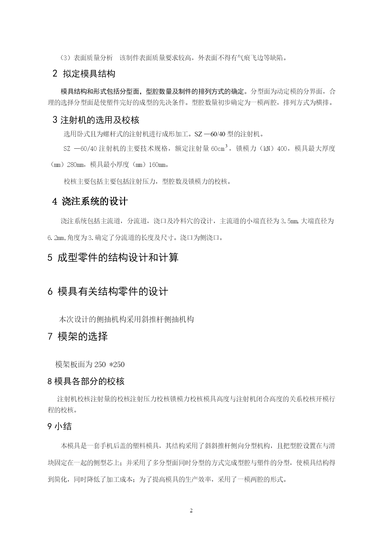 PAGEPAGE3电源插座面板的注塑模设计摘要:注射成型是热塑性塑料成型的主要方法之一,可以成型形状复杂的精密塑件。手机业的快速发展要求手机外壳快速更新。本次设计的制品为PA66手机外壳注塑模设计,利用UG来完成制品模三维模型,利用CAD来完成其装配图和零件图。模具采用了侧抽芯,使塑件能更好的脱模。采用侧浇口,利用直导柱导向,推杆顶料。最后对模具结构与注塑机的匹配进行了校核。模具结构紧凑,工作可靠,操作方便,运转平稳,冷却效果好,劳动强度低,生产效率高,生产的塑件精度高,生产成本低。本文从型腔数量和布局的确定,注塑机选择,流道的设计,模板及其标准件的选用,冷却系统,成型部件的设计等给出了详细的设计过程。关键字:塑料,注塑模,UG,CAD,侧抽芯SocketpanelDesignOfInjectionMoldPA66TRACT:Thermoplasticinjectionmoldingistheprimarymeansofformingone,youcanshapetheshapeofcomplexprecisionplasticparts.Therapiddevelopmentofmobilephoneindustrydemandsquicklyupdatethephoneshell.TheproductsdesignedforinjectionmoldPA66shellmobilephonedesign,theuseofUGtocompletethethree-dimensionalmodelofmoduleproducts,theuseofCADtocompletetheassemblydrawingandpartsofitsplan.Asidemoldcore-pulling,sothatplasticpartscanbeabetterrelease.Usingthesidegate,.Guidetheuseofdirectcolumn-oriented,puttingthetopmaterial.Finally,thestructureofthemoldinjectionmoldingmachinewithamatchingcheck.Diecompact,reliable,easytooperate,thefunctioningofasmooth,coolingeffect,andlowlaborintensity,productionefficiency,productionofplasticpartsandhighprecision,lowcostofproduction.Thisarticlefromthecavitytodeterminethenumberandlayout,choiceofinjectionmoldingmachine,flowchanneldesign,templatesandtheselectionofstandardparts,coolingsystems,formingpartofthedesignisgivenadetaileddesignprocessKeywords:plastic,injection,mold,UG,CAD,sidecorepulling1塑料材料及塑件几何形状ABS塑料表面极易吸潮,使成型塑件表面出现斑痕、云纹等缺陷,为此成型前必须进行干澡外理;ABS树脂中含有三种组分,分别为丙烯腈,丁二烯,苯乙烯,它们不是固定不变的,可以根据需要调整它们的配比,以获得所要求的性能。(1)结构分析轮廓尺寸较小,属于机构较复杂的小型件。(2)尺寸精度分析该制品尺寸较小,一般精度等级。(3)表面质量分析该制件表面质量要求较高,外表面不得有气痕飞边等缺陷。2拟定模具结构模具结构和形式包括分型面,型腔数量及制件的排列方式的确定。分型面为动定模的分界面,合理的选择分型面是使塑件完好的成型的先决条件。型腔数量初步确定为一模两腔,排列方式为横排。3注射机的选用及校核选用卧式且为螺杆式的注射机进行成形加工。SZ—60/40型的注射机。SZ—60/40注射机的主要技术规格,额定注射量60cm,锁模力(kN)400,模具最大厚度(mm)280mm,模具最小厚度(mm)160mm。校核主要包括主要包括注射压力,型腔数及锁模力的校核。4浇注系统的设计浇注系统包括主流道,分流道,浇口及冷料穴的设计,主流道的小端直径为3.5mm.大端直径为6.2mm,角度为3.确定了分流道的长度及尺寸。浇口为侧浇口。5成型零件的结构设计和计算6模具有关结构零件的设计本次设计的侧抽机构采用斜推杆侧抽机构7模架的选择模架板面为250*2508模