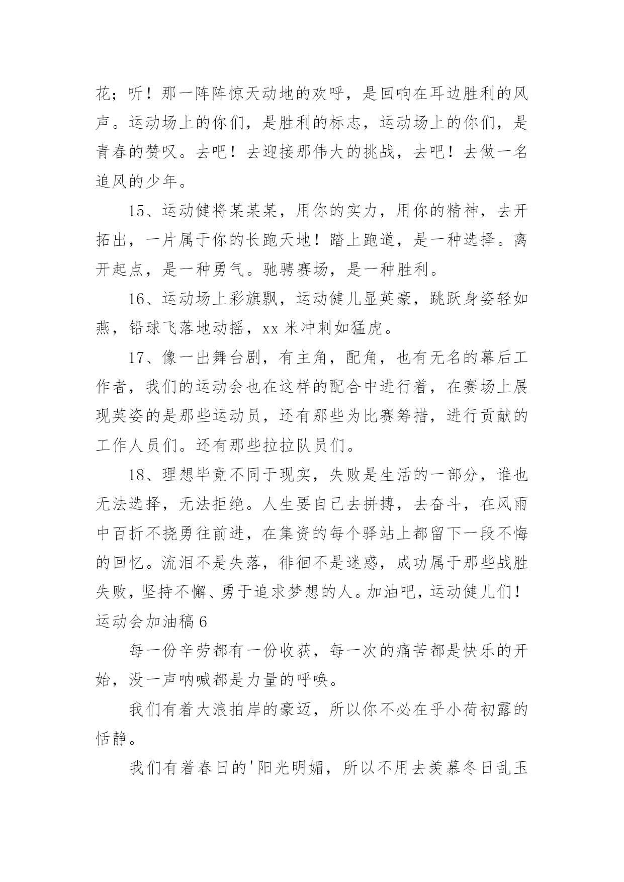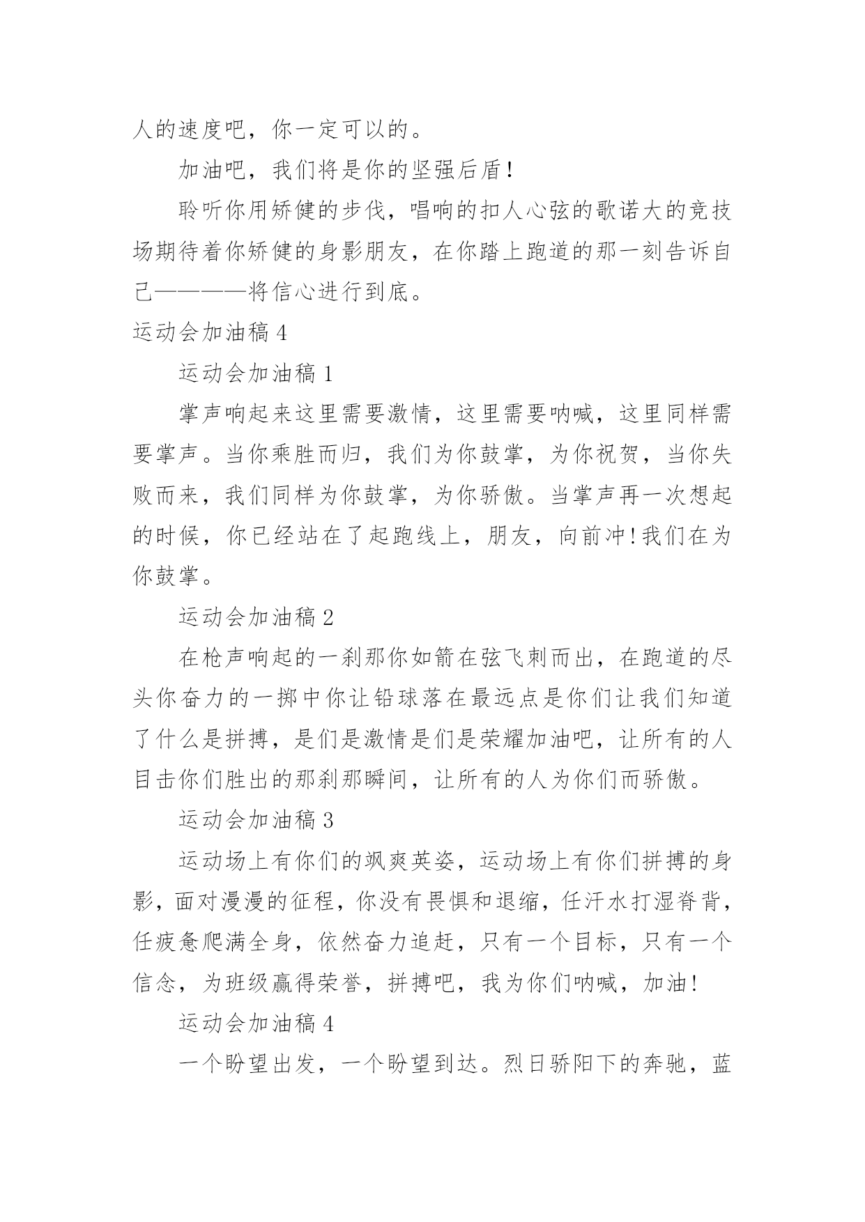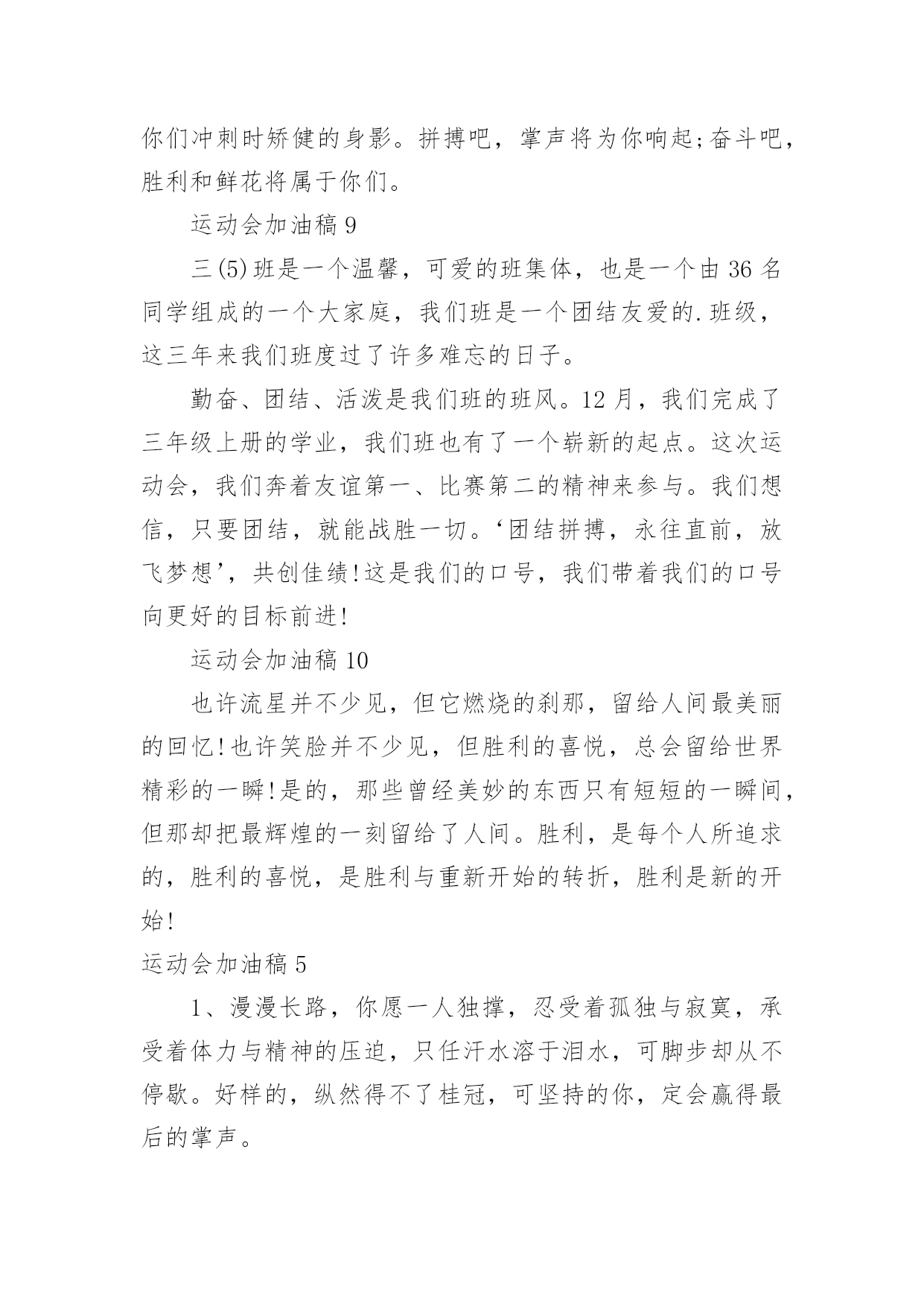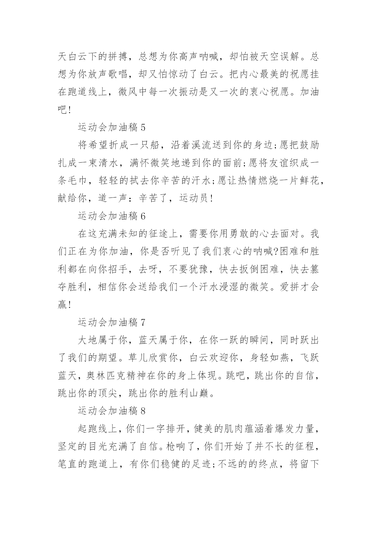 运动会加油稿运动会加油稿在社会一步步向前发展的今天,越来越多地方需要用到加油稿,加油稿有着正向的鼓动作用。为了让您在写加油稿时更加简单方便,以下是小编为大家收集的运动会加油稿,欢迎阅读与收藏。运动会加油稿1你们快如离弦之箭;疾似撒疆野马;你们的速度让我们惊叹;你们的精神让我们钦佩;流汗千日,只为今日一搏;疾踏百步,只为终点一触;胜利再向你微笑;成功在向你招手;加油啊!健儿们!运动会加油稿2鲤鱼把龙门定为梦想的高度;雄鹰把苍穹定为梦想的高度。此刻面前的那根横杆,便是你梦想的高度。纵身的一跃,画出的.却是世界上最美的弧度。一厘米的距离,此刻却因为你而变得非比寻常。越过去,杆的后面是另一个天堂。运动会加油稿3那雪白的起跑线,凝聚了你数的辛酸与汗水。那800米的跑道对你来说是那么漫长,但你知道:你只有努力去拼搏,去战胜自己!奔跑在赛道的你,这几天我们学校举办了一场运动会。今天下午马上就开始接力赛了,接力赛是考验集体团结的,我相信我们班的同学,一定能取得很好的成绩!请放飞你的心,释放你的自信。你的眼睛会展现一切,要正视对方。你的'英气将会压倒一切,你的对手会在你自信的脚步下败下阵来!既然力量在冲荡,不在乎汗水和泪水,因为你心里有一种坚定的信念,那么不要吝啬,努力地奔跑吧!就在激昂的喊声中,运动员们接受了依次次的挑战,依次次超越了自我。他们以自己的行动,充分展现了自己的实力,展现了真我的风采,展现了自己的坚强拼搏的精神。短短的60米承载的是你所有的努力,向大家展示你惊人的速度吧,你一定可以的。加油吧,我们将是你的坚强后盾!聆听你用矫健的步伐,唱响的扣人心弦的歌诺大的竞技场期待着你矫健的身影朋友,在你踏上跑道的那一刻告诉自己————将信心进行到底。运动会加油稿4运动会加油稿1掌声响起来这里需要激情,这里需要呐喊,这里同样需要掌声。当你乘胜而归,我们为你鼓掌,为你祝贺,当你失败而来,我们同样为你鼓掌,为你骄傲。当掌声再一次想起的时候,你已经站在了起跑线上,朋友,向前冲!我们在为你鼓掌。运动会加油稿2在枪声响起的一刹那你如箭在弦飞刺而出,在跑道的尽头你奋力的一掷中你让铅球落在最远点是你们让我们知道了什么是拼搏,是们是激情是们是荣耀加油吧,让所有的人目击你们胜出的那刹那瞬间,让所有的人为你们而骄傲。运动会加油稿3运动场上有你们的飒爽英姿,运动场上有你们拼搏的身影,面对漫漫的征程,你没有畏惧和退缩,任汗水打湿脊背,任疲惫爬满全身,依然奋力追赶,只有一个目标,只有一个信念,为班级赢得荣誉,拼搏吧,我为你们呐喊,加油!运动会加油稿4一个盼望出发,一个盼望到达。烈日骄阳下的奔驰,蓝天白云下的拼搏,总想为你高声呐喊,却怕被天空误解。总想为你放声歌唱,却又怕惊动了白云。把内心最美的祝愿挂在跑道线上,微风中每一次振动是又一次的衷心祝愿。加油吧!运动会加油稿5将希望折成一只船,沿着溪流送到你的身边;愿把鼓励扎成一束清水,满怀微笑地递到你的面前;愿将友谊织成一条毛巾,轻轻的拭去你辛苦的汗水;愿让热情燃烧一片鲜花,献给你,道一声:辛苦了,运动员!运动会加油稿6在这充满未知的征途上,需要你用勇敢的心去面对。我们正在为你加油,你是否听见了我们衷心的呐喊?困难和胜利都在向你招手,去呀,不要犹豫,快去扳倒困难,快去篡夺胜利,相信你会送给我们一个汗水浸湿的微笑。爱拼才会赢!运动会加油稿7大地属于你,蓝天属于你,在你一跃的瞬间,同时跃出了我们的期望。草儿欣赏你,白云欢迎你,身轻如燕,飞跃蓝天,奥林匹克精神在你的身上体现。跳吧,跳出你的自信,跳出你的顶尖,跳出你的胜利山巅。运动会加油稿8起跑线上,你们一字排开,健美的肌肉蕴涵着爆发力量,坚定的目光充满了自信。枪响了,你们开始了并不长的征程,笔直的跑道上,有你们稳健的足迹;不远的的终点,将留下你们冲刺时矫健的身影。拼搏吧,掌声将为你响起;奋斗吧,胜利和鲜花将属于你们。运动会加油稿9三(5)班是一个温馨,可爱的班集体,也是一个由36名同学组成的一个大家庭,我们班是一个团结友爱的.班级,这三年来我们班度过了许多难忘的日子。勤奋、团结、活泼是我们班的班风。12月,我们完成了三年级上册的学业,我们班也有了一个崭新的起点。这次运动会,我们奔着友谊第一、比赛第二的精神来参与。我们想信,只要团结,就能战胜一切。‘团结拼搏,永往直前,放飞梦想’,共创佳绩!这是我们的口号,我们带着我们的口号向更好的目标前进!运动会加油稿10也许流星并不少见,但它燃烧的刹那,留给人间最美丽的回忆!也许笑脸并不少见,但胜利的喜悦,总会留给世界精彩的一瞬!是的,那些曾经美妙的东西只有短短的一瞬间,但那却把最辉煌的一刻留给了人间。胜利,是每个人所追求的,胜利的喜悦,是胜利与重新开始的转折,胜利是新的开始!运动会加油稿51、漫漫长路,你愿一人独撑,忍受着孤独与寂寞,承受着