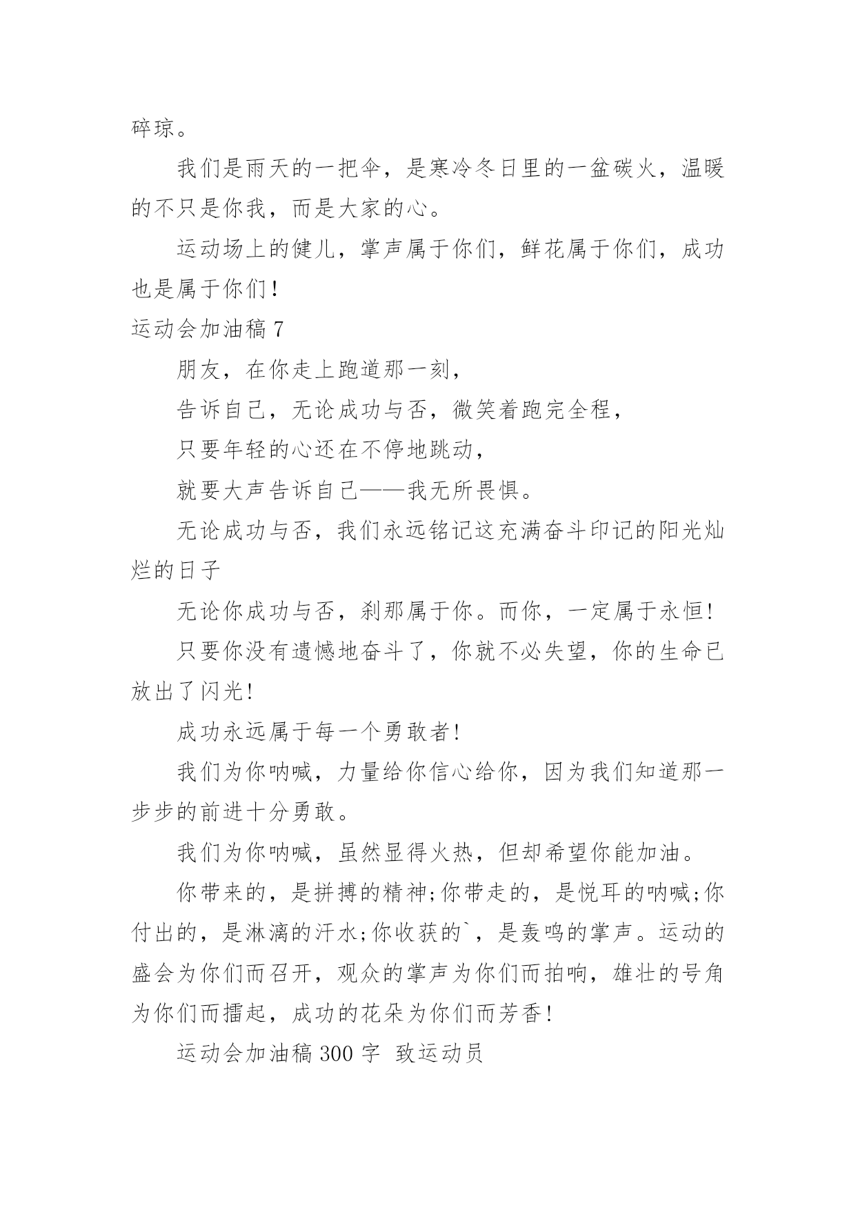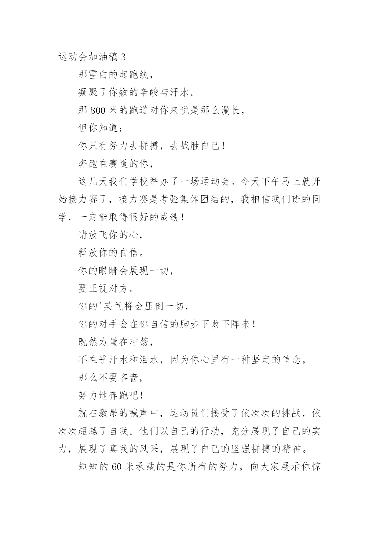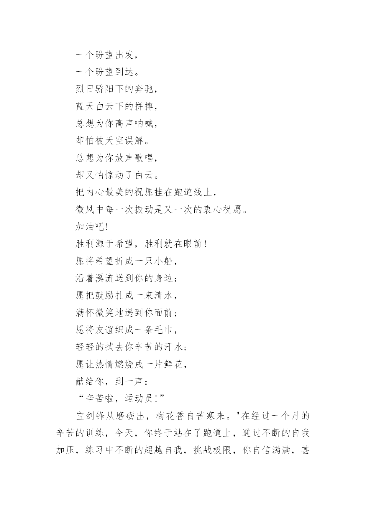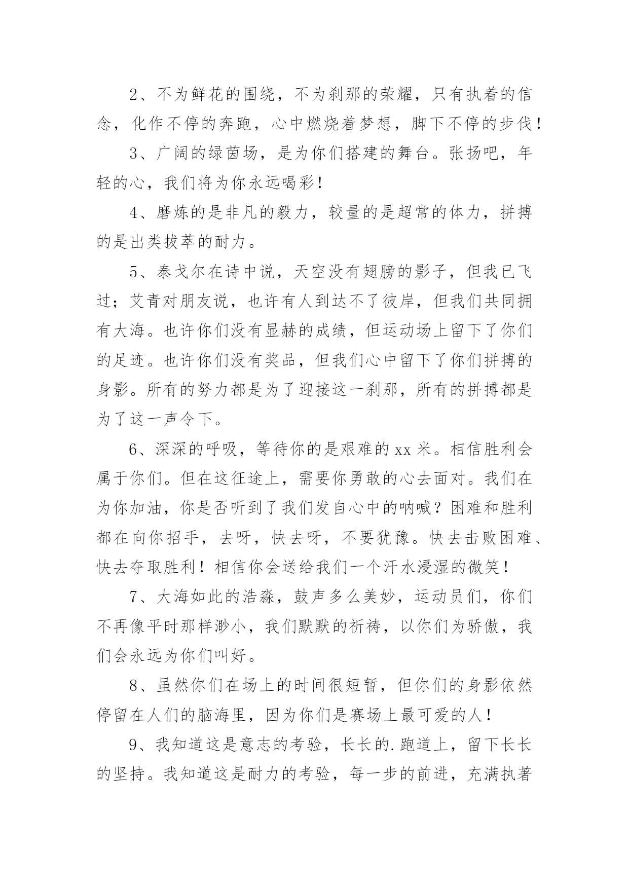 运动会加油稿运动会加油稿在社会一步步向前发展的今天,越来越多地方需要用到加油稿,加油稿有着正向的鼓动作用。为了让您在写加油稿时更加简单方便,以下是小编为大家收集的运动会加油稿,欢迎阅读与收藏。运动会加油稿1你们快如离弦之箭;疾似撒疆野马;你们的速度让我们惊叹;你们的精神让我们钦佩;流汗千日,只为今日一搏;疾踏百步,只为终点一触;胜利再向你微笑;成功在向你招手;加油啊!健儿们!运动会加油稿2鲤鱼把龙门定为梦想的高度;雄鹰把苍穹定为梦想的高度。此刻面前的那根横杆,便是你梦想的高度。纵身的一跃,画出的.却是世界上最美的弧度。一厘米的距离,此刻却因为你而变得非比寻常。越过去,杆的后面是另一个天堂。运动会加油稿3那雪白的起跑线,凝聚了你数的辛酸与汗水。那800米的跑道对你来说是那么漫长,但你知道:你只有努力去拼搏,去战胜自己!奔跑在赛道的你,这几天我们学校举办了一场运动会。今天下午马上就开始接力赛了,接力赛是考验集体团结的,我相信我们班的同学,一定能取得很好的成绩!请放飞你的心,释放你的自信。你的眼睛会展现一切,要正视对方。你的'英气将会压倒一切,你的对手会在你自信的脚步下败下阵来!既然力量在冲荡,不在乎汗水和泪水,因为你心里有一种坚定的信念,那么不要吝啬,努力地奔跑吧!就在激昂的喊声中,运动员们接受了依次次的挑战,依次次超越了自我。他们以自己的行动,充分展现了自己的实力,展现了真我的风采,展现了自己的坚强拼搏的精神。短短的60米承载的是你所有的努力,向大家展示你惊人的速度吧,你一定可以的。加油吧,我们将是你的坚强后盾!聆听你用矫健的步伐,唱响的扣人心弦的歌诺大的竞技场期待着你矫健的身影朋友,在你踏上跑道的那一刻告诉自己————将信心进行到底。运动会加油稿4运动会加油稿1掌声响起来这里需要激情,这里需要呐喊,这里同样需要掌声。当你乘胜而归,我们为你鼓掌,为你祝贺,当你失败而来,我们同样为你鼓掌,为你骄傲。当掌声再一次想起的时候,你已经站在了起跑线上,朋友,向前冲!我们在为你鼓掌。运动会加油稿2在枪声响起的一刹那你如箭在弦飞刺而出,在跑道的尽头你奋力的一掷中你让铅球落在最远点是你们让我们知道了什么是拼搏,是们是激情是们是荣耀加油吧,让所有的人目击你们胜出的那刹那瞬间,让所有的人为你们而骄傲。运动会加油稿3运动场上有你们的飒爽英姿,运动场上有你们拼搏的身影,面对漫漫的征程,你没有畏惧和退缩,任汗水打湿脊背,任疲惫爬满全身,依然奋力追赶,只有一个目标,只有一个信念,为班级赢得荣誉,拼搏吧,我为你们呐喊,加油!运动会加油稿4一个盼望出发,一个盼望到达。烈日骄阳下的奔驰,蓝天白云下的拼搏,总想为你高声呐喊,却怕被天空误解。总想为你放声歌唱,却又怕惊动了白云。把内心最美的祝愿挂在跑道线上,微风中每一次振动是又一次的衷心祝愿。加油吧!运动会加油稿5将希望折成一只船,沿着溪流送到你的身边;愿把鼓励扎成一束清水,满怀微笑地递到你的面前;愿将友谊织成一条毛巾,轻轻的拭去你辛苦的汗水;愿让热情燃烧一片鲜花,献给你,道一声:辛苦了,运动员!运动会加油稿6在这充满未知的征途上,需要你用勇敢的心去面对。我们正在为你加油,你是否听见了我们衷心的呐喊?困难和胜利都在向你招手,去呀,不要犹豫,快去扳倒困难,快去篡夺胜利,相信你会送给我们一个汗水浸湿的微笑。爱拼才会赢!运动会加油稿7大地属于你,蓝天属于你,在你一跃的瞬间,同时跃出了我们的期望。草儿欣赏你,白云欢迎你,身轻如燕,飞跃蓝天,奥林匹克精神在你的身上体现。跳吧,跳出你的自信,跳出你的顶尖,跳出你的胜利山巅。运动会加油稿8起跑线上,你们一字排开,健美的肌肉蕴涵着爆发力量,坚定的目光充满了自信。枪响了,你们开始了并不长的征程,笔直的跑道上,有你们稳健的足迹;不远的的终点,将留下你们冲刺时矫健的身影。拼搏吧,掌声将为你响起;奋斗吧,胜利和鲜花将属于你们。运动会加油稿9三(5)班是一个温馨,可爱的班集体,也是一个由36名同学组成的一个大家庭,我们班是一个团结友爱的.班级,这三年来我们班度过了许多难忘的日子。勤奋、团结、活泼是我们班的班风。12月,我们完成了三年级上册的学业,我们班也有了一个崭新的起点。这次运动会,我们奔着友谊第一、比赛第二的精神来参与。我们想信,只要团结,就能战胜一切。‘团结拼搏,永往直前,放飞梦想’,共创佳绩!这是我们的口号,我们带着我们的口号向更好的目标前进!运动会加油稿10也许流星并不少见,但它燃烧的刹那,留给人间最美丽的回忆!也许笑脸并不少见,但胜利的喜悦,总会留给世界精彩的一瞬!是的,那些曾经美妙的东西只有短短的一瞬间,但那却把最辉煌的一刻留给了人间。胜利,是每个人所追求的,胜利的喜悦,是胜利与重新开始的转折,胜利是新的开始!运动会加油稿51、漫漫长路,你愿一人独撑,忍受着孤独与寂寞,承受着