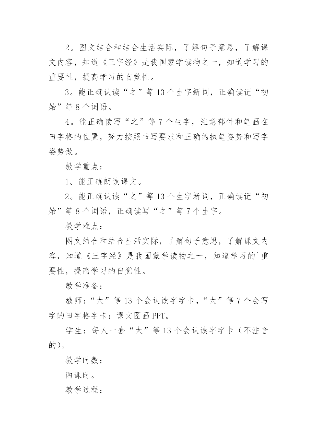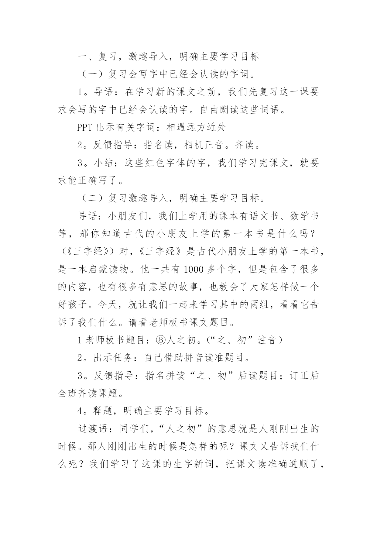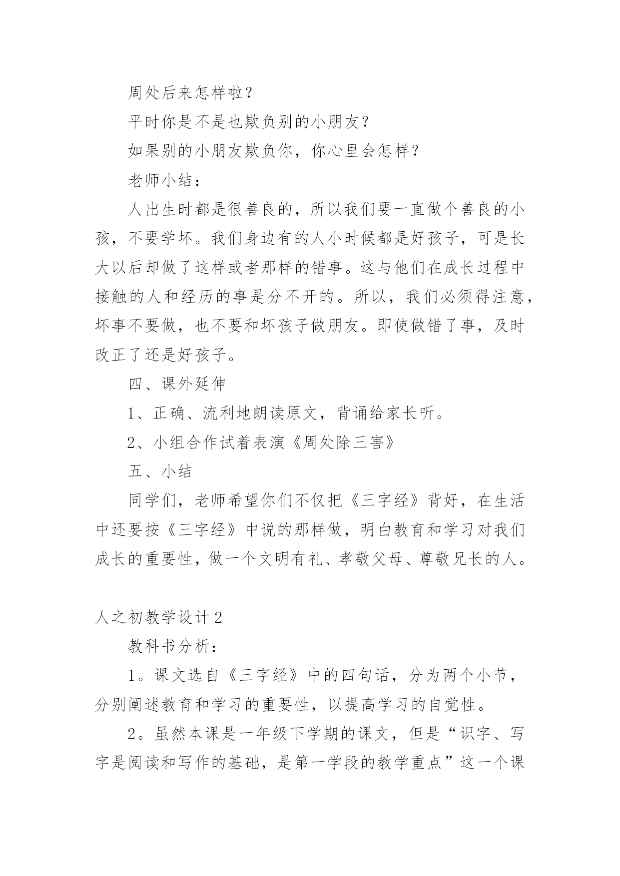 人之初教学设计作为一无名无私奉献的教育工作者,很有必要精心设计一份教学设计,教学设计以计划和布局安排的形式,对怎样才能达到教学目标进行创造性的决策,以解决怎样教的问题。我们该怎么去写教学设计呢?下面是小编帮大家整理的人之初教学设计,仅供参考,大家一起来看看吧。人之初教学设计1教学目标:1、自由拼读并有感情地朗读三字经中“人之初,性本善。性相近,习相远。苟不教,性乃迁。教之道,贵以专。”体会《三字经》语言的节奏感和韵律感。2、通过学习,明白深刻的道理。教学准备:《三字经》朗读。教学过程:一、引入《三字经》是古代小朋友上学的第一本书,是一本启蒙读物。他一共有1000多个字,但是包含了很多的内容,也有很多有意思的故事。相传这本书的作者是一个叫王应麟的人,他是南宋的一个著名学者,在南宋作了很大的官,但是他为人非常耿直,看不惯官场上的一些人和事,因此得罪了其他人,所以后来他就不做官了,回了老家。在老家他过着隐居的生活,一家人在山林里过的非常快乐。后来他的小孙子们逐渐长大了,他必须要让他们学习知识,所以他为了教育他的子孙就编写了一本歌谣,都是三个字一句,很押韵,容易朗读,内容包括天文、地理、哲学、历史等等。渐渐的,这本书被很多人知道,因为它都是三个字一句,所以就叫他《三字经》了。从那以后,大家把三字经作为小朋友上学学的第一门课程,学了它,我们就能知道怎么做个好孩子,天上都有什么东西,为什么我们会有辈分,中国最长的河是那条河?在我们没出生以前中国发生了什么事?我们从今天开始也要学习它,通过它我们将会了解很多的东西。二、诵读感悟1朗读原文,读通读顺。(1)师范读,要求学生认真听,注意不认识字的发音,尤其是平翘舌的读音。(原文:人之初,性本善。性相近,习相远。苟不教,性乃迁。教之道,贵以专。)(2)学生自由读,要求:借助拼音多读几遍。(3)同桌互读,要求:及时正音,把原文读通顺读流利。(4)指读,随时正音。(5)小组比赛读,看哪组读得又准确又流利。(6)开火车读,看哪列火车读得又快又准。2、、诵读原文,读出节奏韵律。(1)读古文不仅要读通读顺,还要读出节奏和韵律。你们想听一听吗?(放《三字经》的朗读。)(2)试着自己读一读。(3)指名读,生评,师评。(评价中引导学生进一步读出节奏韵律。)(4)拍手打节奏,齐声背诵。3、质疑释义。(1)那这章《三字经》说的是什么意思呢?你知道哪一句的`含义,给老师和同学们讲一讲,指名讲含义。你不知道哪一句的含义,提出来讨论。(2)在汇报、质疑中,体会原文的含义。(人生下来的时候都是好的,只是由于成长过程中,后天的学习环境不一样,性情也就有了好与坏的差别。如果从小不好好教育,善良的本性就会变坏。为了使人不变坏,最重要的方法就是要专心一致地去教育孩子。)三、老师讲故事:周处除三害1、从前,有个人叫周处,他个子高,力气大,常常欺负别人。人们背地里都把他和白额虎、大蛟合称为“三害”。后来,周处带着弓箭来到南山把白额虎杀了,然后又去杀大蛟。大蛟受伤逃跑了,周处就一直追。人们看到周处没有回来,以为他死了,都高兴得欢天喜地。周处回来后知道了这一切心里很不是滋味。他下定决心要重新做个好人。后来,他离开了家乡,拜师学艺,终于成为了一个正直的好官。2、老师提问:大家为什么不喜欢周处?为什么把周处和大蛟、白额虎称为“三害”?周处是一出生就是个爱欺负人的坏孩子吗?周处后来怎样啦?平时你是不是也欺负别的小朋友?如果别的小朋友欺负你,你心里会怎样?老师小结:人出生时都是很善良的,所以我们要一直做个善良的小孩,不要学坏。我们身边有的人小时候都是好孩子,可是长大以后却做了这样或者那样的错事。这与他们在成长过程中接触的人和经历的事是分不开的。所以,我们必须得注意,坏事不要做,也不要和坏孩子做朋友。即使做错了事,及时改正了还是好孩子。四、课外延伸1、正确、流利地朗读原文,背诵给家长听。2、小组合作试着表演《周处除三害》五、小结同学们,老师希望你们不仅把《三字经》背好,在生活中还要按《三字经》中说的那样做,明白教育和学习对我们成长的重要性,做一个文明有礼、孝敬父母、尊敬兄长的人。人之初教学设计2教科书分析:1。课文选自《三字经》中的四句话,分为两个小节,分别阐述教育和学习的重要性,以提高学习的自觉性。2。虽然本课是一年级下学期的课文,但是“识字、写字是阅读和写作的基础,是第一学段的教学重点”这一个课标要求没有变,而且一年级的课文是识字的文本,因此,要注意教学时间、精力等的合理分配,要突出“识字与写字”这个教学重点。3。一年级下学期,会写字的学习已经进入以写合体字为主的学习阶段,记认字形,尤其是记认字形的细部是保证会写字掌握的关键,因此,一下在写字指导环节,要设计字形学习的步骤,通过学生记字方法的运用,引导进行形近字比较,音形义结合,认记会写的字。