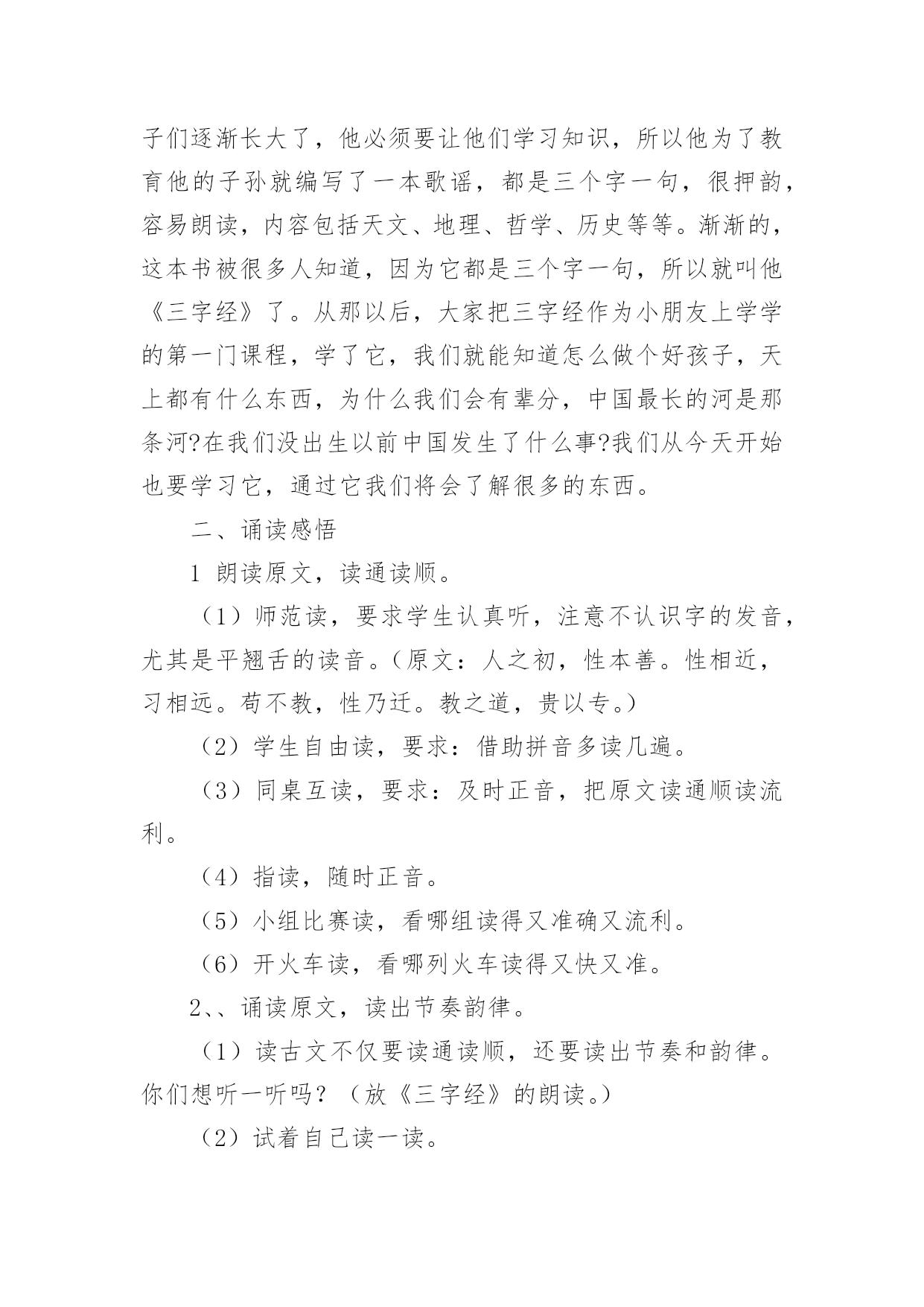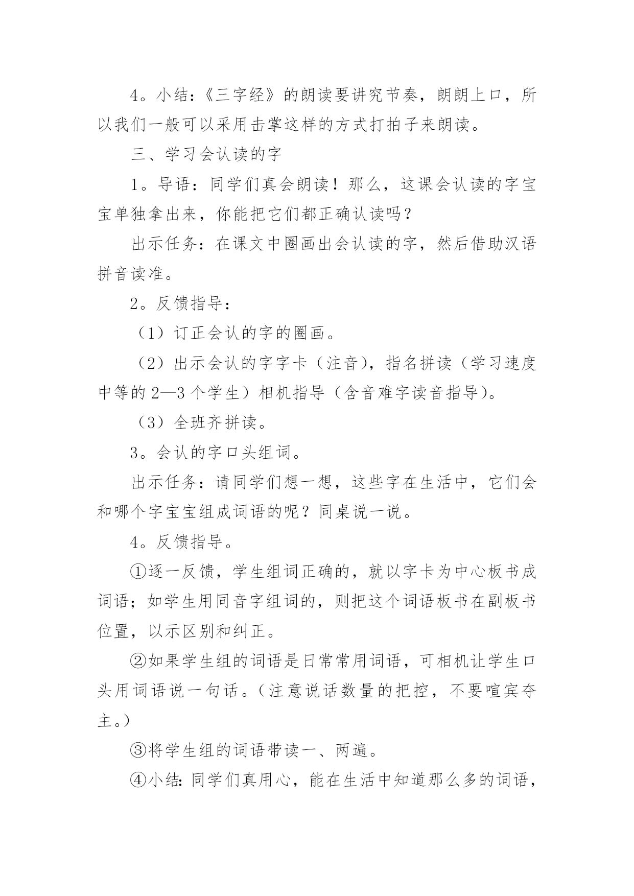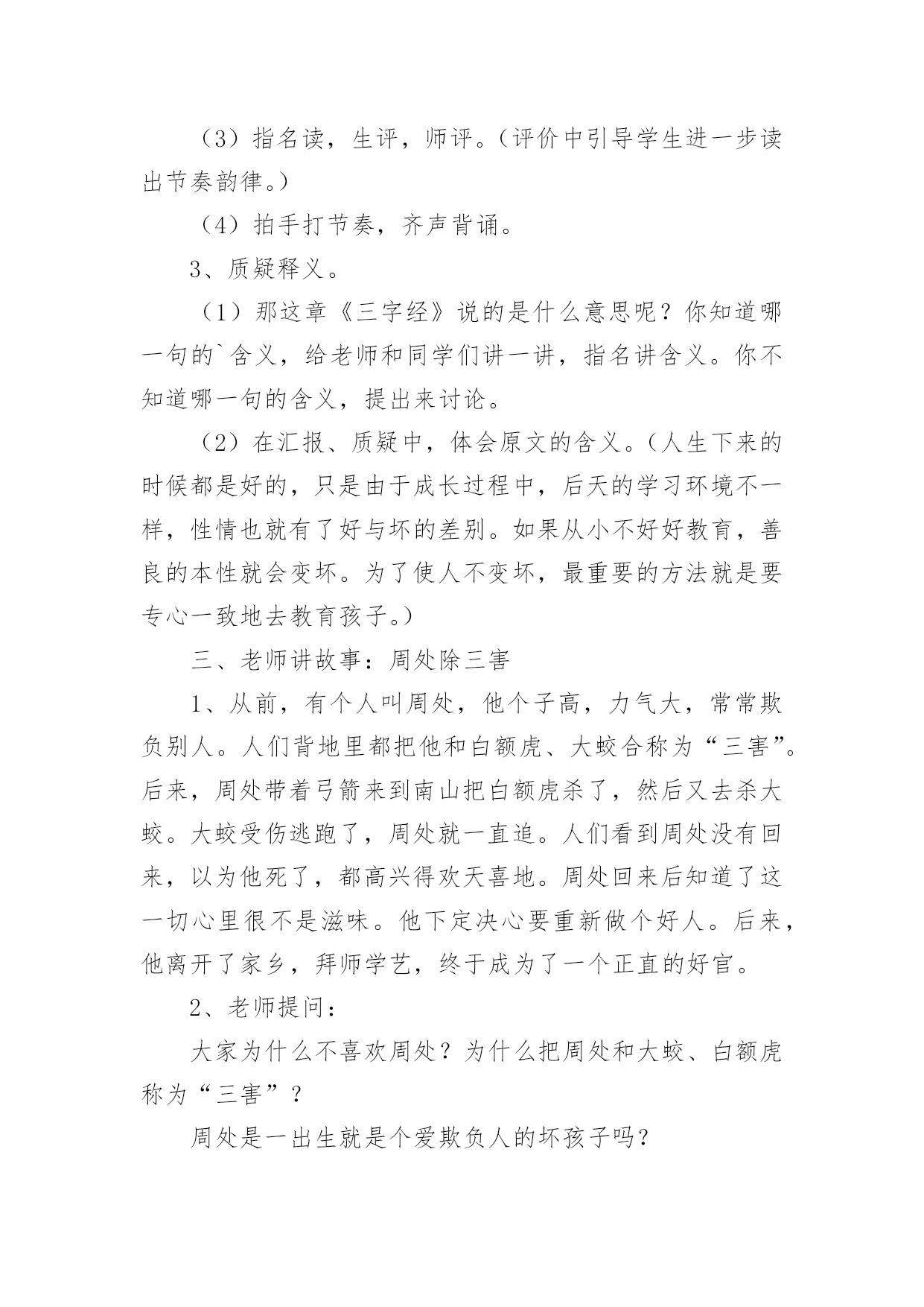 人之初教学设计作为一无名无私奉献的教育工作者,很有必要精心设计一份教学设计,教学设计以计划和布局安排的形式,对怎样才能达到教学目标进行创造性的决策,以解决怎样教的问题。我们该怎么去写教学设计呢?下面是小编帮大家整理的人之初教学设计,仅供参考,大家一起来看看吧。人之初教学设计1教学目标:1、自由拼读并有感情地朗读三字经中“人之初,性本善。性相近,习相远。苟不教,性乃迁。教之道,贵以专。”体会《三字经》语言的节奏感和韵律感。2、通过学习,明白深刻的道理。教学准备:《三字经》朗读。教学过程:一、引入《三字经》是古代小朋友上学的第一本书,是一本启蒙读物。他一共有1000多个字,但是包含了很多的内容,也有很多有意思的故事。相传这本书的作者是一个叫王应麟的人,他是南宋的一个著名学者,在南宋作了很大的官,但是他为人非常耿直,看不惯官场上的一些人和事,因此得罪了其他人,所以后来他就不做官了,回了老家。在老家他过着隐居的生活,一家人在山林里过的非常快乐。后来他的小孙子们逐渐长大了,他必须要让他们学习知识,所以他为了教育他的子孙就编写了一本歌谣,都是三个字一句,很押韵,容易朗读,内容包括天文、地理、哲学、历史等等。渐渐的,这本书被很多人知道,因为它都是三个字一句,所以就叫他《三字经》了。从那以后,大家把三字经作为小朋友上学学的第一门课程,学了它,我们就能知道怎么做个好孩子,天上都有什么东西,为什么我们会有辈分,中国最长的河是那条河?在我们没出生以前中国发生了什么事?我们从今天开始也要学习它,通过它我们将会了解很多的东西。二、诵读感悟1朗读原文,读通读顺。(1)师范读,要求学生认真听,注意不认识字的发音,尤其是平翘舌的读音。(原文:人之初,性本善。性相近,习相远。苟不教,性乃迁。教之道,贵以专。)(2)学生自由读,要求:借助拼音多读几遍。(3)同桌互读,要求:及时正音,把原文读通顺读流利。(4)指读,随时正音。(5)小组比赛读,看哪组读得又准确又流利。(6)开火车读,看哪列火车读得又快又准。2、、诵读原文,读出节奏韵律。(1)读古文不仅要读通读顺,还要读出节奏和韵律。你们想听一听吗?(放《三字经》的朗读。)(2)试着自己读一读。(3)指名读,生评,师评。(评价中引导学生进一步读出节奏韵律。)(4)拍手打节奏,齐声背诵。3、质疑释义。(1)那这章《三字经》说的是什么意思呢?你知道哪一句的`含义,给老师和同学们讲一讲,指名讲含义。你不知道哪一句的含义,提出来讨论。(2)在汇报、质疑中,体会原文的含义。(人生下来的时候都是好的,只是由于成长过程中,后天的学习环境不一样,性情也就有了好与坏的差别。如果从小不好好教育,善良的本性就会变坏。为了使人不变坏,最重要的方法就是要专心一致地去教育孩子。)三、老师讲故事:周处除三害1、从前,有个人叫周处,他个子高,力气大,常常欺负别人。人们背地里都把他和白额虎、大蛟合称为“三害”。后来,周处带着弓箭来到南山把白额虎杀了,然后又去杀大蛟。大蛟受伤逃跑了,周处就一直追。人们看到周处没有回来,以为他死了,都高兴得欢天喜地。周处回来后知道了这一切心里很不是滋味。他下定决心要重新做个好人。后来,他离开了家乡,拜师学艺,终于成为了一个正直的好官。2、老师提问:大家为什么不喜欢周处?为什么把周处和大蛟、白额虎称为“三害”?周处是一出生就是个爱欺负人的坏孩子吗?周处后来怎样啦?平时你是不是也欺负别的小朋友?如果别的小朋友欺负你,你心里会怎样?老师小结:人出生时都是很善良的,所以我们要一直做个善良的小孩,不要学坏。我们身边有的人小时候都是好孩子,可是长大以后却做了这样或者那样的错事。这与他们在成长过程中接触的人和经历的事是分不开的。所以,我们必须得注意,坏事不要做,也不要和坏孩子做朋友。即使做错了事,及时改正了还是好孩子。四、课外延伸1、正确、流利地朗读原文,背诵给家长听。2、小组合作试着表演《周处除三害》五、小结同学们,老师希望你们不仅把《三字经》背好,在生活中还要按《三字经》中说的那样做,明白教育和学习对我们成长的重要性,做一个文明有礼、孝敬父母、尊敬兄长的人。人之初教学设计2教科书分析:1。课文选自《三字经》中的四句话,分为两个小节,分别阐述教育和学习的重要性,以提高学习的自觉性。2。虽然本课是一年级下学期的课文,但是“识字、写字是阅读和写作的基础,是第一学段的教学重点”这一个课标要求没有变,而且一年级的课文是识字的文本,因此,要注意教学时间、精力等的合理分配,要突出“识字与写字”这个教学重点。3。一年级下学期,会写字的学习已经进入以写合体字为主的学习阶段,记认字形,尤其是记认字形的细部是保证会写字掌握的关键,因此,一下在写字指导环节,要设计字形学习的步骤,通过学生记字方法的运用,引导进行形近字比较,音形义结合,认记会写的字。
