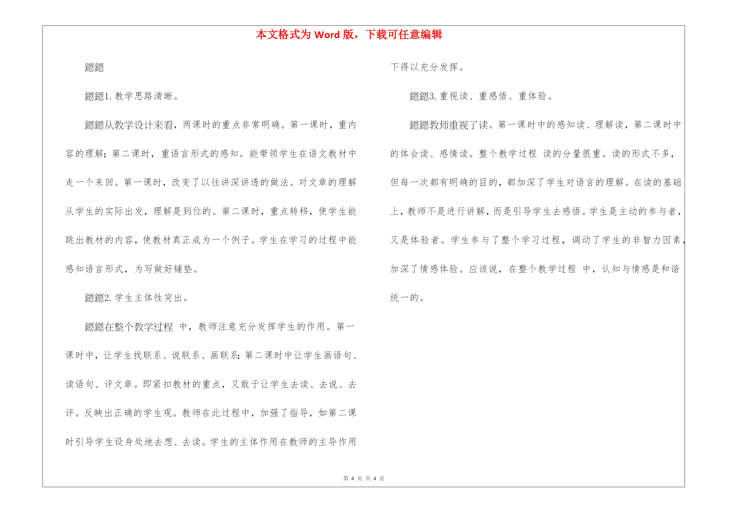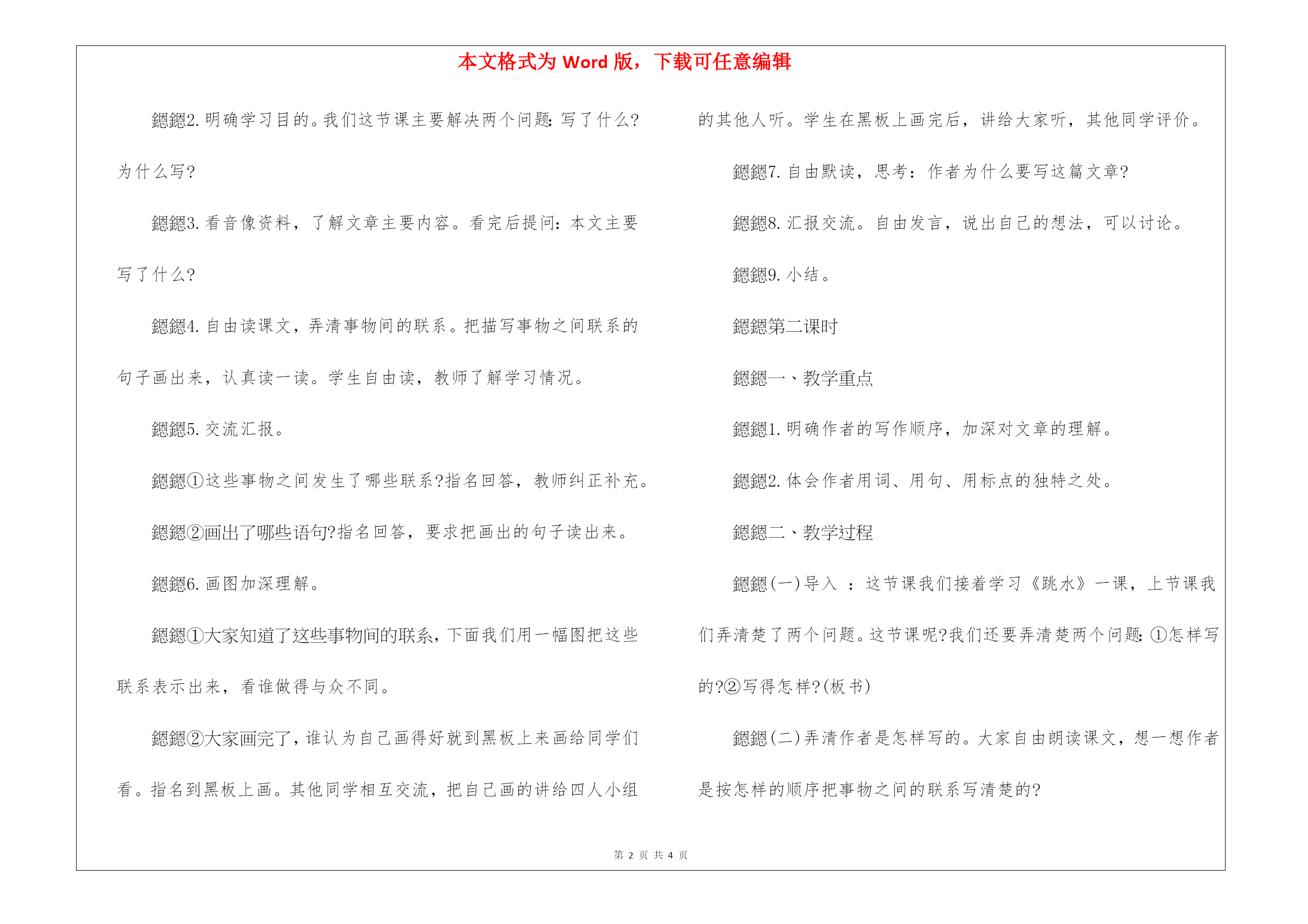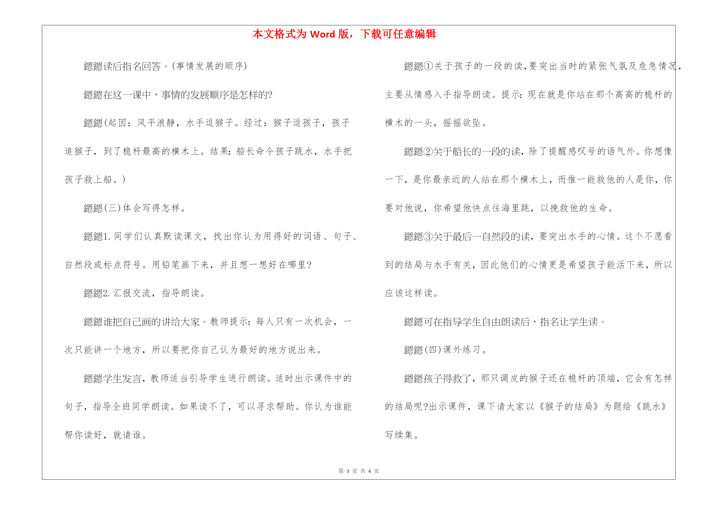本文格式为Word版,下载可任意编辑第PAGE\*MERGEFORMAT4页共NUMPAGES\*MERGEFORMAT4页《跳水》教学设计《跳水》教学设计一、教材分析《跳水》的作者是俄国著名作家托尔斯泰,作者按事物的发展顺序展示给读者一个个生动的画面。文中人物各有特点,语言运用熟练,人物刻画形象逼真。因此,本篇除抓训练重点以外,还应让学生感悟作者写作方法。二、指导思想1.学生为主体。重视学生的自我探究、自我发现。使学生自始至终能自己读书、自己感悟、自己发现、自己获得。2.教师为主导。教师带领学生读得更深,体会得更细,悟到得更多,发现得更快,最后引导学生把自己的所得通过读或写表现出来。3.语文本体观。语文是工具性与人文性相统一的学科。在语文教学中二者不可偏废,使学生在感知、理解、积累的基础上,能熟练运用语文这个工具,同时在精神与情感上获得满足。三、总体安排第一课时,在感知的基础上深入理解课文内容,明确文章所要表达的思想感情;第二课时,跳出课文内容,明确作者组织及运用语言材料的精妙之处,从而加深对语言的理解与体会。四、教学准备多媒体课件。第一课时一、教学重点1.弄清课文主要内容,弄清事物之间的联系。2.明确作者的写作目的,即文章的中心。二、教学过程1.导入新课。2.明确学习目的。我们这节课主要解决两个问题:写了什么?为什么写?3.看音像资料,了解文章主要内容。看完后提问:本文主要写了什么?4.自由读课文,弄清事物间的联系。把描写事物之间联系的句子画出来,认真读一读。学生自由读,教师了解学习情况。5.交流汇报。①这些事物之间发生了哪些联系?指名回答,教师纠正补充。②画出了哪些语句?指名回答,要求把画出的句子读出来。6.画图加深理解。①大家知道了这些事物间的联系,下面我们用一幅图把这些联系表示出来,看谁做得与众不同。②大家画完了,谁认为自己画得好就到黑板上来画给同学们看。指名到黑板上画。其他同学相互交流,把自己画的讲给四人小组的其他人听。学生在黑板上画完后,讲给大家听,其他同学评价。7.自由默读,思考:作者为什么要写这篇文章?8.汇报交流。自由发言,说出自己的想法,可以讨论。9.小结。第二课时一、教学重点1.明确作者的写作顺序,加深对文章的理解。2.体会作者用词、用句、用标点的独特之处。二、教学过程(一)导入:这节课我们接着学习《跳水》一课,上节课我们弄清楚了两个问题。这节课呢?我们还要弄清楚两个问题:①怎样写的?②写得怎样?(板书)(二)弄清作者是怎样写的。大家自由朗读课文,想一想作者是按怎样的顺序把事物之间的联系写清楚的?读后指名回答。(事情发展的顺序)在这一课中,事情的发展顺序是怎样的?(起因:风平浪静,水手逗猴子。经过:猴子逗孩子,孩子追猴子,到了桅杆最高的横木上。结果:船长命令孩子跳水,水手把孩子救上船。)(三)体会写得怎样。1.同学们认真默读课文,找出你认为用得好的词语、句子、自然段或标点符号。用铅笔画下来,并且想一想好在哪里?2.汇报交流,指导朗读。谁把自己画的讲给大家。教师提示:每人只有一次机会,一次只能讲一个地方,所以要把你自己认为最好的地方说出来。学生发言,教师适当引导学生进行朗读。适时出示课件中的句子,指导全班同学朗读。如果读不了,可以寻求帮助。你认为谁能帮你读好,就请谁。①关于孩子的一段的读,要突出当时的紧张气氛及危急情况,主要从情感入手指导朗读。提示:现在就是你站在那个高高的桅杆的横木的一头,摇摇欲坠。②关于船长的一段的读,除了提醒感叹号的语气外。你想像一下,是你最亲近的人站在那个横木上,而惟一能救他的人是你,你要对他说,你希望他快点往海里跳,以挽救他的生命。③关于最后一自然段的读,要突出水手的心情。这个不愿看到的结局与水手有关,因此他们的心情更是希望孩子能活下来,所以应该这样读。可在指导学生自由朗读后,指名让学生读。(四)课外练习。孩子得救了,那只调皮的猴子还在桅杆的顶端,它会有怎样的结局呢?出示课件,课下请大家以《猴子的结局》为题给《跳水》写续集。1.教学思路清晰。从教学设计来看,两课时的重点非常明确。第一课时,重内容的理解;第二课时,重语言形式的感知。能带领学生在语文教材中走一个来回。第一课时,改变了以往讲深讲透的做法。对文章的理解从学生的实际出发,理解是到位的。第二课时,重点转移,使学生能跳出教材的内容,使教材真正成为一个例子。学生在学习的过程中能感知语言形式,为写做好铺垫。2.学生主体性突出。在整个教学过程中,教师注意充分发挥学生的作用。第一课时中,让学生找联系、说