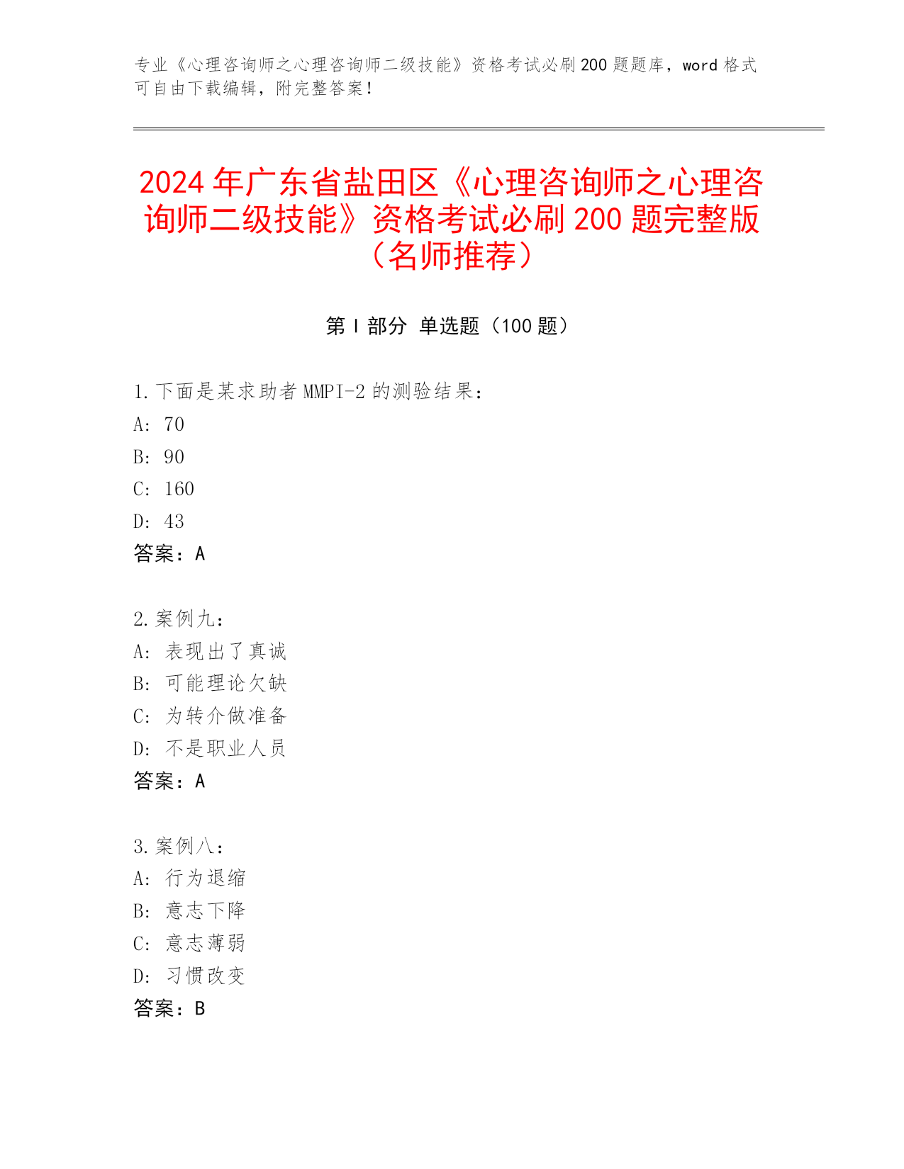 广东省盐田区2024年《心理咨询师之心理咨询师二级技能》资格考试必刷200题真题题库及答案(新)