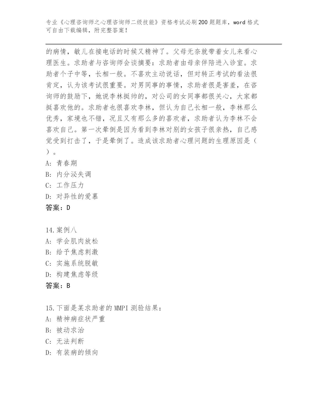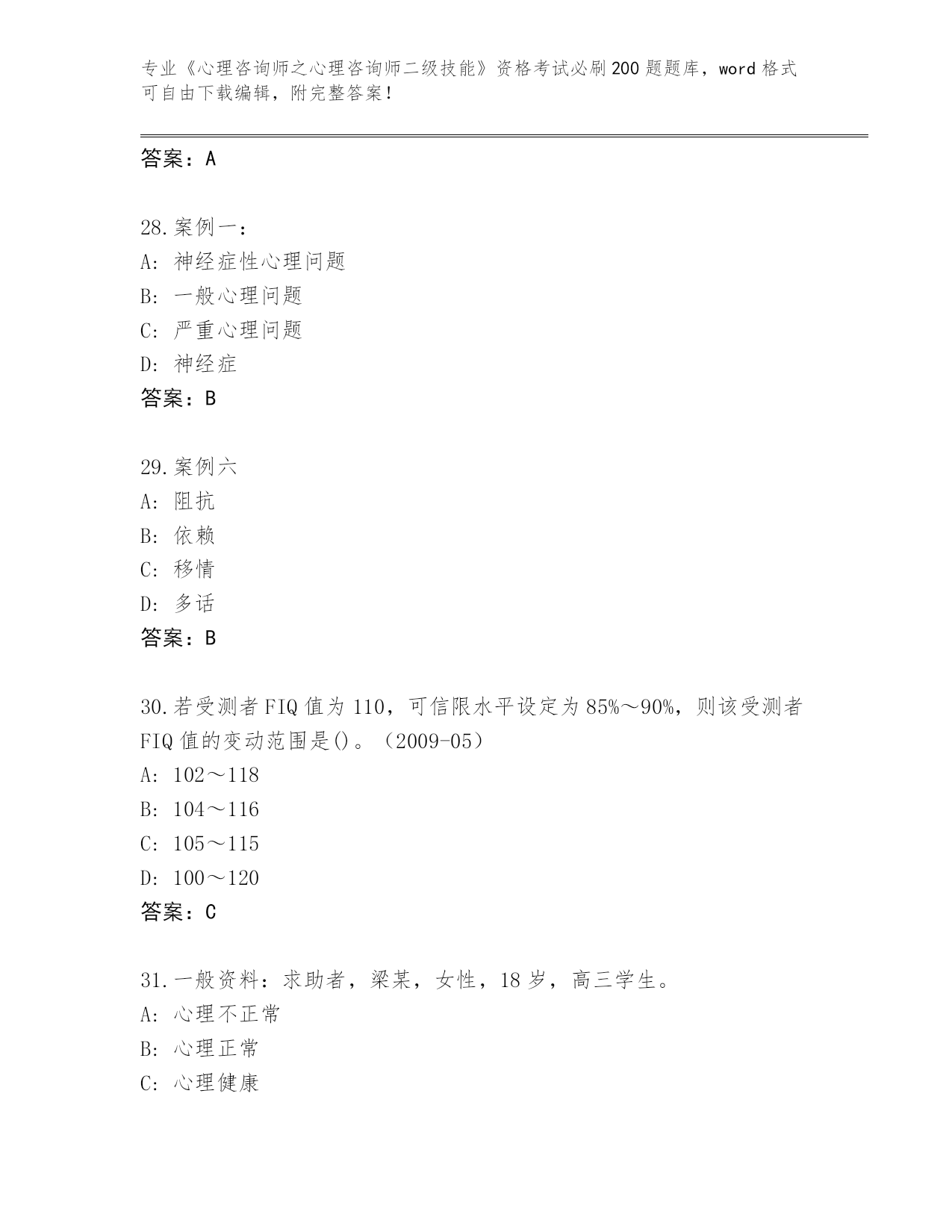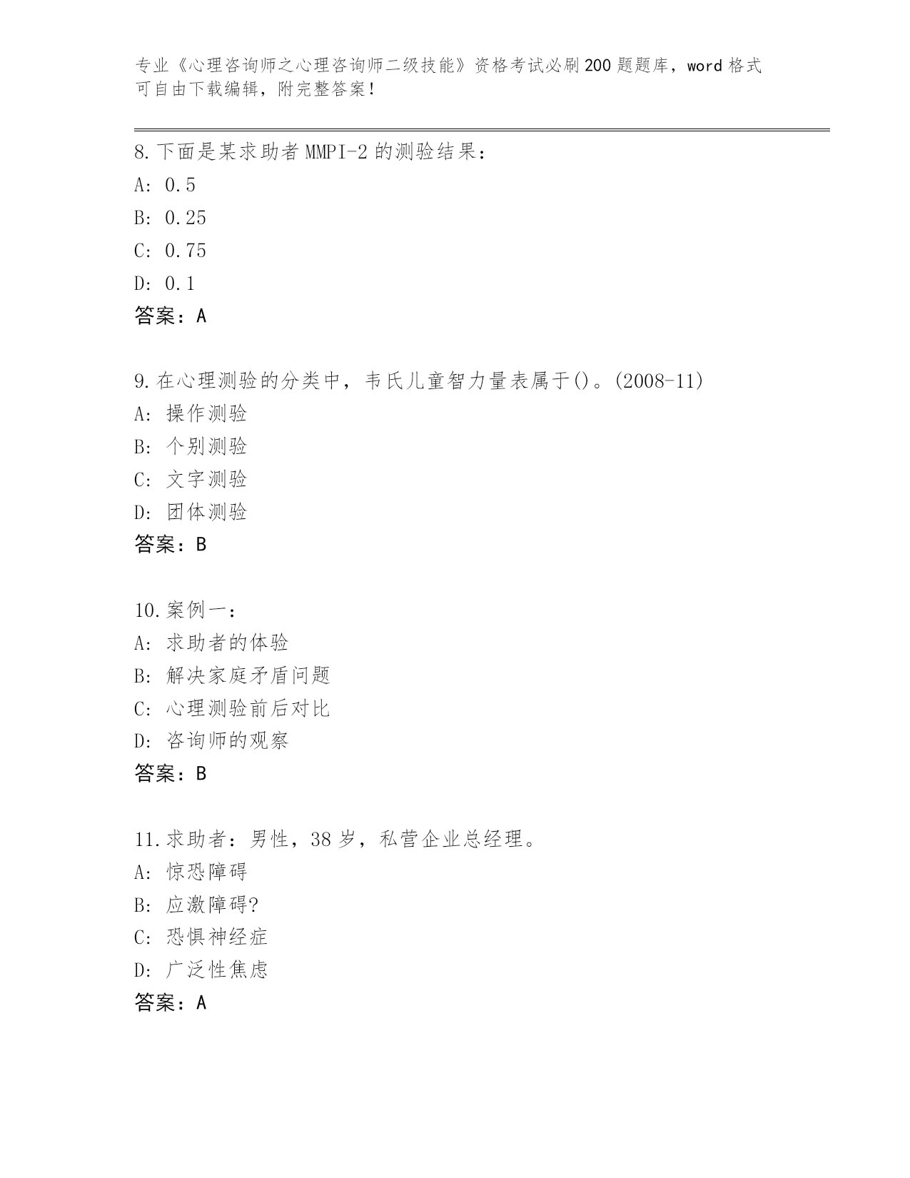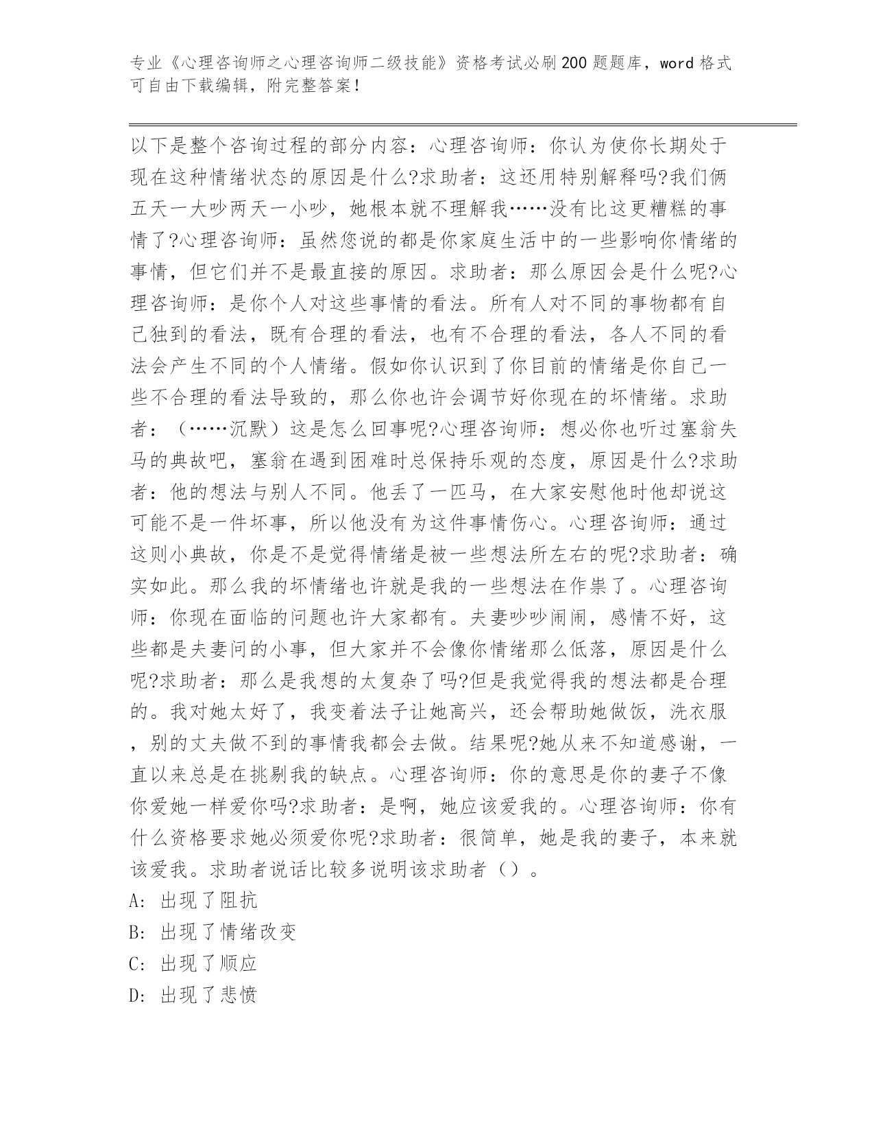 广东省濠江区2024《心理咨询师之心理咨询师二级技能》考试必刷200题完整版附答案【名师推荐】