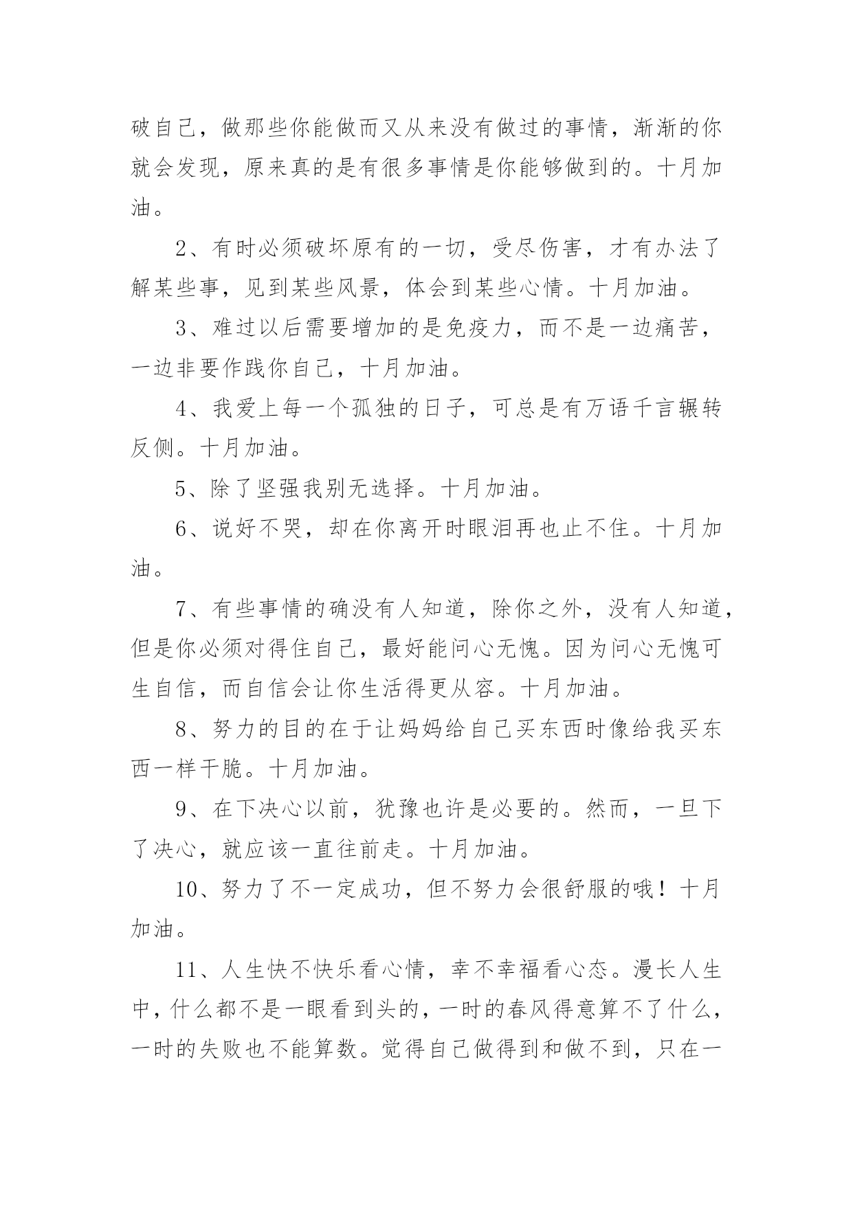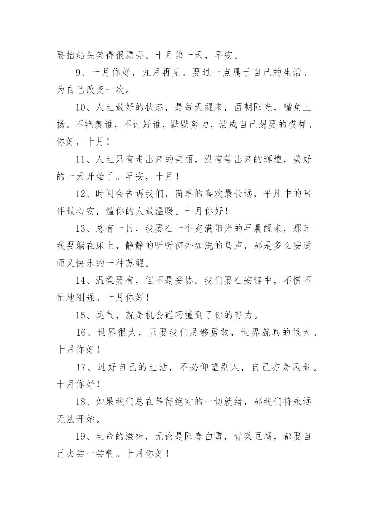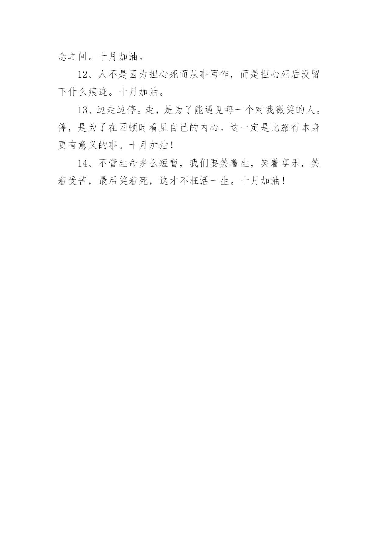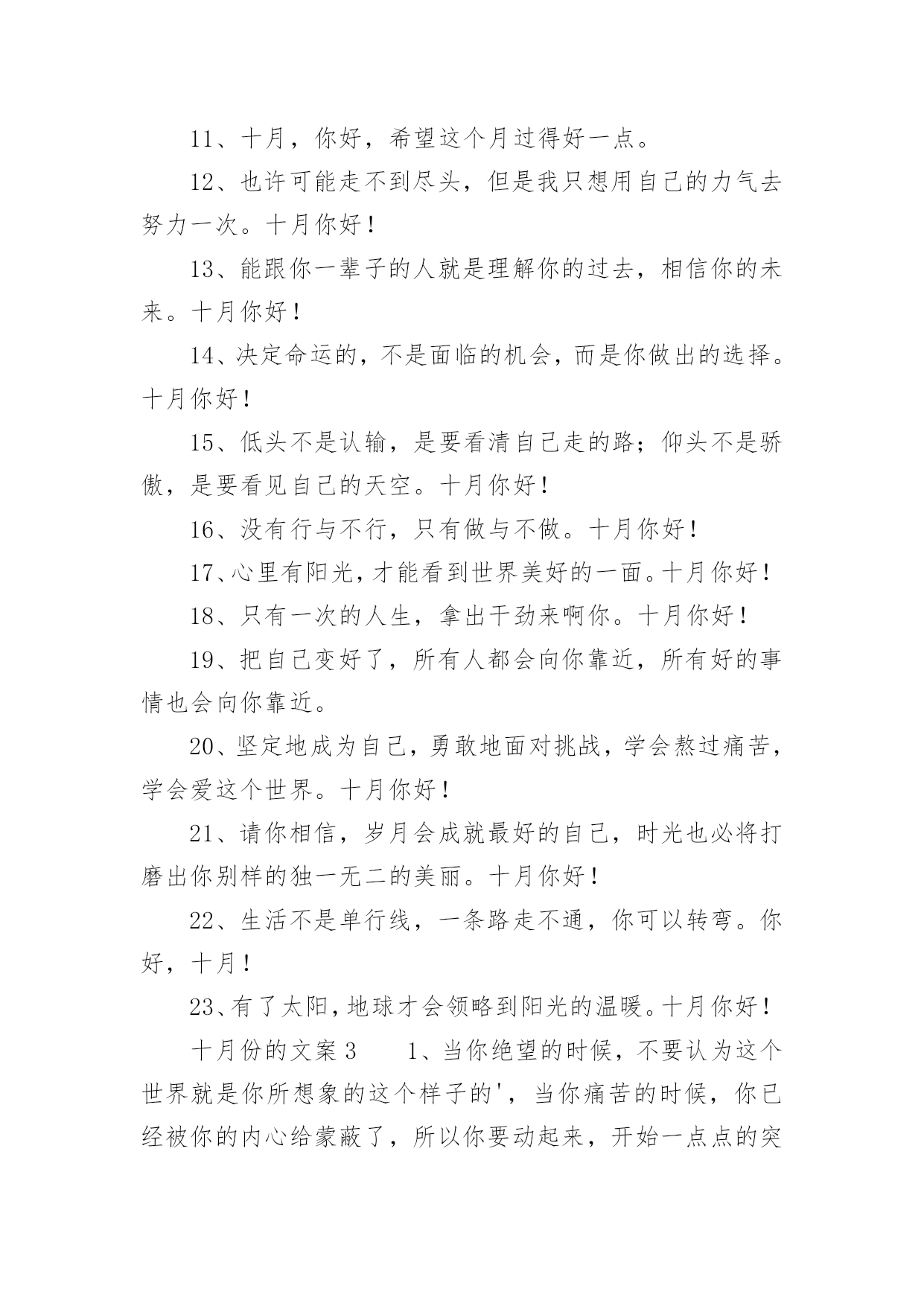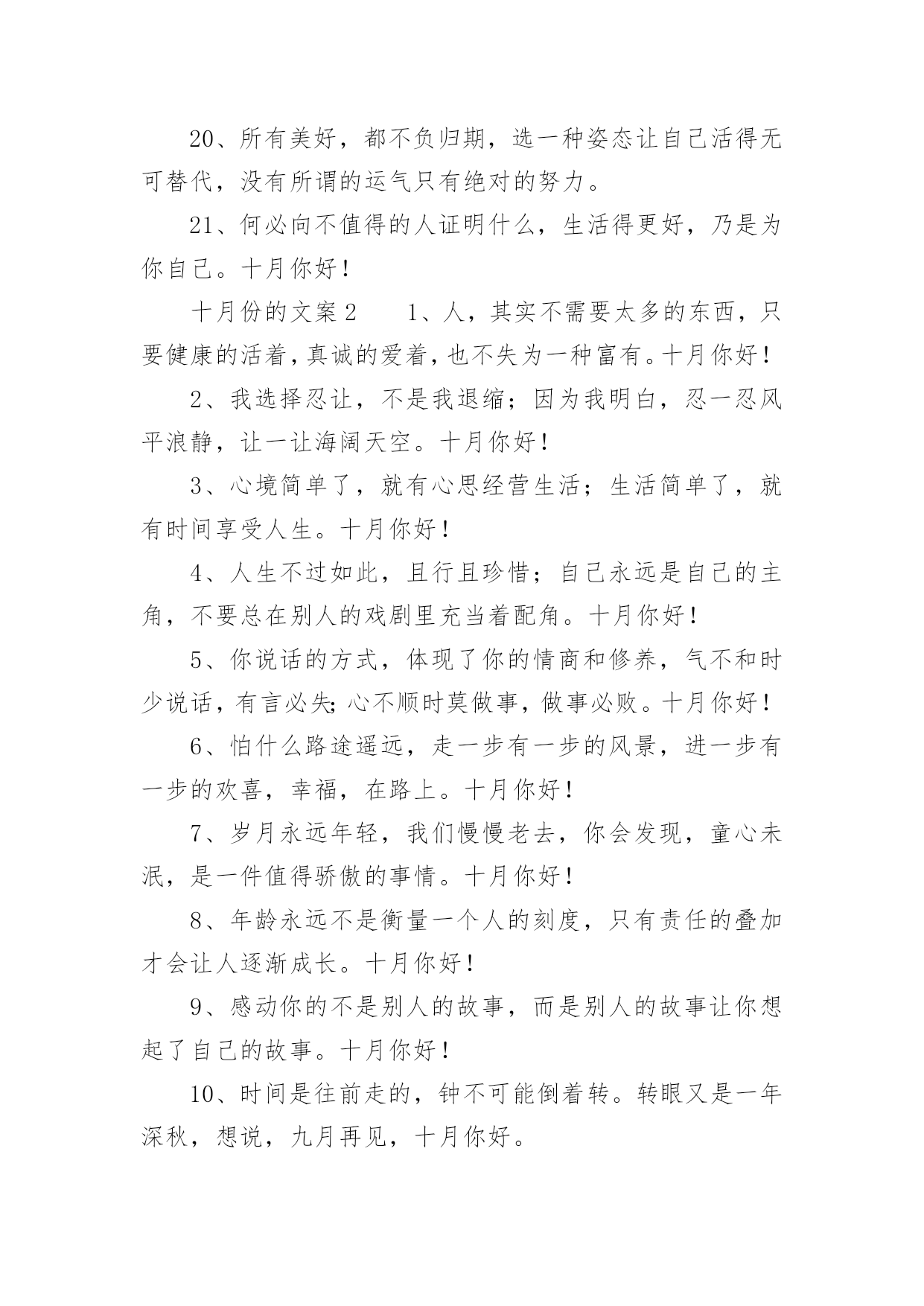 十月份的文案十月份的文案随着社交网络和信息技术的迅猛发展,越来越多人喜欢在网上发布文案,文案在生活中是比较重要的一种宣传形式。你知道什么样的文案才能算得上是好的文案吗?以下是小编收集整理的十月份的文案,仅供参考,欢迎大家阅读。十月份的文案11、希望你能永远明朗坦荡,有得有失有坚持,能笑能哭能尽欢。十月你好!2、生活,与其等待暴雨过去,不如学会在雨中跳舞。3、不要活在别人的评价里,对错是别人的事,问心无愧就好。4、人生总是会有不期而遇的温暖和生生不息的希望,前提是足够努力,才不会错过美丽的风景和动人的事。早安,十月!5、不管发生什么事,都要对自己说“不要紧”;无论困难多大,都要对自己说“会过去的”。6、你再不努力,生命就不是眼前的苟且,而是未来的苟且,生活需要时不时地打一些鸡血,才能燃起斗志。早安,十月!7、走遍世界最想祖国,走遍山水最爱中国,五十六个民族,同爱一个祖国,在祖国美好的生日到来之时,祝福每一个我爱的人幸福、快乐!8、跟自己说好,悲伤时可以哭得很狼狈,眼泪流干后,要抬起头笑得很漂亮。十月第一天,早安。9、十月你好,九月再见。要过一点属于自己的生活。为自己改变一次。10、人生最好的状态,是每天醒来,面朝阳光,嘴角上扬。不艳羡谁,不讨好谁,默默努力,活成自己想要的模样。你好,十月!11、人生只有走出来的美丽,没有等出来的辉煌,美好的一天开始了。早安,十月!12、时间会告诉我们,简单的喜欢最长远,平凡中的陪伴最心安,懂你的人最温暖。十月你好!13、总有一日,我要在一个充满阳光的早晨醒来,那时我要躺在床上,静静的听听窗外如洗的鸟声,那是多么安适而又快乐的一种苏醒。14、温柔要有,但不是妥协。我们要在安静中,不慌不忙地刚强。十月你好!15、运气,就是机会碰巧撞到了你的努力。16、世界很大,只要我们足够勇敢,世界就真的很大。十月你好!17、过好自己的生活,不必仰望别人,自己亦是风景。十月你好!18、如果我们总在等待绝对的一切就绪,那我们将永远无法开始。19、生命的滋味,无论是阳春白雪,青菜豆腐,都要自己去尝一尝啊。十月你好!20、所有美好,都不负归期,选一种姿态让自己活得无可替代,没有所谓的运气只有绝对的努力。21、何必向不值得的人证明什么,生活得更好,乃是为你自己。十月你好!十月份的文案21、人,其实不需要太多的东西,只要健康的活着,真诚的爱着,也不失为一种富有。十月你好!2、我选择忍让,不是我退缩;因为我明白,忍一忍风平浪静,让一让海阔天空。十月你好!3、心境简单了,就有心思经营生活;生活简单了,就有时间享受人生。十月你好!4、人生不过如此,且行且珍惜;自己永远是自己的主角,不要总在别人的戏剧里充当着配角。十月你好!5、你说话的方式,体现了你的情商和修养,气不和时少说话,有言必失;心不顺时莫做事,做事必败。十月你好!6、怕什么路途遥远,走一步有一步的风景,进一步有一步的欢喜,幸福,在路上。十月你好!7、岁月永远年轻,我们慢慢老去,你会发现,童心未泯,是一件值得骄傲的事情。十月你好!8、年龄永远不是衡量一个人的刻度,只有责任的叠加才会让人逐渐成长。十月你好!9、感动你的不是别人的故事,而是别人的故事让你想起了自己的故事。十月你好!10、时间是往前走的,钟不可能倒着转。转眼又是一年深秋,想说,九月再见,十月你好。11、十月,你好,希望这个月过得好一点。12、也许可能走不到尽头,但是我只想用自己的力气去努力一次。十月你好!13、能跟你一辈子的人就是理解你的过去,相信你的未来。十月你好!14、决定命运的,不是面临的机会,而是你做出的选择。十月你好!15、低头不是认输,是要看清自己走的路;仰头不是骄傲,是要看见自己的天空。十月你好!16、没有行与不行,只有做与不做。十月你好!17、心里有阳光,才能看到世界美好的一面。十月你好!18、只有一次的人生,拿出干劲来啊你。十月你好!19、把自己变好了,所有人都会向你靠近,所有好的事情也会向你靠近。20、坚定地成为自己,勇敢地面对挑战,学会熬过痛苦,学会爱这个世界。十月你好!21、请你相信,岁月会成就最好的自己,时光也必将打磨出你别样的独一无二的美丽。十月你好!22、生活不是单行线,一条路走不通,你可以转弯。你好,十月!23、有了太阳,地球才会领略到阳光的温暖。十月你好!十月份的文案31、当你绝望的时候,不要认为这个世界就是你所想象的这个样子的',当你痛苦的时候,你已经被你的内心给蒙蔽了,所以你要动起来,开始一点点的突破自己,做那些你能做而又从来没有做过的事情,渐渐的你就会发现,原来真的是有很多事情是你能够做到的。十月加油。2、有时必须破坏原有的一切,受尽伤害,才有办法了解某些事,见到某些风景,体会到某些心情。十月加油。3、难过以后需要增加的是免疫力,而不是一边痛苦,一边非要作践你自己,十月