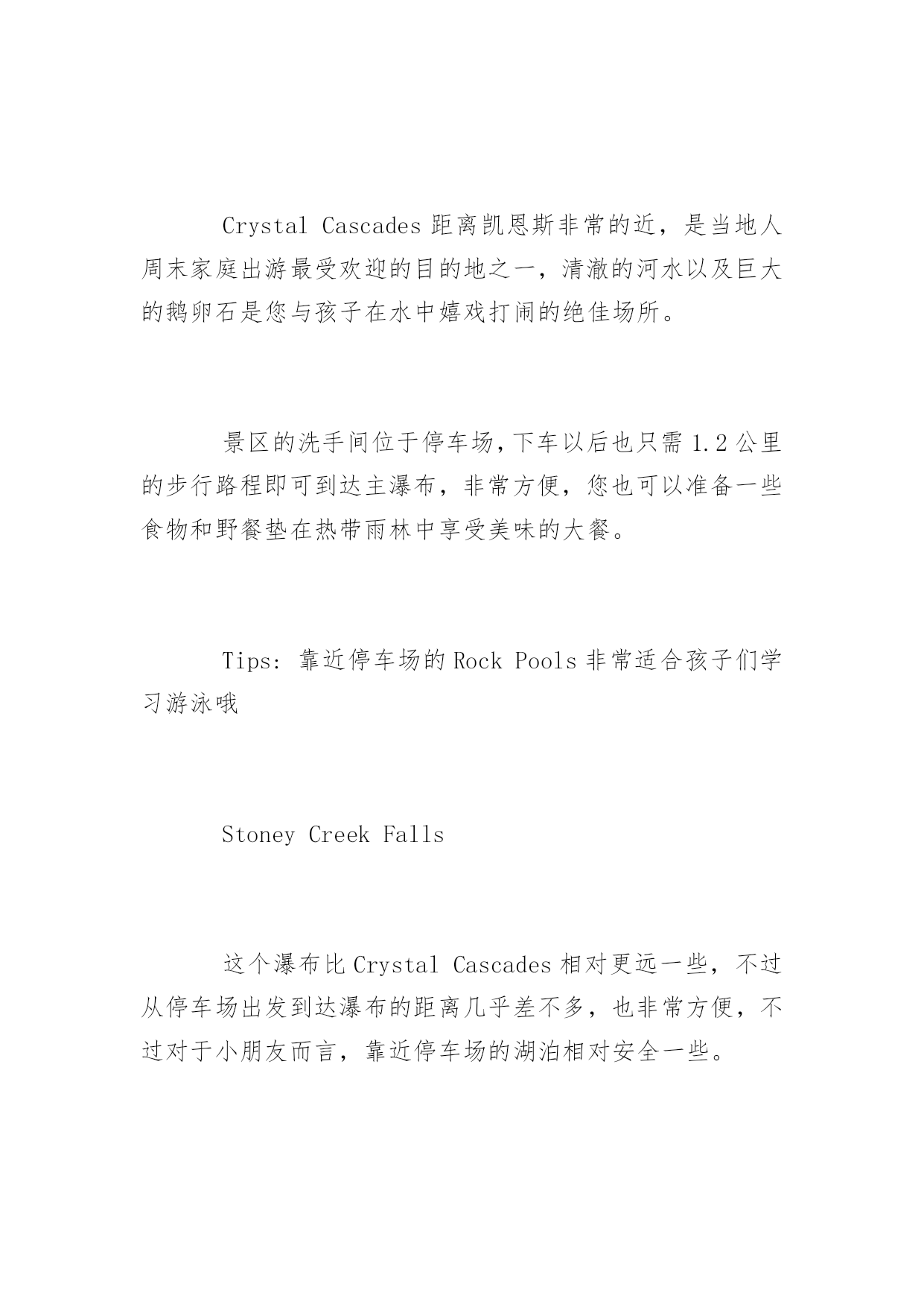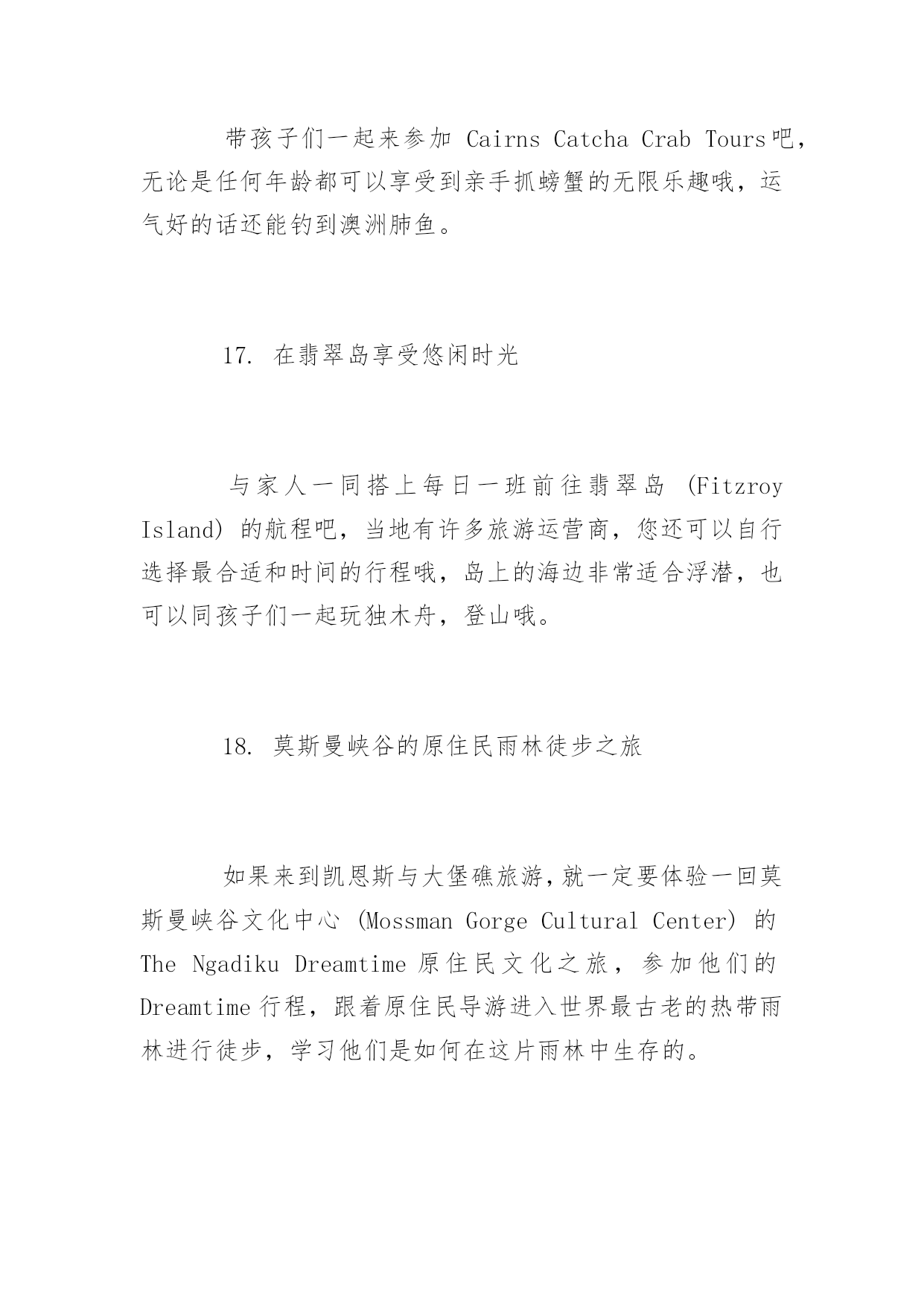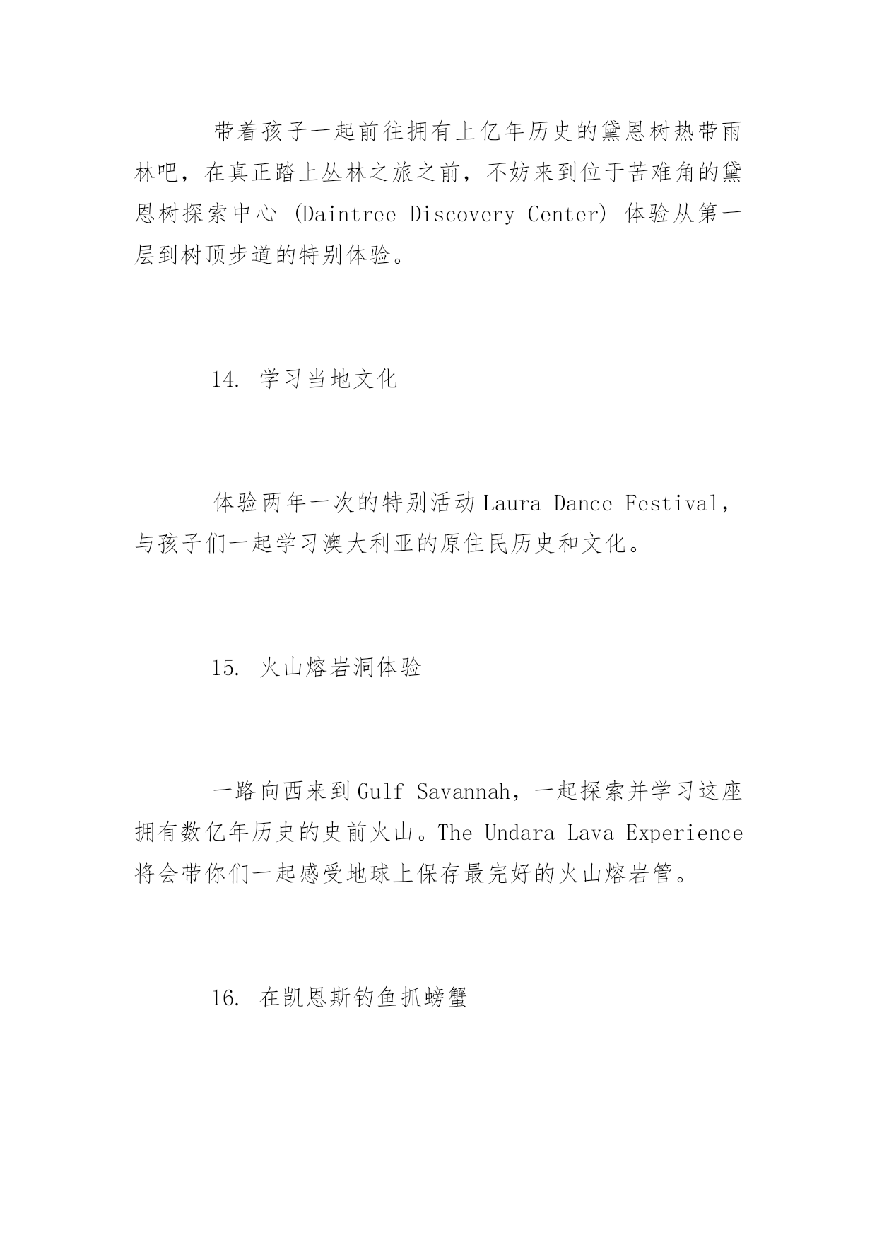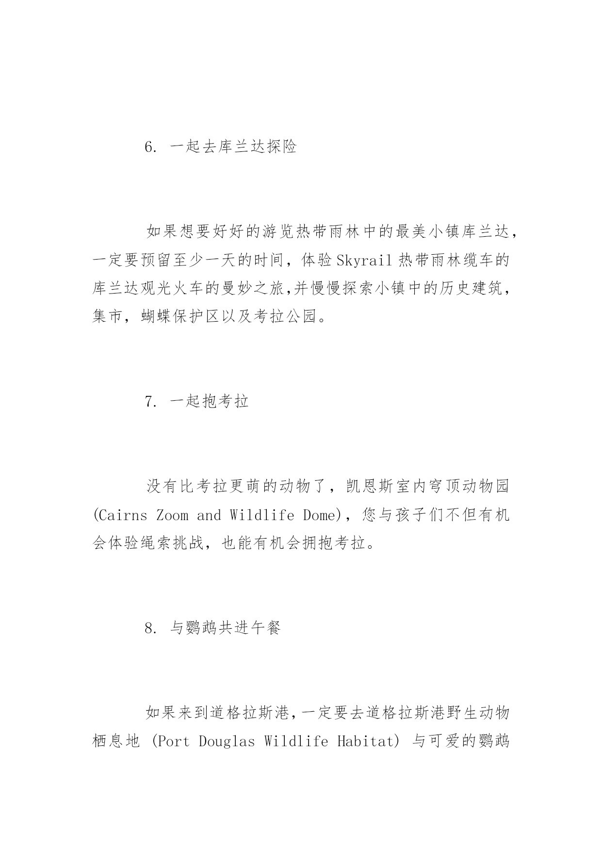 暑假亲子旅游好去处孩子希望过一个难忘的假期,为此,爸爸妈妈们计划好了吗?下面小编整理的暑假亲子旅游好去处。希望可以帮到你们。暑假亲子旅游好去处【1】1.探索史诗级的瀑布景点与孩子们嬉戏,伴随他们快乐成长是家长们每天必做的事情,来到凯恩斯与大堡礁地区,不妨带着孩子们一起追寻大自然的脚步,依次参观来到当地最著名的瀑布,小溪和湖泊,与孩子们一同享受这里得天独厚的美丽风景。我们挑选出了一些非常适合孩子和家庭前往的瀑布:CrystalCascadesCrystalCascades距离凯恩斯非常的近,是当地人周末家庭出游最受欢迎的目的地之一,清澈的河水以及巨大的鹅卵石是您与孩子在水中嬉戏打闹的绝佳场所。景区的洗手间位于停车场,下车以后也只需1.2公里的步行路程即可到达主瀑布,非常方便,您也可以准备一些食物和野餐垫在热带雨林中享受美味的大餐。Tips:靠近停车场的RockPools非常适合孩子们学习游泳哦StoneyCreekFalls这个瀑布比CrystalCascades相对更远一些,不过从停车场出发到达瀑布的距离几乎差不多,也非常方便,不过对于小朋友而言,靠近停车场的湖泊相对安全一些。2.沉浸在热带雨林之中来到壮观的热带雨林,看着到处都是的巨型树木满足孩子们的好奇心,与他们科普分享树林的知识。阿瑟顿高原的巨型无花果树也非常值得一去,如果幸运的话,还能偶遇到稀有的树袋鼠哦。3.在凯恩斯泻湖享受美妙家庭时光凯恩斯城市中可能没有特别适合游泳的海滩,不过标志性的凯恩斯人工泻湖(CairnsLagoon)正好为家庭和孩子们提供了非常不错的游泳场地。位于凯恩斯市中心,除了拥有巨大的泻湖以外,美丽的棕榈树,野餐区域以及儿童游乐区域也为家庭提供了绝佳的周末出游地点。4.一起寻找食火鸟的踪迹使命海滩,又被称为食火鸡海岸,是寻找食火鸡(Cassowary)踪迹的最佳地点之一。如果不想去海边,DjiruNationalPark也能看到这种动物,并且在游客服务中心,您可以了解关于这个濒危动物的一切信息。如果真的运气不好没有看到活的食火鸡,不妨与巨大的食火鸡雕塑一起合影哦。5.自驾GreatTropicalDrive喜欢自驾旅行的家庭一定不要错过GreatTropicalDrive,这条从凯恩斯到考验角(CapeTribulation)的最美观光自驾路线一路带您领略世界自然遗产大堡礁的壮美海岸以及黛恩树热带雨林的美丽风景。沿途不要忘记停靠在Rex观景台,这里是拍家庭照的最佳地点之一,您也可以选择一个沿途的海滩进行野餐或者与孩子们堆沙堡哦。6.一起去库兰达探险如果想要好好的游览热带雨林中的最美小镇库兰达,一定要预留至少一天的时间,体验Skyrail热带雨林缆车的库兰达观光火车的曼妙之旅,并慢慢探索小镇中的历史建筑,集市,蝴蝶保护区以及考拉公园。7.一起抱考拉没有比考拉更萌的动物了,凯恩斯室内穹顶动物园(CairnsZoomandWildlifeDome),您与孩子们不但有机会体验绳索挑战,也能有机会拥抱考拉。8.与鹦鹉共进午餐如果来到道格拉斯港,一定要去道格拉斯港野生动物栖息地(PortDouglasWildlifeHabitat)与可爱的鹦鹉以及其他动物一起野餐,有时间的话也可以去热带雨林和湿地寻找其他野生动物的踪迹。9.鳄鱼冒险园的勇敢之旅如果观赏野生鳄鱼是您来到凯恩斯与大堡礁的目的之一,那一定不要错过哈特利鳄鱼冒险园(Hartley’sCrocodileAdventures)。您将有机会在这里了解这种史前生物的演化史以及亲眼见到长达5米的巨型鳄鱼。如果还觉得不过瘾,可以挑战一下自己的胆量,参加BigCrocExperience的行程感受亲手喂食鳄鱼的特别感觉。10.游览大堡礁如果没有游览大堡礁就不算来过凯恩斯与大堡礁地区,与家人一同体验这里丰富多彩的行程,感受这个世界自然遗产的神奇魅力吧。11.神奇的TheCrystalCavesTheCrystalCaves不但收藏了超过600个不同的水晶,宝石,矿石以及化石,也拥有一个250平方米的地下通道,在这里孩子们可以很安全的享受周边的环境。12.天空之城带着家人一同前往被誉为天空之城的ParonellaPark吧,这个特别的地方是西班牙人JoseParonella的毕生梦想,也拥有一段浪漫的爱情故事。在这里您可以与孩子们一起探索13公顷的花园城堡。13.探索黛恩树热带雨林带着孩子一起前往拥有上亿年历史的黛恩树热带雨林吧,在真正踏上丛林之旅之前,不妨来到位于苦难角的黛恩树探索中心(DaintreeDiscoveryCenter)体验从第一层到树顶步道的特别体验。14.学习当地文化体验两年一次的特别活动LauraDa