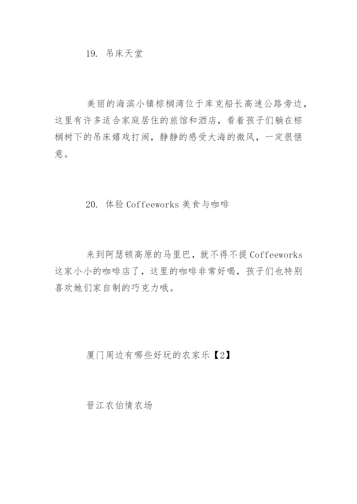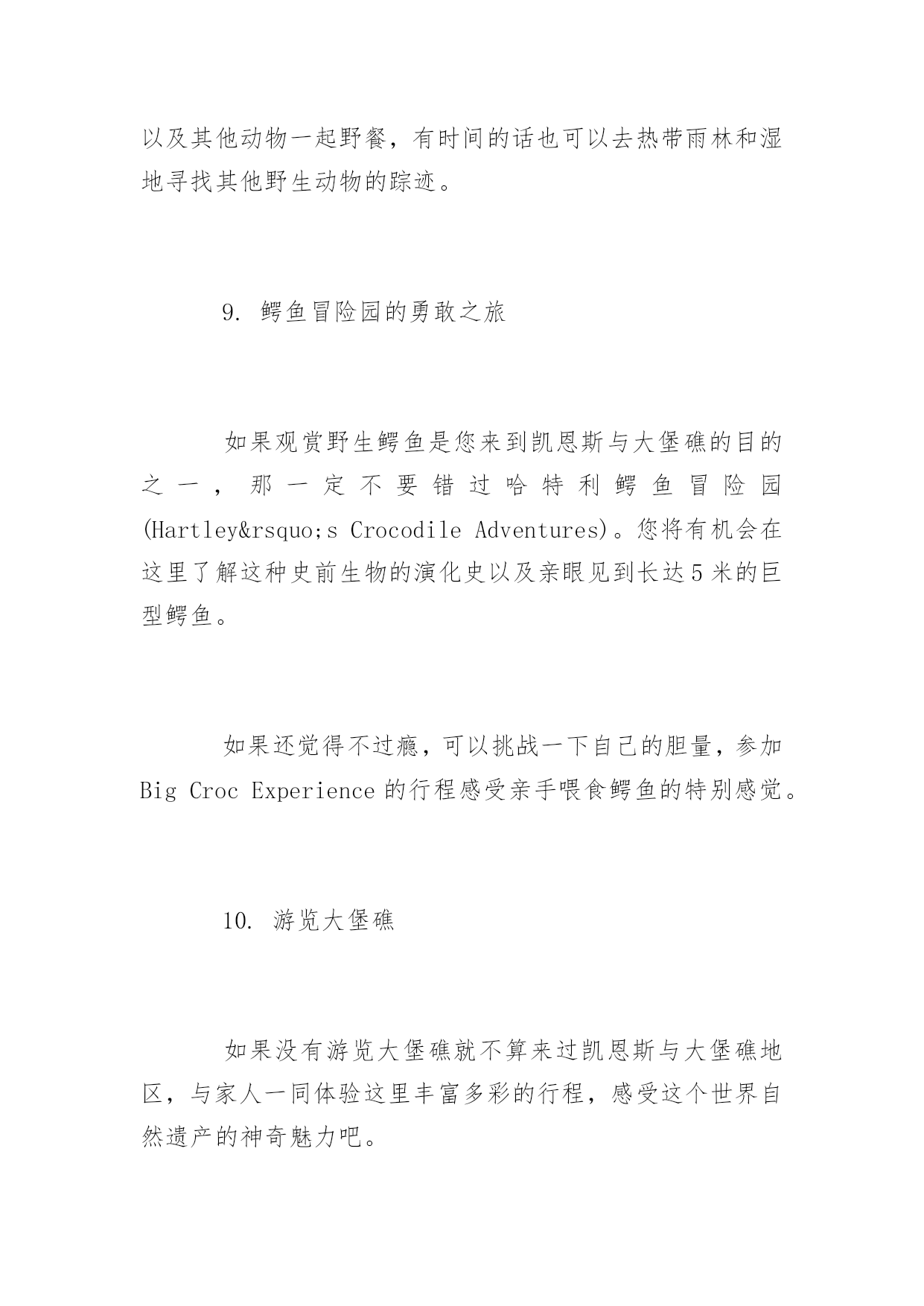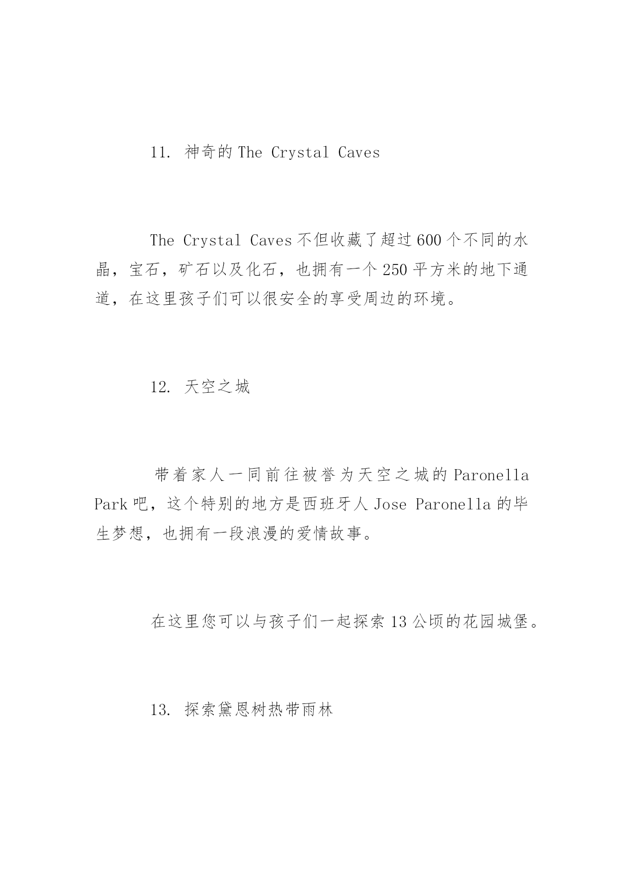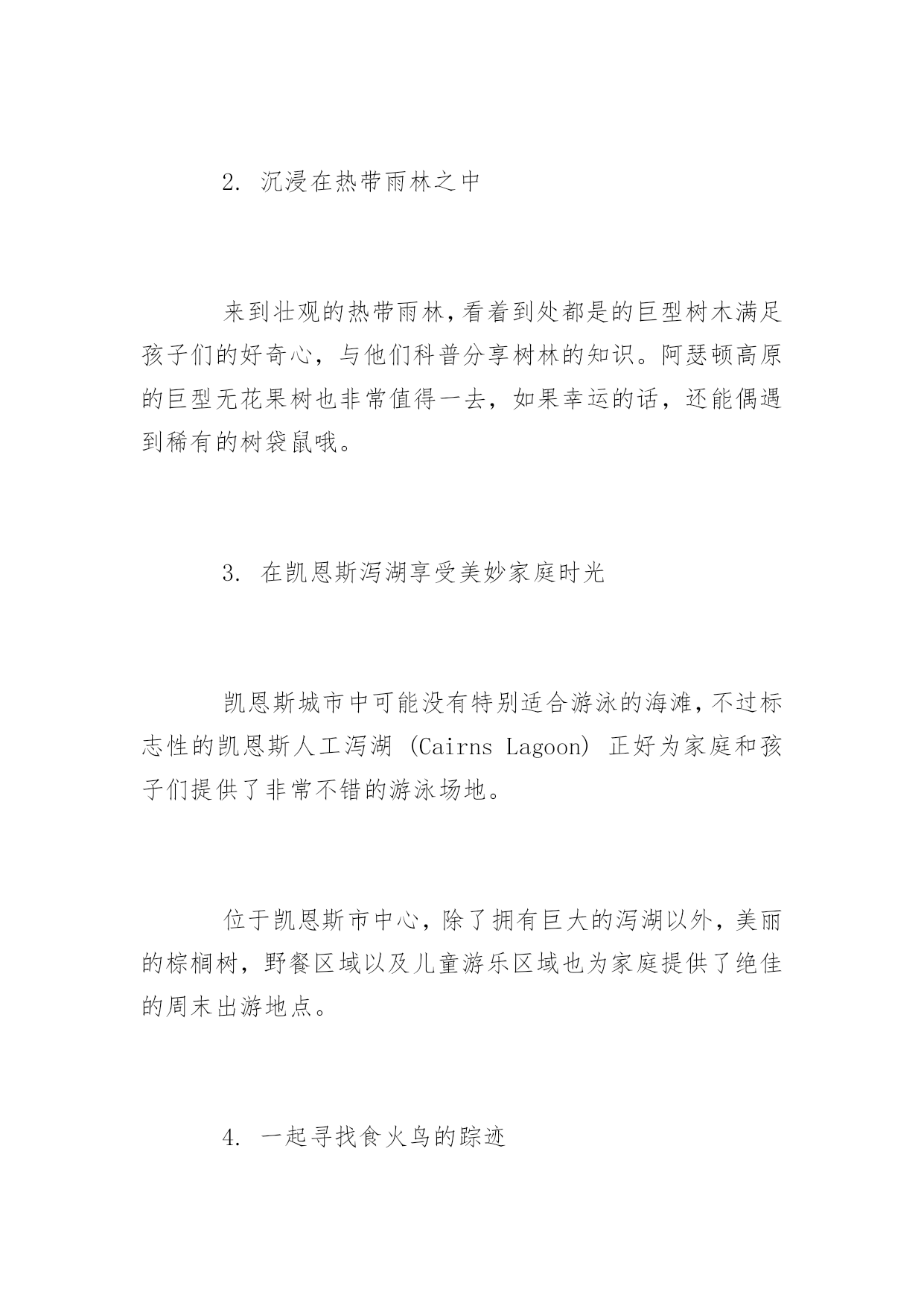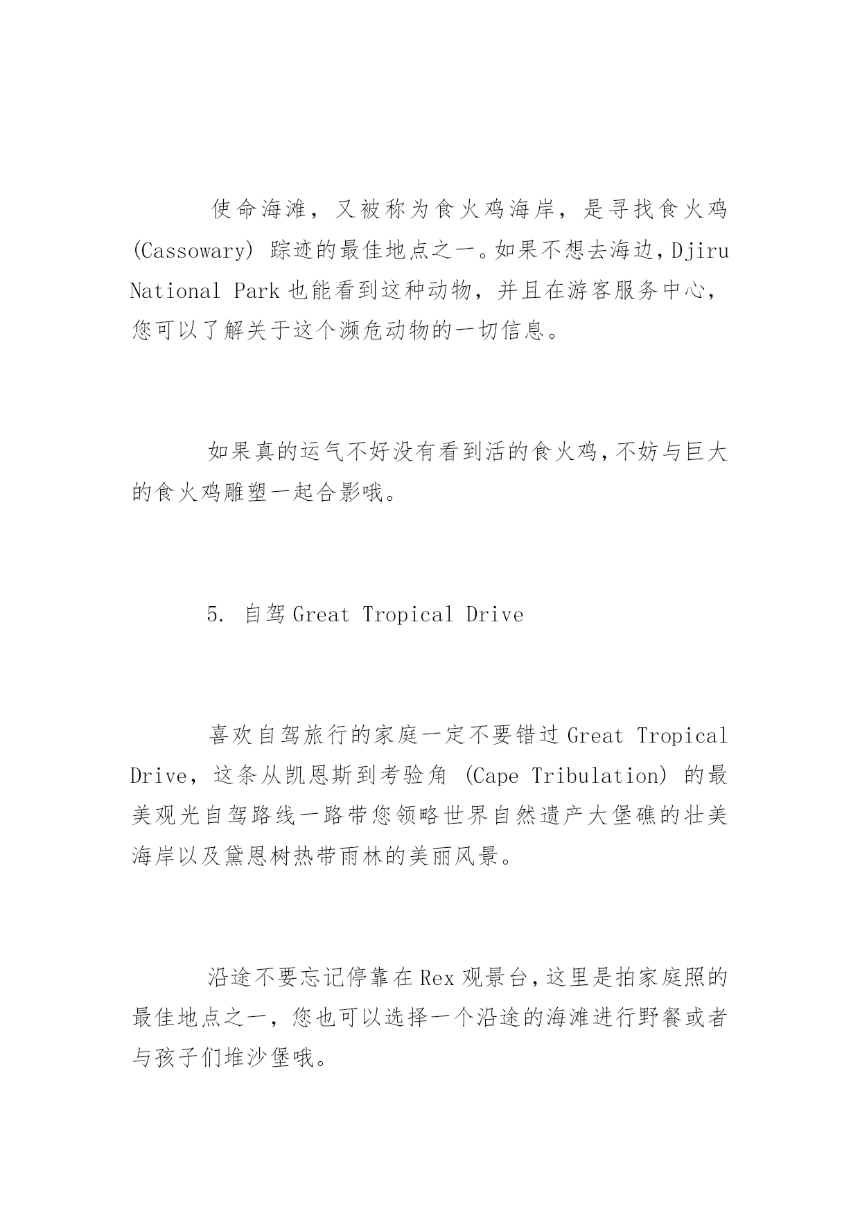 暑假亲子旅游好去处孩子希望过一个难忘的假期,为此,爸爸妈妈们计划好了吗?下面小编整理的暑假亲子旅游好去处。希望可以帮到你们。暑假亲子旅游好去处【1】1.探索史诗级的瀑布景点与孩子们嬉戏,伴随他们快乐成长是家长们每天必做的事情,来到凯恩斯与大堡礁地区,不妨带着孩子们一起追寻大自然的脚步,依次参观来到当地最著名的瀑布,小溪和湖泊,与孩子们一同享受这里得天独厚的美丽风景。我们挑选出了一些非常适合孩子和家庭前往的瀑布:CrystalCascadesCrystalCascades距离凯恩斯非常的近,是当地人周末家庭出游最受欢迎的目的地之一,清澈的河水以及巨大的鹅卵石是您与孩子在水中嬉戏打闹的绝佳场所。景区的洗手间位于停车场,下车以后也只需1.2公里的步行路程即可到达主瀑布,非常方便,您也可以准备一些食物和野餐垫在热带雨林中享受美味的大餐。Tips:靠近停车场的RockPools非常适合孩子们学习游泳哦StoneyCreekFalls这个瀑布比CrystalCascades相对更远一些,不过从停车场出发到达瀑布的距离几乎差不多,也非常方便,不过对于小朋友而言,靠近停车场的湖泊相对安全一些。2.沉浸在热带雨林之中来到壮观的热带雨林,看着到处都是的巨型树木满足孩子们的好奇心,与他们科普分享树林的知识。阿瑟顿高原的巨型无花果树也非常值得一去,如果幸运的话,还能偶遇到稀有的树袋鼠哦。3.在凯恩斯泻湖享受美妙家庭时光凯恩斯城市中可能没有特别适合游泳的海滩,不过标志性的凯恩斯人工泻湖(CairnsLagoon)正好为家庭和孩子们提供了非常不错的游泳场地。位于凯恩斯市中心,除了拥有巨大的泻湖以外,美丽的棕榈树,野餐区域以及儿童游乐区域也为家庭提供了绝佳的周末出游地点。4.一起寻找食火鸟的踪迹使命海滩,又被称为食火鸡海岸,是寻找食火鸡(Cassowary)踪迹的最佳地点之一。如果不想去海边,DjiruNationalPark也能看到这种动物,并且在游客服务中心,您可以了解关于这个濒危动物的一切信息。如果真的运气不好没有看到活的食火鸡,不妨与巨大的食火鸡雕塑一起合影哦。5.自驾GreatTropicalDrive喜欢自驾旅行的家庭一定不要错过GreatTropicalDrive,这条从凯恩斯到考验角(CapeTribulation)的最美观光自驾路线一路带您领略世界自然遗产大堡礁的壮美海岸以及黛恩树热带雨林的美丽风景。沿途不要忘记停靠在Rex观景台,这里是拍家庭照的最佳地点之一,您也可以选择一个沿途的海滩进行野餐或者与孩子们堆沙堡哦。6.一起去库兰达探险如果想要好好的游览热带雨林中的最美小镇库兰达,一定要预留至少一天的时间,体验Skyrail热带雨林缆车的库兰达观光火车的曼妙之旅,并慢慢探索小镇中的历史建筑,集市,蝴蝶保护区以及考拉公园。7.一起抱考拉没有比考拉更萌的动物了,凯恩斯室内穹顶动物园(CairnsZoomandWildlifeDome),您与孩子们不但有机会体验绳索挑战,也能有机会拥抱考拉。8.与鹦鹉共进午餐如果来到道格拉斯港,一定要去道格拉斯港野生动物栖息地(PortDouglasWildlifeHabitat)与可爱的鹦鹉以及其他动物一起野餐,有时间的话也可以去热带雨林和湿地寻找其他野生动物的踪迹。9.鳄鱼冒险园的勇敢之旅如果观赏野生鳄鱼是您来到凯恩斯与大堡礁的目的之一,那一定不要错过哈特利鳄鱼冒险园(Hartley’sCrocodileAdventures)。您将有机会在这里了解这种史前生物的演化史以及亲眼见到长达5米的巨型鳄鱼。如果还觉得不过瘾,可以挑战一下自己的胆量,参加BigCrocExperience的行程感受亲手喂食鳄鱼的特别感觉。10.游览大堡礁如果没有游览大堡礁就不算来过凯恩斯与大堡礁地区,与家人一同体验这里丰富多彩的行程,感受这个世界自然遗产的神奇魅力吧。11.神奇的TheCrystalCavesTheCrystalCaves不但收藏了超过600个不同的水晶,宝石,矿石以及化石,也拥有一个250平方米的地下通道,在这里孩子们可以很安全的享受周边的环境。12.天空之城带着家人一同前往被誉为天空之城的ParonellaPark吧,这个特别的地方是西班牙人JoseParonella的毕生梦想,也拥有一段浪漫的爱情故事。在这里您可以与孩子们一起探索13公顷的花园城堡。13.探索黛恩树热带雨林带着孩子一起前往拥有上亿年历史的黛恩树热带雨林吧,在真正踏上丛林之旅之前,不妨来到位于苦难角的黛恩树探索中心(DaintreeDiscoveryCenter)体验从第一层到树顶步道的特别体验。14.学习当地文化体验两年一次的特别活动LauraDa