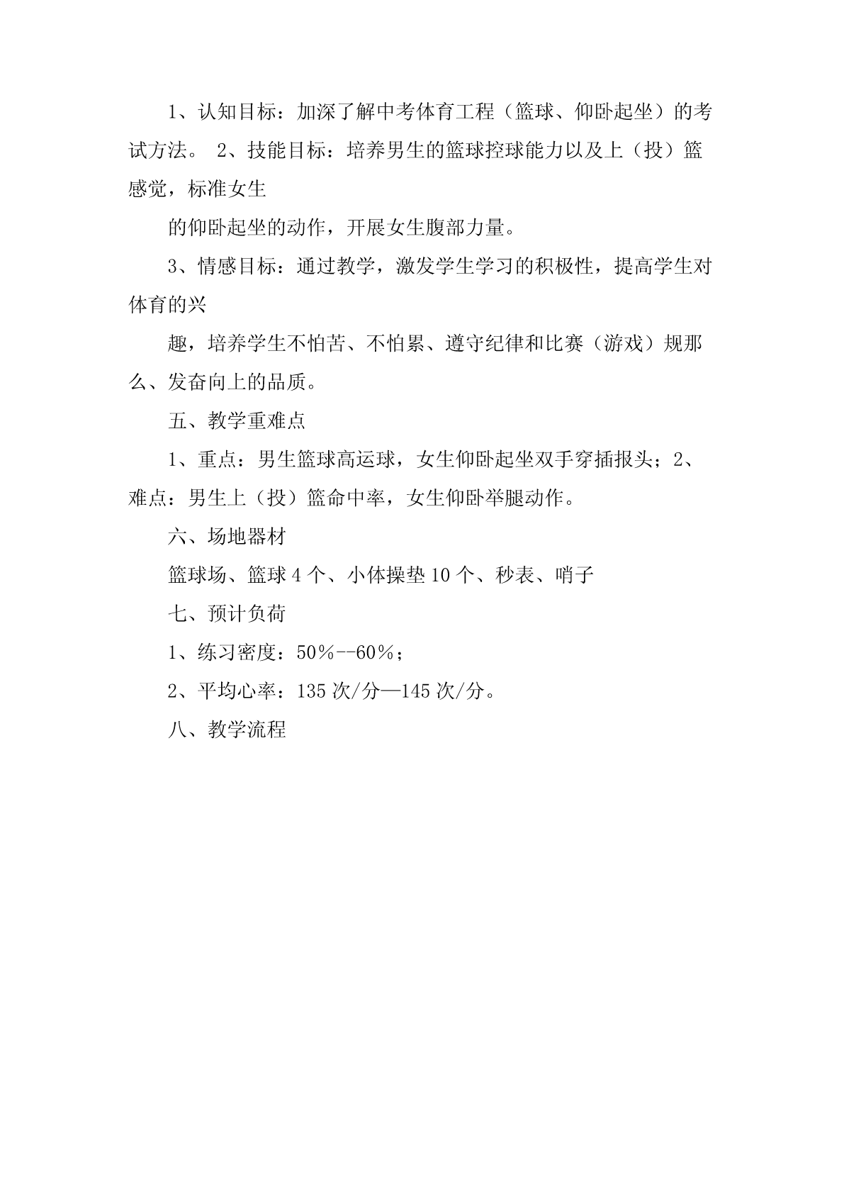 中考体育选项课教案篮球运球上篮、仰卧起坐教学设计一、指导思想本课在《课程标准》的教学理念指导下,全面贯彻“以人为本、安康第一”的指导思想。教学设计上以“培养学生创新精神,开展个性掌握根本技能”为本,本着务实、探索、创新的思路。着眼于改善学生的学习方式,注重学生自身的实践体悟和自主探索。使学生在身、心等方面得到开展和满足。另外注意培养学生的观察、合作、吃苦、耐劳等优良品质,更好的开展学生个性。二、教材分析按照水平四的教学要求,结合深圳市体育中考情况,来安排教学内容,通过本次课的学习(锻炼),开展学生的身体素质和提高根本技能。培养男生的篮球控球能力以及上(投)篮感觉,标准女生的仰卧起坐的动作,开展女生腹部力量。三、学情分析初中学生好动、好学、兴趣广泛、模仿能力强等特点选择教法、学法。根据男生前面已学习并初步具备了行进间单手投篮动作的根底上,本次课先让学生观察老师运球低手上篮的技术以及高运球篮下投篮技术,再让学生根据自己的观察进行练习,在练习中发现问题,然后统一解决问题,再让学生根据自己的特点进行投篮练习,充分发挥自己的技术特点稳固提高上篮的准确性和稳定性。女生之前的体育课已经学习了仰卧起坐,大局部同学可以在一分钟内完成仰卧起坐四十次,但动作不够标准。本次课旨在标准女生的动作,提高动作质量。四、教学目标1、认知目标:加深了解中考体育工程(篮球、仰卧起坐)的考试方法。2、技能目标:培养男生的篮球控球能力以及上(投)篮感觉,标准女生的仰卧起坐的动作,开展女生腹部力量。3、情感目标:通过教学,激发学生学习的积极性,提高学生对体育的兴趣,培养学生不怕苦、不怕累、遵守纪律和比赛(游戏)规那么、发奋向上的品质。五、教学重难点1、重点:男生篮球高运球,女生仰卧起坐双手穿插报头;2、难点:男生上(投)篮命中率,女生仰卧举腿动作。六、场地器材篮球场、篮球4个、小体操垫10个、秒表、哨子七、预计负荷1、练习密度:50%--60%;2、平均心率:135次/分—145次/分。八、教学流程