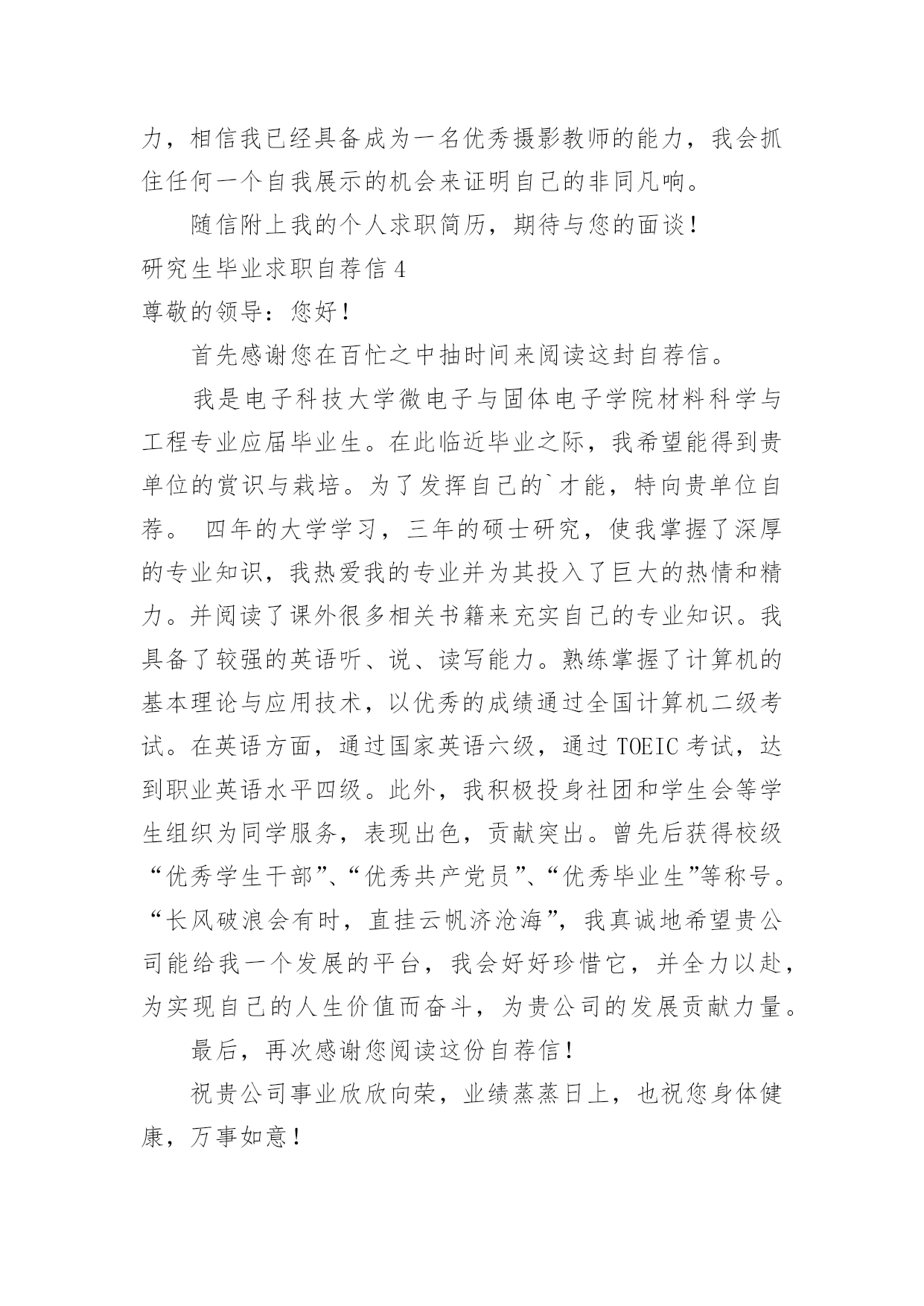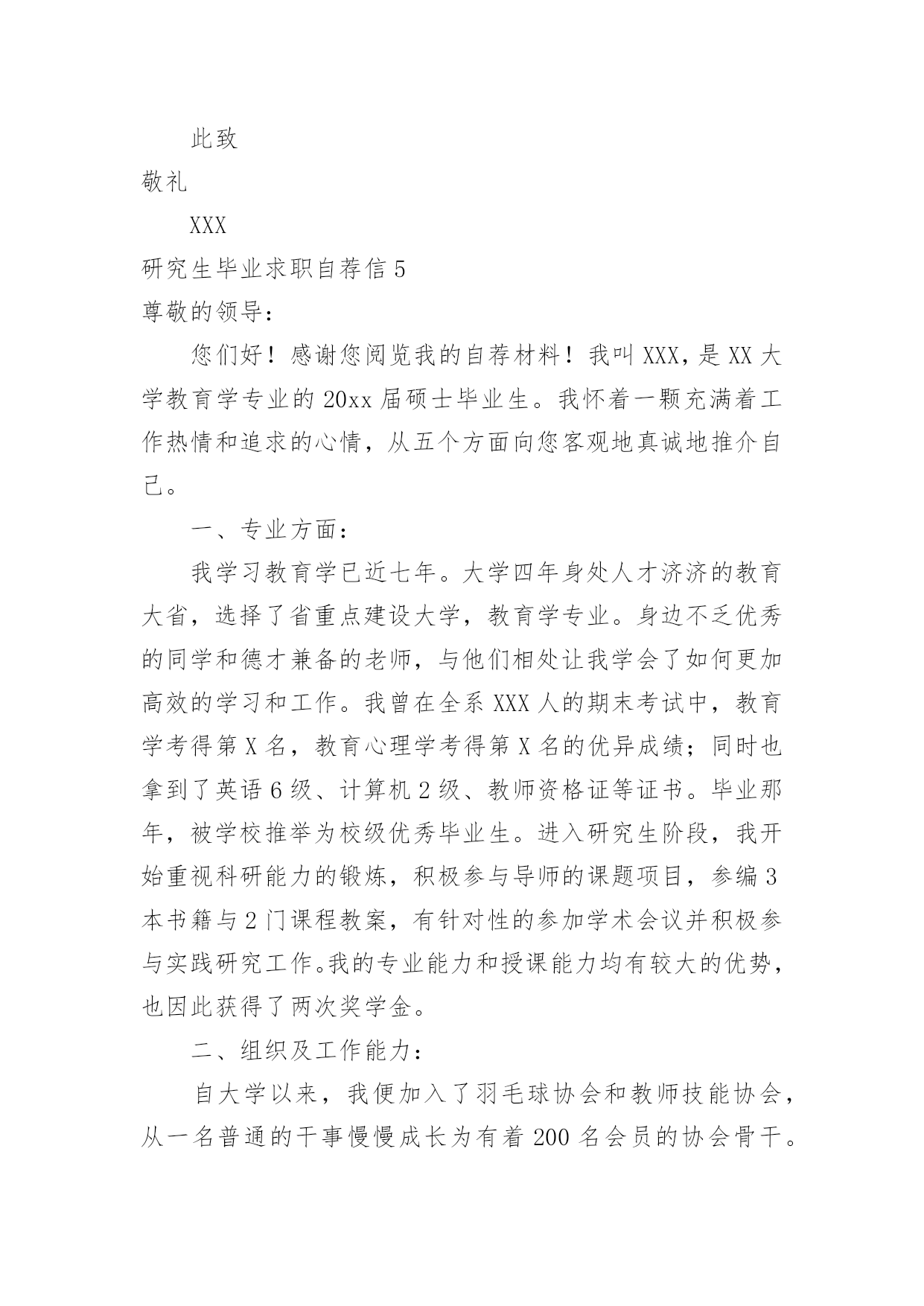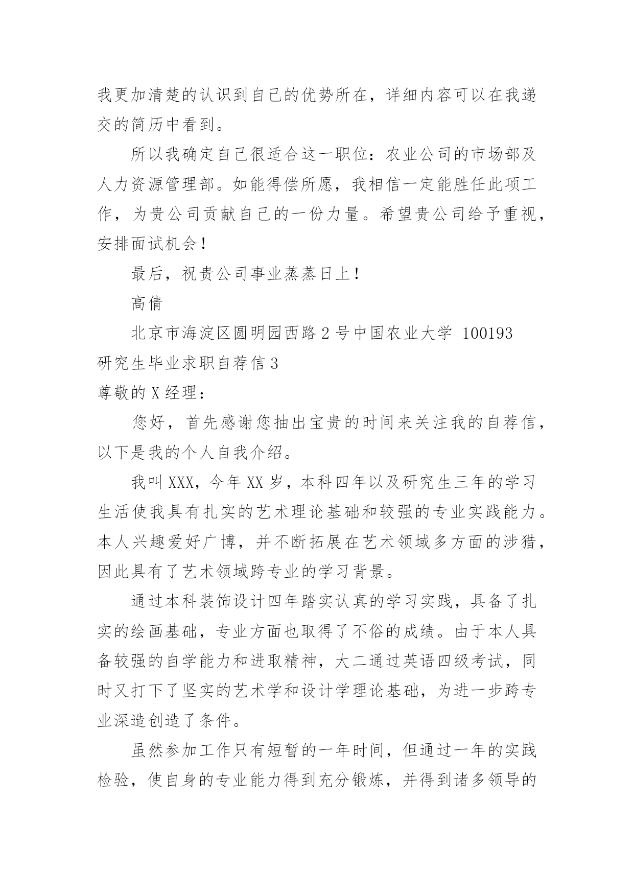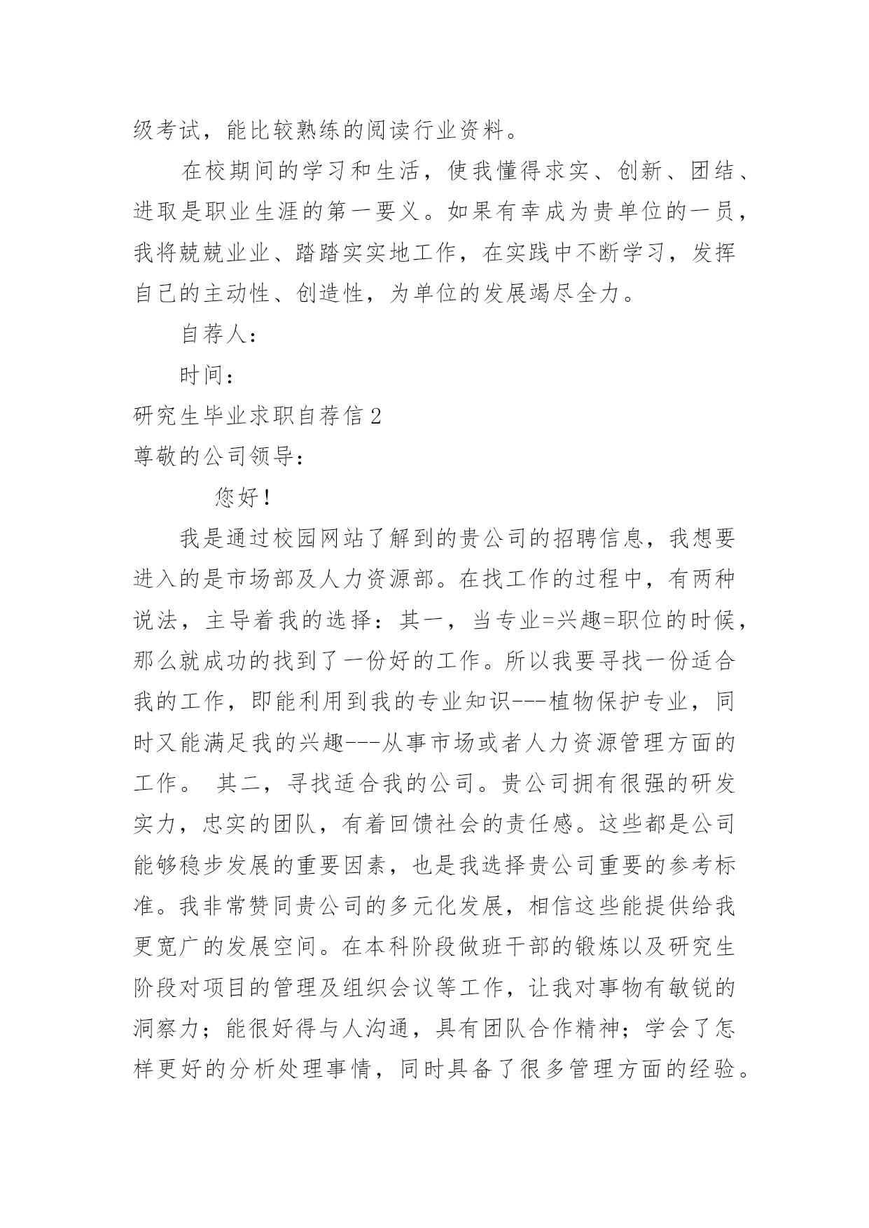 研究生毕业求职自荐信研究生毕业求职自荐信在当今不断发展的世界,自荐信在现实生活中使用广泛,在写作上,自荐信也具有一定的格式。想必许多人都在为如何写好自荐信而烦恼吧,以下是小编整理的研究生毕业求职自荐信,仅供参考,希望能够帮助到大家。研究生毕业求职自荐信1尊敬的领导:我是XX大学土木工程学院工程力学专业20xx届硕士研究生,将于20xx年X月毕业,很想成为XX设计研究院的一员,谨向您推荐自己。在本科四年和保送研究生的三年期间,本着“艰苦朴素、实事求是、严格要求、勇于探索”的校训严格要求自己,学习刻苦,工作认真,成绩优秀,年年获得奖学金,并积极参加社会实践。系统地学习专业知识的同时广泛地涉猎了大量书籍,不断拓宽知识面和社会阅历,积极参与生产和科研项目。我的计算机和英语水平良好。计算机通过了计算机国家二级,能熟练地运用VB、VC、Fortran语言编制程序,并为同学和自己编制过不少实用的程序;能熟练使用AutoCAD、ANSYS、Flac、Abaqus等专业软件。英语通过了大学英语四级考试,能比较熟练的阅读行业资料。在校期间的学习和生活,使我懂得求实、创新、团结、进取是职业生涯的第一要义。如果有幸成为贵单位的一员,我将兢兢业业、踏踏实实地工作,在实践中不断学习,发挥自己的主动性、创造性,为单位的发展竭尽全力。自荐人:时间:研究生毕业求职自荐信2尊敬的公司领导:您好!我是通过校园网站了解到的贵公司的招聘信息,我想要进入的是市场部及人力资源部。在找工作的过程中,有两种说法,主导着我的选择:其一,当专业=兴趣=职位的时候,那么就成功的找到了一份好的工作。所以我要寻找一份适合我的工作,即能利用到我的专业知识---植物保护专业,同时又能满足我的兴趣---从事市场或者人力资源管理方面的工作。其二,寻找适合我的公司。贵公司拥有很强的研发实力,忠实的团队,有着回馈社会的责任感。这些都是公司能够稳步发展的重要因素,也是我选择贵公司重要的参考标准。我非常赞同贵公司的多元化发展,相信这些能提供给我更宽广的发展空间。在本科阶段做班干部的锻炼以及研究生阶段对项目的管理及组织会议等工作,让我对事物有敏锐的洞察力;能很好得与人沟通,具有团队合作精神;学会了怎样更好的分析处理事情,同时具备了很多管理方面的经验。我更加清楚的认识到自己的优势所在,详细内容可以在我递交的简历中看到。所以我确定自己很适合这一职位:农业公司的市场部及人力资源管理部。如能得偿所愿,我相信一定能胜任此项工作,为贵公司贡献自己的一份力量。希望贵公司给予重视,安排面试机会!最后,祝贵公司事业蒸蒸日上!高倩北京市海淀区圆明园西路2号中国农业大学100193研究生毕业求职自荐信3尊敬的X经理:您好,首先感谢您抽出宝贵的时间来关注我的自荐信,以下是我的个人自我介绍。我叫XXX,今年XX岁,本科四年以及研究生三年的学习生活使我具有扎实的艺术理论基础和较强的专业实践能力。本人兴趣爱好广博,并不断拓展在艺术领域多方面的涉猎,因此具有了艺术领域跨专业的学习背景。通过本科装饰设计四年踏实认真的学习实践,具备了扎实的绘画基础,专业方面也取得了不俗的成绩。由于本人具备较强的自学能力和进取精神,大二通过英语四级考试,同时又打下了坚实的艺术学和设计学理论基础,为进一步跨专业深造创造了条件。虽然参加工作只有短暂的一年时间,但通过一年的实践检验,使自身的专业能力得到充分锻炼,并得到诸多领导的认可。期间计算机应用水平和能力也得到了飞速提高,同时明确了自身的发展方向,以及希望在专业方面的提升,使我下定决心继续求学深造,以期在专业领域有更大突破。工作也培养了自己的社交能力和团队合作精神,而且在读研期间担任班长一职,积极配合学校和系里的工作,积极组织参加各项活动,由于具有较强的亲和力和组织能力,受到同学及学校的好评。本人工作踏实认真,责任心和上进心强。在三年的摄影专业研究生学习期间,通过了英语六级考试,并在导师的引导和自身不断努力探索下,寻找到了专业方向的切入点——插图摄影,这一领域在传媒较发达国家已得到广泛认可,但在国内特别是理论方面却为空白。通过三年的理论研究和实践学习,我发现了它在国内广阔的发展前景,并希望通过探索总结,使其得到理论和实践的广泛认可,以填补这一空白。为了使自己在毕业后能尽快适应并胜任工作,在读研期间积极参与各项教学实践工作。在学校曾协助导师陈宝生教授完成国家教委对美院教学评估的筹备工作,并担任本科课程的教学助理,参与教学指导以及学生作品的评定工作。在校外被聘为摄影师职业资格认证培训工作教师,并担任了中、高级班的主讲培训工作。我一直相信,要取得成功不能只凭借一点天分,还要有超乎常人的塌实认真精神,只有这样才能使自身在专业领域获得突破,并在竞争中取得优势,这也是我对自己的一贯要求。通过多年的学习和实践积累,以及
