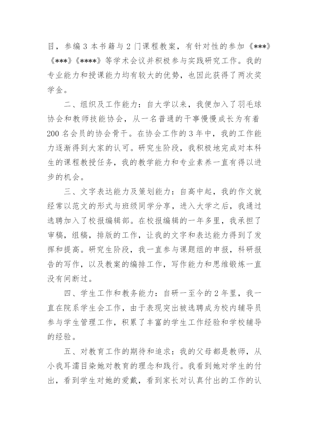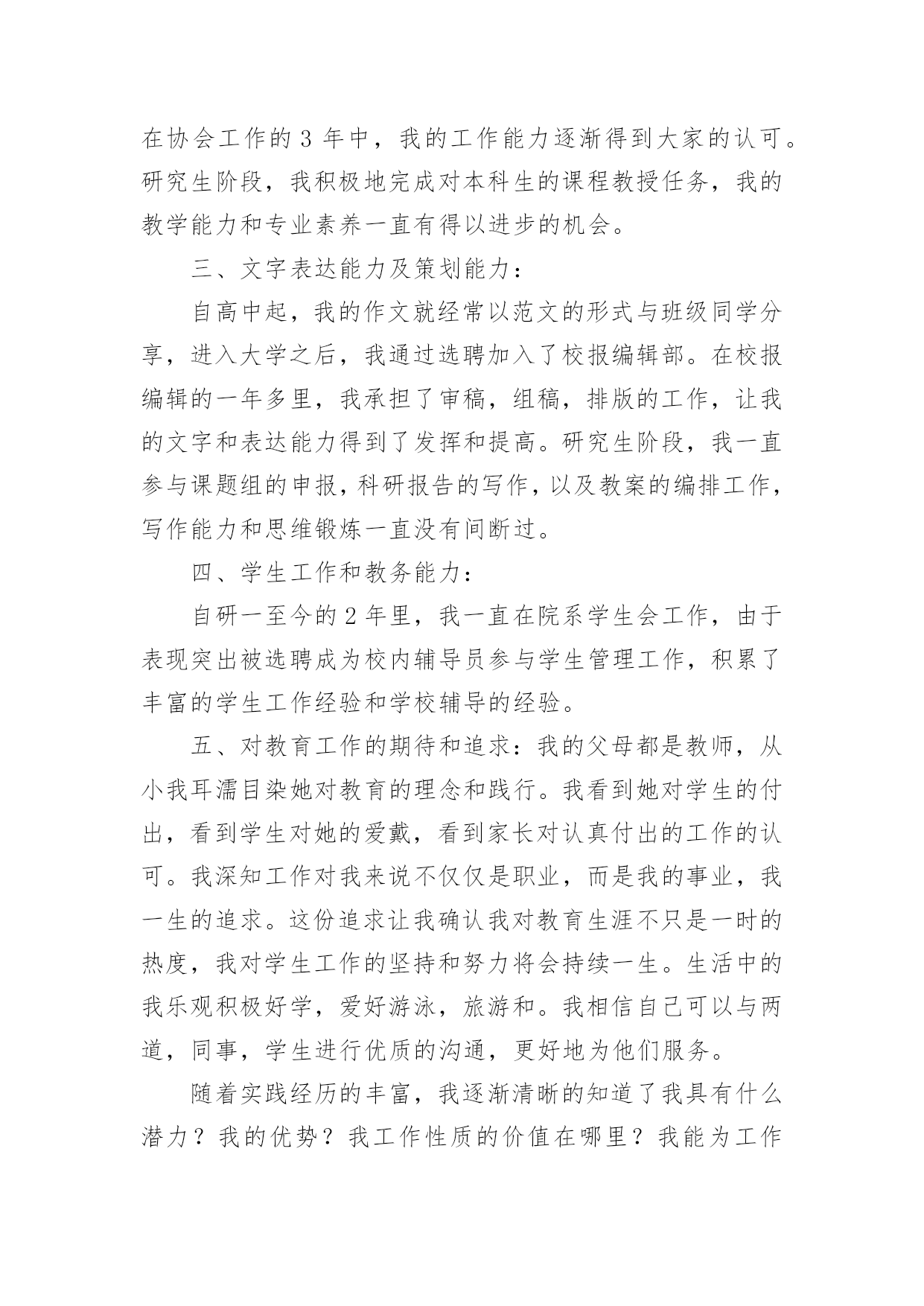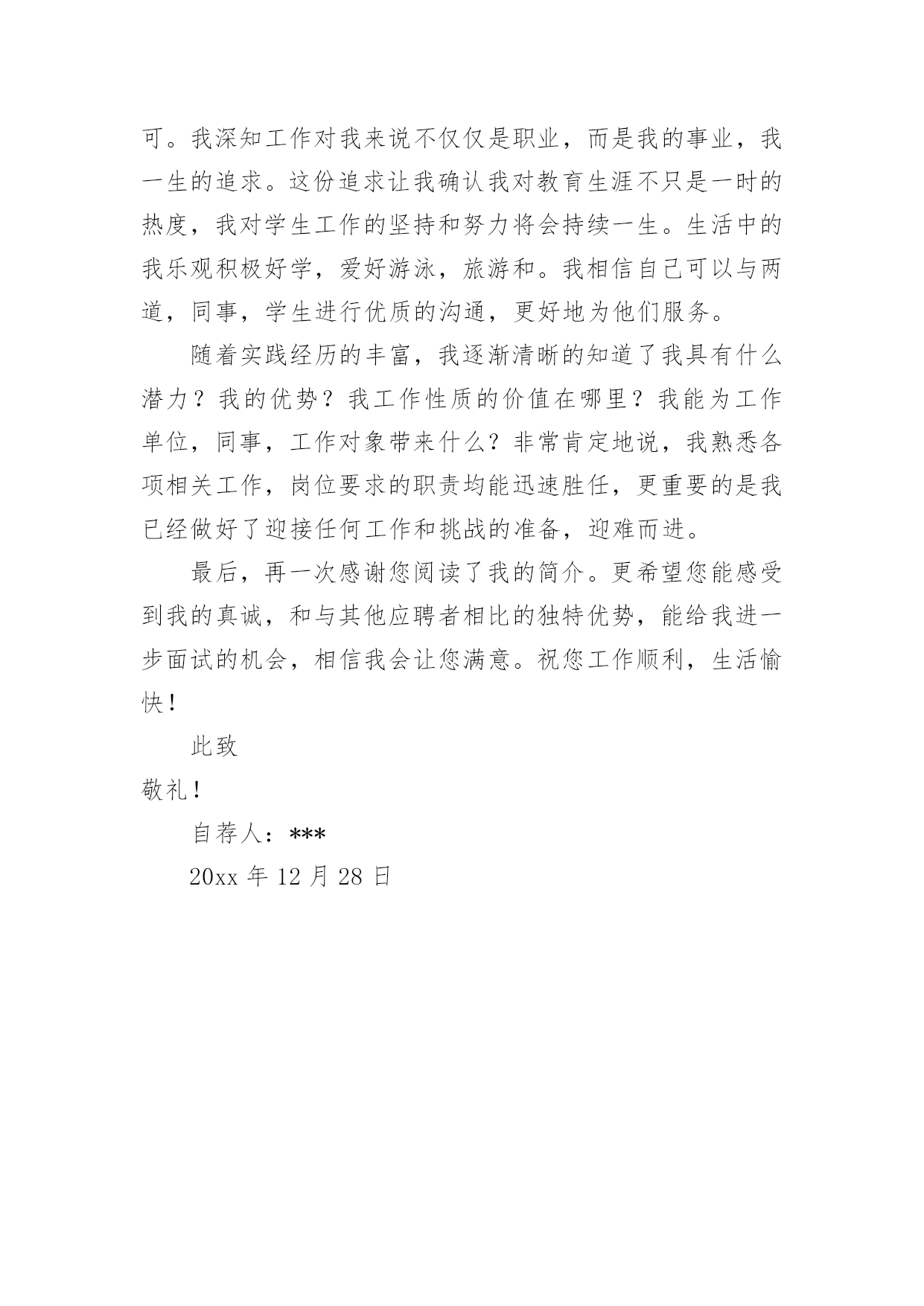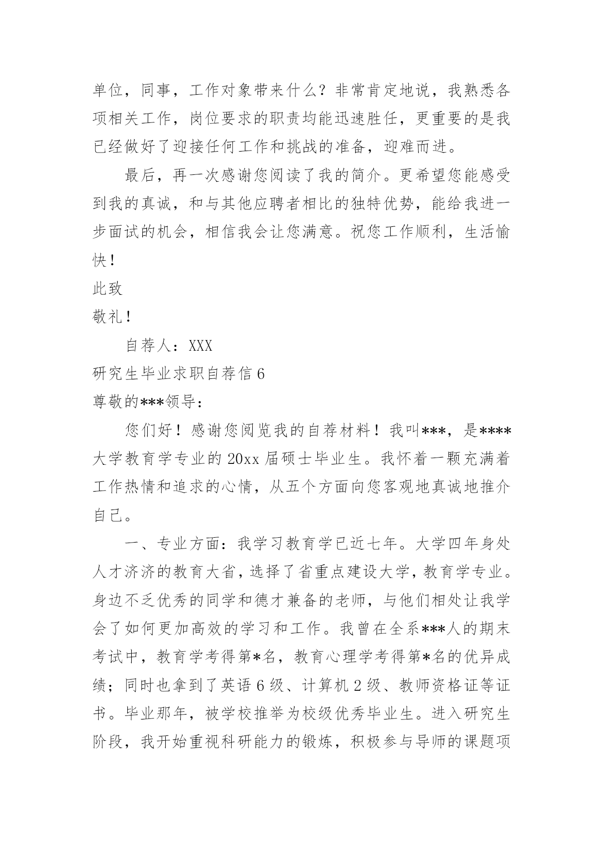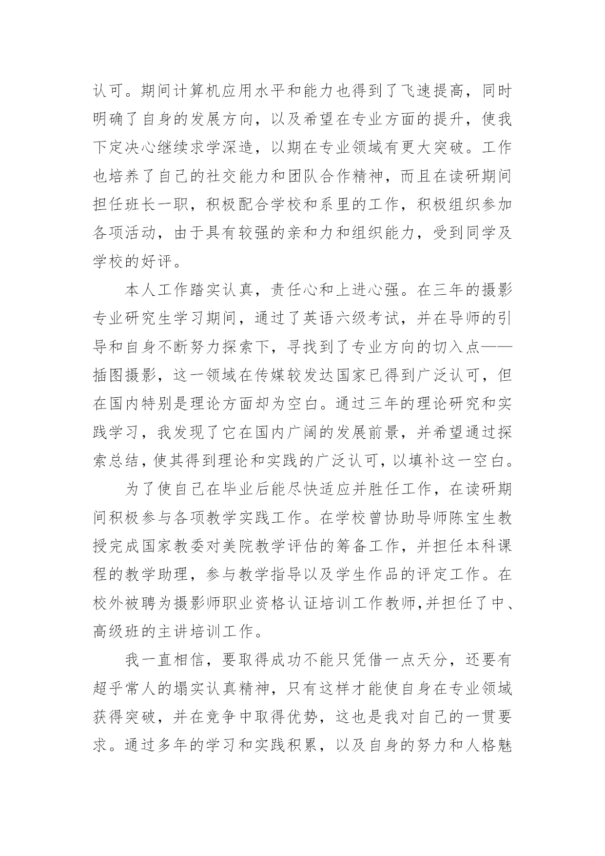研究生毕业求职自荐信研究生毕业求职自荐信在当今不断发展的世界,自荐信在现实生活中使用广泛,在写作上,自荐信也具有一定的格式。想必许多人都在为如何写好自荐信而烦恼吧,以下是小编整理的研究生毕业求职自荐信,仅供参考,希望能够帮助到大家。研究生毕业求职自荐信1尊敬的领导:我是XX大学土木工程学院工程力学专业20xx届硕士研究生,将于20xx年X月毕业,很想成为XX设计研究院的一员,谨向您推荐自己。在本科四年和保送研究生的三年期间,本着“艰苦朴素、实事求是、严格要求、勇于探索”的校训严格要求自己,学习刻苦,工作认真,成绩优秀,年年获得奖学金,并积极参加社会实践。系统地学习专业知识的同时广泛地涉猎了大量书籍,不断拓宽知识面和社会阅历,积极参与生产和科研项目。我的计算机和英语水平良好。计算机通过了计算机国家二级,能熟练地运用VB、VC、Fortran语言编制程序,并为同学和自己编制过不少实用的程序;能熟练使用AutoCAD、ANSYS、Flac、Abaqus等专业软件。英语通过了大学英语四级考试,能比较熟练的阅读行业资料。在校期间的学习和生活,使我懂得求实、创新、团结、进取是职业生涯的第一要义。如果有幸成为贵单位的一员,我将兢兢业业、踏踏实实地工作,在实践中不断学习,发挥自己的主动性、创造性,为单位的发展竭尽全力。自荐人:时间:研究生毕业求职自荐信2尊敬的公司领导:您好!我是通过校园网站了解到的贵公司的招聘信息,我想要进入的是市场部及人力资源部。在找工作的过程中,有两种说法,主导着我的选择:其一,当专业=兴趣=职位的时候,那么就成功的找到了一份好的工作。所以我要寻找一份适合我的工作,即能利用到我的专业知识---植物保护专业,同时又能满足我的兴趣---从事市场或者人力资源管理方面的工作。其二,寻找适合我的公司。贵公司拥有很强的研发实力,忠实的团队,有着回馈社会的责任感。这些都是公司能够稳步发展的重要因素,也是我选择贵公司重要的参考标准。我非常赞同贵公司的多元化发展,相信这些能提供给我更宽广的发展空间。在本科阶段做班干部的锻炼以及研究生阶段对项目的管理及组织会议等工作,让我对事物有敏锐的洞察力;能很好得与人沟通,具有团队合作精神;学会了怎样更好的分析处理事情,同时具备了很多管理方面的经验。我更加清楚的认识到自己的优势所在,详细内容可以在我递交的简历中看到。所以我确定自己很适合这一职位:农业公司的市场部及人力资源管理部。如能得偿所愿,我相信一定能胜任此项工作,为贵公司贡献自己的一份力量。希望贵公司给予重视,安排面试机会!最后,祝贵公司事业蒸蒸日上!高倩北京市海淀区圆明园西路2号中国农业大学100193研究生毕业求职自荐信3尊敬的X经理:您好,首先感谢您抽出宝贵的时间来关注我的自荐信,以下是我的个人自我介绍。我叫XXX,今年XX岁,本科四年以及研究生三年的学习生活使我具有扎实的艺术理论基础和较强的专业实践能力。本人兴趣爱好广博,并不断拓展在艺术领域多方面的涉猎,因此具有了艺术领域跨专业的学习背景。通过本科装饰设计四年踏实认真的学习实践,具备了扎实的绘画基础,专业方面也取得了不俗的成绩。由于本人具备较强的自学能力和进取精神,大二通过英语四级考试,同时又打下了坚实的艺术学和设计学理论基础,为进一步跨专业深造创造了条件。虽然参加工作只有短暂的一年时间,但通过一年的实践检验,使自身的专业能力得到充分锻炼,并得到诸多领导的认可。期间计算机应用水平和能力也得到了飞速提高,同时明确了自身的发展方向,以及希望在专业方面的提升,使我下定决心继续求学深造,以期在专业领域有更大突破。工作也培养了自己的社交能力和团队合作精神,而且在读研期间担任班长一职,积极配合学校和系里的工作,积极组织参加各项活动,由于具有较强的亲和力和组织能力,受到同学及学校的好评。本人工作踏实认真,责任心和上进心强。在三年的摄影专业研究生学习期间,通过了英语六级考试,并在导师的引导和自身不断努力探索下,寻找到了专业方向的切入点——插图摄影,这一领域在传媒较发达国家已得到广泛认可,但在国内特别是理论方面却为空白。通过三年的理论研究和实践学习,我发现了它在国内广阔的发展前景,并希望通过探索总结,使其得到理论和实践的广泛认可,以填补这一空白。为了使自己在毕业后能尽快适应并胜任工作,在读研期间积极参与各项教学实践工作。在学校曾协助导师陈宝生教授完成国家教委对美院教学评估的筹备工作,并担任本科课程的教学助理,参与教学指导以及学生作品的评定工作。在校外被聘为摄影师职业资格认证培训工作教师,并担任了中、高级班的主讲培训工作。我一直相信,要取得成功不能只凭借一点天分,还要有超乎常人的塌实认真精神,只有这样才能使自身在专业领域获得突破,并在竞争中取得优势,这也是我对自己的一贯要求。通过多年的学习和实践积累,以及