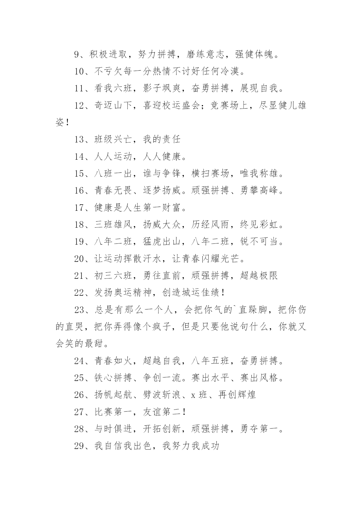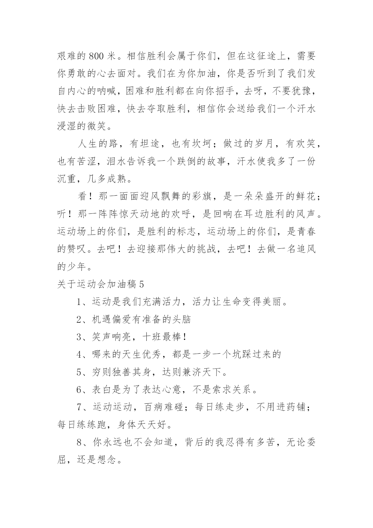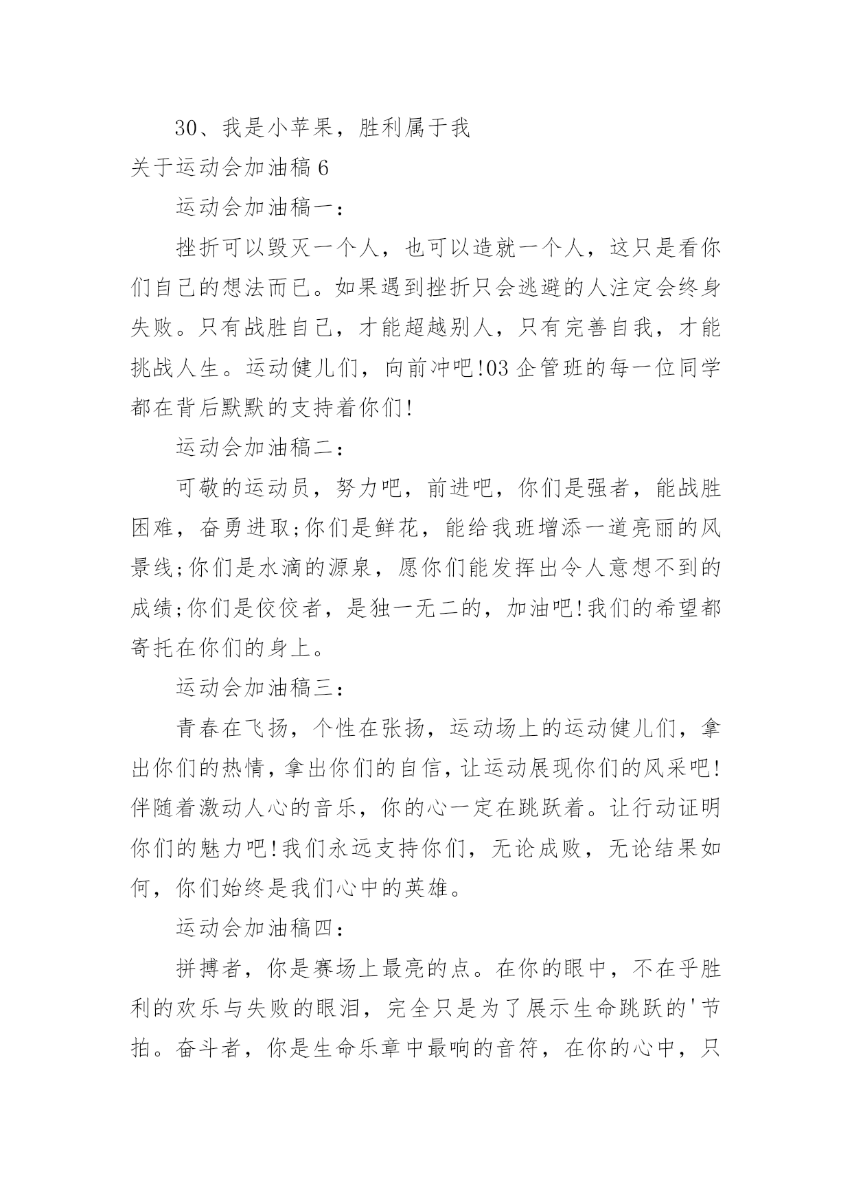 运动会加油稿关于运动会加油稿15篇在当下社会,我们都跟加油稿有着直接或间接的联系,加油稿可以激励对方更好地参加活动。怎样写加油稿才能更好地发挥其做用呢?以下是小编精心整理的关于运动会加油稿,仅供参考,大家一起来看看吧。关于运动会加油稿1800米,有一个人生的起点800米,有一个人生的弯道。800米,有一段人生的冲刺800米,有一个辉煌的胜利。800米,只刹那一瞬间却成就一段永恒的胜利。800米,只弯过一个转折却折出多少汗水。冲向你那光辉煌的胜利吧跨过那一瞬。转过那道弯胜利在向你招手。磨炼的`是非凡的毅力,较量的是超常的体力,拼搏的是出类拔萃的耐力。把长长的跑道跑成一段漫漫的征途,听!呼啸的风在为你喝彩,看!猎猎的彩旗在为你加油,加油吧!在跑道的尽头你奋力的冲刺,你让我们知道了什么是拼搏,什么事激情,加油吧,让所有的人目击你们胜出的那刹那瞬间,让所有的人为你们而骄傲!关于运动会加油稿2茫茫的跑道中,你把自己青春活力尽情挥洒。长长的跑道上,留下了你深深的足迹。抹不去你渗出的汗水,拉不动你沉重的.双脚。为了集体的荣耀,你不在乎自己疲惫,不在乎泪水和汗水,凭借着一股坚定的信念勇往直前。加油吧,终点就在眼前!关于运动会加油稿3运动场上有你飒爽的.英姿,运动场上有你拼搏的身影。面对着漫漫征途,你没有畏惧和退缩。任汗水大湿脊背,任疲惫爬满全身,你依然奋力追赶,只有一个目标,只有一个信念。为了班级的荣誉,拼搏吧,让我为你们呐喊。关于运动会加油稿4不长不短的距离,需要的是全身心全程投入;自始至终,你们都在拼全力;此时此刻,你们处在最风光的一刻;无论第几,坚持胜利的信心,只要跑下来,你们就是英雄!大海如此的浩淼,鼓声多么美妙,运动员们,你们不再像平时那样渺小,我们默默的祈祷,以你们为骄傲,我们会永远为你们叫好!运动场上有你们的飒爽英姿,运动场上有你们拼搏的身影,面对漫漫的征程,你没有畏惧和退缩,任汗水打湿脊背,任疲惫爬满全身,依然奋力追赶,只有一个目标,只有一个信念,为班级赢得荣誉,拼搏吧,我为你们呐喊,加油!面对艰苦的征程,你们毫不畏惧,接力棒在你们手中传递着集体的力量,听,我们在为你呐喊,你们诠释着奥运的精神,你们是我们心中的骄傲,深深的呼吸,等待你的.是艰难的800米。相信胜利会属于你们,但在这征途上,需要你勇敢的心去面对。我们在为你加油,你是否听到了我们发自内心的呐喊,困难和胜利都在向你招手,去呀,不要犹豫,快去击败困难,快去夺取胜利,相信你会送给我们一个汗水浸湿的微笑。人生的路,有坦途,也有坎坷;做过的岁月,有欢笑,也有苦涩,泪水告诉我一个跌倒的故事,汗水使我多了一份沉重,几多成熟。看!那一面面迎风飘舞的彩旗,是一朵朵盛开的鲜花;听!那一阵阵惊天动地的欢呼,是回响在耳边胜利的风声。运动场上的你们,是胜利的标志,运动场上的你们,是青春的赞叹。去吧!去迎接那伟大的挑战,去吧!去做一名追风的少年。关于运动会加油稿51、运动是我们充满活力,活力让生命变得美丽。2、机遇偏爱有准备的头脑3、笑声响亮,十班最棒!4、哪来的天生优秀,都是一步一个坑踩过来的5、穷则独善其身,达则兼济天下。6、表白是为了表达心意,不是索求关系。7、运动运动,百病难碰;每日练走步,不用进药铺;每日练练跑,身体天天好。8、你永远也不会知道,背后的我忍得有多苦,无论委屈,还是想念。9、积极进取,努力拼搏,磨练意志,强健体魄。10、不亏欠每一分热情不讨好任何冷漠。11、看我六班,影子飒爽,奋勇拼搏,展现自我。12、奇迈山下,喜迎校运盛会;竞赛场上,尽显健儿雄姿!13、班级兴亡,我的责任14、人人运动,人人健康。15、八班一出,谁与争锋,横扫赛场,唯我称雄。16、青春无畏、逐梦扬威。顽强拼搏、勇攀高峰。17、健康是人生第一财富。18、三班雄风,扬威大众,历经风雨,终见彩虹。19、八年二班,猛虎出山,八年二班,锐不可当。20、让运动挥散汗水,让青春闪耀光芒。21、初三六班,勇往直前,顽强拼搏,超越极限22、发扬奥运精神,创造城运佳绩!23、总是有那么一个人,会把你气的`直跺脚,把你伤的直哭,把你弄得像个疯子,但是只要他说句什么,你就又会笑的最甜。24、青春如火,超越自我,八年五班,奋勇拼搏。25、铁心拼搏、争创一流。赛出水平、赛出风格。26、扬帆起航、劈波斩浪、x班、再创辉煌27、比赛第一,友谊第二!28、与时俱进,开拓创新,顽强拼搏,勇夺第一。29、我自信我出色,我努力我成功30、我是小苹果,胜利属于我关于运动会加油稿6运动会加油稿一:挫折可以毁灭一个人,也可以造就一个人,这只是看你们自己的想法而已。如果遇到挫折只会逃避的人注定会终身失败。只有战胜自己,才能超越别人,只有完善自我,才能挑战人生。运动健儿们,向前冲吧!03企管班的每一位同学都在背后默默的支持着你们!运动会加油稿二