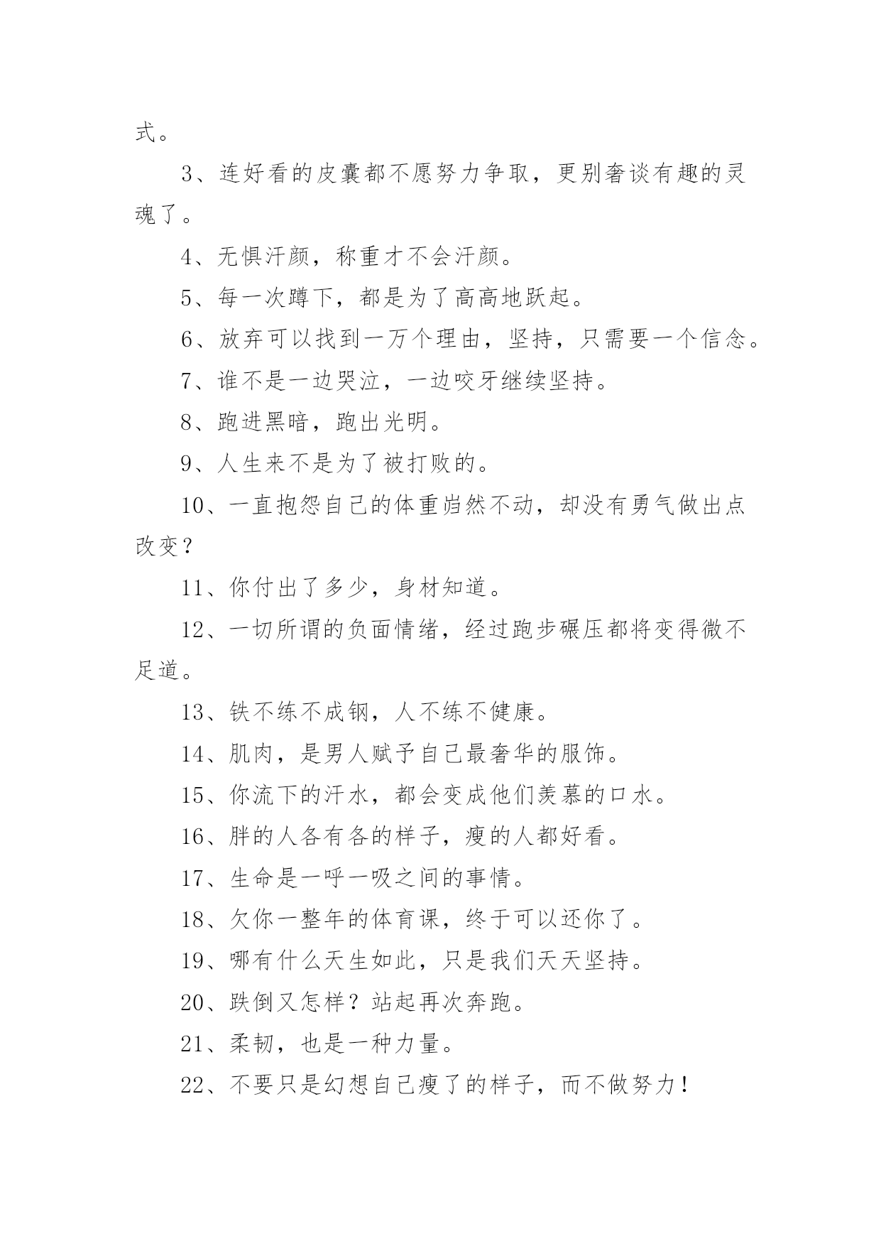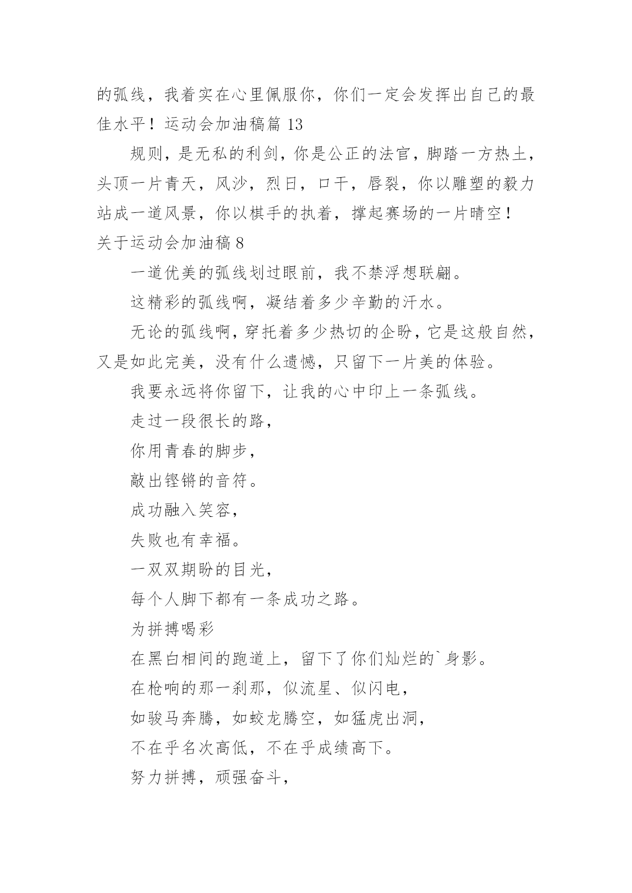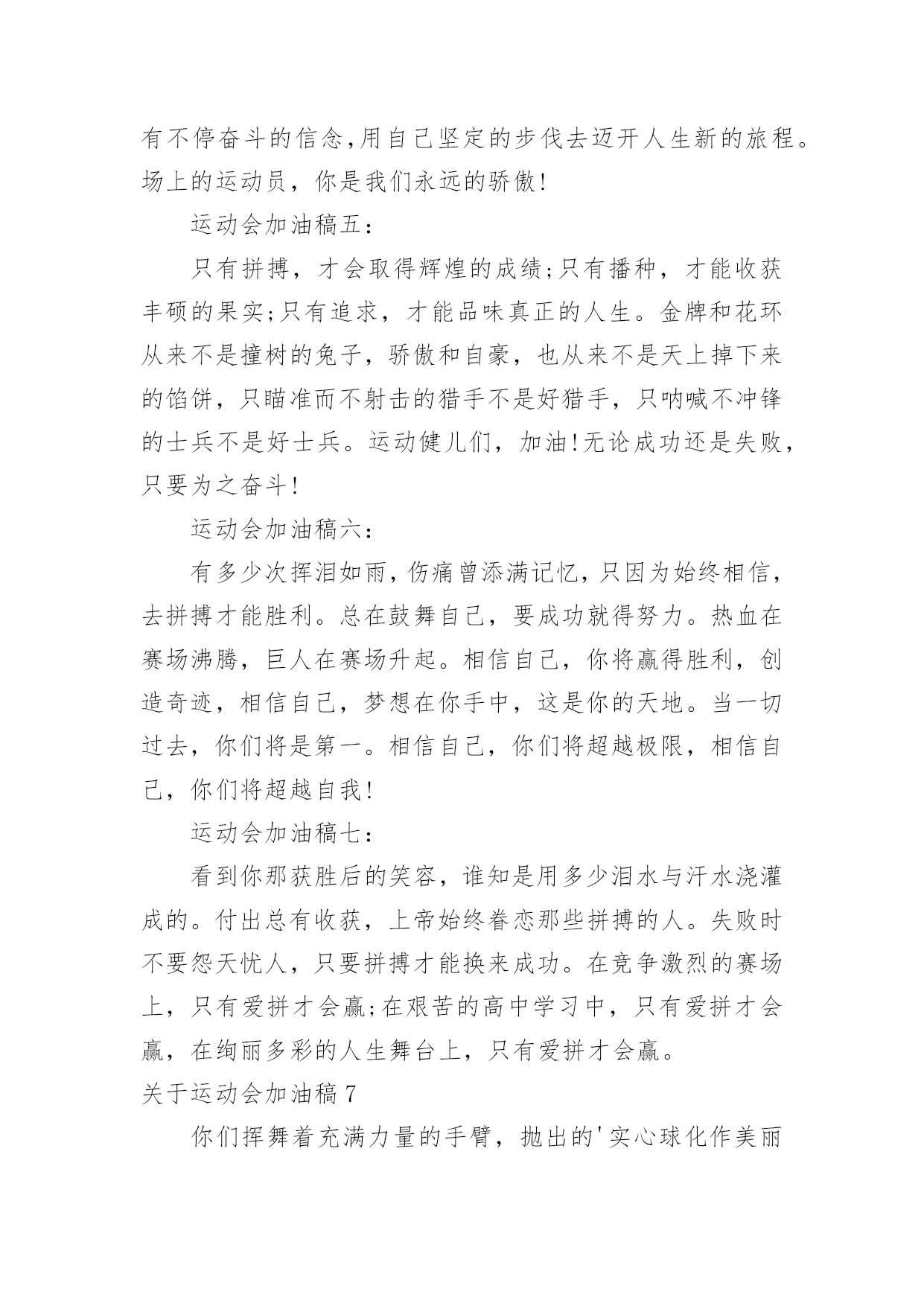 运动会加油稿关于运动会加油稿15篇在当下社会,我们都跟加油稿有着直接或间接的联系,加油稿可以激励对方更好地参加活动。怎样写加油稿才能更好地发挥其做用呢?以下是小编精心整理的关于运动会加油稿,仅供参考,大家一起来看看吧。关于运动会加油稿1800米,有一个人生的起点800米,有一个人生的弯道。800米,有一段人生的冲刺800米,有一个辉煌的胜利。800米,只刹那一瞬间却成就一段永恒的胜利。800米,只弯过一个转折却折出多少汗水。冲向你那光辉煌的胜利吧跨过那一瞬。转过那道弯胜利在向你招手。磨炼的`是非凡的毅力,较量的是超常的体力,拼搏的是出类拔萃的耐力。把长长的跑道跑成一段漫漫的征途,听!呼啸的风在为你喝彩,看!猎猎的彩旗在为你加油,加油吧!在跑道的尽头你奋力的冲刺,你让我们知道了什么是拼搏,什么事激情,加油吧,让所有的人目击你们胜出的那刹那瞬间,让所有的人为你们而骄傲!关于运动会加油稿2茫茫的跑道中,你把自己青春活力尽情挥洒。长长的跑道上,留下了你深深的足迹。抹不去你渗出的汗水,拉不动你沉重的.双脚。为了集体的荣耀,你不在乎自己疲惫,不在乎泪水和汗水,凭借着一股坚定的信念勇往直前。加油吧,终点就在眼前!关于运动会加油稿3运动场上有你飒爽的.英姿,运动场上有你拼搏的身影。面对着漫漫征途,你没有畏惧和退缩。任汗水大湿脊背,任疲惫爬满全身,你依然奋力追赶,只有一个目标,只有一个信念。为了班级的荣誉,拼搏吧,让我为你们呐喊。关于运动会加油稿4不长不短的距离,需要的是全身心全程投入;自始至终,你们都在拼全力;此时此刻,你们处在最风光的一刻;无论第几,坚持胜利的信心,只要跑下来,你们就是英雄!大海如此的浩淼,鼓声多么美妙,运动员们,你们不再像平时那样渺小,我们默默的祈祷,以你们为骄傲,我们会永远为你们叫好!运动场上有你们的飒爽英姿,运动场上有你们拼搏的身影,面对漫漫的征程,你没有畏惧和退缩,任汗水打湿脊背,任疲惫爬满全身,依然奋力追赶,只有一个目标,只有一个信念,为班级赢得荣誉,拼搏吧,我为你们呐喊,加油!面对艰苦的征程,你们毫不畏惧,接力棒在你们手中传递着集体的力量,听,我们在为你呐喊,你们诠释着奥运的精神,你们是我们心中的骄傲,深深的呼吸,等待你的.是艰难的800米。相信胜利会属于你们,但在这征途上,需要你勇敢的心去面对。我们在为你加油,你是否听到了我们发自内心的呐喊,困难和胜利都在向你招手,去呀,不要犹豫,快去击败困难,快去夺取胜利,相信你会送给我们一个汗水浸湿的微笑。人生的路,有坦途,也有坎坷;做过的岁月,有欢笑,也有苦涩,泪水告诉我一个跌倒的故事,汗水使我多了一份沉重,几多成熟。看!那一面面迎风飘舞的彩旗,是一朵朵盛开的鲜花;听!那一阵阵惊天动地的欢呼,是回响在耳边胜利的风声。运动场上的你们,是胜利的标志,运动场上的你们,是青春的赞叹。去吧!去迎接那伟大的挑战,去吧!去做一名追风的少年。关于运动会加油稿51、运动是我们充满活力,活力让生命变得美丽。2、机遇偏爱有准备的头脑3、笑声响亮,十班最棒!4、哪来的天生优秀,都是一步一个坑踩过来的5、穷则独善其身,达则兼济天下。6、表白是为了表达心意,不是索求关系。7、运动运动,百病难碰;每日练走步,不用进药铺;每日练练跑,身体天天好。8、你永远也不会知道,背后的我忍得有多苦,无论委屈,还是想念。9、积极进取,努力拼搏,磨练意志,强健体魄。10、不亏欠每一分热情不讨好任何冷漠。11、看我六班,影子飒爽,奋勇拼搏,展现自我。12、奇迈山下,喜迎校运盛会;竞赛场上,尽显健儿雄姿!13、班级兴亡,我的责任14、人人运动,人人健康。15、八班一出,谁与争锋,横扫赛场,唯我称雄。16、青春无畏、逐梦扬威。顽强拼搏、勇攀高峰。17、健康是人生第一财富。18、三班雄风,扬威大众,历经风雨,终见彩虹。19、八年二班,猛虎出山,八年二班,锐不可当。20、让运动挥散汗水,让青春闪耀光芒。21、初三六班,勇往直前,顽强拼搏,超越极限22、发扬奥运精神,创造城运佳绩!23、总是有那么一个人,会把你气的`直跺脚,把你伤的直哭,把你弄得像个疯子,但是只要他说句什么,你就又会笑的最甜。24、青春如火,超越自我,八年五班,奋勇拼搏。25、铁心拼搏、争创一流。赛出水平、赛出风格。26、扬帆起航、劈波斩浪、x班、再创辉煌27、比赛第一,友谊第二!28、与时俱进,开拓创新,顽强拼搏,勇夺第一。29、我自信我出色,我努力我成功30、我是小苹果,胜利属于我关于运动会加油稿6运动会加油稿一:挫折可以毁灭一个人,也可以造就一个人,这只是看你们自己的想法而已。如果遇到挫折只会逃避的人注定会终身失败。只有战胜自己,才能超越别人,只有完善自我,才能挑战人生。运动健儿们,向前冲吧!03企管班的每一位同学都在背后默默的支持着你们!运动会加油稿二