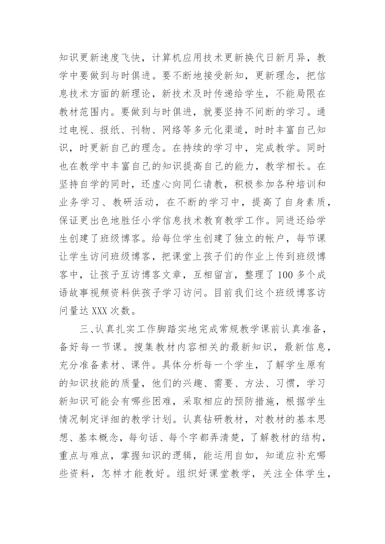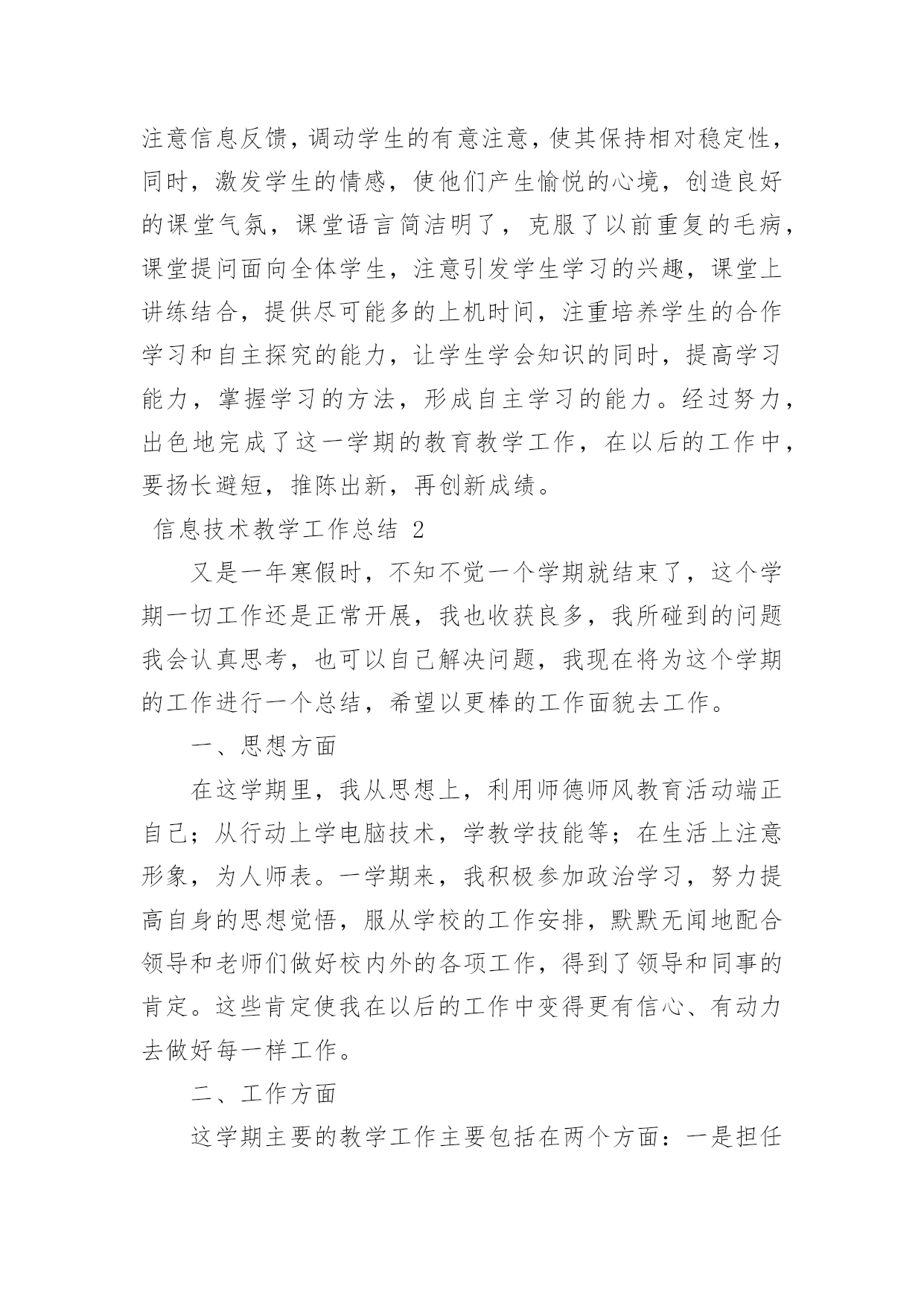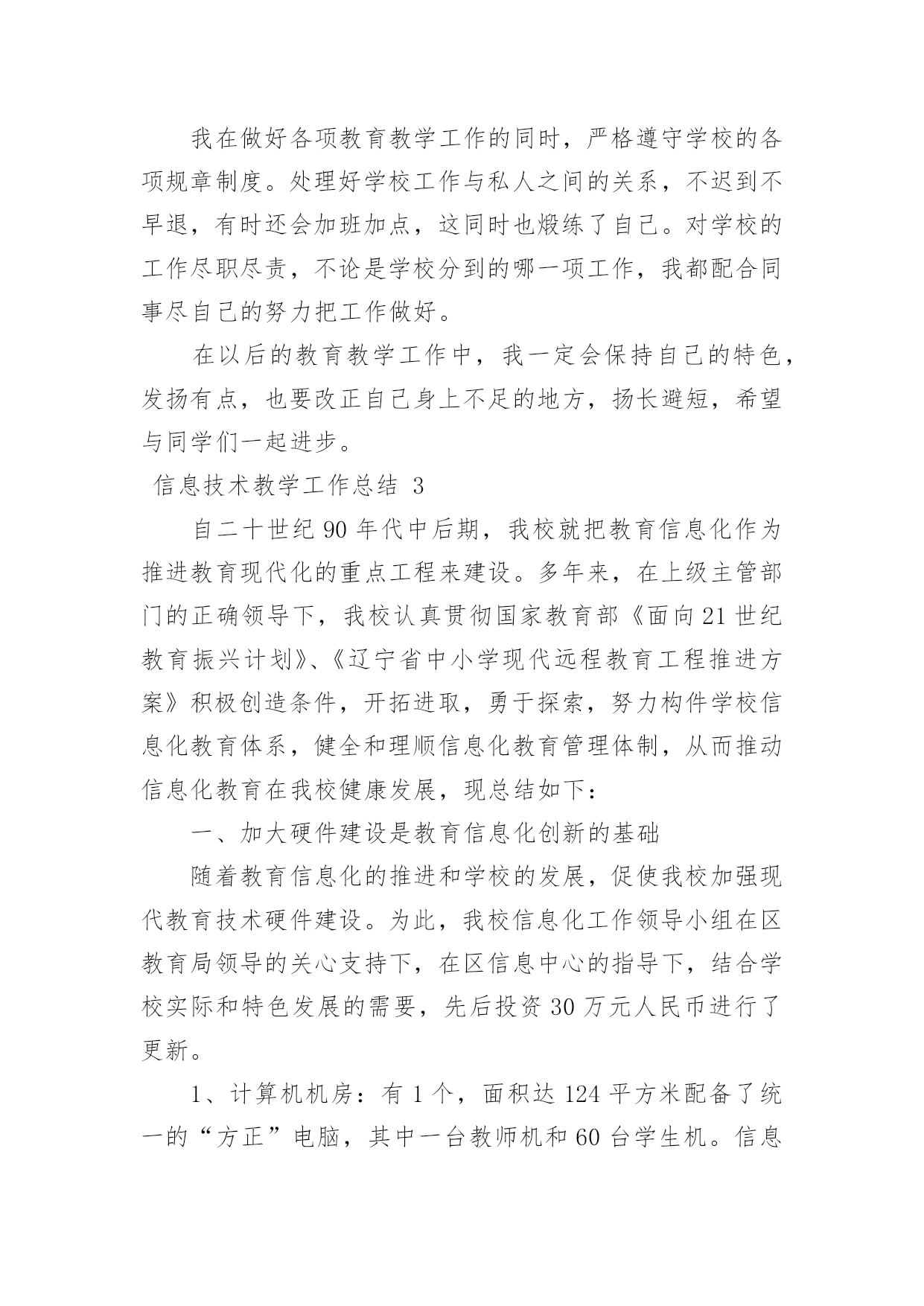 信息技术教学工作总结信息技术教学工作总结总结是在某一时期、某一项目或某些工作告一段落或者全部完成后进行回顾检查、分析评价,从而得出教训和一些规律性认识的一种书面材料,它可以使我们更有效率,不妨坐下来好好写写总结吧。总结怎么写才不会流于形式呢?下面是小编为大家收集的信息技术教学工作总结,欢迎阅读,希望大家能够喜欢。信息技术教学工作总结1本学期我担任小学五年级信息技术教育教学工作,每周8课时,教授6个教学班共计396名学生。其中五年级信息技术5课时5个教学班,330名学生,学前班美术3课时,66名学生。其他校务任务:自20xx年9月重新担任学校计算机教室管理员一职,负责机房电脑的维护,保证机房电脑正常运行服务于学生上好每节信息技术课;同时还负责学校文印室工作,即负责平时学校各处、各办公室文本复印,期中期末试卷速印等;再有协同郝老师维护学校电教设备等;最后,即每年固定不变的就是全校的校信通学校管理员一职,负责全校二千学生校信通卡维护更换工作,利用校讯通平台发而学校通知等工作。工作中,诚实正派,谦虚谨慎,严于律己,模范遵守社会公德、工作纪律和各项规章制度,服从组织和领导。忠于职守,认真负责,积极主动,创造性地执行学校教育教学工作计划,转变思想,积极探索,改革教学,把新课程标准的新思想、新理念和信息技术课堂教学的新思路、新设想结合起来,圆满完成学校交付的任务。一、重塑教育观念创造性进行教育教学本学期我认真学习新课程标准,发现《小学信息技术新课程标准》对教学内容,教学方式,教学评估教育价值观等多方面都提出了许多新的要求。为此,我不断更新教学理论理念,深入研究新的课标,从而对新课程标准的基本理念,设计思路,课程目标,内容标准及课程实施建议有了更深的了解,本学期我在新课程标准的指导下教育教学工作跃上了一个新的台阶。为保证新课程标准的落实,在课堂教学中,坚持学生为主体实行师生之间、学生之间互动,创造有利于学生主动探索的学习环境,使学生在获得知识和不断提高技能的同时,在情感、态度价值观等方面都能够充分发展。作为教学改革的基本指导思想,把信息技术教学看成是师生之间学生之间交往互动,共同发展的过程。课前精心备课,撰写教案,课后认真写反思,记下自己执教时的'切身体会或疏漏。在课堂教学中,坚持学生为主体,提倡自主性学习,学生在观察、操作、实验、讨论、交流、猜测、分析和整理的过程中,获得知识,增长能力。这样的探索实验让学生成了学习的主人,学习成了他们的需求,学中有发现,学中有乐趣,学中有收获。二、提高自身素质在学习中教学在教学中学习当今社会知识更新速度飞快,计算机应用技术更新换代日新月异,教学中要做到与时俱进。要不断地接受新知,更新理念,把信息技术方面的新理论,新技术及时传递给学生,不能局限在教材范围内。要做到与时俱进,就要坚持不间断的学习。通过电视、报纸、刊物、网络等多元化渠道,时时丰富自己知识,时更新自己的理念。在持续的学习中,完成教学。同时也在教学中丰富自己的知识提高自己的能力,教学相长。在坚持自学的同时,还虚心向同仁请教,积极参加各种培训和业务学习、教研活动,在不断的学习中,提高了自身素质,保证更出色地胜任小学信息技术教育教学工作。同进还给学生创建了班级博客。给每位学生创建了独立的帐户,每节课让学生访问班级博客,把课堂上孩子们的作业上传到班级博客中,让孩子互访博客文章,互相留言,整理了100多个成语故事视频资料供孩子学习访问。目前我们这个班级博客访问量达XXX次数。三、认真扎实工作脚踏实地完成常规教学课前认真准备,备好每一节课。搜集教材内容相关的最新知识,最新信息,充分准备素材、课件。具体分析每一个学生,了解学生原有的知识技能的质量,他们的兴趣、需要、方法、习惯,学习新知识可能会有哪些困难,采取相应的预防措施,根据学生情况制定详细的教学计划。认真钻研教材,对教材的基本思想、基本概念,每句话、每个字都弄清楚,了解教材的结构,重点与难点,掌握知识的逻辑,能运用自如,知道应补充哪些资料,怎样才能教好。组织好课堂教学,关注全体学生,注意信息反馈,调动学生的有意注意,使其保持相对稳定性,同时,激发学生的情感,使他们产生愉悦的心境,创造良好的课堂气氛,课堂语言简洁明了,克服了以前重复的毛病,课堂提问面向全体学生,注意引发学生学习的兴趣,课堂上讲练结合,提供尽可能多的上机时间,注重培养学生的合作学习和自主探究的能力,让学生学会知识的同时,提高学习能力,掌握学习的方法,形成自主学习的能力。经过努力,出色地完成了这一学期的教育教学工作,在以后的工作中,要扬长避短,推陈出新,再创新成绩。信息技术教学工作总结2又是一年寒假时,不知不觉一个学期就结束了,这个学期一切工作还是正常开展,我也收获良多,我所碰到的问题我会认真思考,也可以自己解决问题,我现在将为这个学期的工作