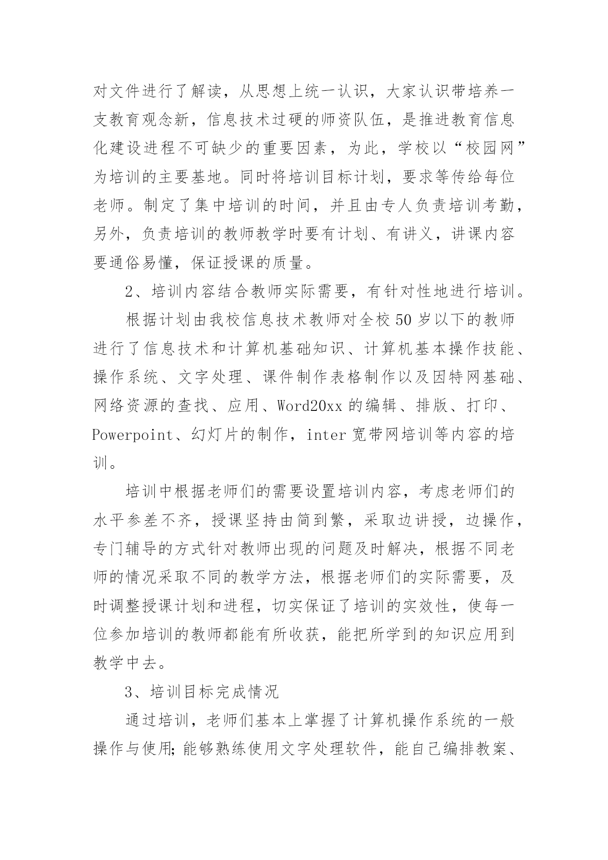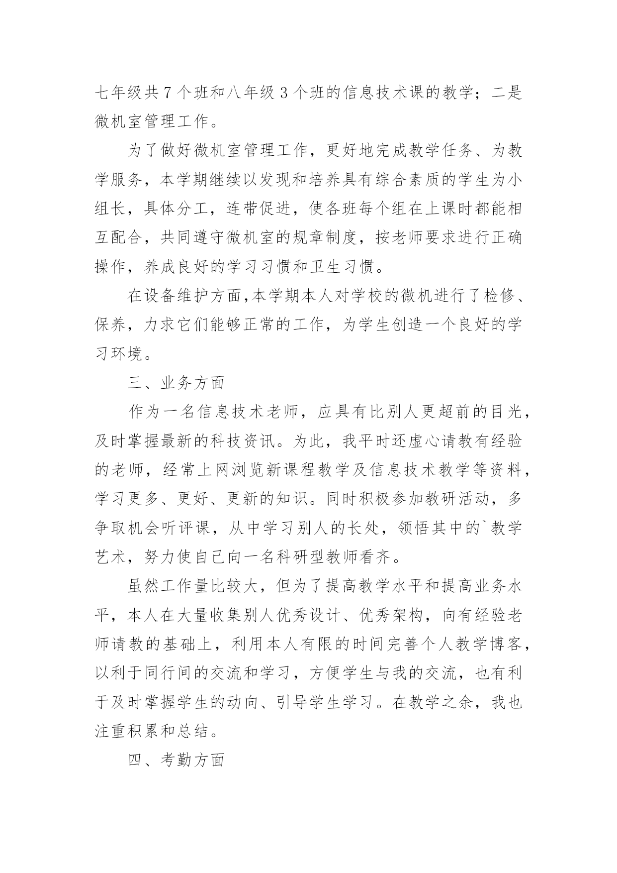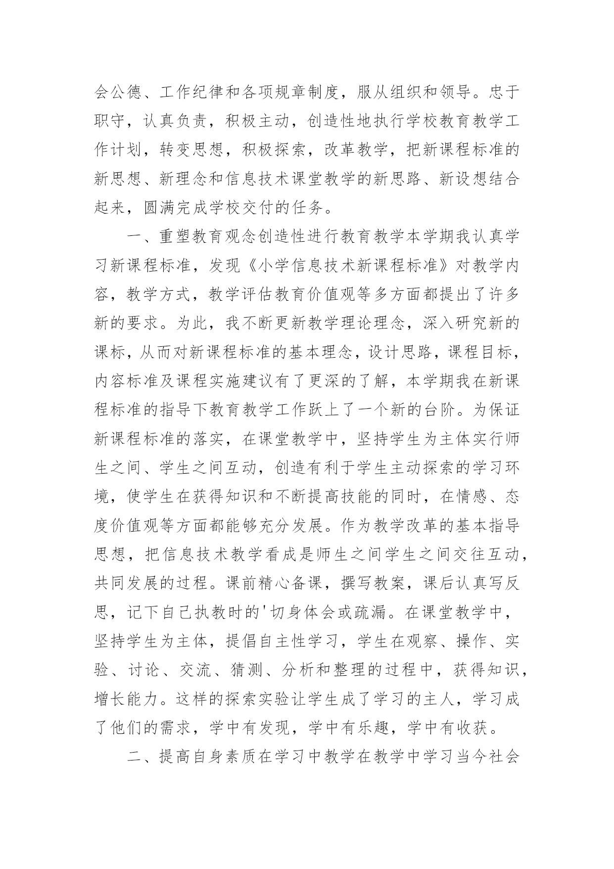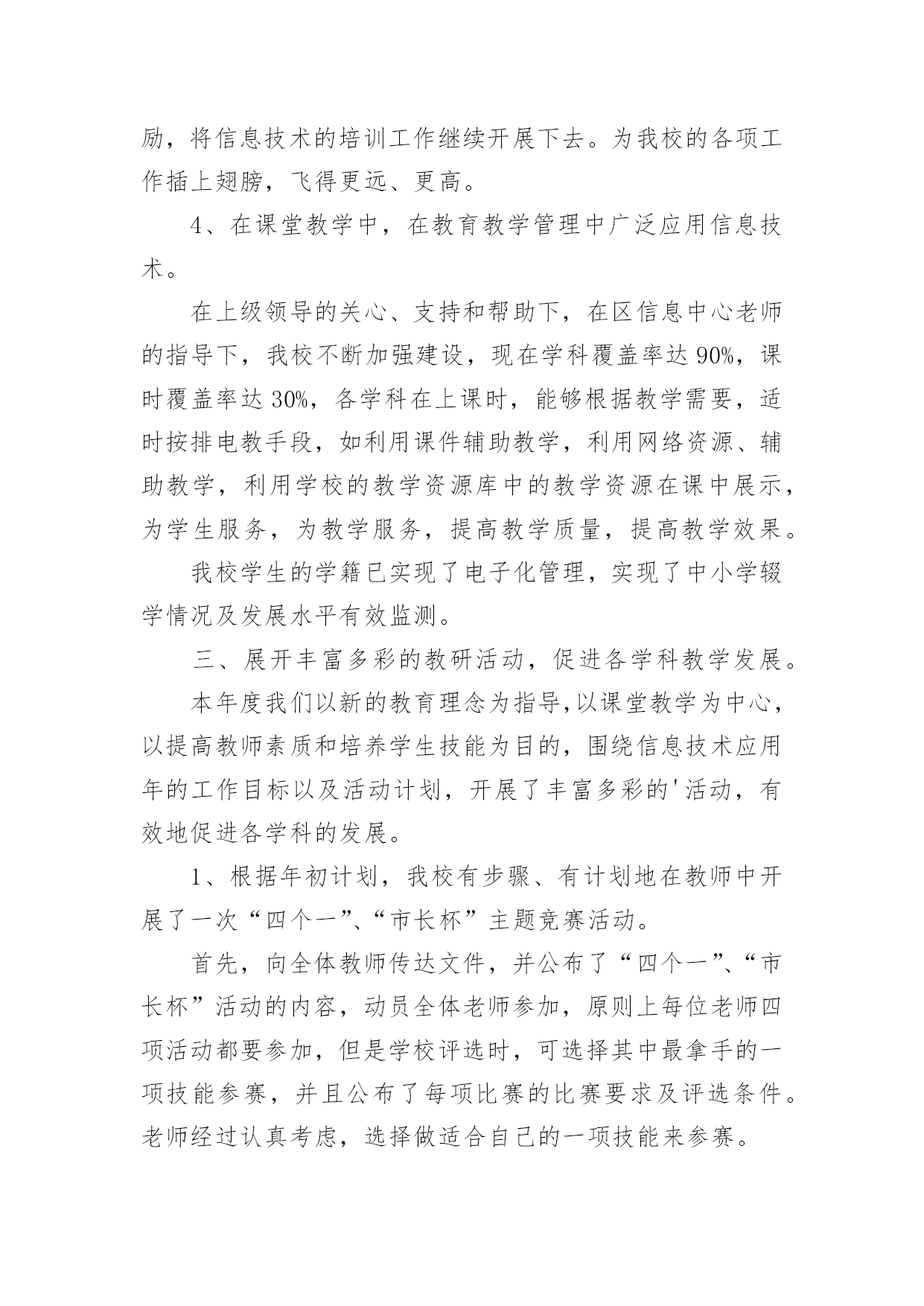 信息技术教学工作总结信息技术教学工作总结总结是在某一时期、某一项目或某些工作告一段落或者全部完成后进行回顾检查、分析评价,从而得出教训和一些规律性认识的一种书面材料,它可以使我们更有效率,不妨坐下来好好写写总结吧。总结怎么写才不会流于形式呢?下面是小编为大家收集的信息技术教学工作总结,欢迎阅读,希望大家能够喜欢。信息技术教学工作总结1本学期我担任小学五年级信息技术教育教学工作,每周8课时,教授6个教学班共计396名学生。其中五年级信息技术5课时5个教学班,330名学生,学前班美术3课时,66名学生。其他校务任务:自20xx年9月重新担任学校计算机教室管理员一职,负责机房电脑的维护,保证机房电脑正常运行服务于学生上好每节信息技术课;同时还负责学校文印室工作,即负责平时学校各处、各办公室文本复印,期中期末试卷速印等;再有协同郝老师维护学校电教设备等;最后,即每年固定不变的就是全校的校信通学校管理员一职,负责全校二千学生校信通卡维护更换工作,利用校讯通平台发而学校通知等工作。工作中,诚实正派,谦虚谨慎,严于律己,模范遵守社会公德、工作纪律和各项规章制度,服从组织和领导。忠于职守,认真负责,积极主动,创造性地执行学校教育教学工作计划,转变思想,积极探索,改革教学,把新课程标准的新思想、新理念和信息技术课堂教学的新思路、新设想结合起来,圆满完成学校交付的任务。一、重塑教育观念创造性进行教育教学本学期我认真学习新课程标准,发现《小学信息技术新课程标准》对教学内容,教学方式,教学评估教育价值观等多方面都提出了许多新的要求。为此,我不断更新教学理论理念,深入研究新的课标,从而对新课程标准的基本理念,设计思路,课程目标,内容标准及课程实施建议有了更深的了解,本学期我在新课程标准的指导下教育教学工作跃上了一个新的台阶。为保证新课程标准的落实,在课堂教学中,坚持学生为主体实行师生之间、学生之间互动,创造有利于学生主动探索的学习环境,使学生在获得知识和不断提高技能的同时,在情感、态度价值观等方面都能够充分发展。作为教学改革的基本指导思想,把信息技术教学看成是师生之间学生之间交往互动,共同发展的过程。课前精心备课,撰写教案,课后认真写反思,记下自己执教时的'切身体会或疏漏。在课堂教学中,坚持学生为主体,提倡自主性学习,学生在观察、操作、实验、讨论、交流、猜测、分析和整理的过程中,获得知识,增长能力。这样的探索实验让学生成了学习的主人,学习成了他们的需求,学中有发现,学中有乐趣,学中有收获。二、提高自身素质在学习中教学在教学中学习当今社会知识更新速度飞快,计算机应用技术更新换代日新月异,教学中要做到与时俱进。要不断地接受新知,更新理念,把信息技术方面的新理论,新技术及时传递给学生,不能局限在教材范围内。要做到与时俱进,就要坚持不间断的学习。通过电视、报纸、刊物、网络等多元化渠道,时时丰富自己知识,时更新自己的理念。在持续的学习中,完成教学。同时也在教学中丰富自己的知识提高自己的能力,教学相长。在坚持自学的同时,还虚心向同仁请教,积极参加各种培训和业务学习、教研活动,在不断的学习中,提高了自身素质,保证更出色地胜任小学信息技术教育教学工作。同进还给学生创建了班级博客。给每位学生创建了独立的帐户,每节课让学生访问班级博客,把课堂上孩子们的作业上传到班级博客中,让孩子互访博客文章,互相留言,整理了100多个成语故事视频资料供孩子学习访问。目前我们这个班级博客访问量达XXX次数。三、认真扎实工作脚踏实地完成常规教学课前认真准备,备好每一节课。搜集教材内容相关的最新知识,最新信息,充分准备素材、课件。具体分析每一个学生,了解学生原有的知识技能的质量,他们的兴趣、需要、方法、习惯,学习新知识可能会有哪些困难,采取相应的预防措施,根据学生情况制定详细的教学计划。认真钻研教材,对教材的基本思想、基本概念,每句话、每个字都弄清楚,了解教材的结构,重点与难点,掌握知识的逻辑,能运用自如,知道应补充哪些资料,怎样才能教好。组织好课堂教学,关注全体学生,注意信息反馈,调动学生的有意注意,使其保持相对稳定性,同时,激发学生的情感,使他们产生愉悦的心境,创造良好的课堂气氛,课堂语言简洁明了,克服了以前重复的毛病,课堂提问面向全体学生,注意引发学生学习的兴趣,课堂上讲练结合,提供尽可能多的上机时间,注重培养学生的合作学习和自主探究的能力,让学生学会知识的同时,提高学习能力,掌握学习的方法,形成自主学习的能力。经过努力,出色地完成了这一学期的教育教学工作,在以后的工作中,要扬长避短,推陈出新,再创新成绩。信息技术教学工作总结2又是一年寒假时,不知不觉一个学期就结束了,这个学期一切工作还是正常开展,我也收获良多,我所碰到的问题我会认真思考,也可以自己解决问题,我现在将为这个学期的工作