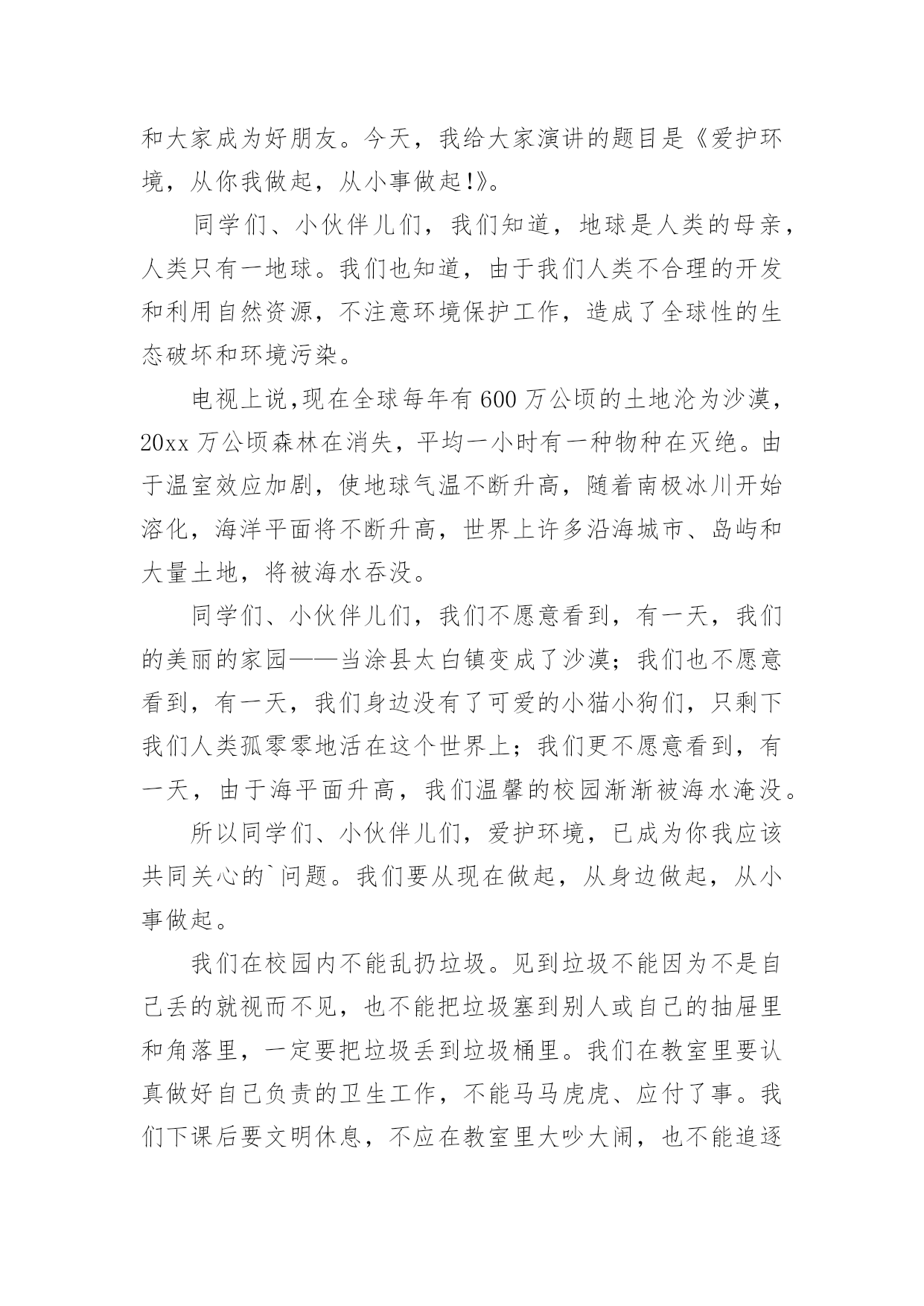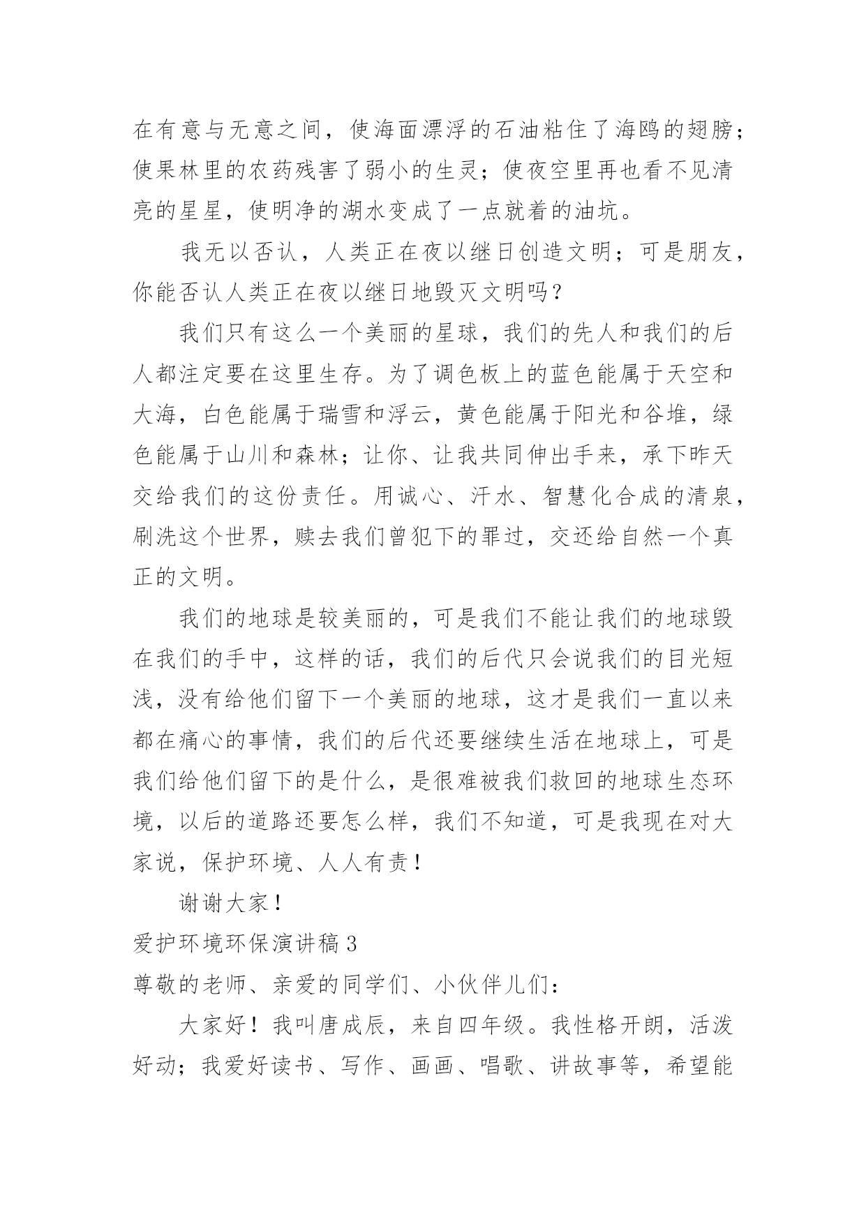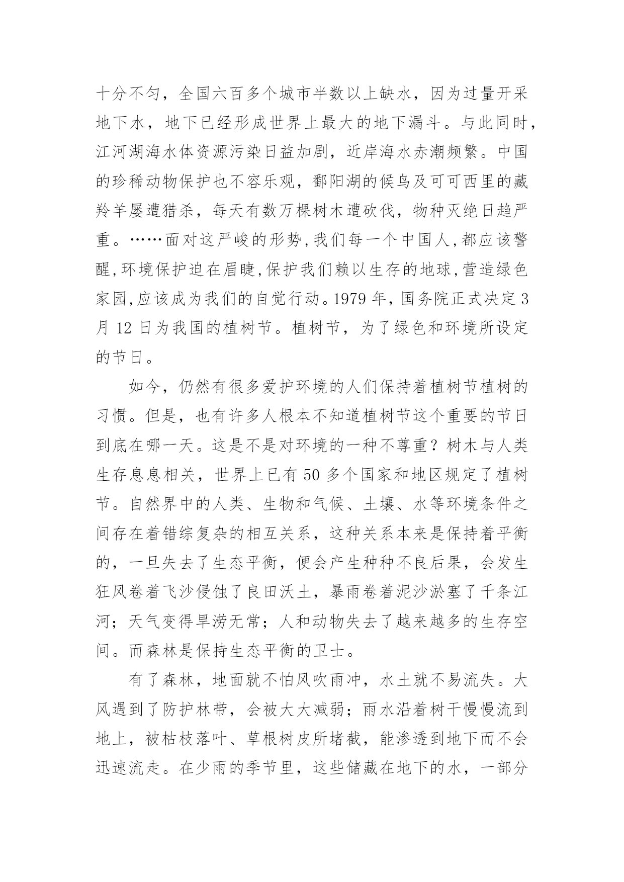 爱护环境环保演讲稿爱护环境环保演讲稿演讲稿是为了在会议或重要活动上表达自己意见、看法或汇报思想工作情况而事先准备好的文稿。在快速变化和不断变革的新时代,演讲稿的使用频率越来越高,来参考自己需要的演讲稿吧!下面是小编收集整理的爱护环境环保演讲稿,欢迎大家分享。爱护环境环保演讲稿1尊敬的各位老师与亲爱的同学们:大家早上好,我今天的环保演讲稿的主题是:《爱护生态环境,保卫绿色家园》众所周知,一个国家人民对自己所生存的土地、河流与天空的关心程度,在很大意义上可以反映该国的知识水平与生存觉悟。据世界资源报告,对世界50家选定城市的大气环境质量进行评比,世界上大气污染最严重的十大城市中,中国占了五个。中国是世界上水土流失最严重的国家之一,几十年间,水土流失面积冲153万平方公里增加到180多万平方公里,约占中国陆地面积的五分之一。中国土地沙漠化正在加剧,北京20xx年发生了12次沙尘暴,中国缺水也相当严重,是世界上12个缺水国之一,人均水资源不足世界人均水资源的四分之一,而且水源分布十分不匀,全国六百多个城市半数以上缺水,因为过量开采地下水,地下已经形成世界上最大的地下漏斗。与此同时,江河湖海水体资源污染日益加剧,近岸海水赤潮频繁。中国的珍稀动物保护也不容乐观,鄱阳湖的候鸟及可可西里的藏羚羊屡遭猎杀,每天有数万棵树木遭砍伐,物种灭绝日趋严重。……面对这严峻的形势,我们每一个中国人,都应该警醒,环境保护迫在眉睫,保护我们赖以生存的地球,营造绿色家园,应该成为我们的自觉行动。1979年,国务院正式决定3月12日为我国的植树节。植树节,为了绿色和环境所设定的节日。如今,仍然有很多爱护环境的人们保持着植树节植树的习惯。但是,也有许多人根本不知道植树节这个重要的节日到底在哪一天。这是不是对环境的一种不尊重?树木与人类生存息息相关,世界上已有50多个国家和地区规定了植树节。自然界中的人类、生物和气候、土壤、水等环境条件之间存在着错综复杂的相互关系,这种关系本来是保持着平衡的,一旦失去了生态平衡,便会产生种种不良后果,会发生狂风卷着飞沙侵蚀了良田沃土,暴雨卷着泥沙淤塞了千条江河;天气变得旱涝无常;人和动物失去了越来越多的生存空间。而森林是保持生态平衡的卫士。有了森林,地面就不怕风吹雨冲,水土就不易流失。大风遇到了防护林带,会被大大减弱;雨水沿着树干慢慢流到地上,被枯枝落叶、草根树皮所堵截,能渗透到地下而不会迅速流走。在少雨的季节里,这些储藏在地下的水,一部分汇成溪流,流出森林,滋养农田,一部分经过树根的吸收、树叶的'蒸腾,回到空中,又变成雨。森林让气候变得稳定正常。同时,森林又是制造新鲜空气的工厂,森林是绿色的水库,森林是人类生命的摇篮。因此,环境保护应该从我做起,从身边的环保小行动做起,自觉的维护我们的家园,同时要积极向身边的人宣传环保知识,让更多的人来加入到环保的行列,让我们的地球更洁净,让我们的生命更鲜活,更灿烂!爱护环境环保演讲稿2尊敬的领导、同志们:大家好!当前人类社会已经进入十分发达的工业文明时代了,人类在不断的进步,我们人类已经征服了地球,成为地球上的主宰,现在人类又开始征服太空,希望能够在太空中找到自己更好的归宿。殊不知,我们的地球已经被我们人类破坏的不能再破坏了,保护环境已经不是一时间的事情了,需要全世界人民的一起努力,我们的地球才会回到曾经的样子。其实,真的说不清是从哪一天开始,纯净辽阔的大海里产生了星球史上较早的生命精结——绿藻群带;其实,真的说不清是从哪一天开始,奔腾不止的黄河岸边出现了现代人铭记的祖先——蓝田人类;其实,真不说清是从哪一天开始,大地欣然地托起了普罗米修斯窃取的火种,从而宣告了文明初始而完整的诞生;其实,真的说不清是从哪一天开始,人类不仅征服了自然,而且开始学会向自然索取曾饱受天灾的赔偿——资源潜能。于是,人类的文明史上有了结实的木椅、精刻的木阁;而孕育出人类的原始丛林却在伤心地萎缩;于是,人类的文明史上有煤炭、石油、地热;而承接着人们疯狂攫取的大地却在悄悄地下沉、裂变、陷落;于是,人类文明史上有了林立的厂房、烟囱、化工车间;而那片曾经温柔的晴空,却正在被黑的、黄的、灰的污染杀手将臭氧层残忍地撕破。终于,人类的文明史上有了微观得可怕的氢能、中子能、原子能,而从此,文明之邦的土地上不知多少因亲离友散而痛苦凄厉的.哭声。假如,历史真的是一张翔实无疏的时间表,我只想查一查人类究竟是从什么时候起开始学会把作为星球上的较高智能生物的特权发挥得如此淋漓尽致,却轻而易举地忘记,自然一样会再次惩罚我们。因为英国人无规划地扩大工厂,排放废气;于是大自然便在1873年、1883年、1892年发生了三次伦敦毒雾事件侵吞一千八百人作为赔偿。因为日本人在足尾铜矿疯狂采挖,任排污水,于是大自然便让400平方公里的良田变为荒园以示惩罚。因