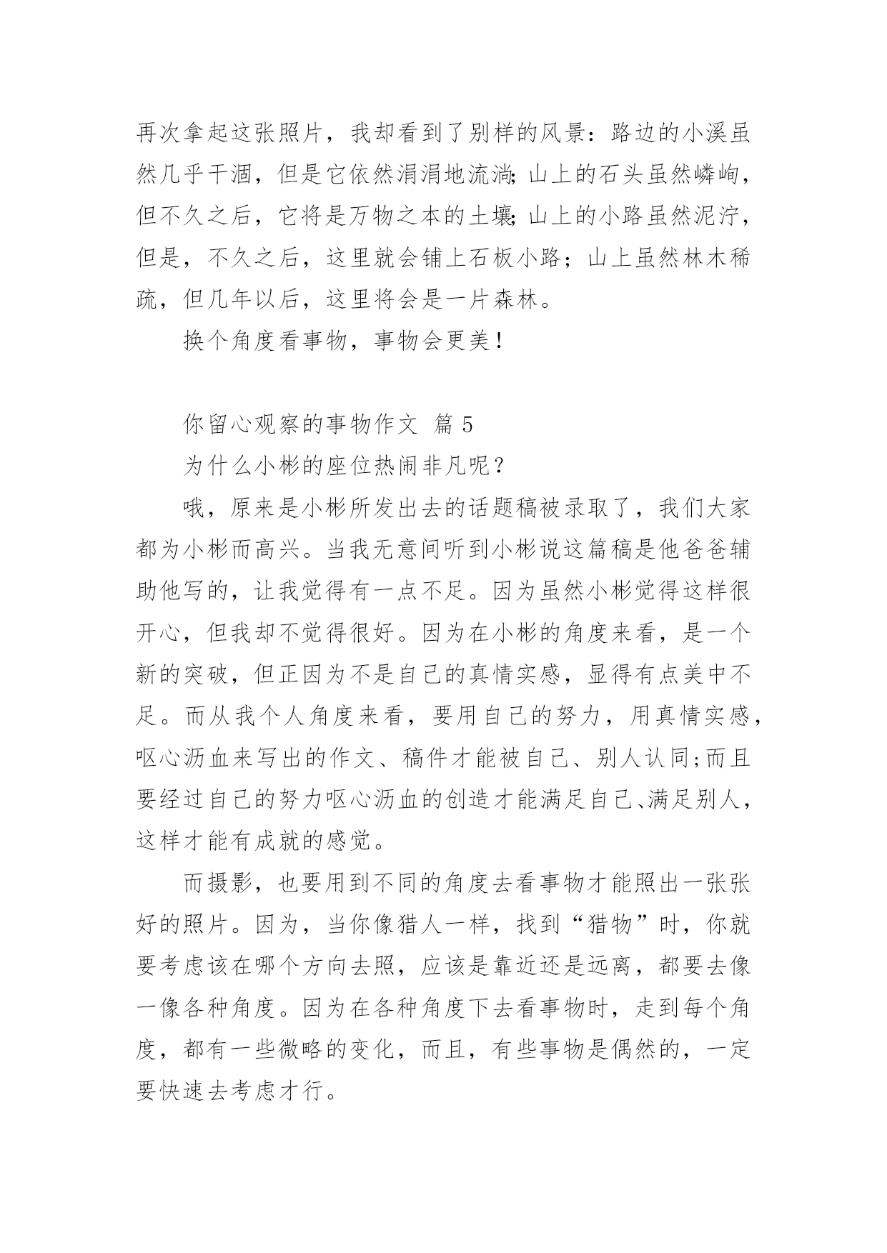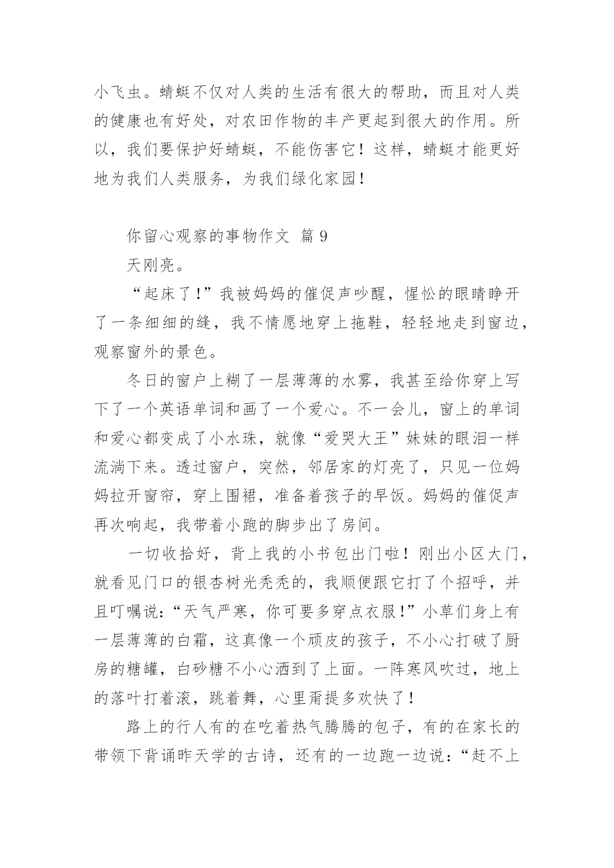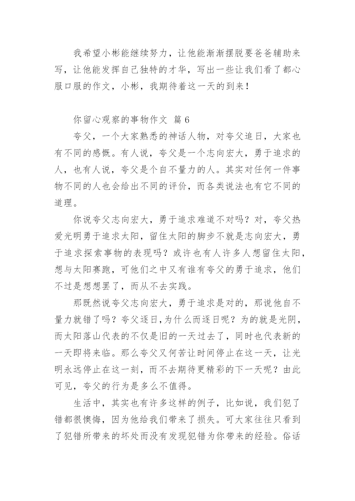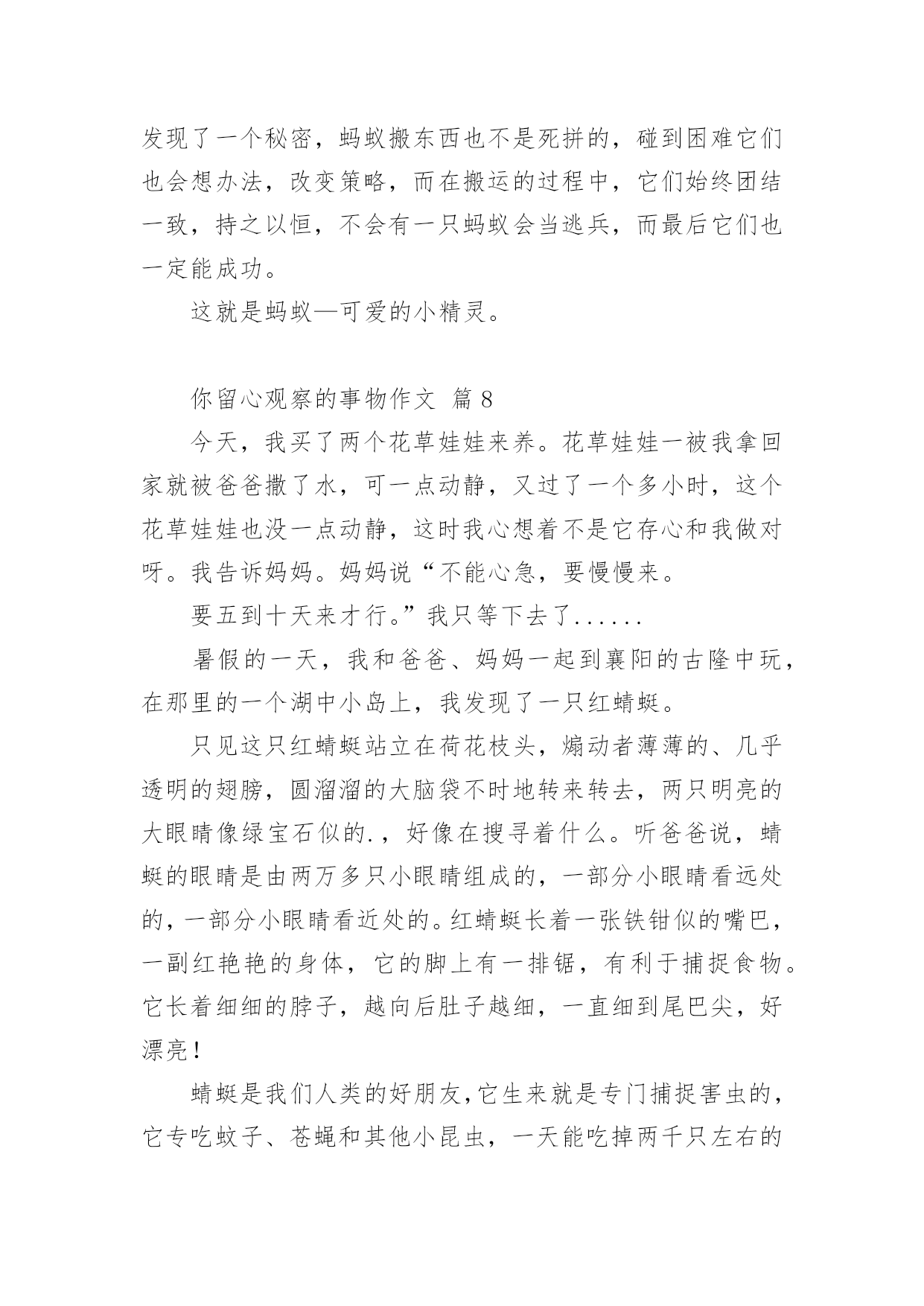 你留心观察的事物作文你留心观察的事物作文(精选22篇)在生活、工作和学习中,许多人都写过作文吧,作文是人们以书面形式表情达意的言语活动。你所见过的作文是什么样的呢?以下是小编为大家整理的你留心观察的事物作文,欢迎大家分享。你留心观察的事物作文篇1暑假看什么书呢?请看看作文库推荐的书籍暑假,我每天到妈妈的单位写作业。今天,我发现妈妈单位新买了一缸金鱼。这缸金鱼可漂亮了!它们头上凸起,像戴着一顶大官帽;眼睛圆鼓鼓的,但小得出奇;可爱的小嘴一张一合,吐出一串串珍珠般的水泡来;身上披着鳞片,在阳光的照射下浑身金光闪闪,游动时一摇一摆,如同一位穿着金色铠甲、趾高气扬的将军;可爱的尾巴在清水里就像一朵朵透明的花,又像一只只蝴蝶在水中翩翩起舞。我看着它们不停地在水中游动穿梭,快乐的样子,我很好奇:这些金鱼好像从来不用睡觉似的,不累吗?怎么不休息呢?为了解开疑惑,我开始了仔细的观察,并查阅有关的资料:原来金鱼是会睡觉的。因为它们没有眼睑,所以只能睁着眼睛睡觉。如果看到金鱼在岩石缝里一动不动,眼珠也不转动,只有鱼鳃盖不停地在一张一合,轻轻地翻动着,其实就是金鱼在睡觉。只不过它是属于浅度睡眠状态,所以一有动静,就会醒过来。我终于知道了金鱼是会睡觉的,而且是怎样睡觉的,也明白了一个道理:留心处处皆学问!你留心观察的事物作文篇2同学们一定会觉得童年很快乐。比如:被爸爸、妈妈、爷爷、奶奶疼爱你;被老师表扬,被同学羡慕。这些都是你的快乐之处。但是,这不够。同学们应擦亮自己的小眼睛,观察你和某人说话;那个人怎么样表情;以后科技怎么样先进……这样你就会得到快乐,可不要想着自己的缺点。我就看到了一些人很温和,很热情。比如:我家那栋楼的12楼,住着一位老爷爷。那位爷爷很热情,每次见到我和妈妈的时候,都微笑地对着我们。一放学,我们都会相遇。因为老爷爷每天都等着我们,还有他的孙子也是在昌岗中路小学读书的,但是他知道了我的住所后,就每次帮我按“18”楼。我对他们爷孙俩非常有好感。我们也不能忘记教导我们的老师。我就说我的班主任傅老师,她非常喜欢我们班的45位同学,她容易笑,都是被我们这群“小淘气”气得哭笑不得;另一方面,傅老师很容易生气,为什么呢?因为我们的作业马虎!傅老师一生气,就会“怒气冲天”!我们的未来也不能“丢弃”!我们可以想象:未来的汽车会飞,车上有电脑,能潜水;家里有很多自动式装备……如果你一想,它就会带你进入想象的空间,顿时你就会觉得无比欢畅!我们的世界是多姿多彩的。如果我们擦亮自己的眼睛,就—会—感—到—无—比—的—欢—畅!你留心观察的事物作文篇3世界万物,它们都是多面的。美好的事物也有反面,不好的事物也有正面。记得有这样一个故事。一个一年级的小男生在考试卷上遇到了这样一个问题:雪化后是什么?所有的同学几乎都认为雪化后是水,而那个小男孩却认为雪化后是春天,老师在改卷子的时候在他的卷子上打了个错号。卷子发后,小男孩委屈得对老师说,雪化后确实是春天。老师经过一番思考认为小男孩是对的,并当众夸奖了他。同样是一个问题,但它能从多方面思考。就像“雪化后是什么”这个问题,它的答案可以是水,还可以是春天……然而,在人们眼中看起来最恶心的东西,它也有正面。蛆,一个令人听起来就恶心的东西,但它也为医学事业做过贡献,挽回了一个外国妇女的一条手臂。有一个外国妇女,她的胳膊上长这一个罕见的大脓疮,里面有许多烂肉,使胳膊上的脓疮总不出新肉来。医生们想过很多办法,但仍不见效。医生说,如果不行就可能截肢。后来医生们经过多次讨论,生出了一个大胆的治疗方案。就是把苍蝇繁殖出的虫卵种在她胳膊伤的大脓疮里,让虫卵吃掉那些顽缠的烂肉,这样,她胳膊就能长出新肉来了。经过医生的一番努力,果然见效了。从中,我们可以看出,凡是,我们都要从多方面来看,不能总认为美好的事物没有反面,不好的食物没有正面。就像上面故事里的蛆,别看它平常一无事处,并且令人恶心,但它却挽回了外国妇女的一条胳膊。所以,我们必须得儿从多方面看待事物,了解事物呀!你留心观察的事物作文篇4抬头一看,窗外的暴雨依然“哗啦”——“哗啦”地下个不停,像是有人捅破了天。期末考试失败的阴影涌上心头,近乎无限的作业压得我喘不过气来,一想起妈妈留的任务还没完成,一阵压抑感不禁袭来。不知不觉中,已经过去了几个小时,作业才写了零星一点。转身走向书架,想从中找一本书,目光却落在书旁的照片上。那是朋友给的,上面也同样有令人不快的景色:一座孤零零的小山上,只有枯叶落在上面,山上全是嶙峋的石头,鲜有林木,路边的小草也没有精神。想起朋友说过:“这是一张与众不同的照片。但是,如果你换一种看法,它就会更加与众不同”。我照着朋友说的做,仔细地左看右看,仍然没有看出什么,除了荒凉,什么也看不出来。心里想:这是我看过的最差的照片。半年过去了,这回的期末考试出乎意料的好,