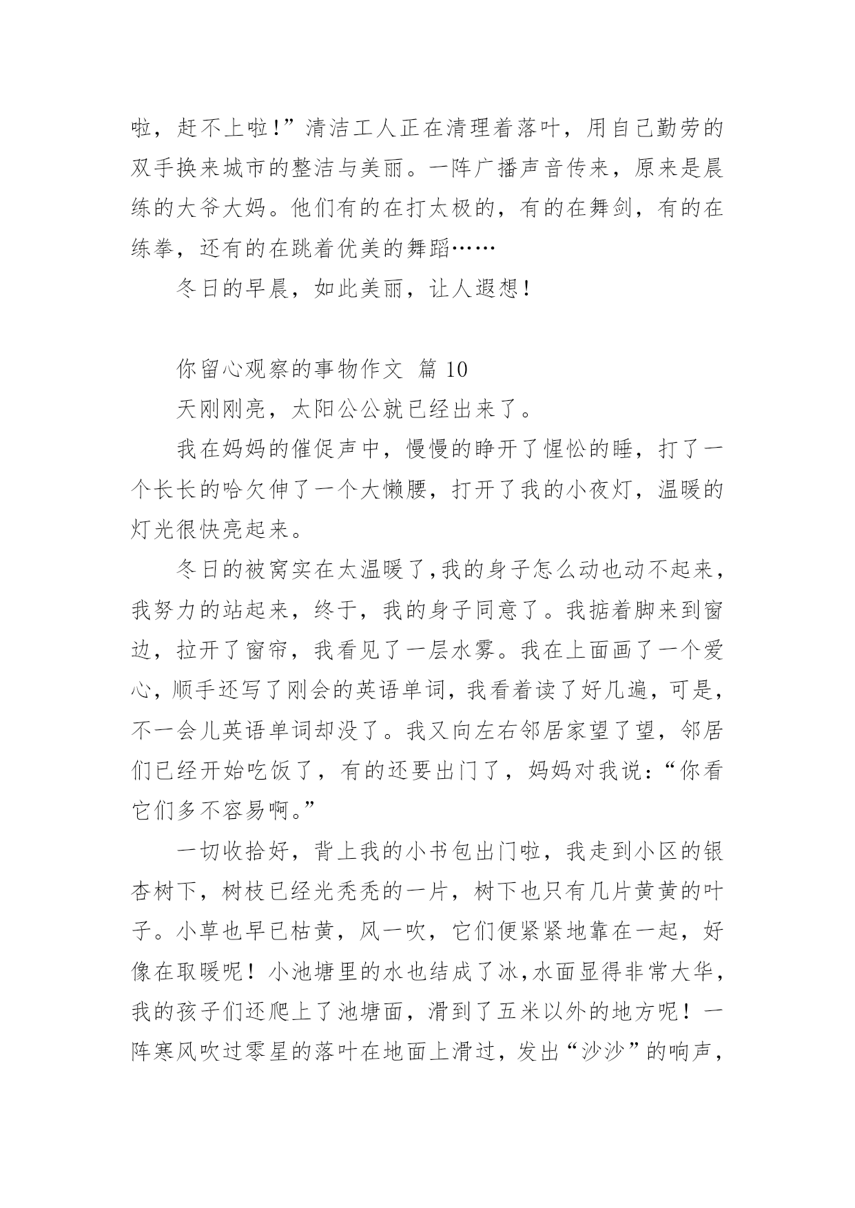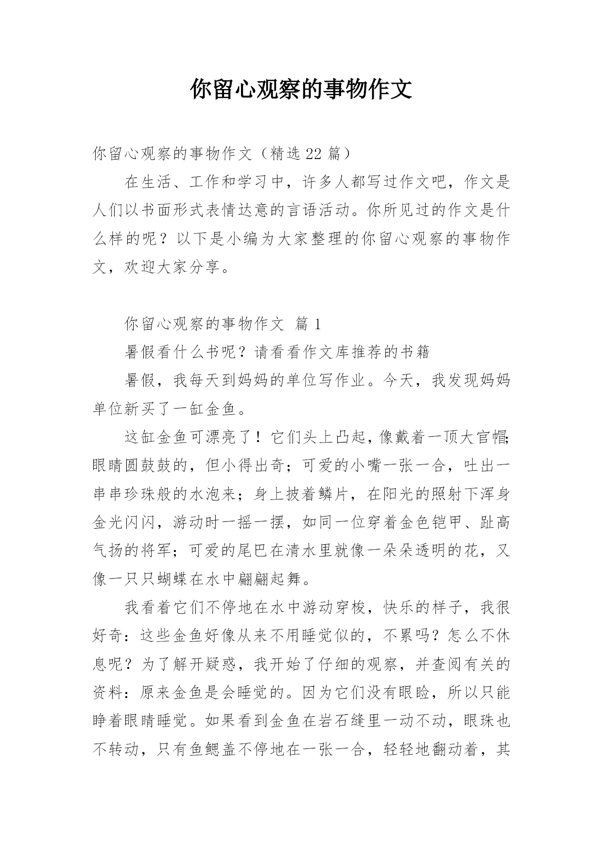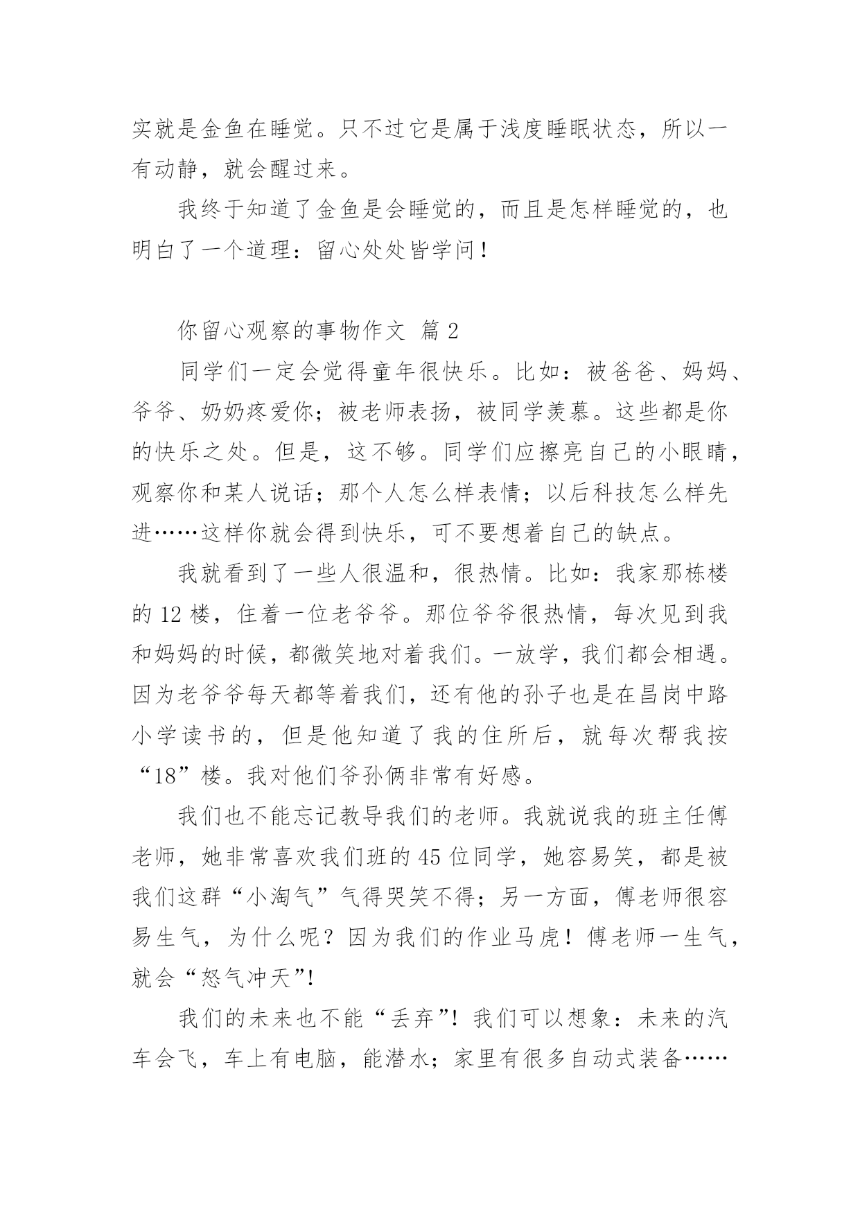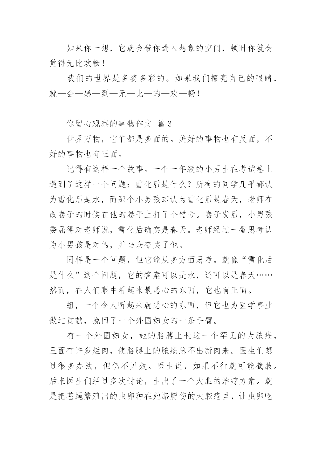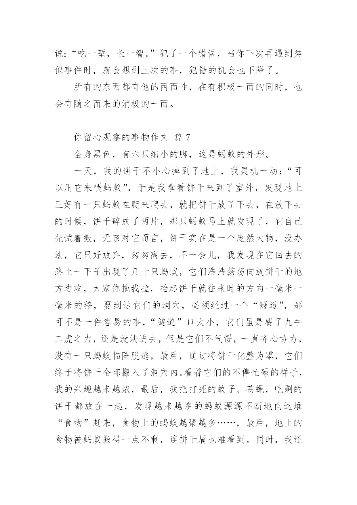 你留心观察的事物作文你留心观察的事物作文(精选22篇)在生活、工作和学习中,许多人都写过作文吧,作文是人们以书面形式表情达意的言语活动。你所见过的作文是什么样的呢?以下是小编为大家整理的你留心观察的事物作文,欢迎大家分享。你留心观察的事物作文篇1暑假看什么书呢?请看看作文库推荐的书籍暑假,我每天到妈妈的单位写作业。今天,我发现妈妈单位新买了一缸金鱼。这缸金鱼可漂亮了!它们头上凸起,像戴着一顶大官帽;眼睛圆鼓鼓的,但小得出奇;可爱的小嘴一张一合,吐出一串串珍珠般的水泡来;身上披着鳞片,在阳光的照射下浑身金光闪闪,游动时一摇一摆,如同一位穿着金色铠甲、趾高气扬的将军;可爱的尾巴在清水里就像一朵朵透明的花,又像一只只蝴蝶在水中翩翩起舞。我看着它们不停地在水中游动穿梭,快乐的样子,我很好奇:这些金鱼好像从来不用睡觉似的,不累吗?怎么不休息呢?为了解开疑惑,我开始了仔细的观察,并查阅有关的资料:原来金鱼是会睡觉的。因为它们没有眼睑,所以只能睁着眼睛睡觉。如果看到金鱼在岩石缝里一动不动,眼珠也不转动,只有鱼鳃盖不停地在一张一合,轻轻地翻动着,其实就是金鱼在睡觉。只不过它是属于浅度睡眠状态,所以一有动静,就会醒过来。我终于知道了金鱼是会睡觉的,而且是怎样睡觉的,也明白了一个道理:留心处处皆学问!你留心观察的事物作文篇2同学们一定会觉得童年很快乐。比如:被爸爸、妈妈、爷爷、奶奶疼爱你;被老师表扬,被同学羡慕。这些都是你的快乐之处。但是,这不够。同学们应擦亮自己的小眼睛,观察你和某人说话;那个人怎么样表情;以后科技怎么样先进……这样你就会得到快乐,可不要想着自己的缺点。我就看到了一些人很温和,很热情。比如:我家那栋楼的12楼,住着一位老爷爷。那位爷爷很热情,每次见到我和妈妈的时候,都微笑地对着我们。一放学,我们都会相遇。因为老爷爷每天都等着我们,还有他的孙子也是在昌岗中路小学读书的,但是他知道了我的住所后,就每次帮我按“18”楼。我对他们爷孙俩非常有好感。我们也不能忘记教导我们的老师。我就说我的班主任傅老师,她非常喜欢我们班的45位同学,她容易笑,都是被我们这群“小淘气”气得哭笑不得;另一方面,傅老师很容易生气,为什么呢?因为我们的作业马虎!傅老师一生气,就会“怒气冲天”!我们的未来也不能“丢弃”!我们可以想象:未来的汽车会飞,车上有电脑,能潜水;家里有很多自动式装备……如果你一想,它就会带你进入想象的空间,顿时你就会觉得无比欢畅!我们的世界是多姿多彩的。如果我们擦亮自己的眼睛,就—会—感—到—无—比—的—欢—畅!你留心观察的事物作文篇3世界万物,它们都是多面的。美好的事物也有反面,不好的事物也有正面。记得有这样一个故事。一个一年级的小男生在考试卷上遇到了这样一个问题:雪化后是什么?所有的同学几乎都认为雪化后是水,而那个小男孩却认为雪化后是春天,老师在改卷子的时候在他的卷子上打了个错号。卷子发后,小男孩委屈得对老师说,雪化后确实是春天。老师经过一番思考认为小男孩是对的,并当众夸奖了他。同样是一个问题,但它能从多方面思考。就像“雪化后是什么”这个问题,它的答案可以是水,还可以是春天……然而,在人们眼中看起来最恶心的东西,它也有正面。蛆,一个令人听起来就恶心的东西,但它也为医学事业做过贡献,挽回了一个外国妇女的一条手臂。有一个外国妇女,她的胳膊上长这一个罕见的大脓疮,里面有许多烂肉,使胳膊上的脓疮总不出新肉来。医生们想过很多办法,但仍不见效。医生说,如果不行就可能截肢。后来医生们经过多次讨论,生出了一个大胆的治疗方案。就是把苍蝇繁殖出的虫卵种在她胳膊伤的大脓疮里,让虫卵吃掉那些顽缠的烂肉,这样,她胳膊就能长出新肉来了。经过医生的一番努力,果然见效了。从中,我们可以看出,凡是,我们都要从多方面来看,不能总认为美好的事物没有反面,不好的食物没有正面。就像上面故事里的蛆,别看它平常一无事处,并且令人恶心,但它却挽回了外国妇女的一条胳膊。所以,我们必须得儿从多方面看待事物,了解事物呀!你留心观察的事物作文篇4抬头一看,窗外的暴雨依然“哗啦”——“哗啦”地下个不停,像是有人捅破了天。期末考试失败的阴影涌上心头,近乎无限的作业压得我喘不过气来,一想起妈妈留的任务还没完成,一阵压抑感不禁袭来。不知不觉中,已经过去了几个小时,作业才写了零星一点。转身走向书架,想从中找一本书,目光却落在书旁的照片上。那是朋友给的,上面也同样有令人不快的景色:一座孤零零的小山上,只有枯叶落在上面,山上全是嶙峋的石头,鲜有林木,路边的小草也没有精神。想起朋友说过:“这是一张与众不同的照片。但是,如果你换一种看法,它就会更加与众不同”。我照着朋友说的做,仔细地左看右看,仍然没有看出什么,除了荒凉,什么也看不出来。心里想:这是我看过的最差的照片。半年过去了,这回的期末考试出乎意料的好,